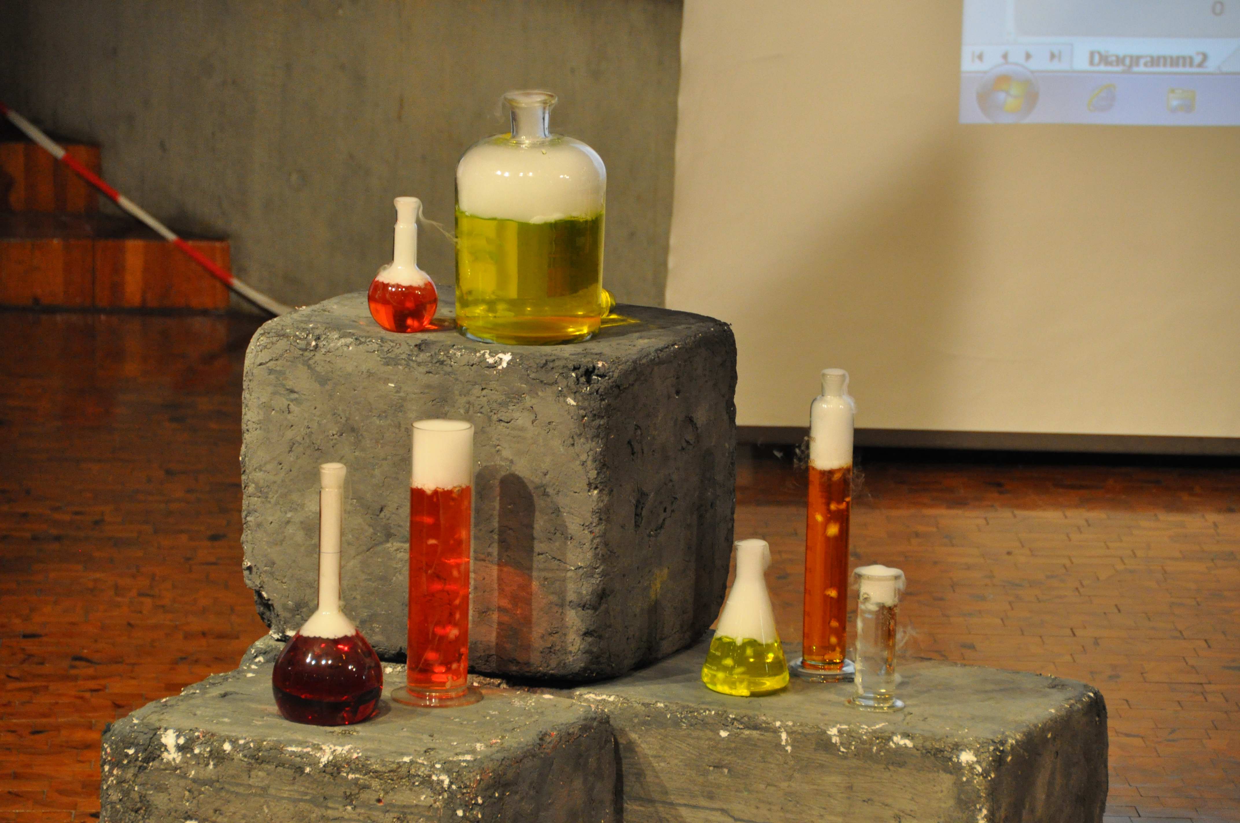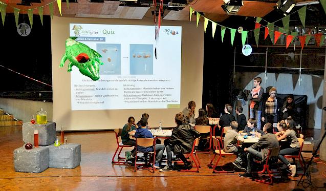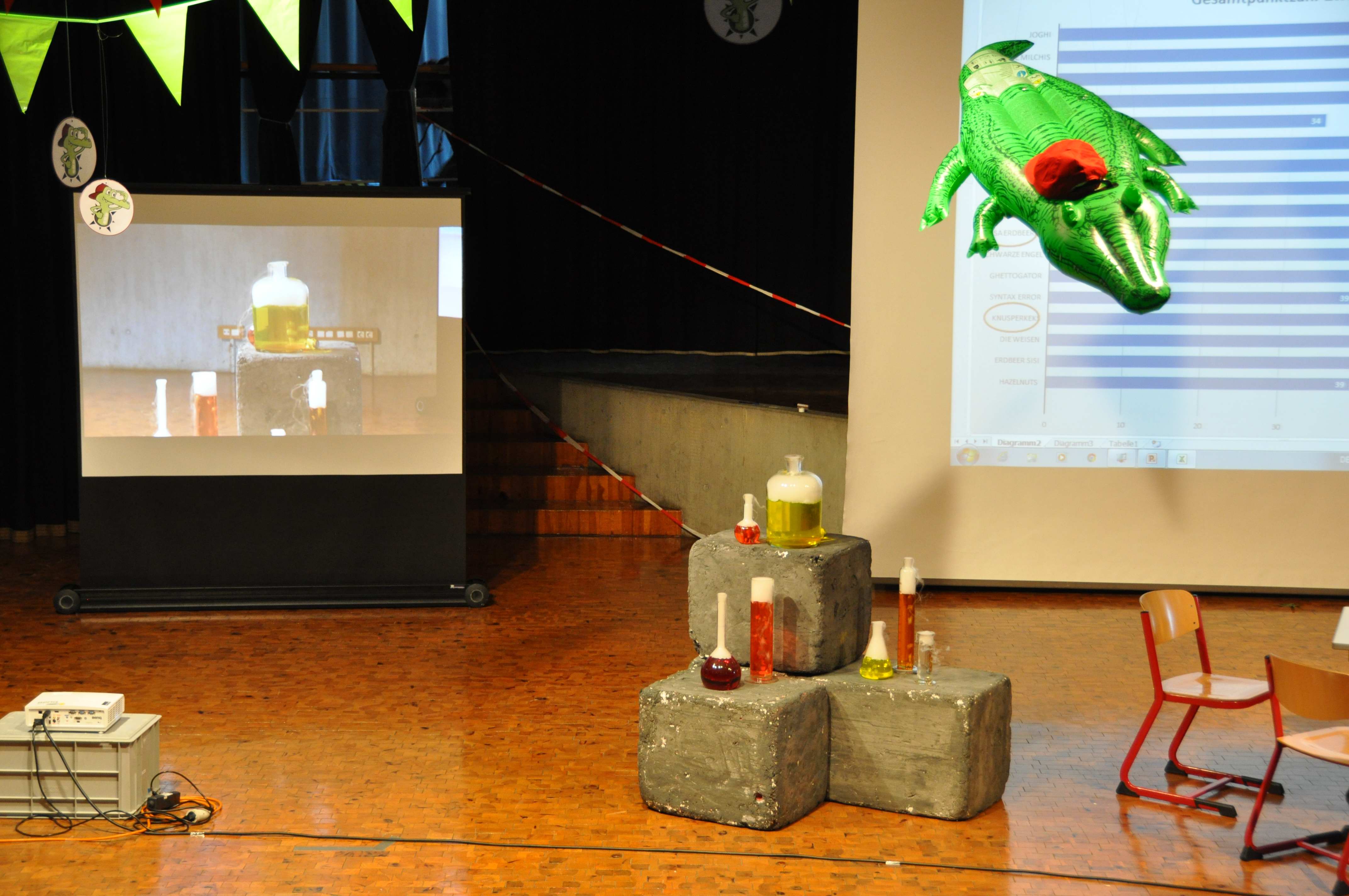Bis zur Endrunde in der Kulturmulde wurde dann vom Organisationsteam nochmal ordentlich gewirbelt - die Ergebnisse des Klassenquiz und der Ralley wurden ausgewertet, die Teamtische aufgebaut, die Materialien für die Experimentieraufgaben gerichtet und Herr Kiesel überraschte die Schülerinnen und Schüler mit einer bunt leuchtenden und brodelnden "Chemie-Installation" als Bühnen-Deko.