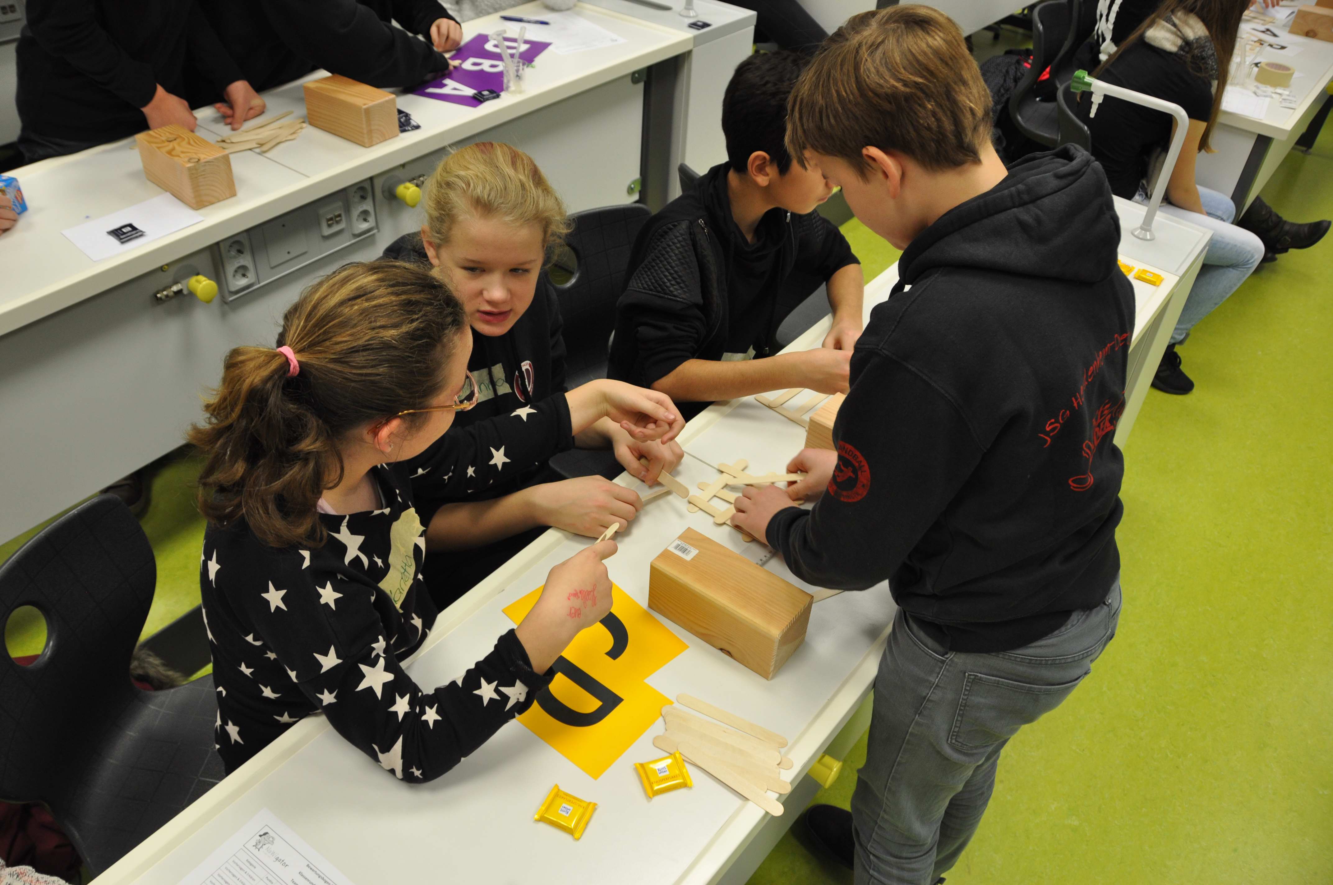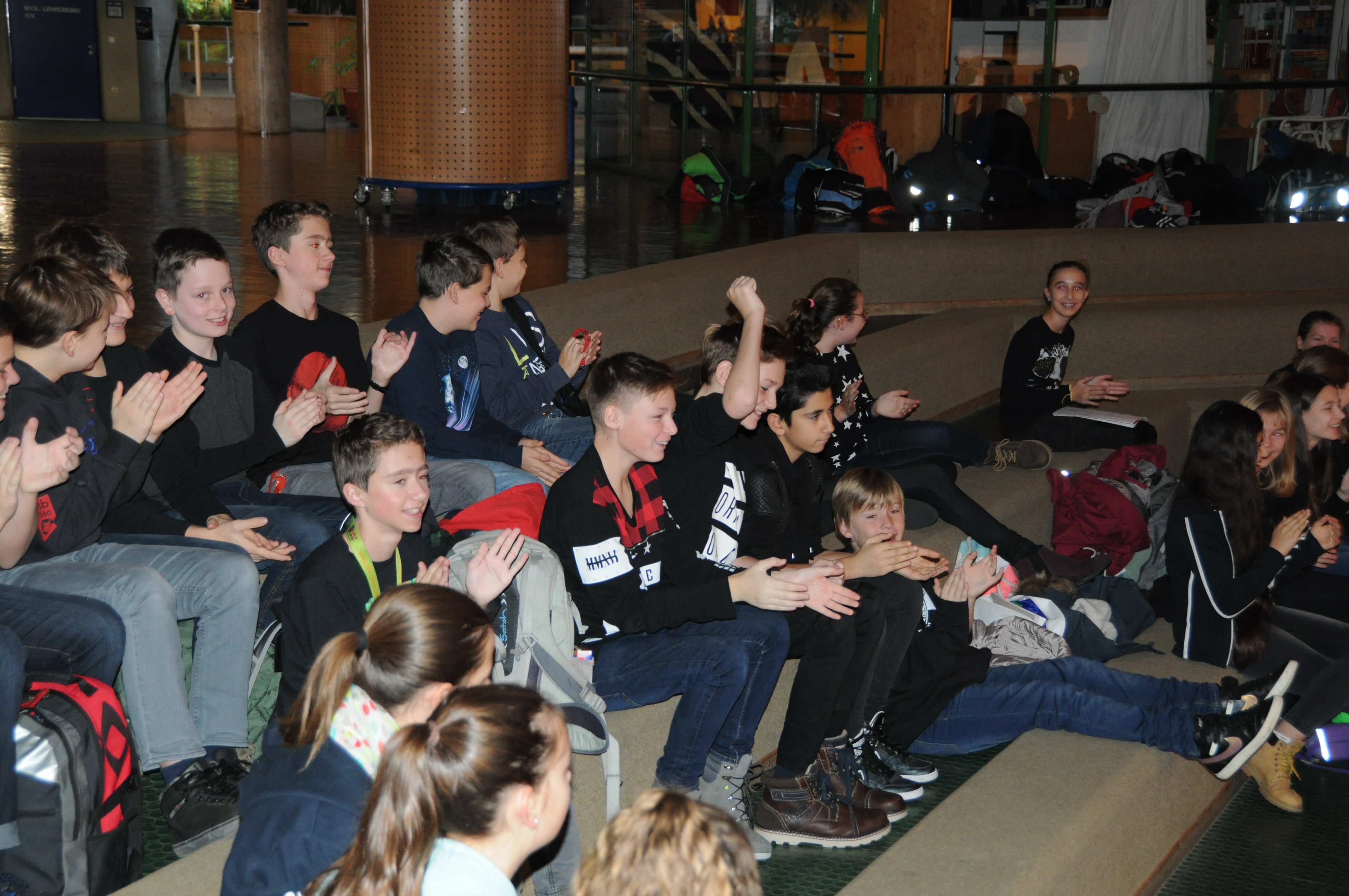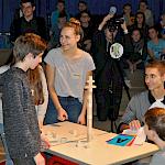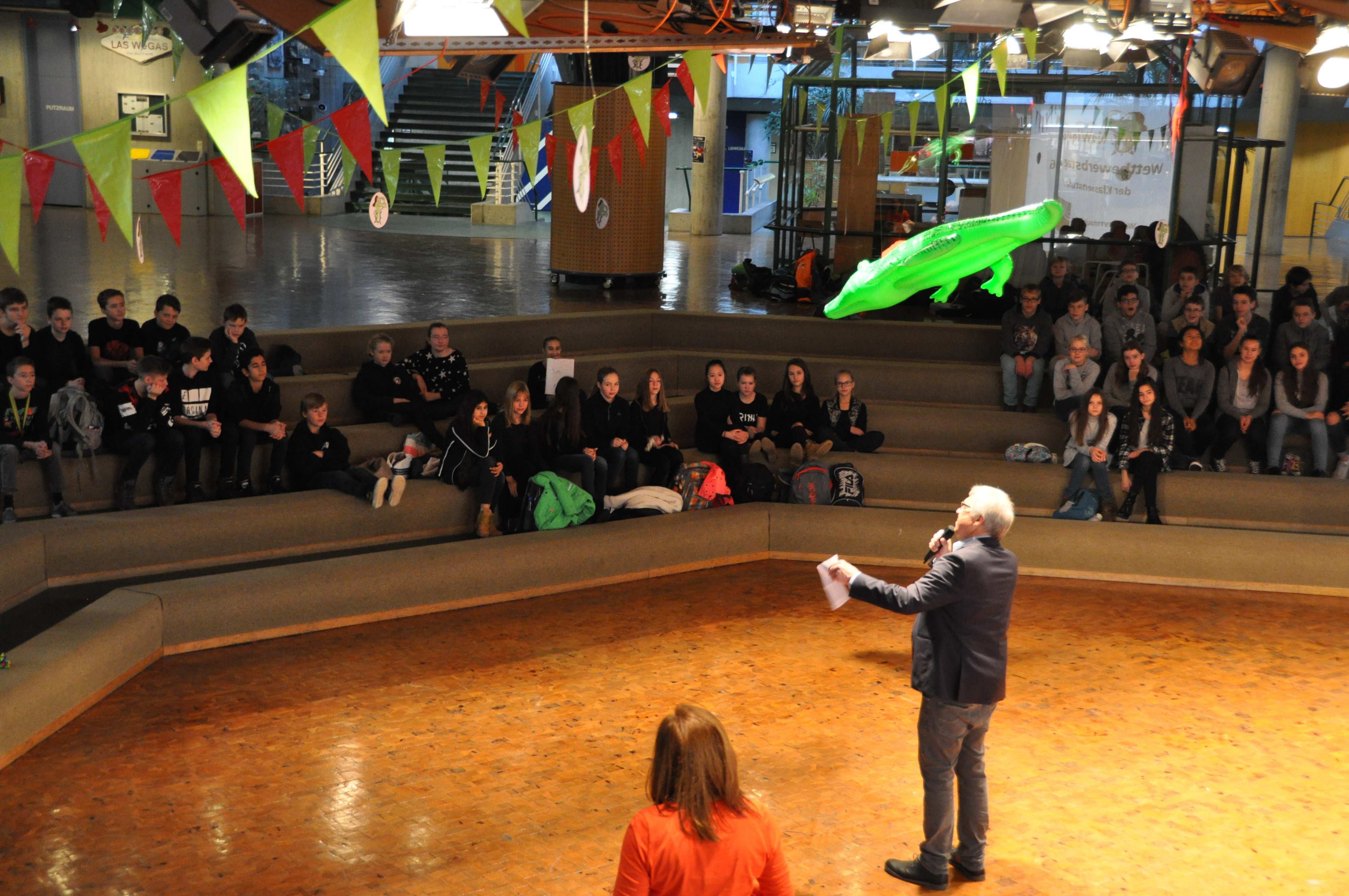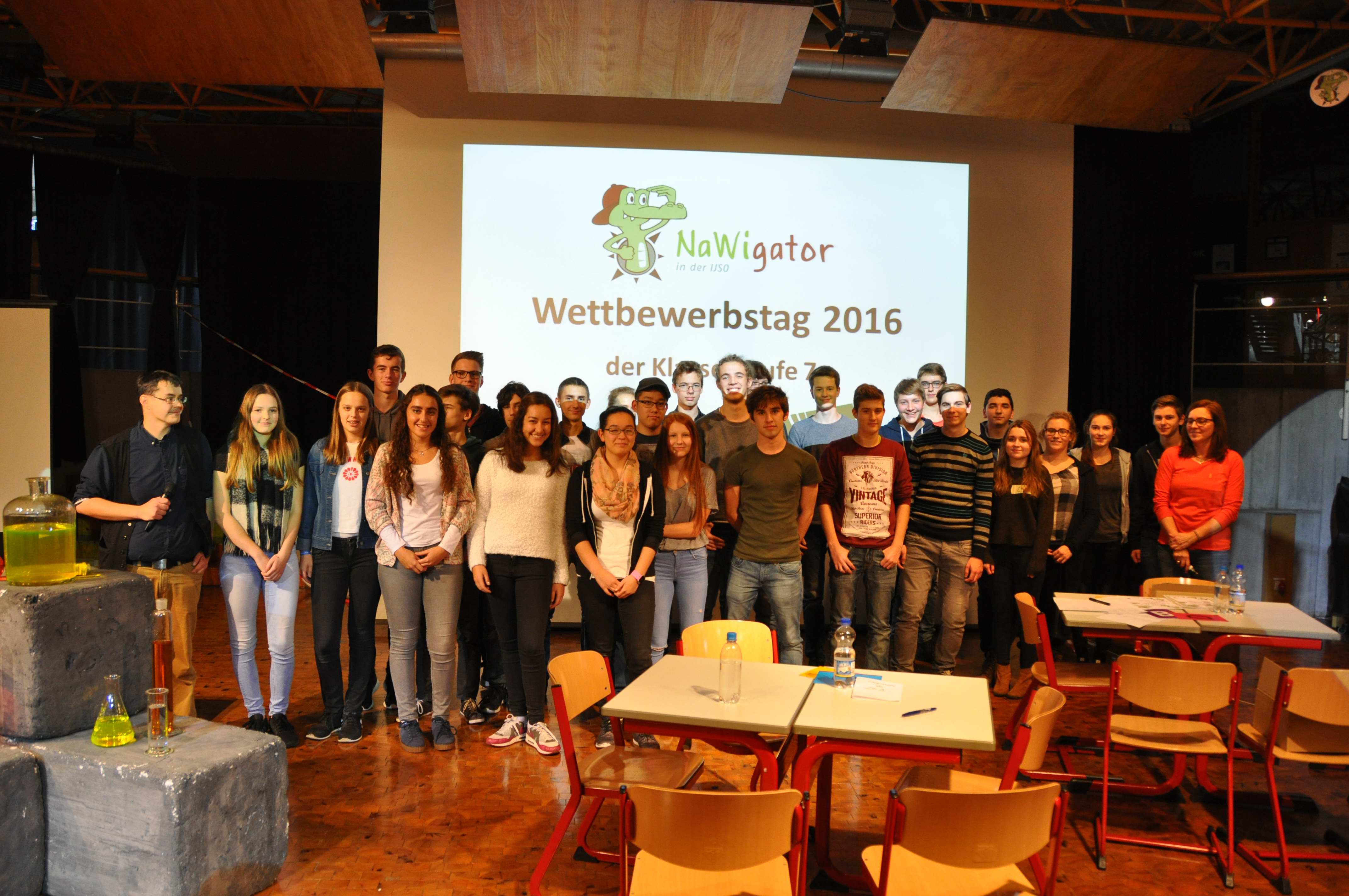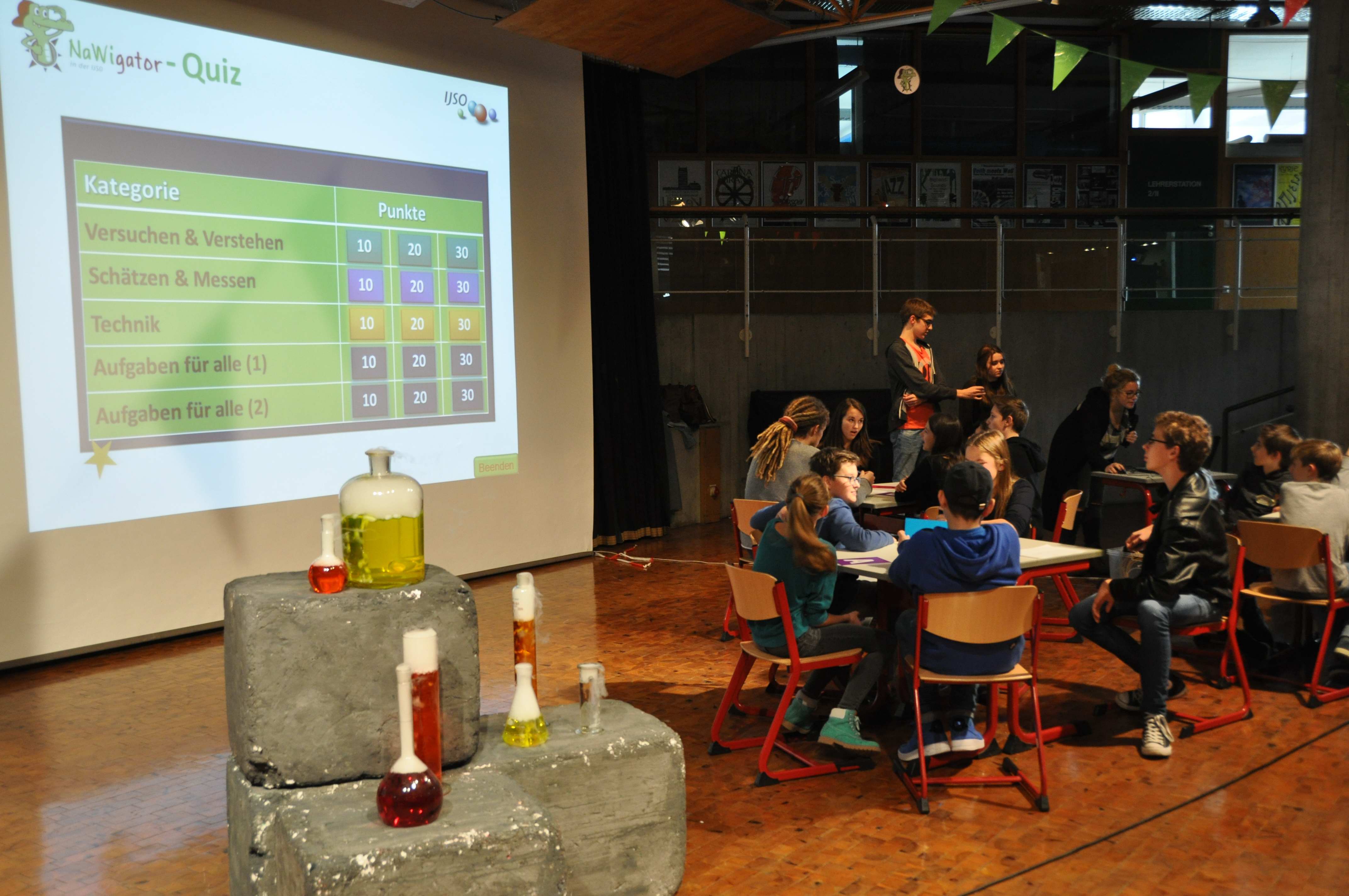 Unser erster NaWigatortag wurde morgens feierlich durch Herrn Schölzel eröffnet. Durch Losentscheid wurde die gesamte Klassenstufe 7 zunächst in Viererteams aufgeteilt. Natürlich mussten sich die Teams dann erst mal passende Namen aussuchen. Und dann startete der Wettbewerbstag schon damit, dass bis 9.30 Uhr das "NaWigator"-Quiz durchgeführt wurde. Das Quiz - wie der gesamte Tag - wurde von Schülerinnen und Schülern der Klassenstufe 10 und JG1 angeleitet und betreut. Pünktlich zur geplanten Zeit waren alle Gruppen dann auch mit der darauf folgenden NaWigator-Ralley fertig. Auch die Gruppen, die sich entschlossen hatten, die gesamte Zeit zu nutzen und alle Stationen zu durchlaufen. Einge Stationen, wie der Eier-Crashtest, das Ei in der Flasche oder das Katapult waren offensichtlich einfach so spannend, dass dort alle mal mitmachen wollten, obwohl ja insgesamt nur 6 Stationen von 8 angebotenen ausgewählt werden mussten. Beim Katapult hat es die beste Gruppe auf über 20 Meter Gummibärchenschleuderweite geschafft - unglaublich! Die Schülermentoren und Schülermentorinnen halfen noch einmal kräftig beim Aufräumen der Stationen, so dass alle Beteiligten bis zur Endrunde am Nachmittag noch genügend Zeit hatten, um das extra von der Mensamannschaft angebotene "Dino-Menu" mit tierischer Deko zu genießen. Die Schlange an der Essensausgabe war lang und es hat offensichtlich allen geschmeckt.