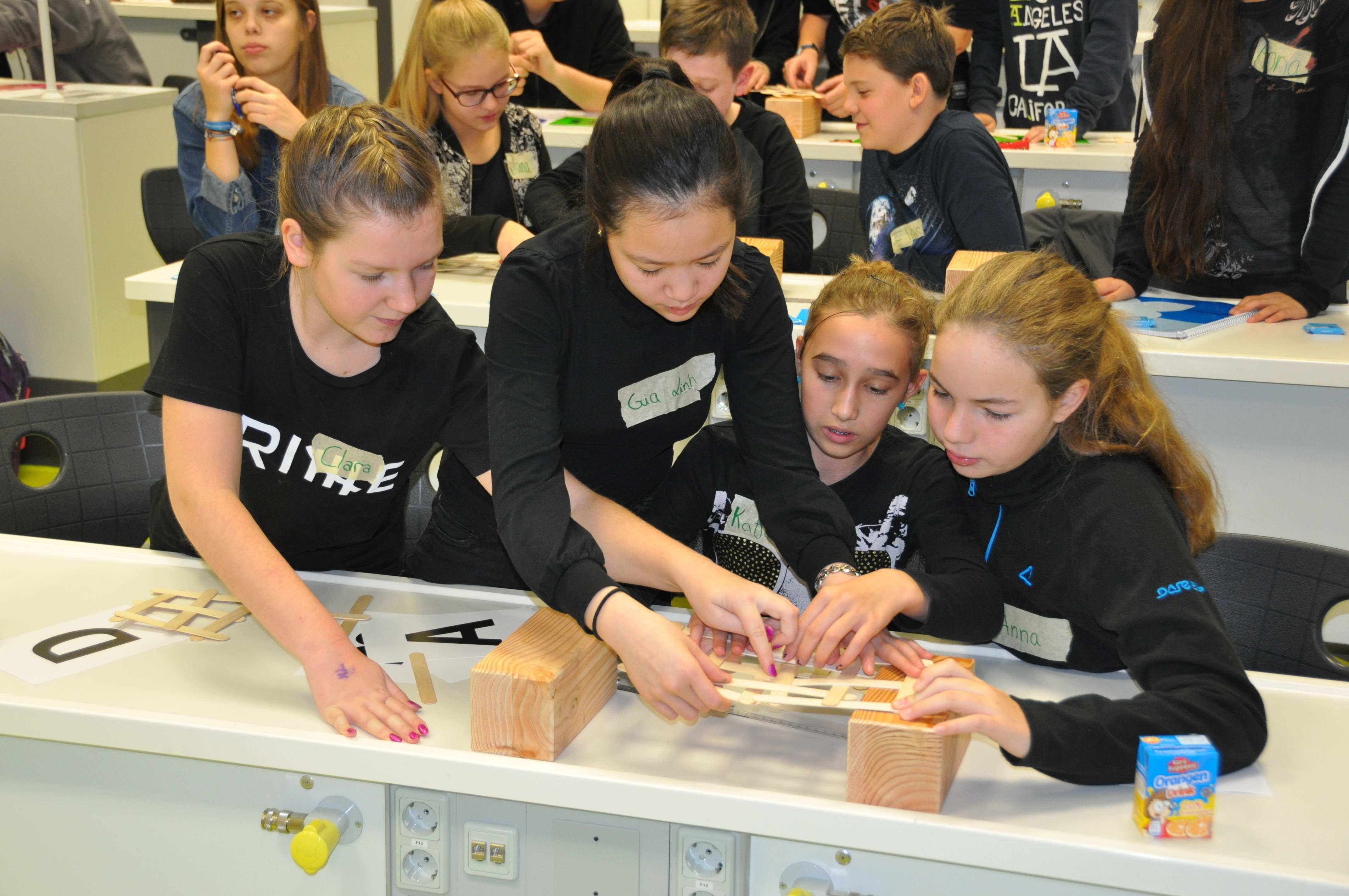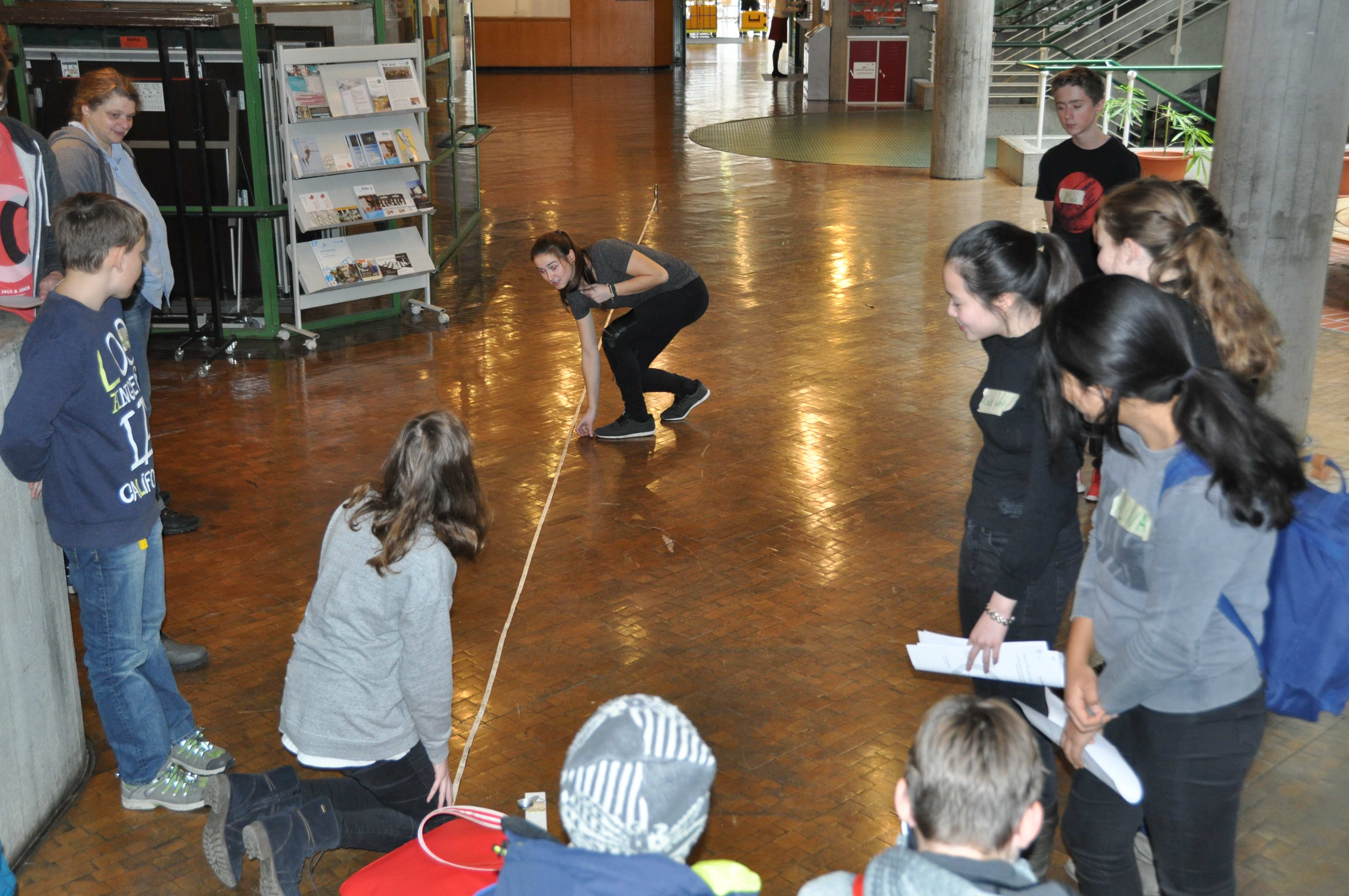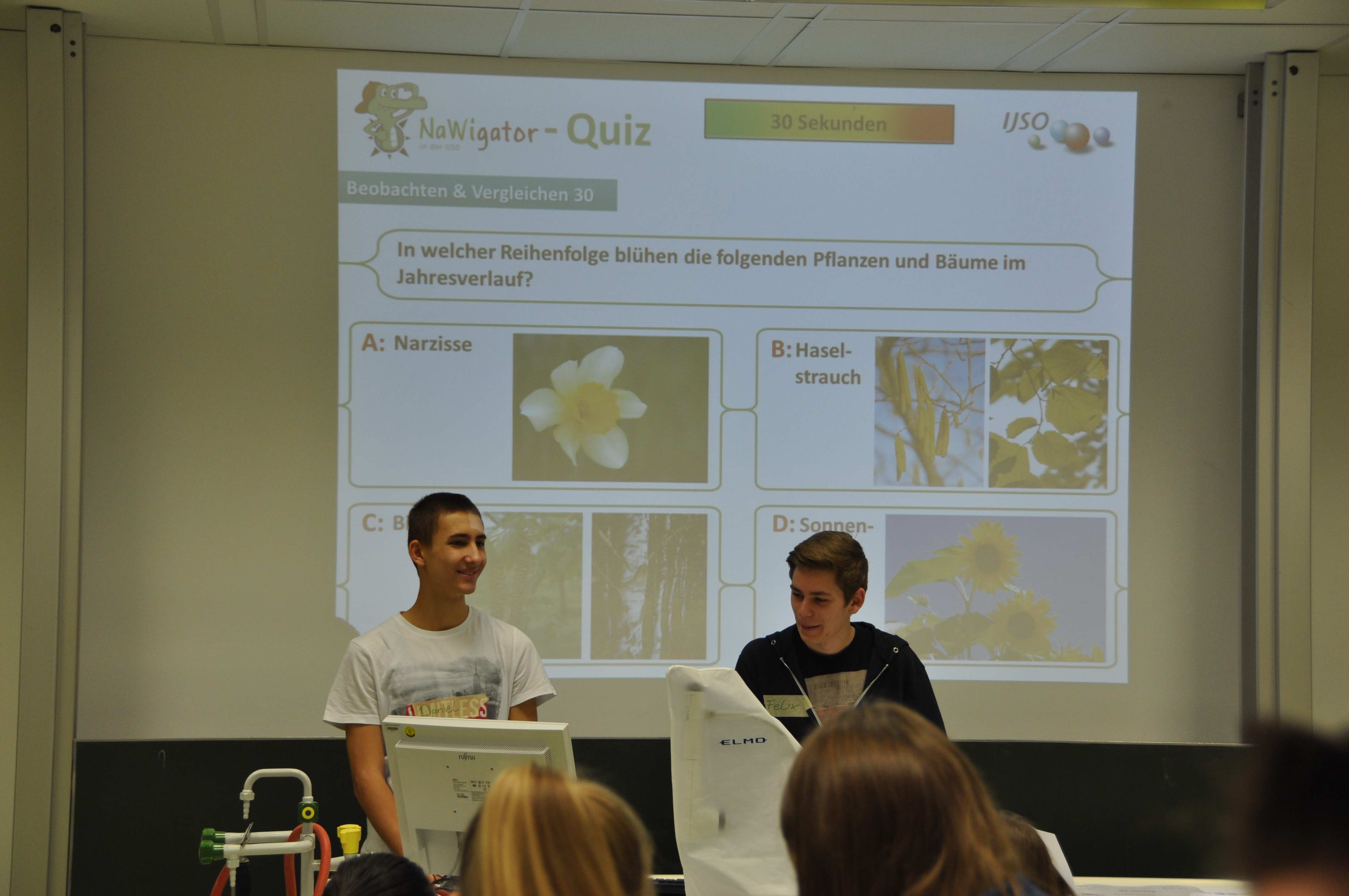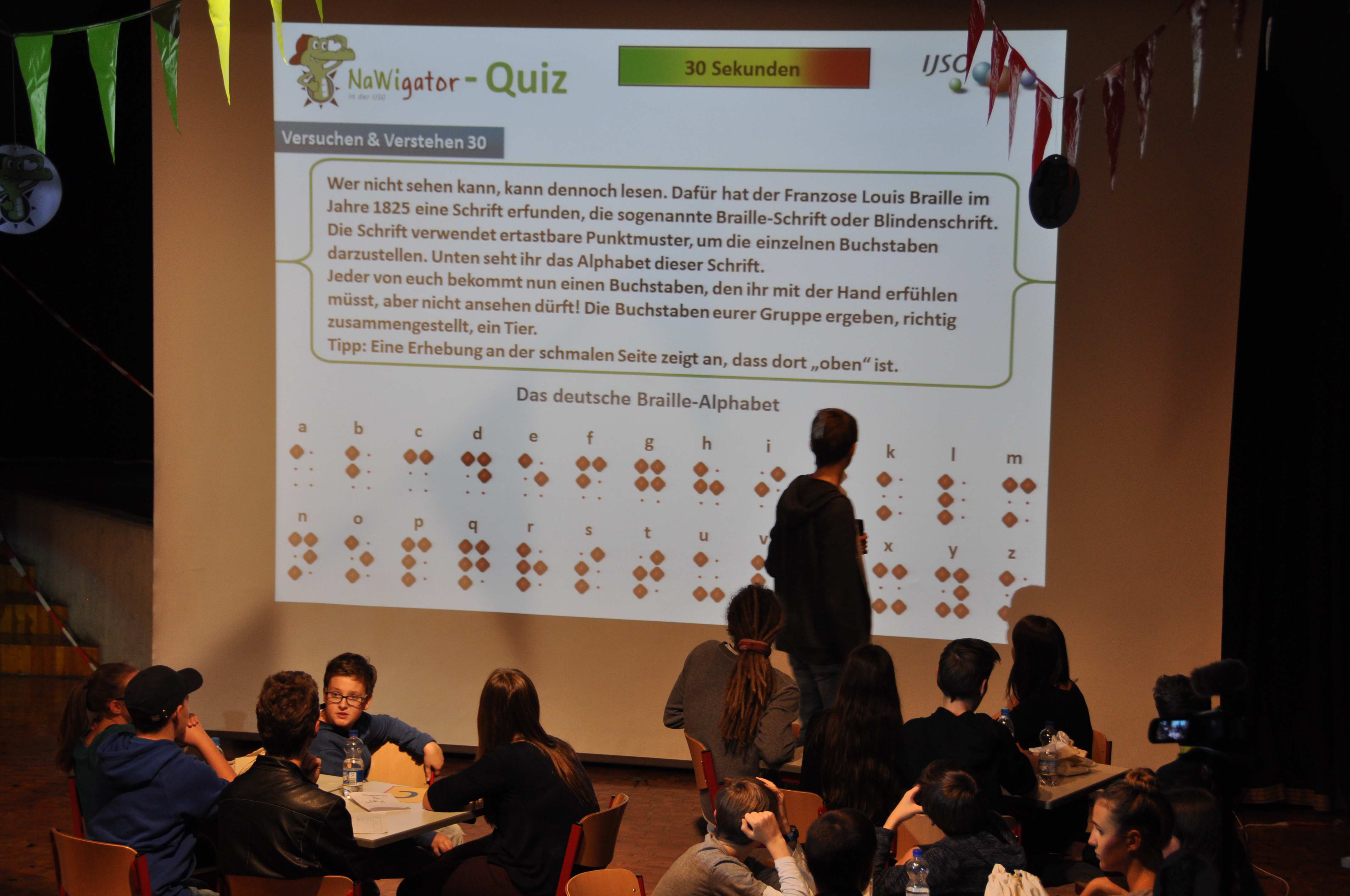 Unser erster NaWigatortag wurde morgens feierlich durch Herrn Schölzel eröffnet. Durch Losentscheid wurde die gesamte Klassenstufe 7 zunächst in Viererteams aufgeteilt. Natürlich mussten sich die Teams dann erst mal passende Namen aussuchen. Und dann startete der Wettbewerbstag schon damit, dass bis 9.30 Uhr das "NaWigator"-Quiz durchgeführt wurde. Das Quiz - wie der gesamte Tag - wurde von Schülerinnen und Schülern der Klassenstufe 10 und JG1 angeleitet und betreut. Pünktlich zur geplanten Zeit waren alle Gruppen dann auch mit der darauf folgenden NaWigator-Ralley fertig. Auch die Gruppen, die sich entschlossen hatten, die gesamte Zeit zu nutzen und alle Stationen zu durchlaufen. Einge Stationen, wie der Eier-Crashtest, das Ei in der Flasche oder das Katapult waren offensichtlich einfach so spannend, dass dort alle mal mitmachen wollten, obwohl ja insgesamt nur 6 Stationen von 8 angebotenen ausgewählt werden mussten. Beim Katapult hat es die beste Gruppe auf über 20 Meter Gummibärchenschleuderweite geschafft - unglaublich! Die Schülermentoren und Schülermentorinnen halfen noch einmal kräftig beim Aufräumen der Stationen, so dass alle Beteiligten bis zur Endrunde am Nachmittag noch genügend Zeit hatten, um das extra von der Mensamannschaft angebotene "Dino-Menu" mit tierischer Deko zu genießen. Die Schlange an der Essensausgabe war lang und es hat offensichtlich allen geschmeckt.