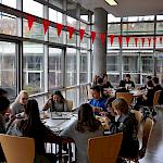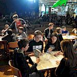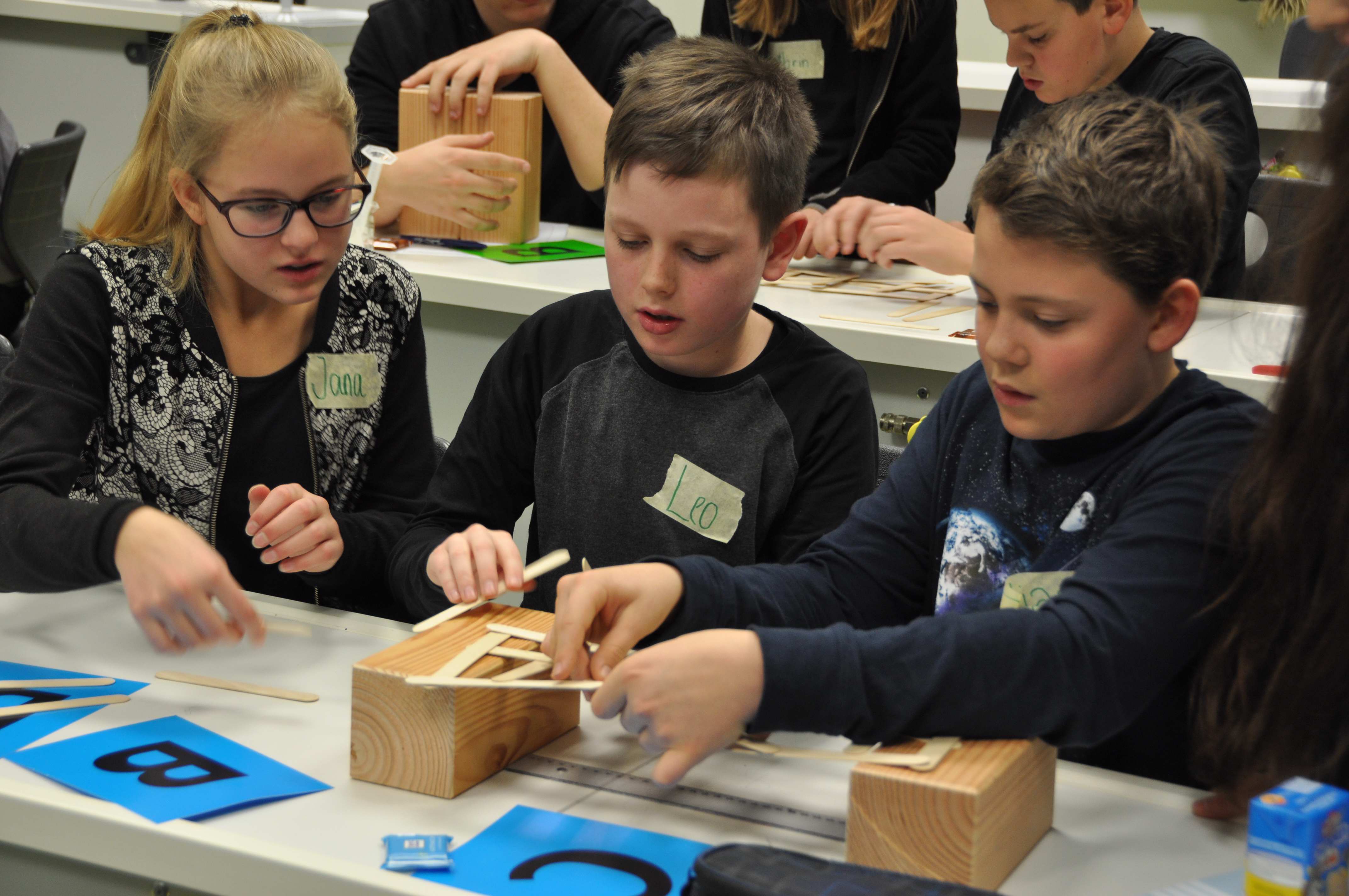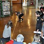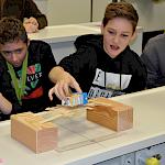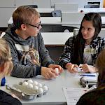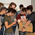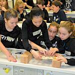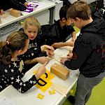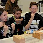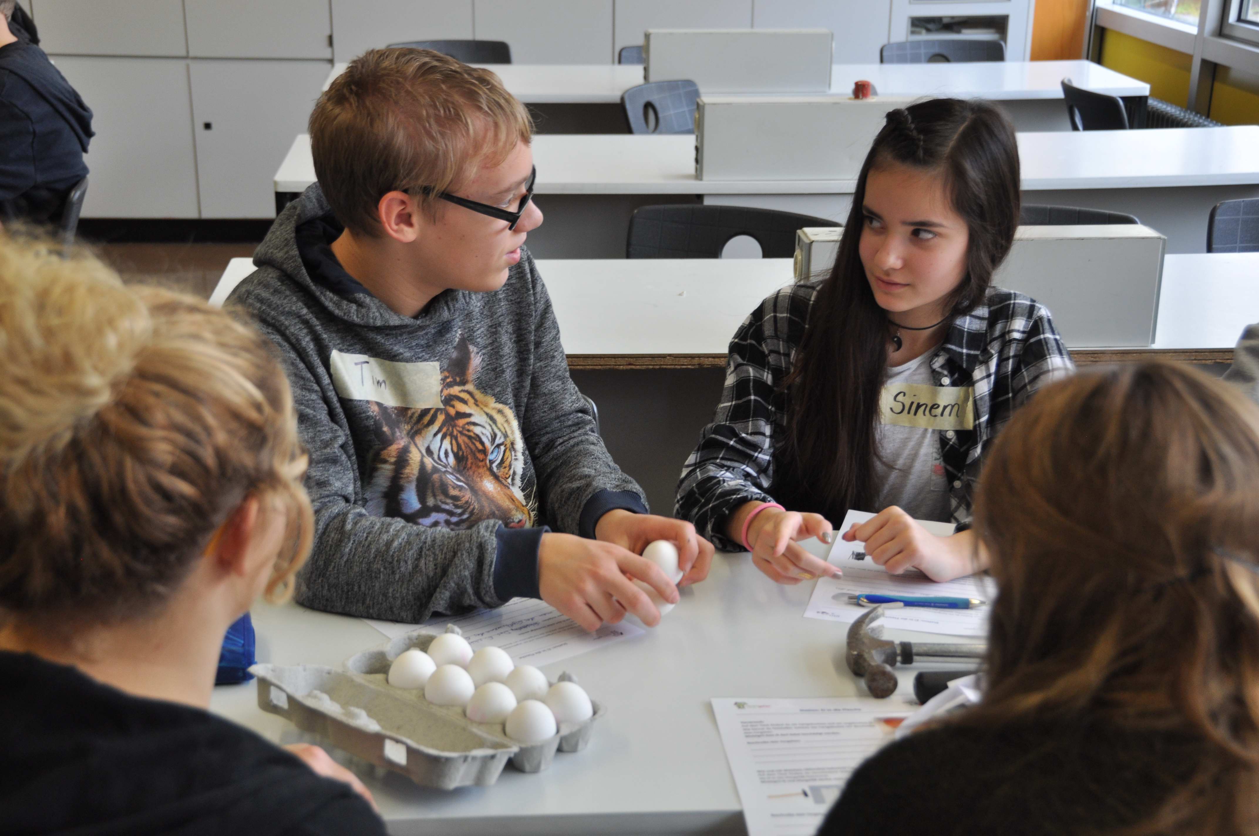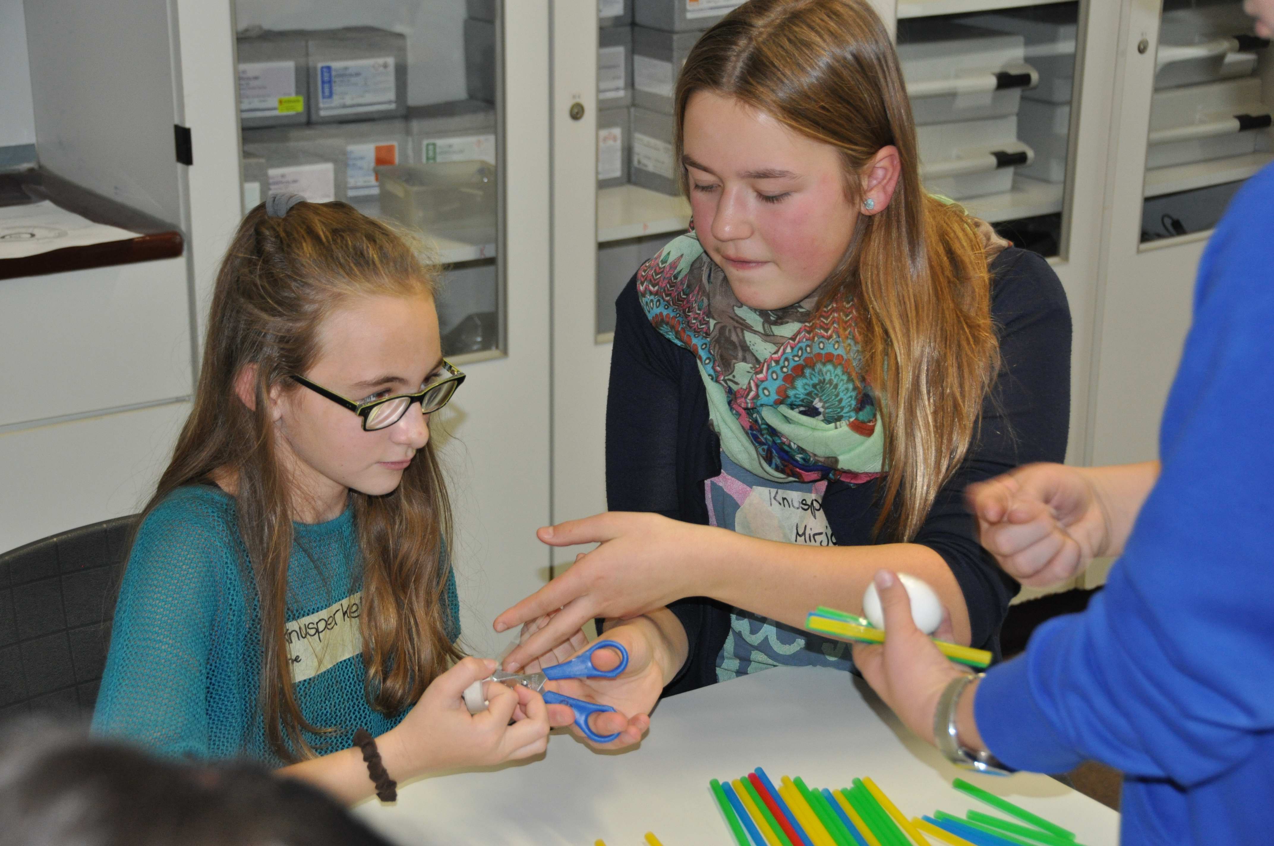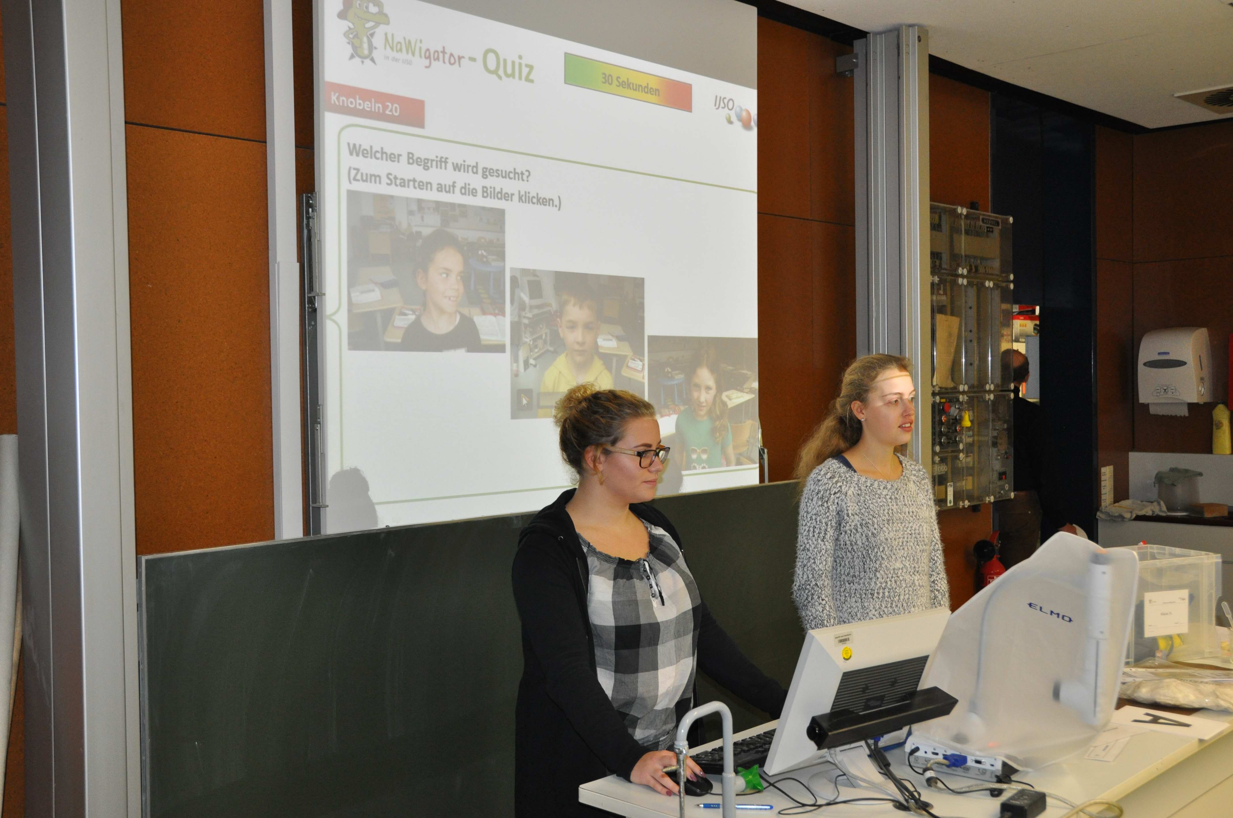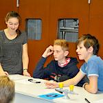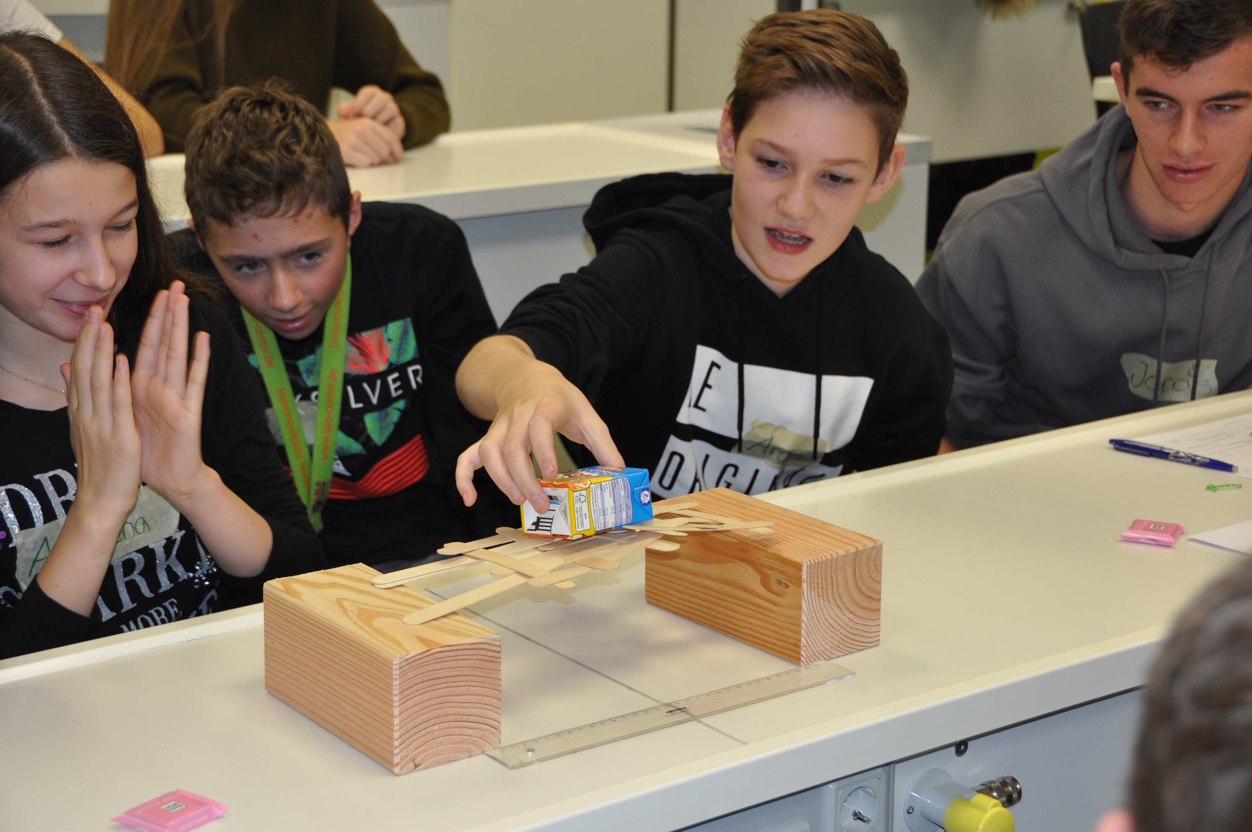 Unser erster NaWigatortag wurde morgens feierlich durch Herrn Schölzel eröffnet. Durch Losentscheid wurde die gesamte Klassenstufe 7 zunächst in Viererteams aufgeteilt. Natürlich mussten sich die Teams dann erst mal passende Namen aussuchen. Und dann startete der Wettbewerbstag schon damit, dass bis 9.30 Uhr das "NaWigator"-Quiz durchgeführt wurde. Das Quiz - wie der gesamte Tag - wurde von Schülerinnen und Schülern der Klassenstufe 10 und JG1 angeleitet und betreut. Pünktlich zur geplanten Zeit waren alle Gruppen dann auch mit der darauf folgenden NaWigator-Ralley fertig. Auch die Gruppen, die sich entschlossen hatten, die gesamte Zeit zu nutzen und alle Stationen zu durchlaufen. Einge Stationen, wie der Eier-Crashtest, das Ei in der Flasche oder das Katapult waren offensichtlich einfach so spannend, dass dort alle mal mitmachen wollten, obwohl ja insgesamt nur 6 Stationen von 8 angebotenen ausgewählt werden mussten. Beim Katapult hat es die beste Gruppe auf über 20 Meter Gummibärchenschleuderweite geschafft - unglaublich! Die Schülermentoren und Schülermentorinnen halfen noch einmal kräftig beim Aufräumen der Stationen, so dass alle Beteiligten bis zur Endrunde am Nachmittag noch genügend Zeit hatten, um das extra von der Mensamannschaft angebotene "Dino-Menu" mit tierischer Deko zu genießen. Die Schlange an der Essensausgabe war lang und es hat offensichtlich allen geschmeckt.