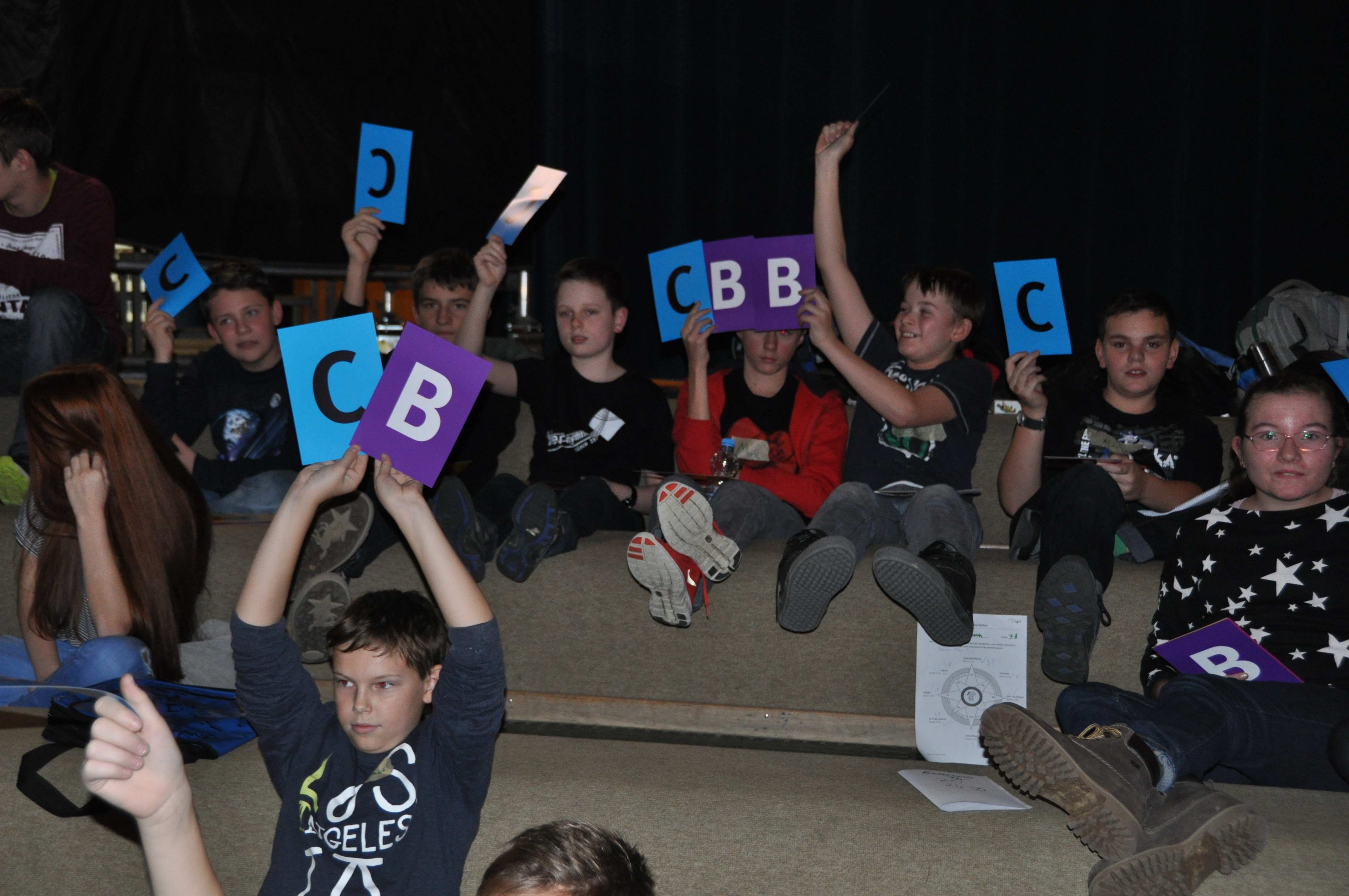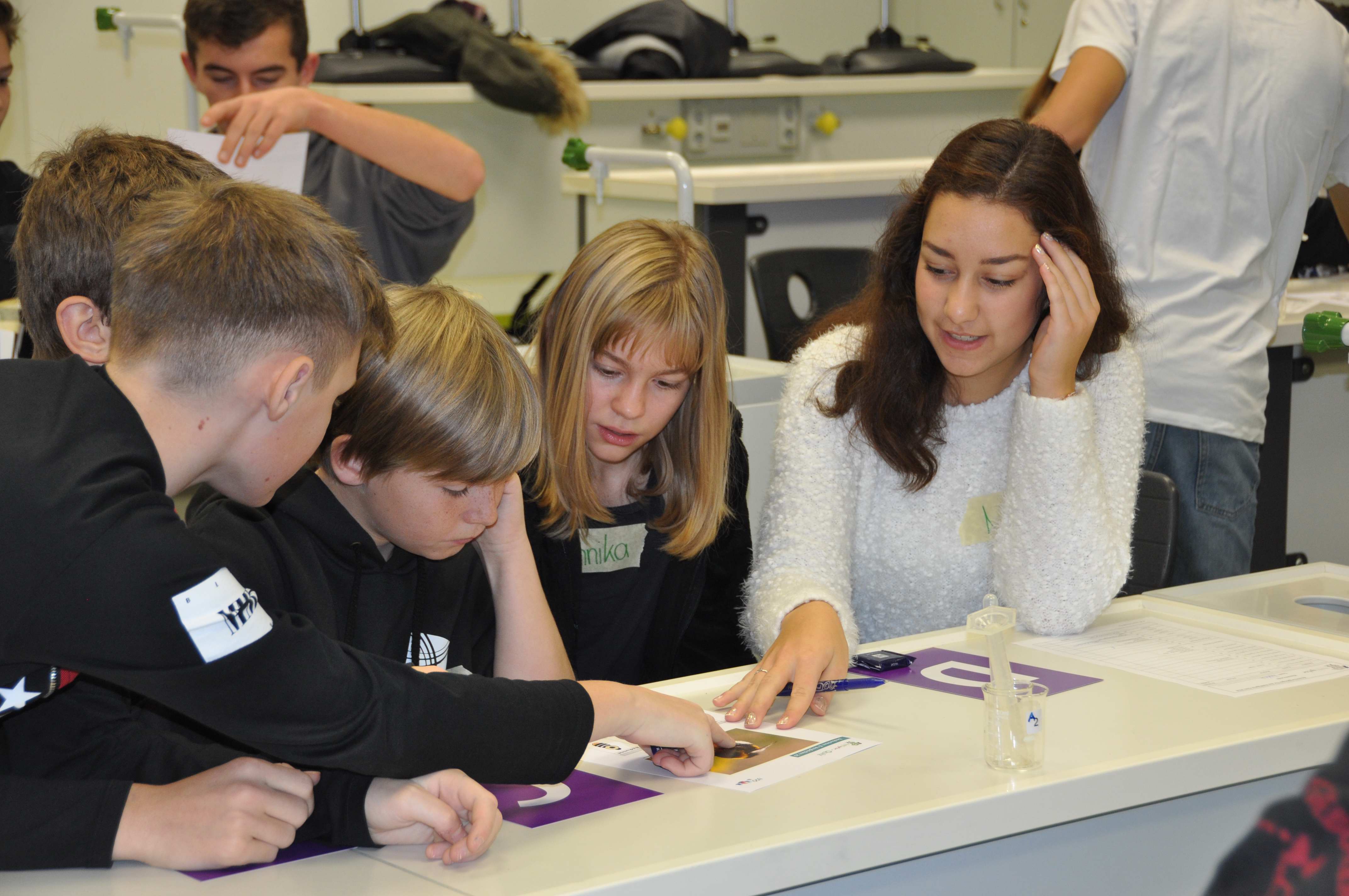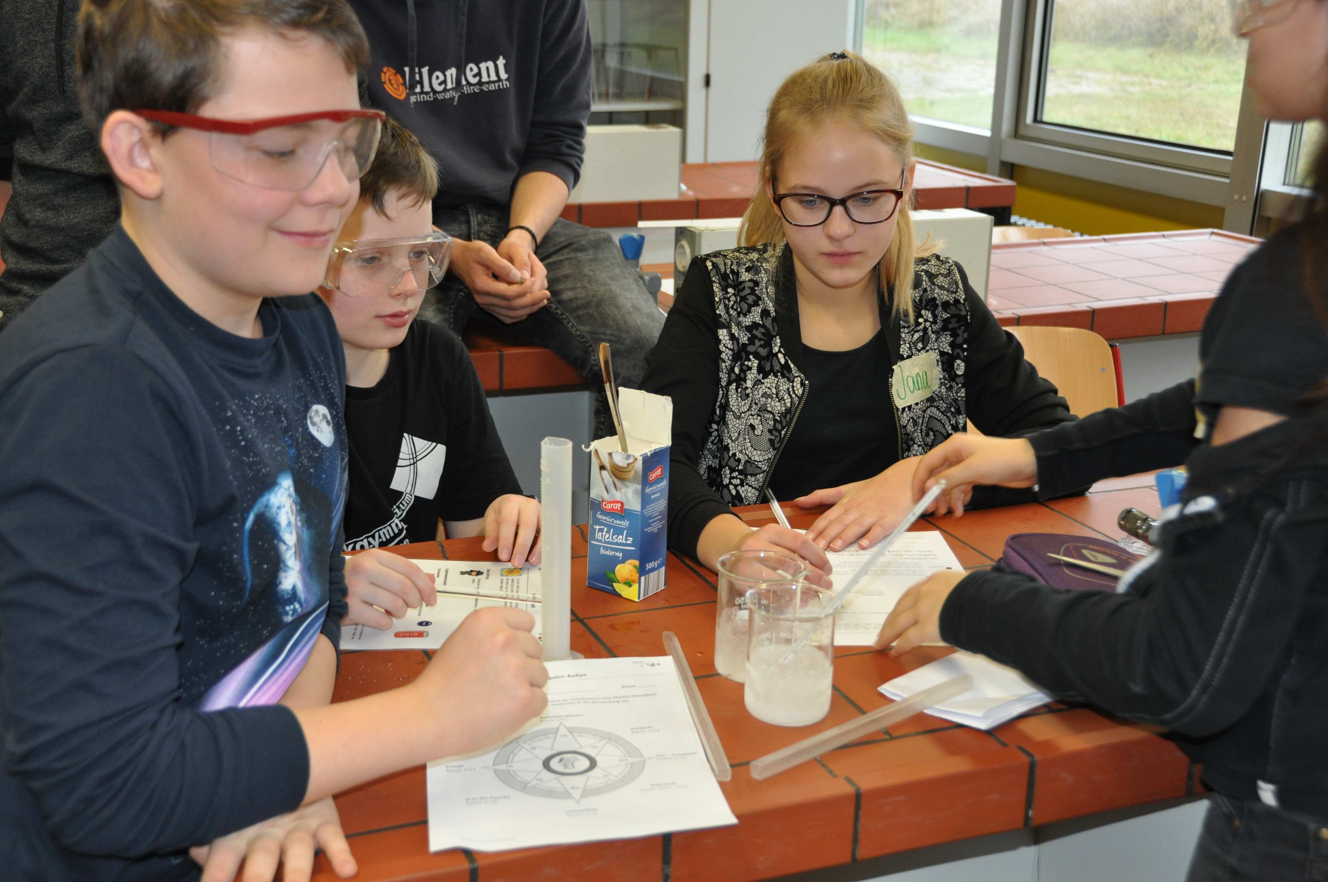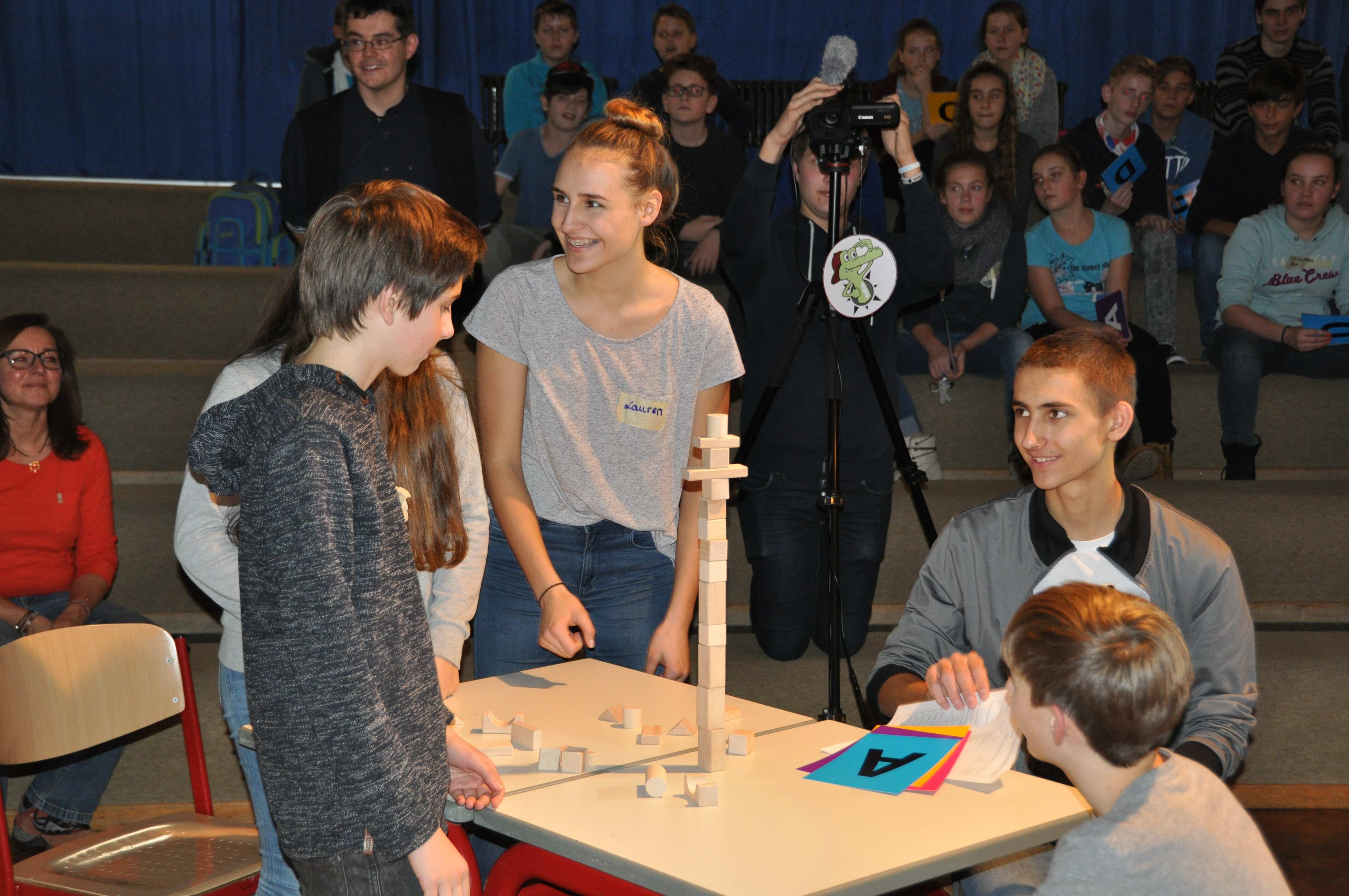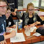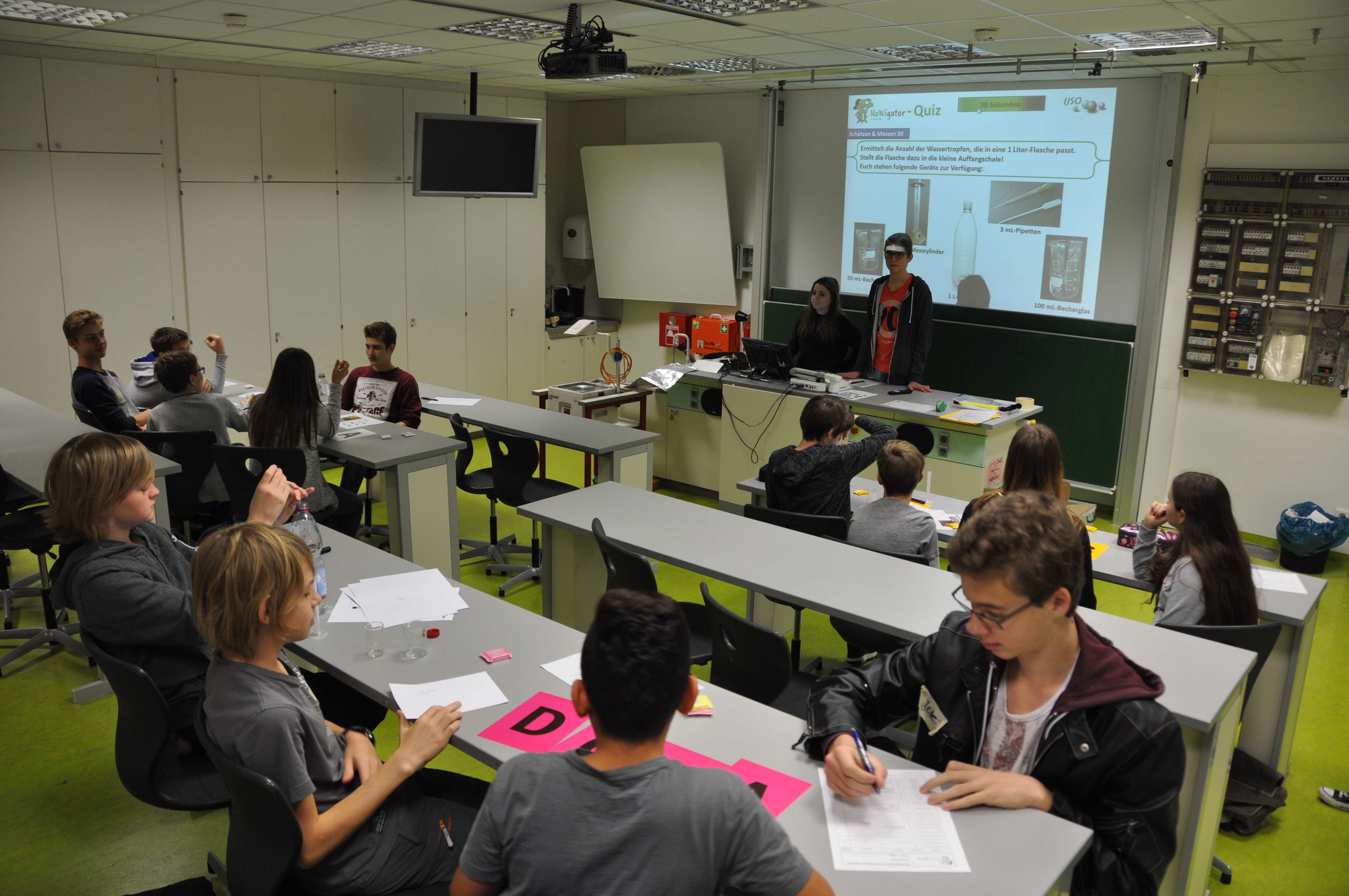 Die besten Teams der drei teilnehmenden Klassen - die "Rosa Erdbeeren", die "Knusperkekse" und die "Knusperflakes" traten dann noch einmal in einem Quiz gegeneinander an, bei dem wieder naturwissenschaftliche Wissen- und Knobelfragen gelöst und Experimente durchgeführt werden mussten. Dabei wurden sie bei einigen "Aufgaben an alle" kräftig von ihren Mitschülerinnen und Mitschülern unterstützt. Am Ende stand dann das Siegerteam schnell fest: Die "Rosa Erdbeeren" der 7b holten sich den Gesamtsieg für ihre Klasse und dürfen sich nun auf einen Besuch der "Experimenta" in Heilbronn als Preis freuen, der ihnen vom Förderverein des Werkgymnasiums spendiert wurde.
