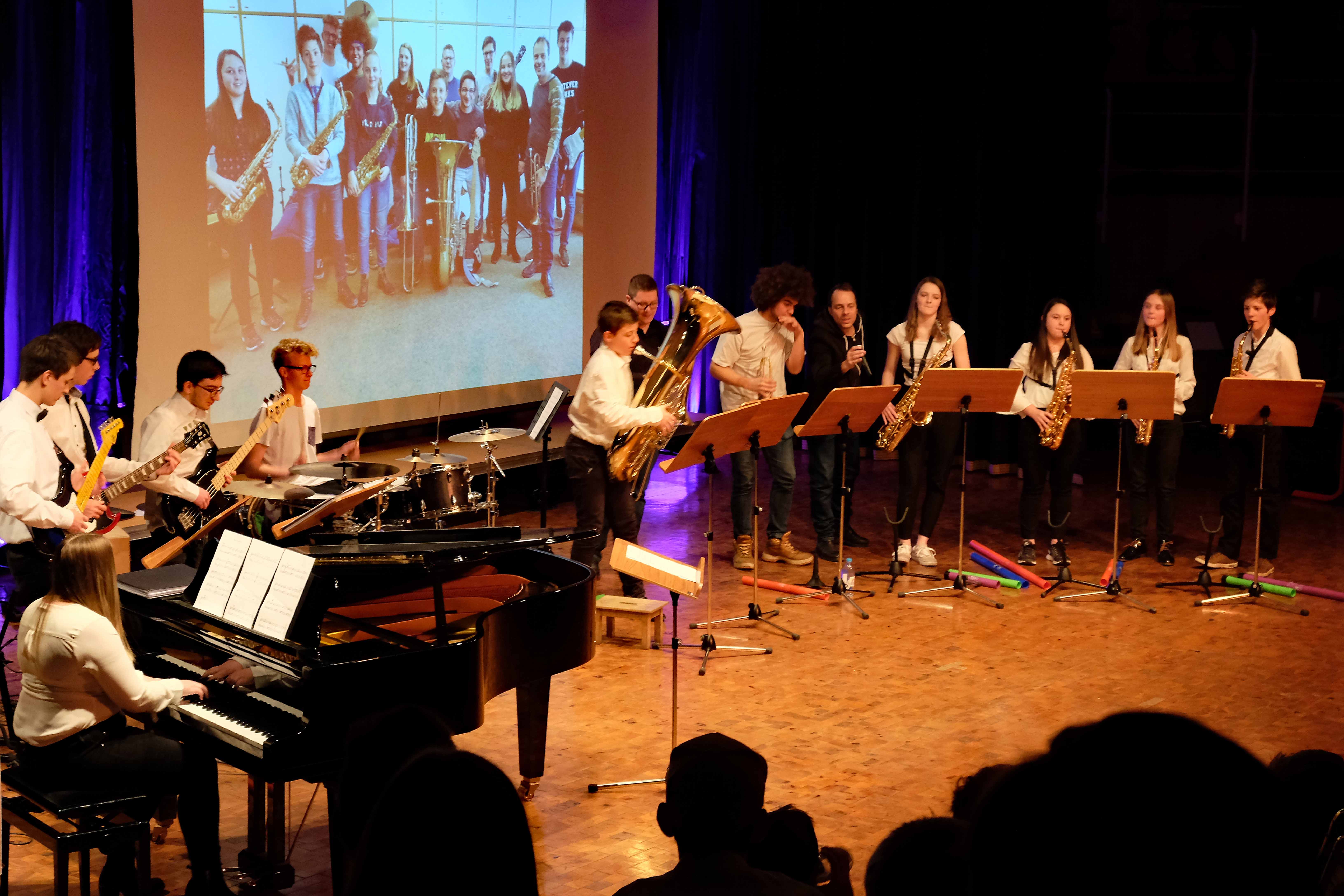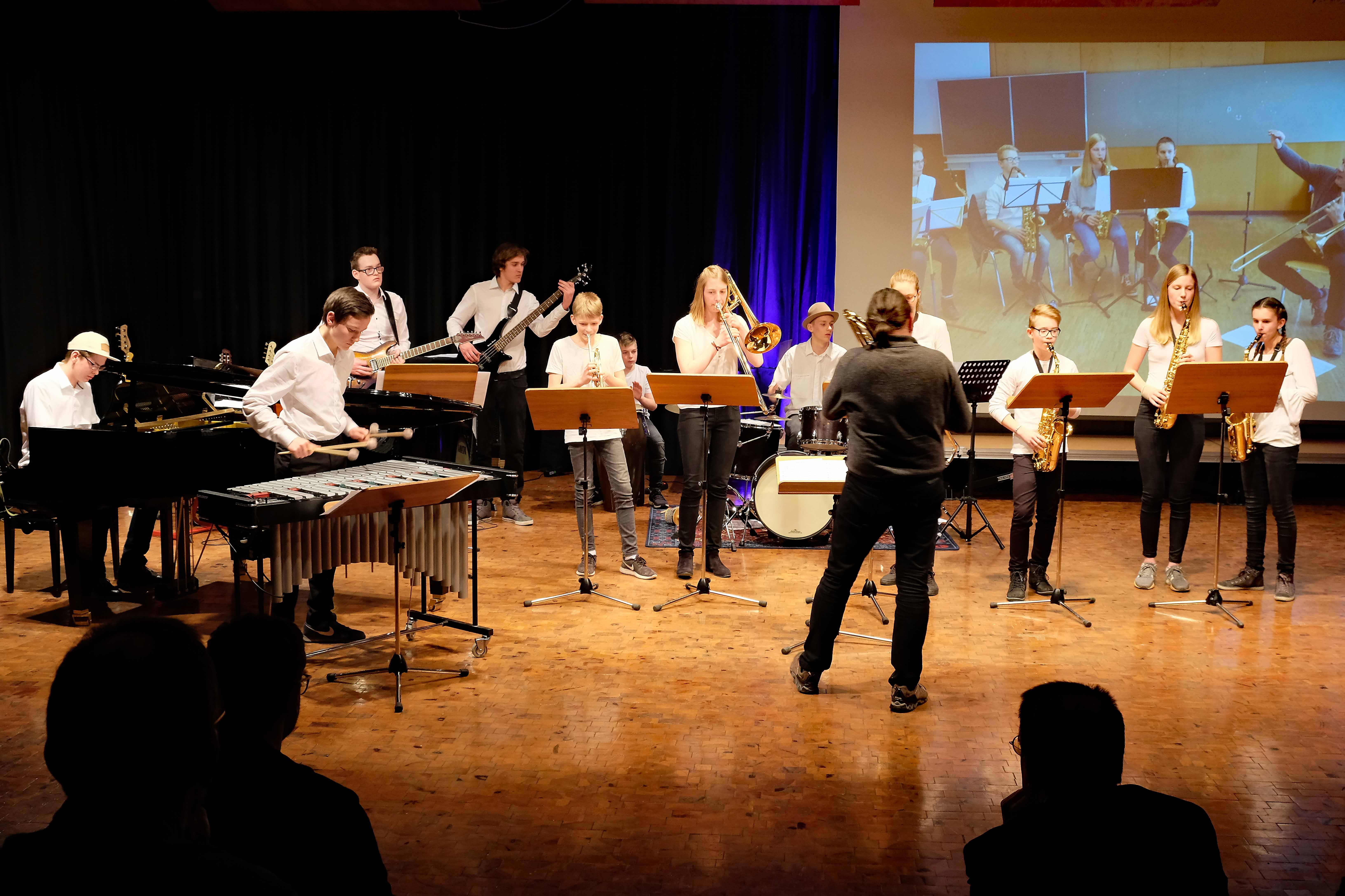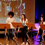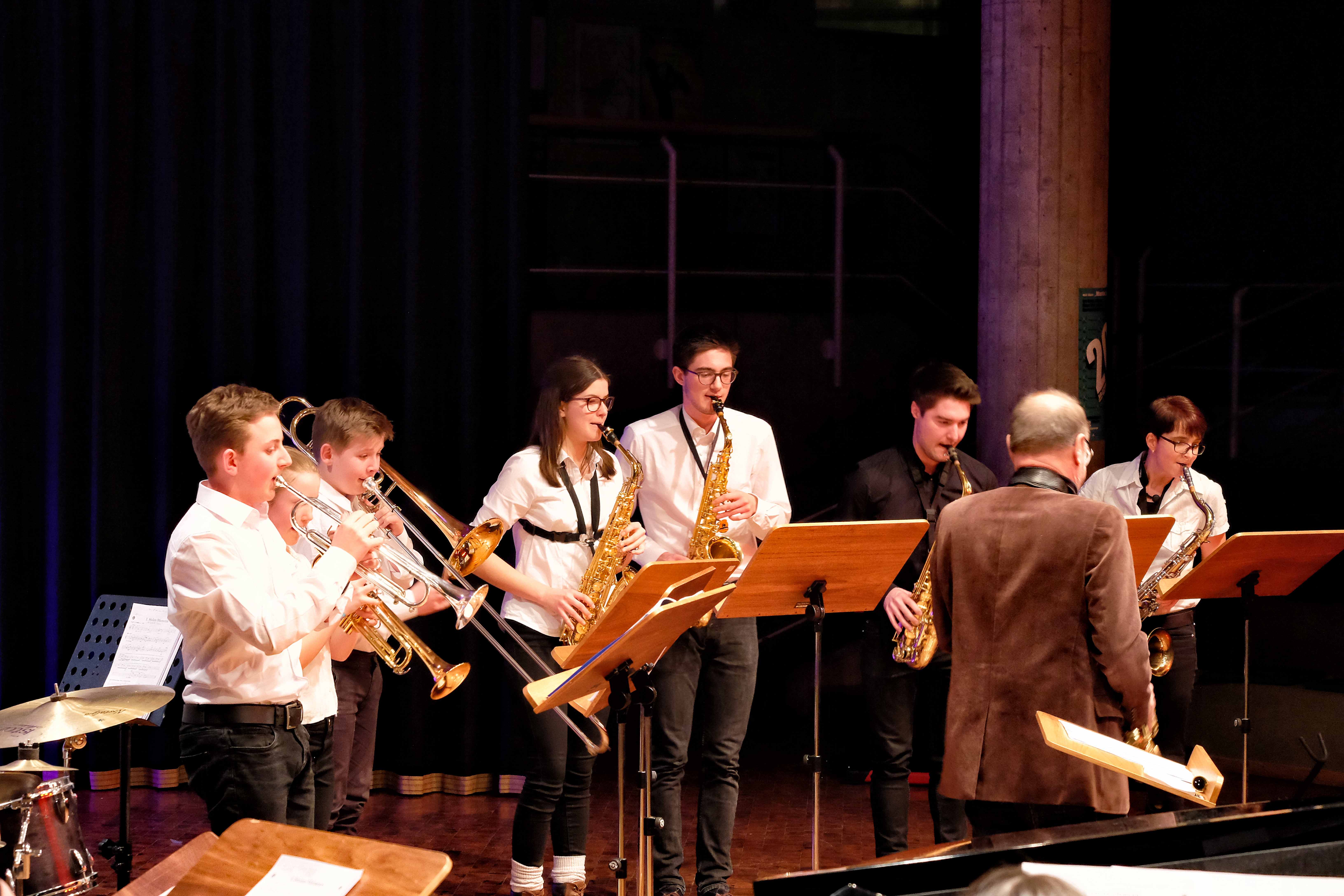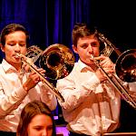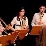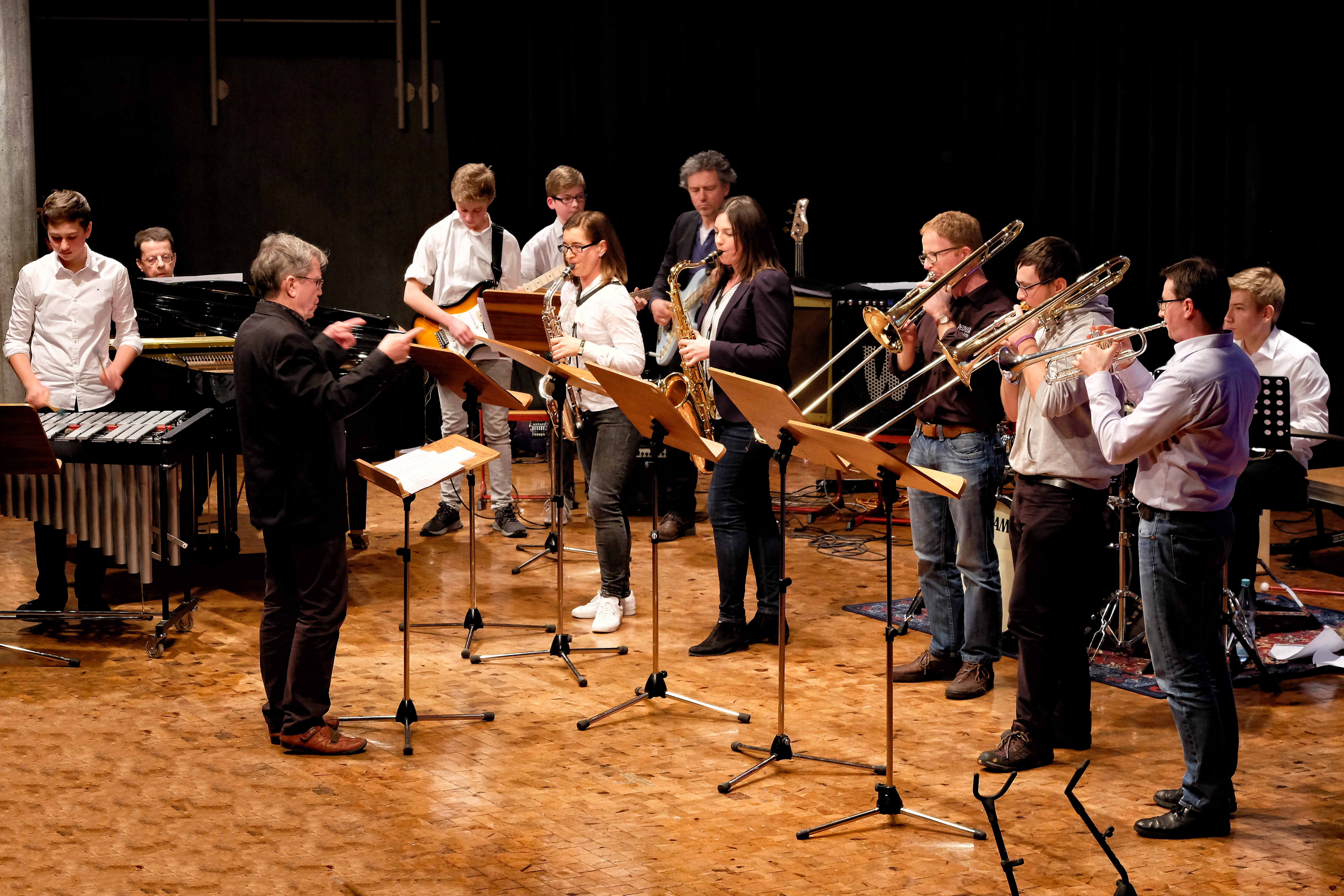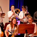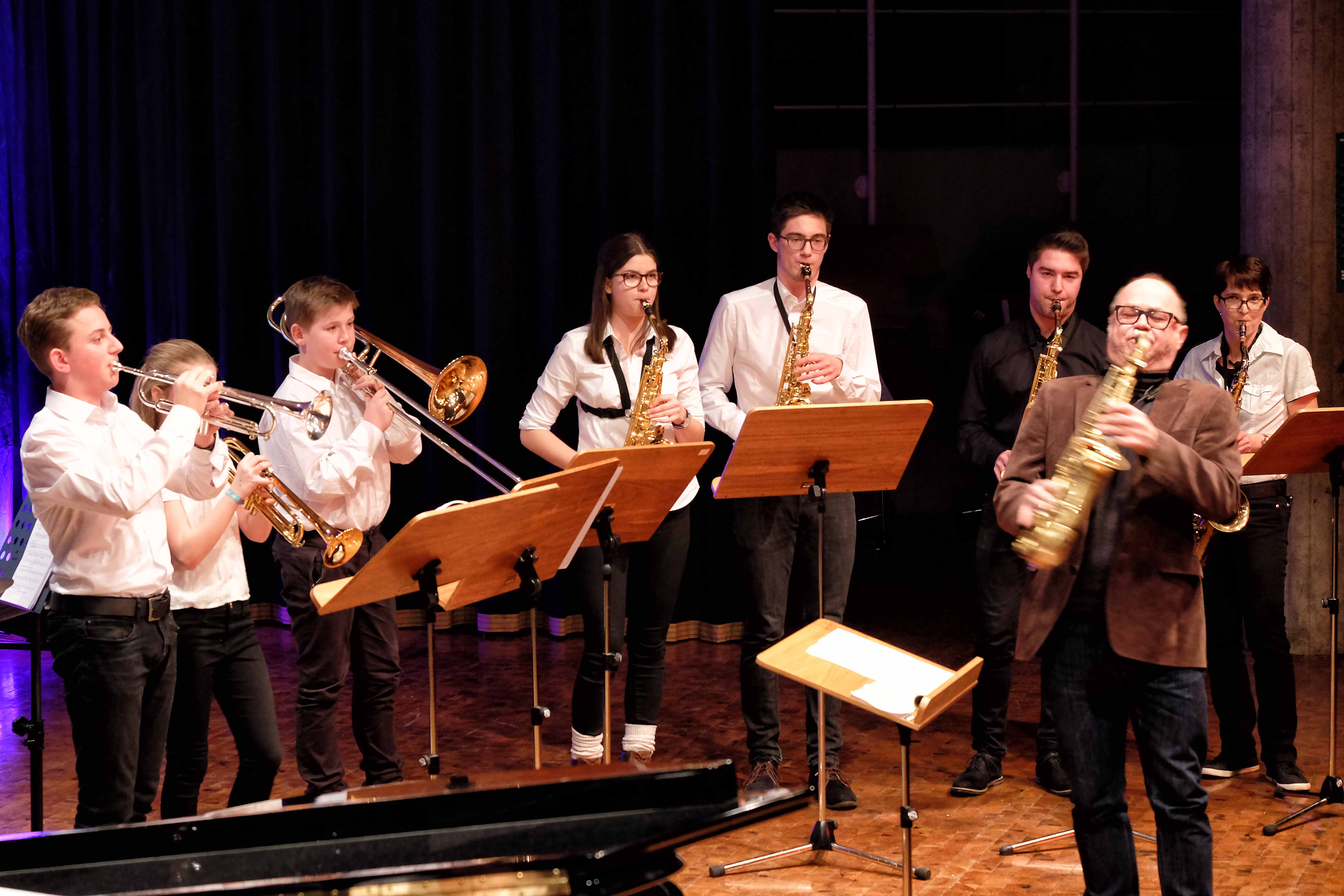 Und weil all diese Talente sich in besonderer Weise mit ihren Instrumenten hervorgetan und teilweise geradezu brilliert haben, möchten wir sie an dieser Stelle namentlich und bildlich würdigen (an dieser Stelle ein herzliches Dankeschön an Frank Keller, der diesen Abend wunderbar eingefangen hat). So spielten auf den Altsaxophonen Timon Frey, Nina Grether, Anja Necker, Jakob Krauss, Andrea Stickel, Florian Schuchter, Gabriel Ahl, Julia Junginger, Nadja Köberle und Verena Weichert. Die Tenorsaxophone ließen Martina und Jule Heisele, Samuel Junginger sowie Manuela Ittner ertönen. An der Trompete begeisterten Benjamin Vollbrecht, Attila Holczer, Ralf Müller und Alina Bantle-Müller sowie Marvin Nagel. Die Posaunen erklangen durch Lea Grether, Jonathan und Tobias Schied, Aaron Rau, Oliver Engling, Erik und Fabian Sucher sowie Andreas Köpf. Ihr Können am Piano bzw. Flügel zeigten Lukas Ignatzi, Klara Schmid und Emely Brehm. Die Gitarristen an diesem Abend waren Tim Buttkus, Stefan Eltgen, Max Maier Christian Bahls, Joshua Dittes und Oliver Germani. Für die tieferen Töne sorgten Alex Rösch, Jakob Kälble, Jakob Schmid und Peter Sucher am Bass sowie Tobias Schied mit der Tuba. Den anderen Teil der Rhythmus-Sektion am Schlagzeug übernahmen in souveräner Manier Julius Rinke, Benedict Schmid, Luis und Valentin Maier, Peter Sucher und Samuel Haffter. Last but not least glänzten Dominik Wiedemann und Aaron Rau am Vibraphon.