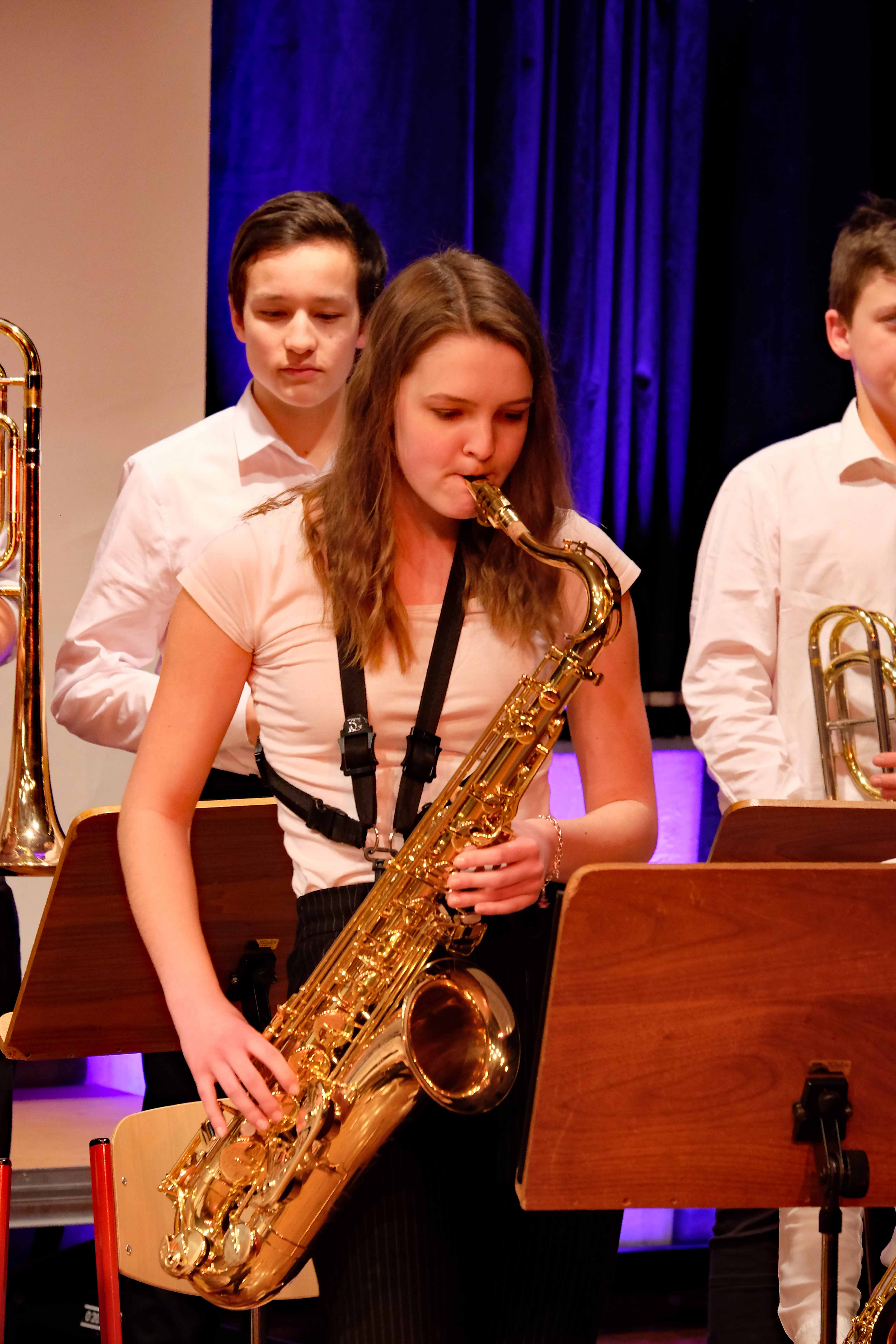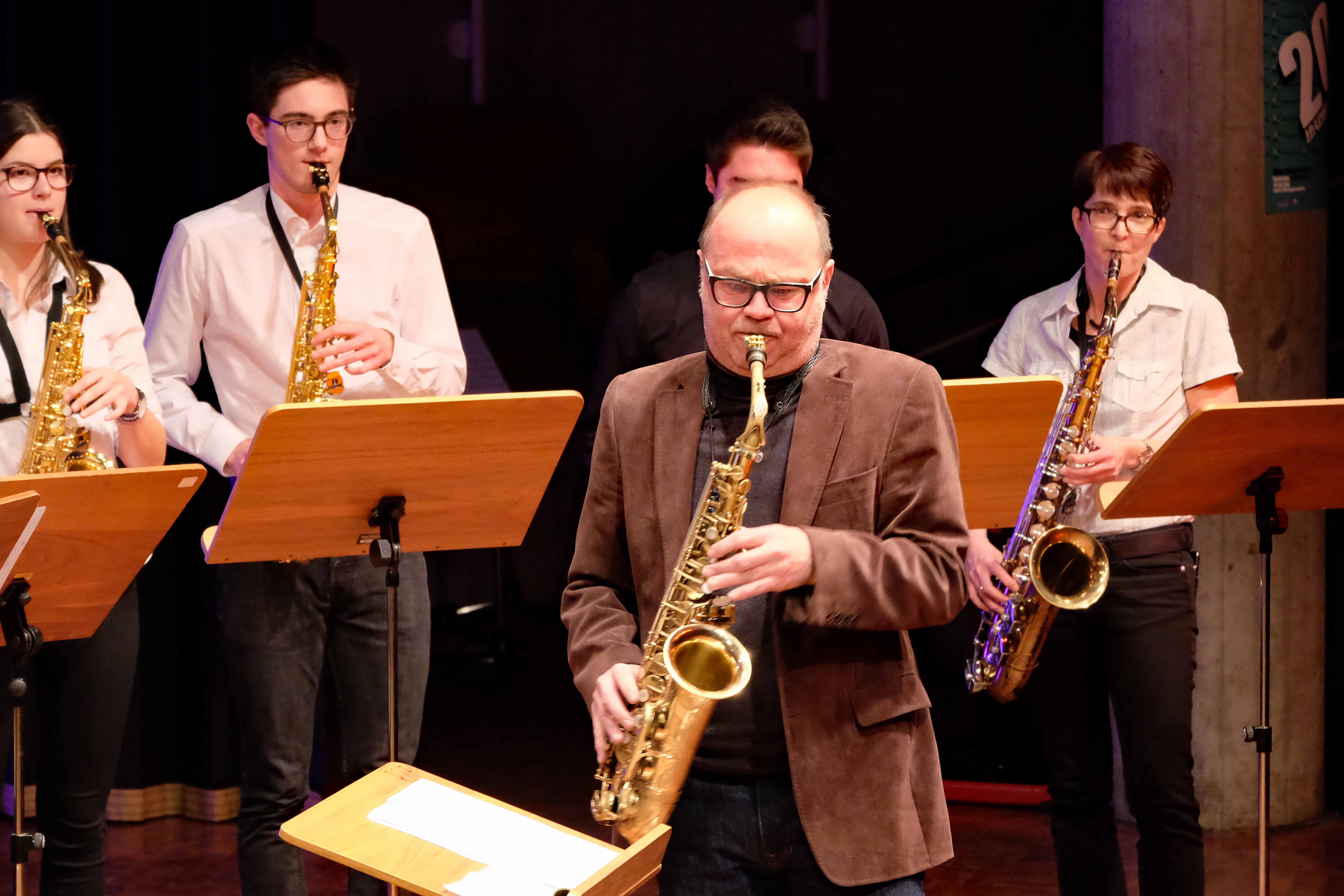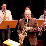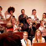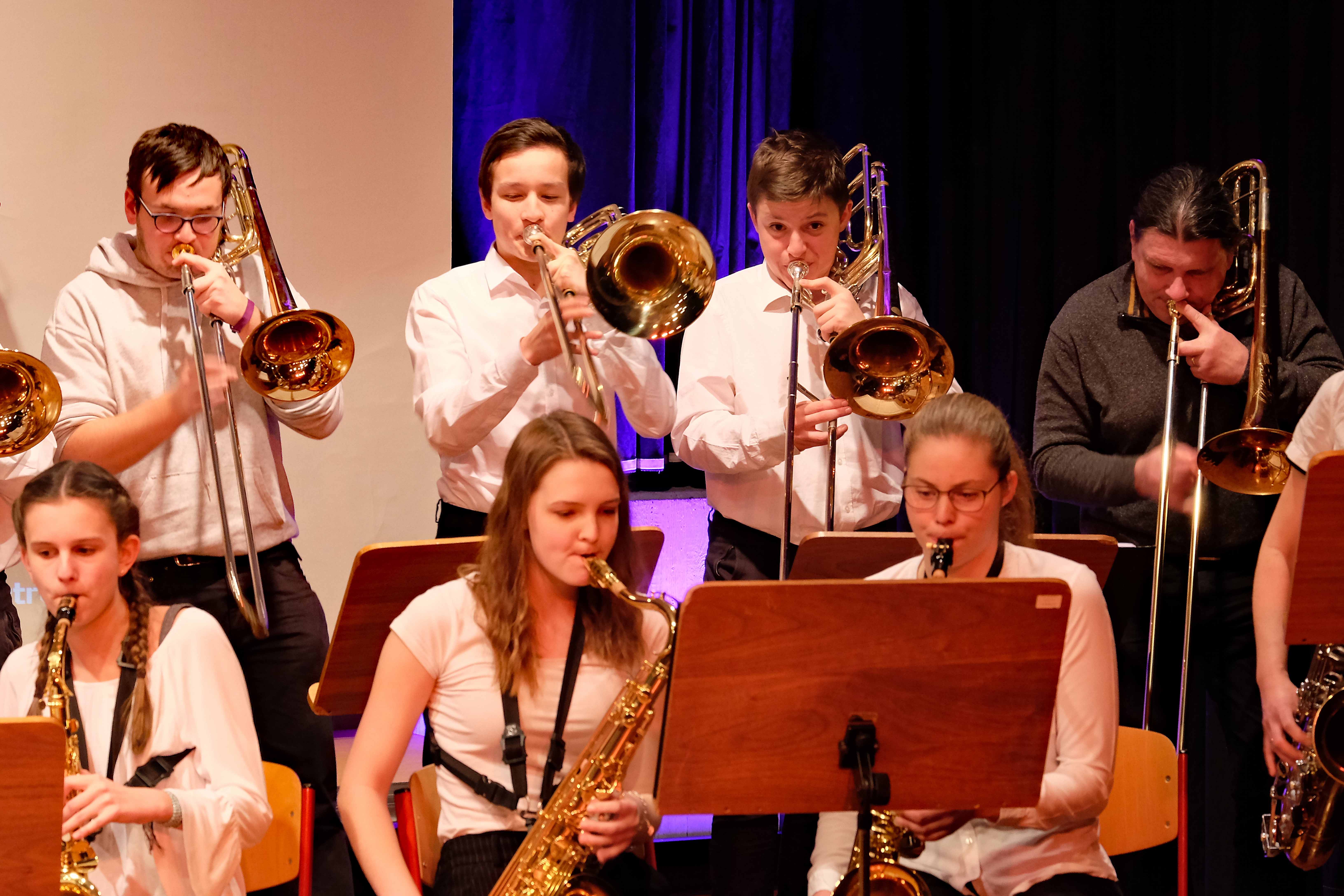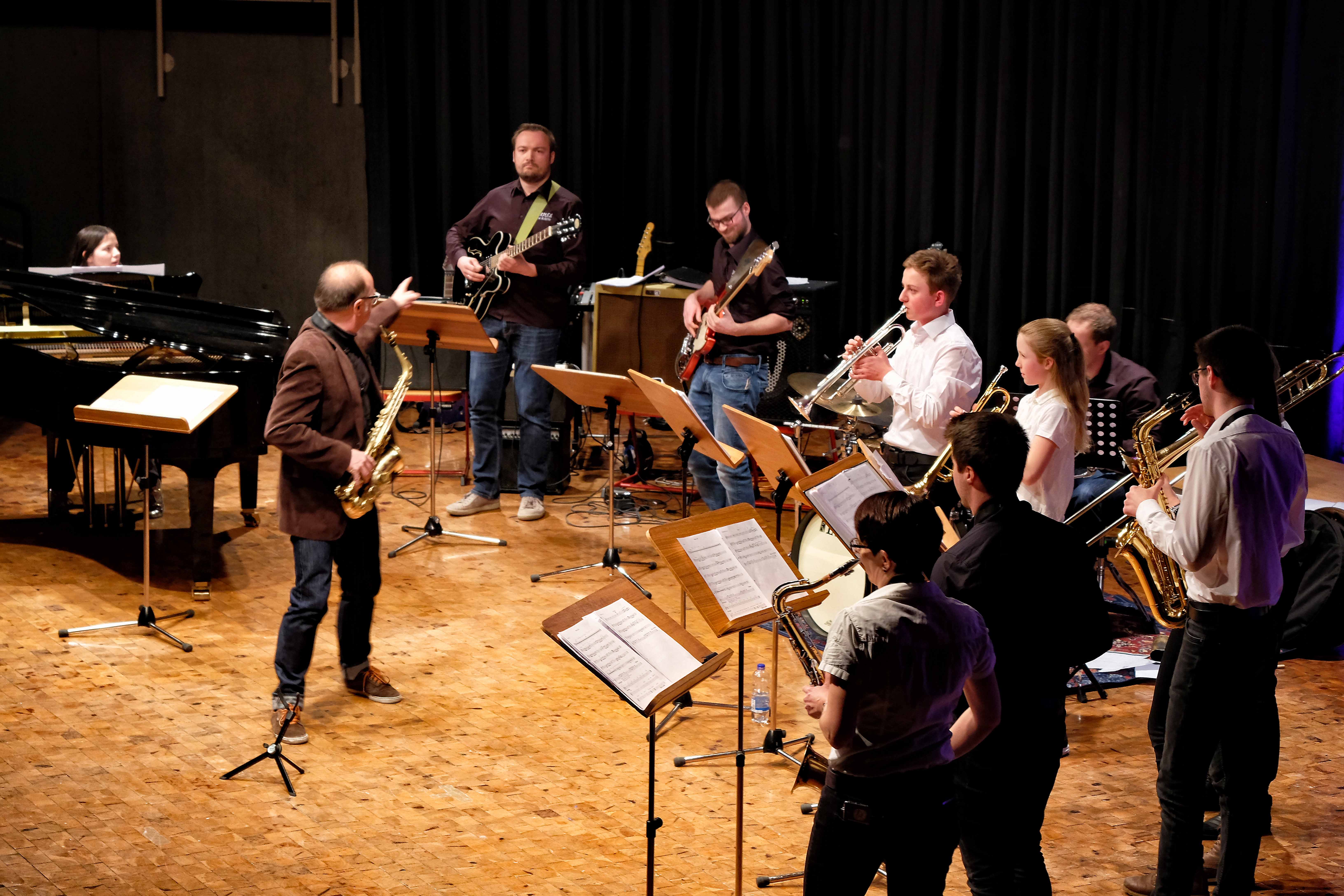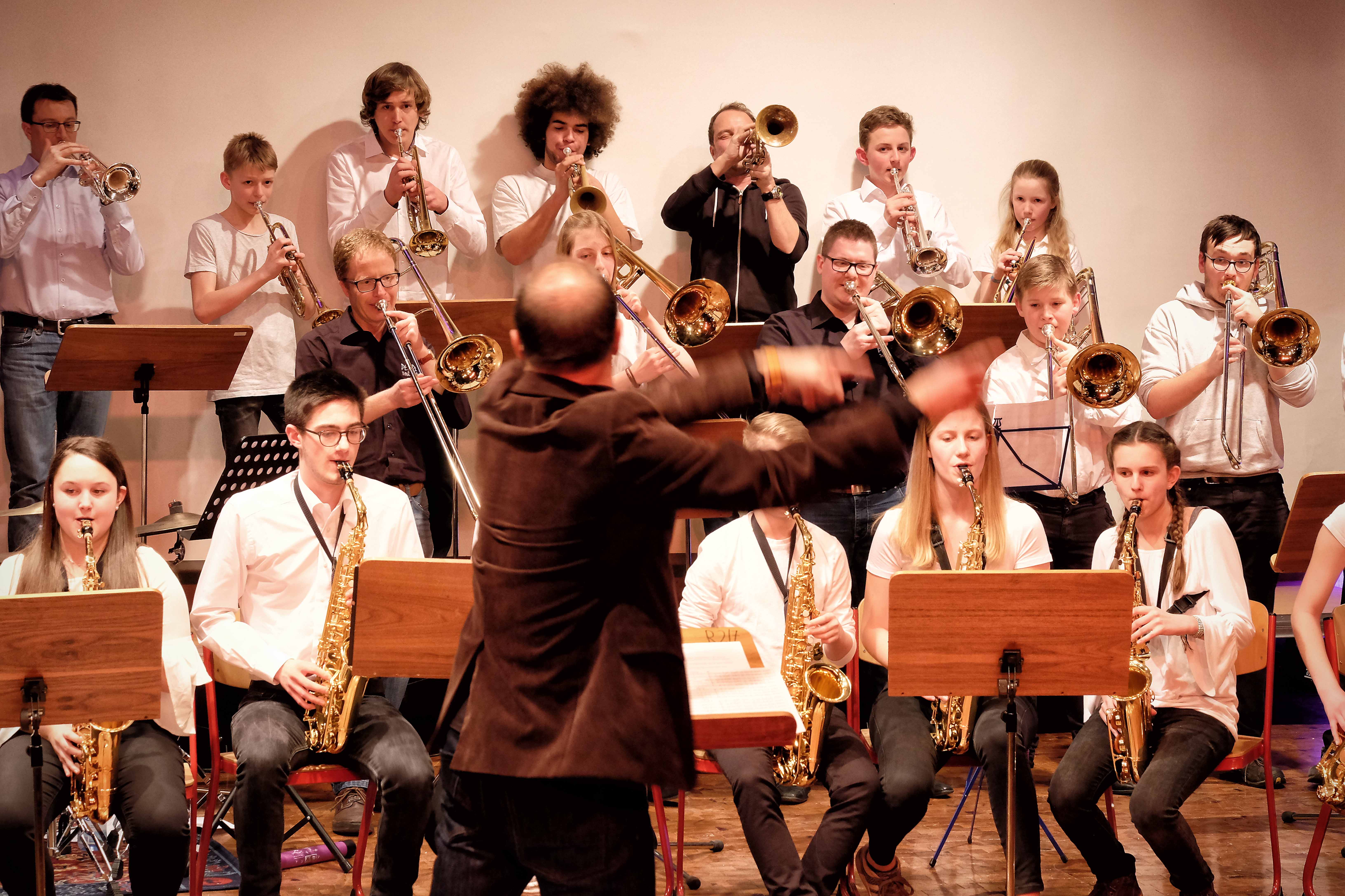Und weil all diese Talente sich in besonderer Weise mit ihren Instrumenten hervorgetan und teilweise geradezu brilliert haben, möchten wir sie an dieser Stelle namentlich und bildlich würdigen (an dieser Stelle ein herzliches Dankeschön an Frank Keller, der diesen Abend wunderbar eingefangen hat). So spielten auf den Altsaxophonen Timon Frey, Nina Grether, Anja Necker, Jakob Krauss, Andrea Stickel, Florian Schuchter, Gabriel Ahl, Julia Junginger, Nadja Köberle und Verena Weichert. Die Tenorsaxophone ließen Martina und Jule Heisele, Samuel Junginger sowie Manuela Ittner ertönen. An der Trompete begeisterten Benjamin Vollbrecht, Attila Holczer, Ralf Müller und Alina Bantle-Müller sowie Marvin Nagel. Die Posaunen erklangen durch Lea Grether, Jonathan und Tobias Schied, Aaron Rau, Oliver Engling, Erik und Fabian Sucher sowie Andreas Köpf. Ihr Können am Piano bzw. Flügel zeigten Lukas Ignatzi, Klara Schmid und Emely Brehm. Die Gitarristen an diesem Abend waren Tim Buttkus, Stefan Eltgen, Max Maier Christian Bahls, Joshua Dittes und Oliver Germani. Für die tieferen Töne sorgten Alex Rösch, Jakob Kälble, Jakob Schmid und Peter Sucher am Bass sowie Tobias Schied mit der Tuba. Den anderen Teil der Rhythmus-Sektion am Schlagzeug übernahmen in souveräner Manier Julius Rinke, Benedict Schmid, Luis und Valentin Maier, Peter Sucher und Samuel Haffter. Last but not least glänzten Dominik Wiedemann und Aaron Rau am Vibraphon.