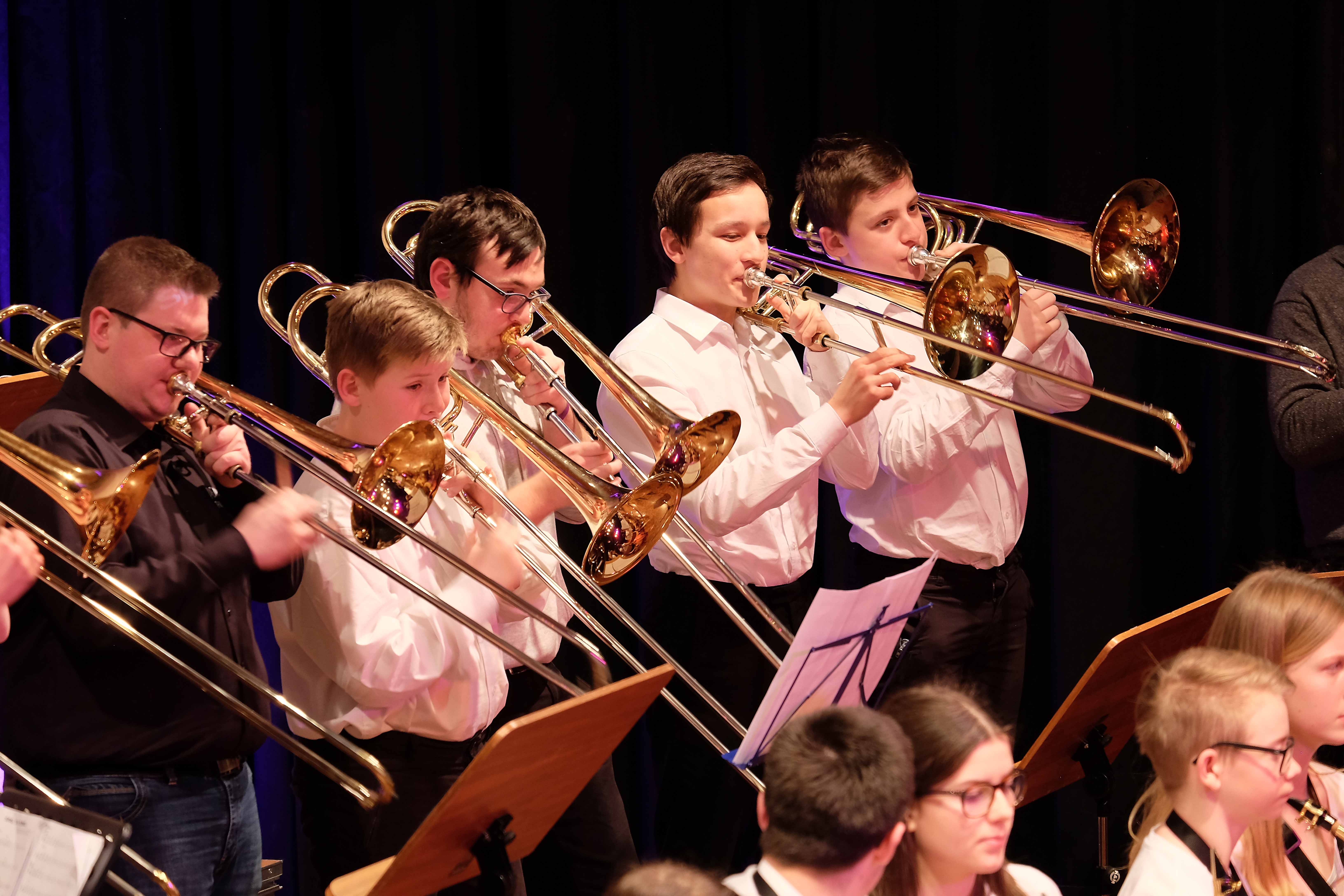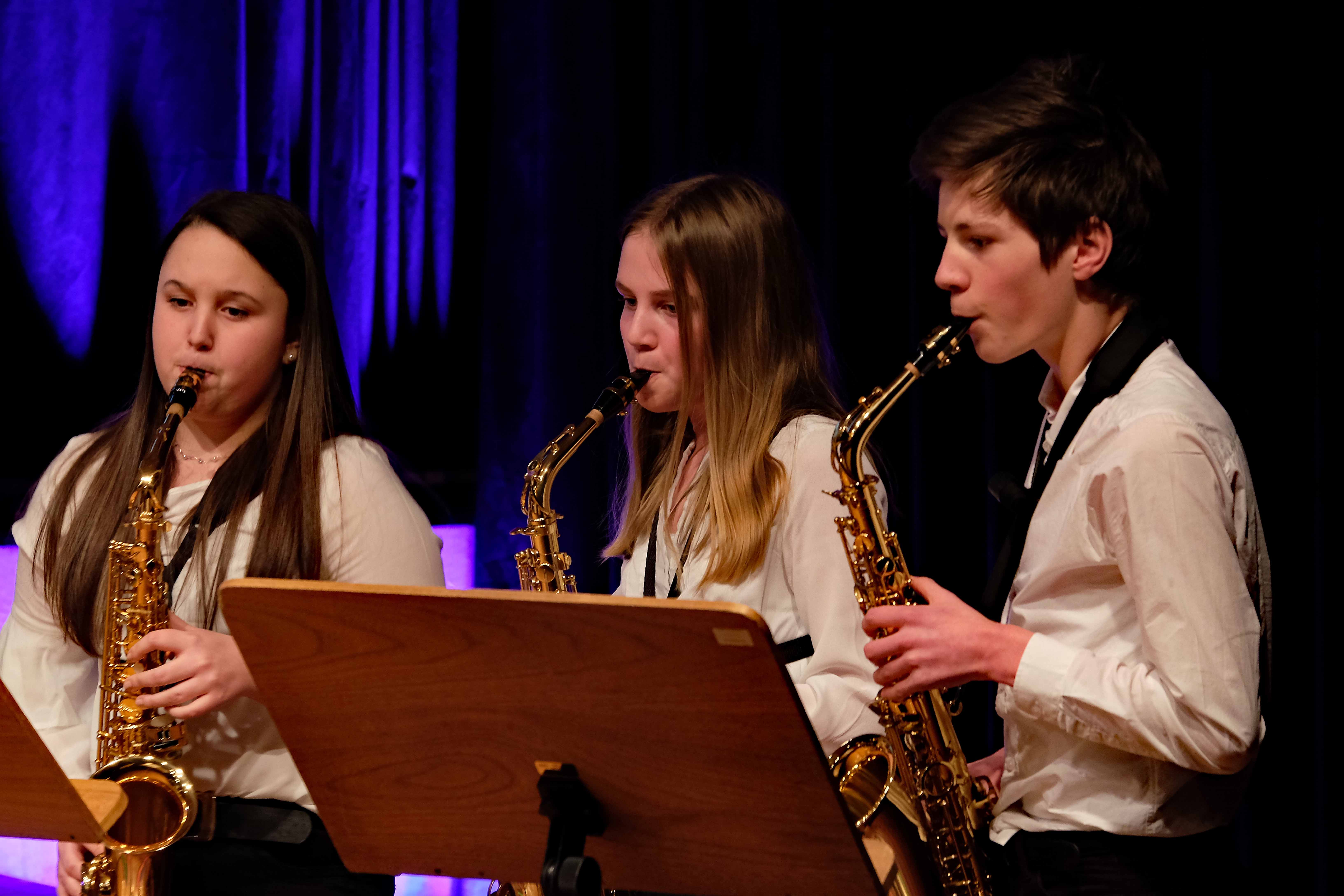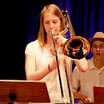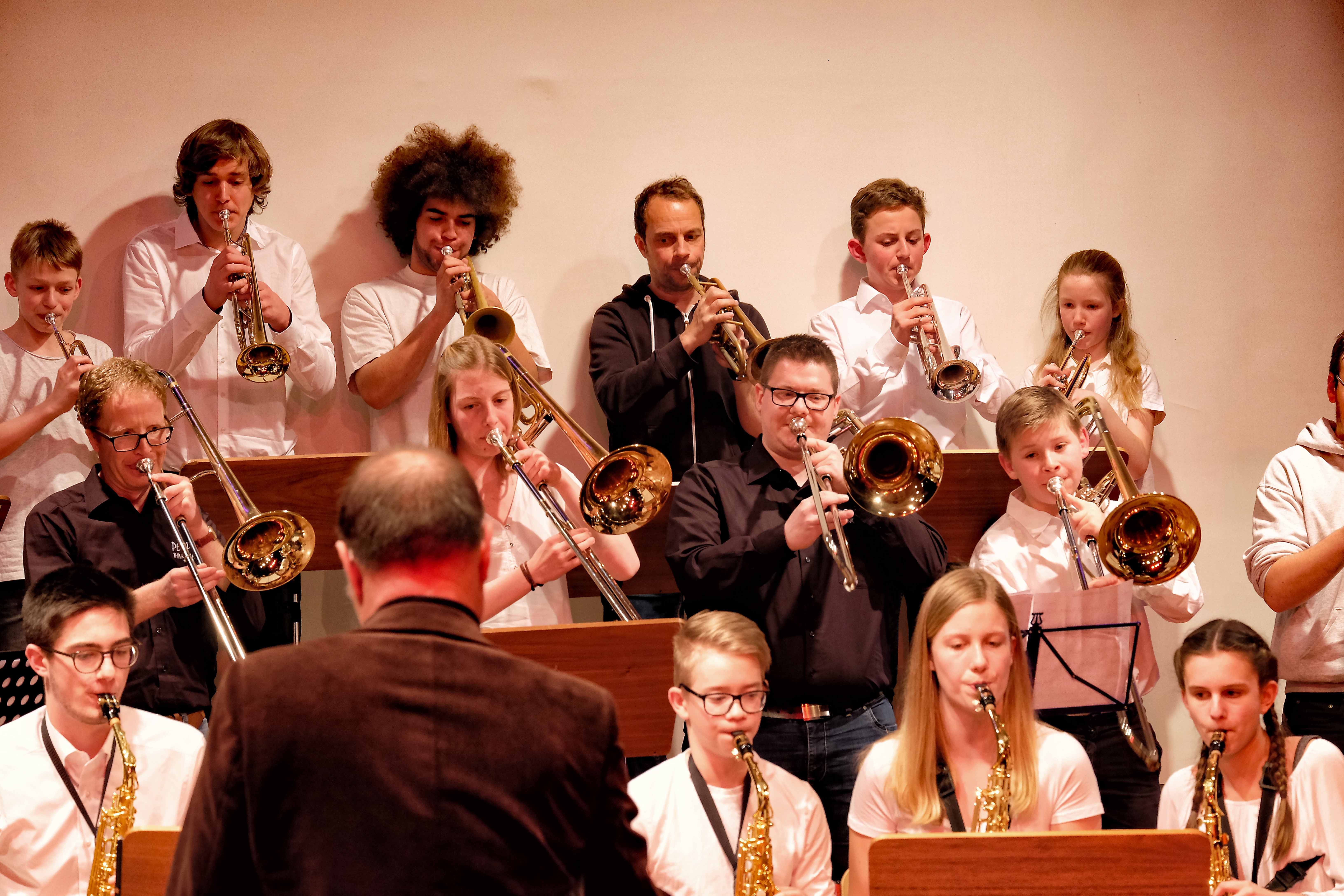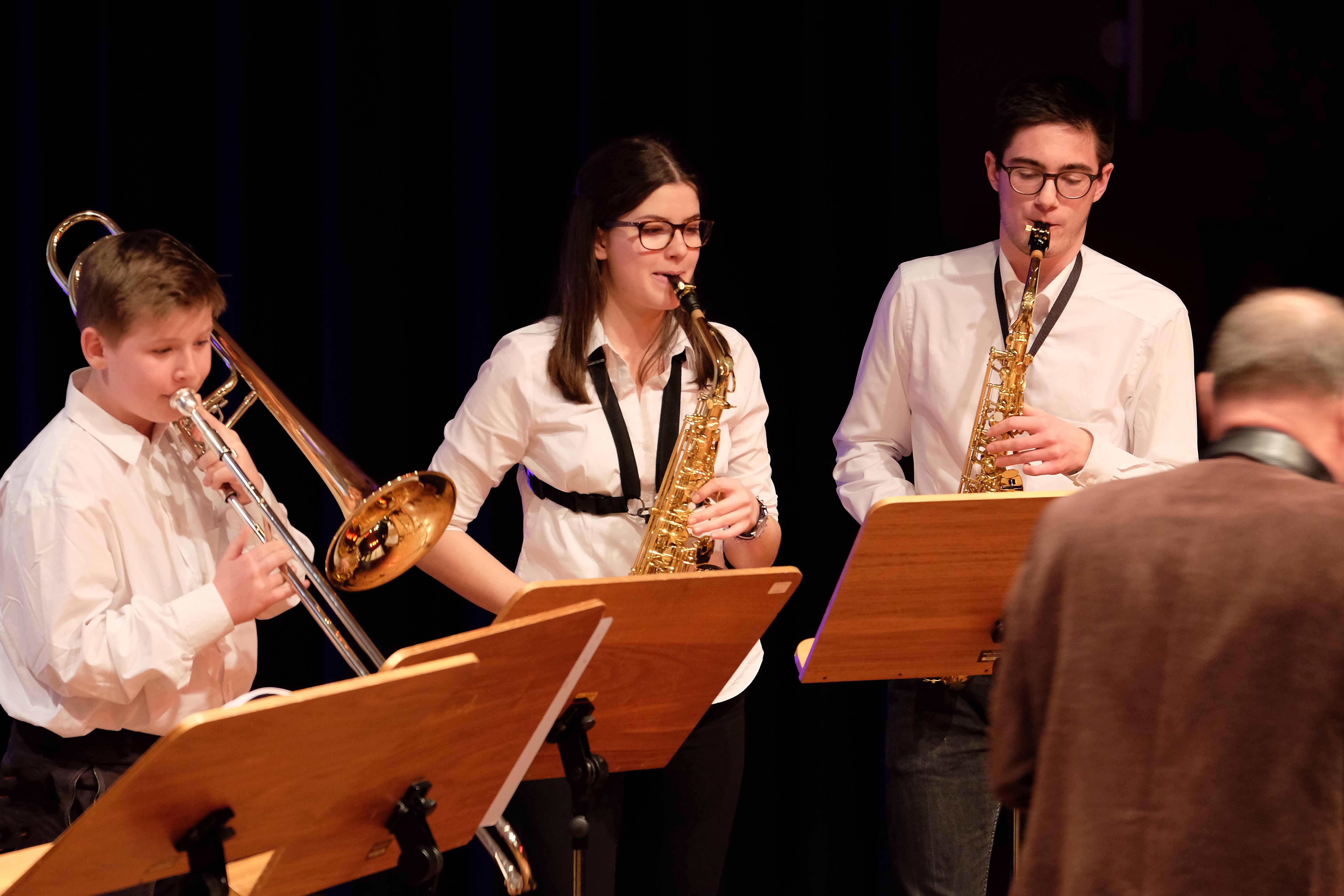 Und weil all diese Talente sich in besonderer Weise mit ihren Instrumenten hervorgetan und teilweise geradezu brilliert haben, möchten wir sie an dieser Stelle namentlich und bildlich würdigen (an dieser Stelle ein herzliches Dankeschön an Frank Keller, der diesen Abend wunderbar eingefangen hat). So spielten auf den Altsaxophonen Timon Frey, Nina Grether, Anja Necker, Jakob Krauss, Andrea Stickel, Florian Schuchter, Gabriel Ahl, Julia Junginger, Nadja Köberle und Verena Weichert. Die Tenorsaxophone ließen Martina und Jule Heisele, Samuel Junginger sowie Manuela Ittner ertönen. An der Trompete begeisterten Benjamin Vollbrecht, Attila Holczer, Ralf Müller und Alina Bantle-Müller sowie Marvin Nagel. Die Posaunen erklangen durch Lea Grether, Jonathan und Tobias Schied, Aaron Rau, Oliver Engling, Erik und Fabian Sucher sowie Andreas Köpf. Ihr Können am Piano bzw. Flügel zeigten Lukas Ignatzi, Klara Schmid und Emely Brehm. Die Gitarristen an diesem Abend waren Tim Buttkus, Stefan Eltgen, Max Maier Christian Bahls, Joshua Dittes und Oliver Germani. Für die tieferen Töne sorgten Alex Rösch, Jakob Kälble, Jakob Schmid und Peter Sucher am Bass sowie Tobias Schied mit der Tuba. Den anderen Teil der Rhythmus-Sektion am Schlagzeug übernahmen in souveräner Manier Julius Rinke, Benedict Schmid, Luis und Valentin Maier, Peter Sucher und Samuel Haffter. Last but not least glänzten Dominik Wiedemann und Aaron Rau am Vibraphon.