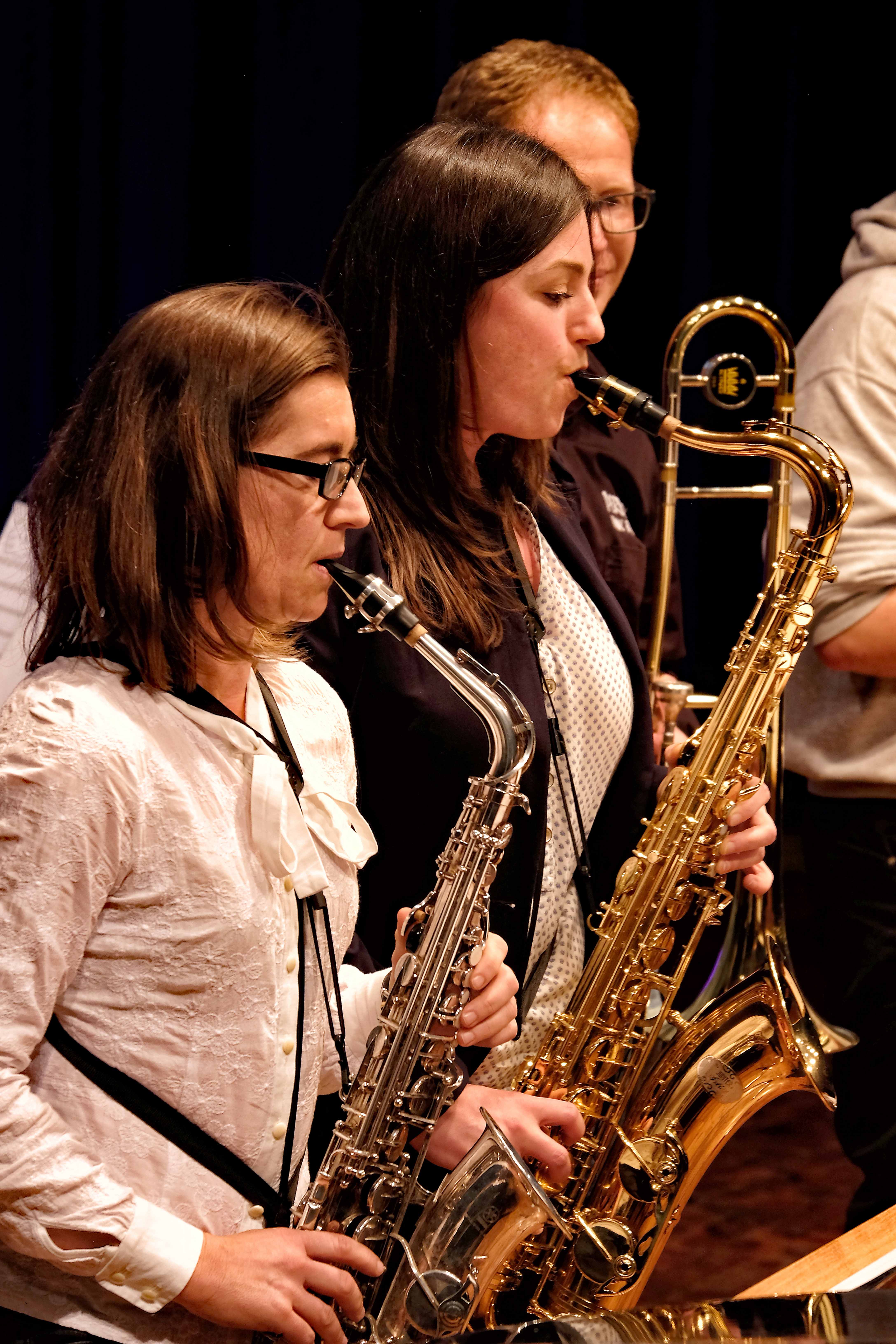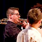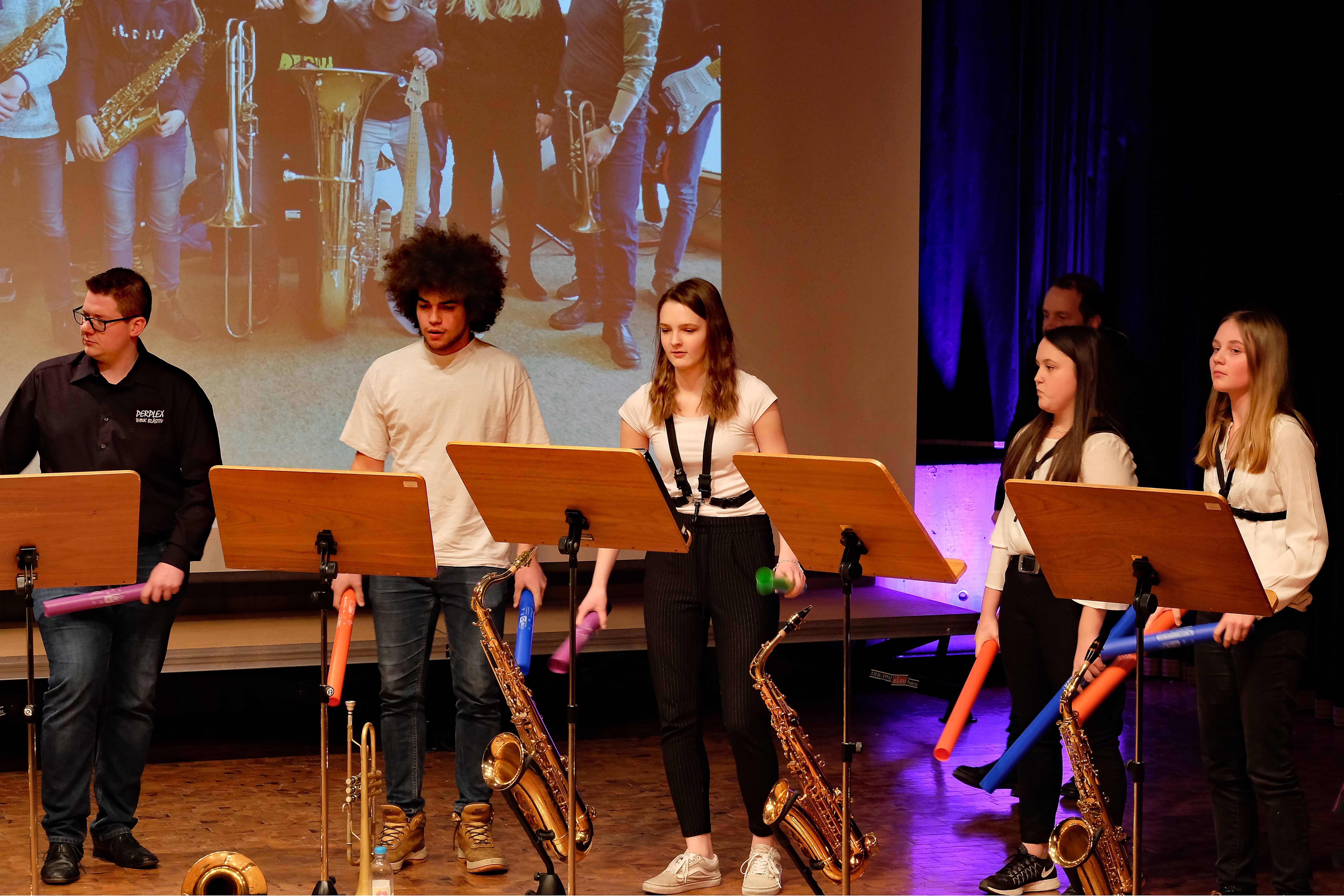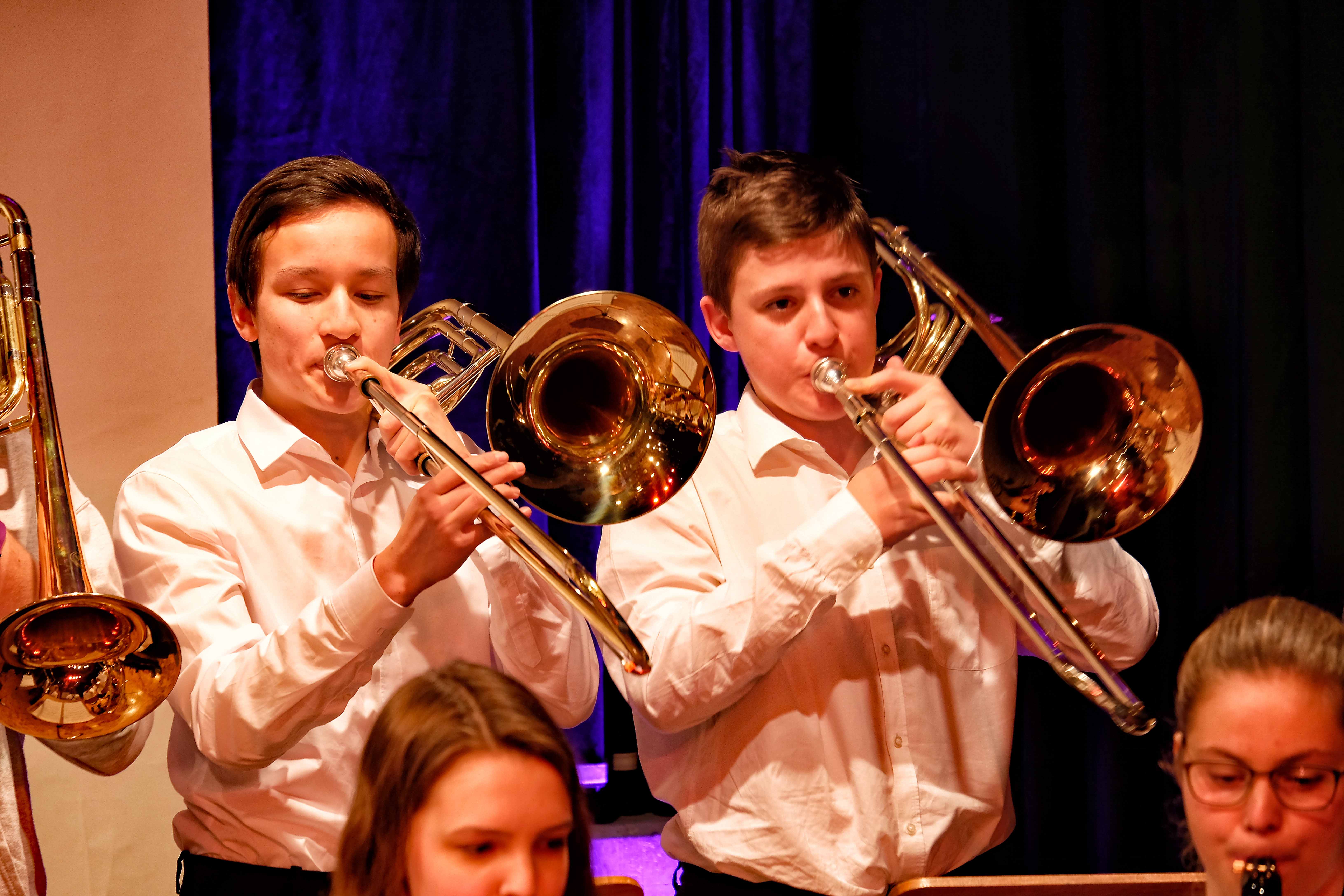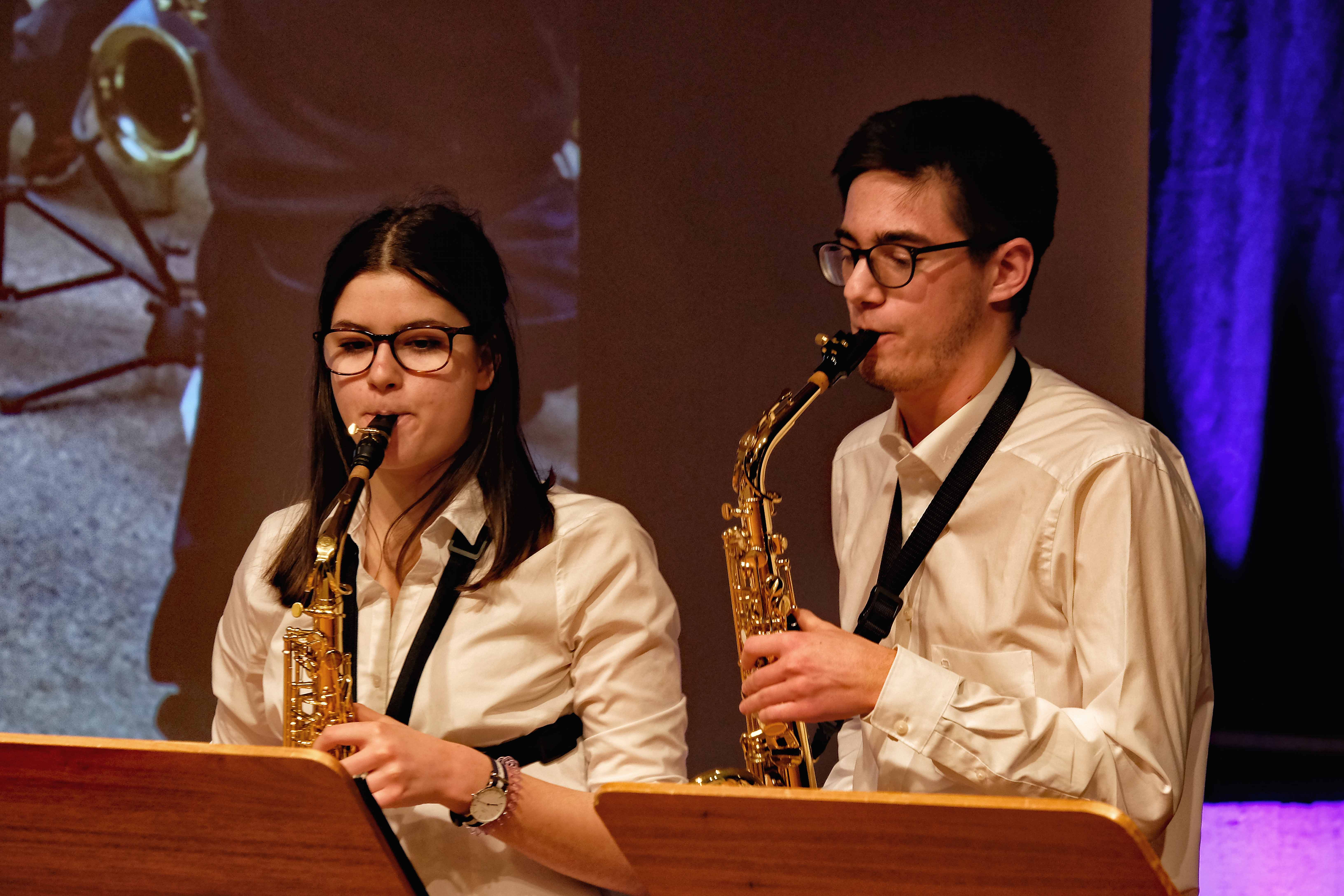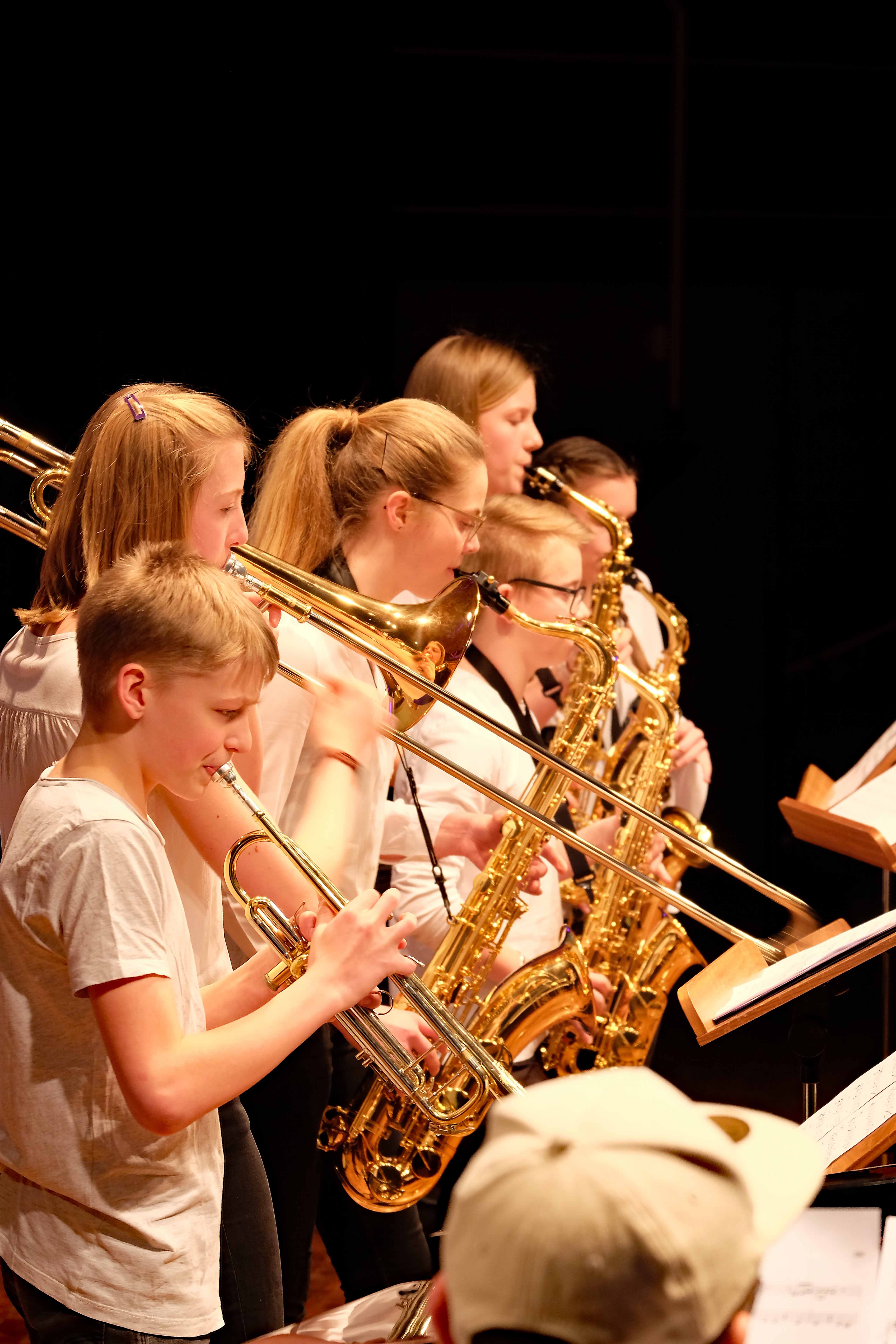 Und weil all diese Talente sich in besonderer Weise mit ihren Instrumenten hervorgetan und teilweise geradezu brilliert haben, möchten wir sie an dieser Stelle namentlich und bildlich würdigen (an dieser Stelle ein herzliches Dankeschön an Frank Keller, der diesen Abend wunderbar eingefangen hat). So spielten auf den Altsaxophonen Timon Frey, Nina Grether, Anja Necker, Jakob Krauss, Andrea Stickel, Florian Schuchter, Gabriel Ahl, Julia Junginger, Nadja Köberle und Verena Weichert. Die Tenorsaxophone ließen Martina und Jule Heisele, Samuel Junginger sowie Manuela Ittner ertönen. An der Trompete begeisterten Benjamin Vollbrecht, Attila Holczer, Ralf Müller und Alina Bantle-Müller sowie Marvin Nagel. Die Posaunen erklangen durch Lea Grether, Jonathan und Tobias Schied, Aaron Rau, Oliver Engling, Erik und Fabian Sucher sowie Andreas Köpf. Ihr Können am Piano bzw. Flügel zeigten Lukas Ignatzi, Klara Schmid und Emely Brehm. Die Gitarristen an diesem Abend waren Tim Buttkus, Stefan Eltgen, Max Maier Christian Bahls, Joshua Dittes und Oliver Germani. Für die tieferen Töne sorgten Alex Rösch, Jakob Kälble, Jakob Schmid und Peter Sucher am Bass sowie Tobias Schied mit der Tuba. Den anderen Teil der Rhythmus-Sektion am Schlagzeug übernahmen in souveräner Manier Julius Rinke, Benedict Schmid, Luis und Valentin Maier, Peter Sucher und Samuel Haffter. Last but not least glänzten Dominik Wiedemann und Aaron Rau am Vibraphon.