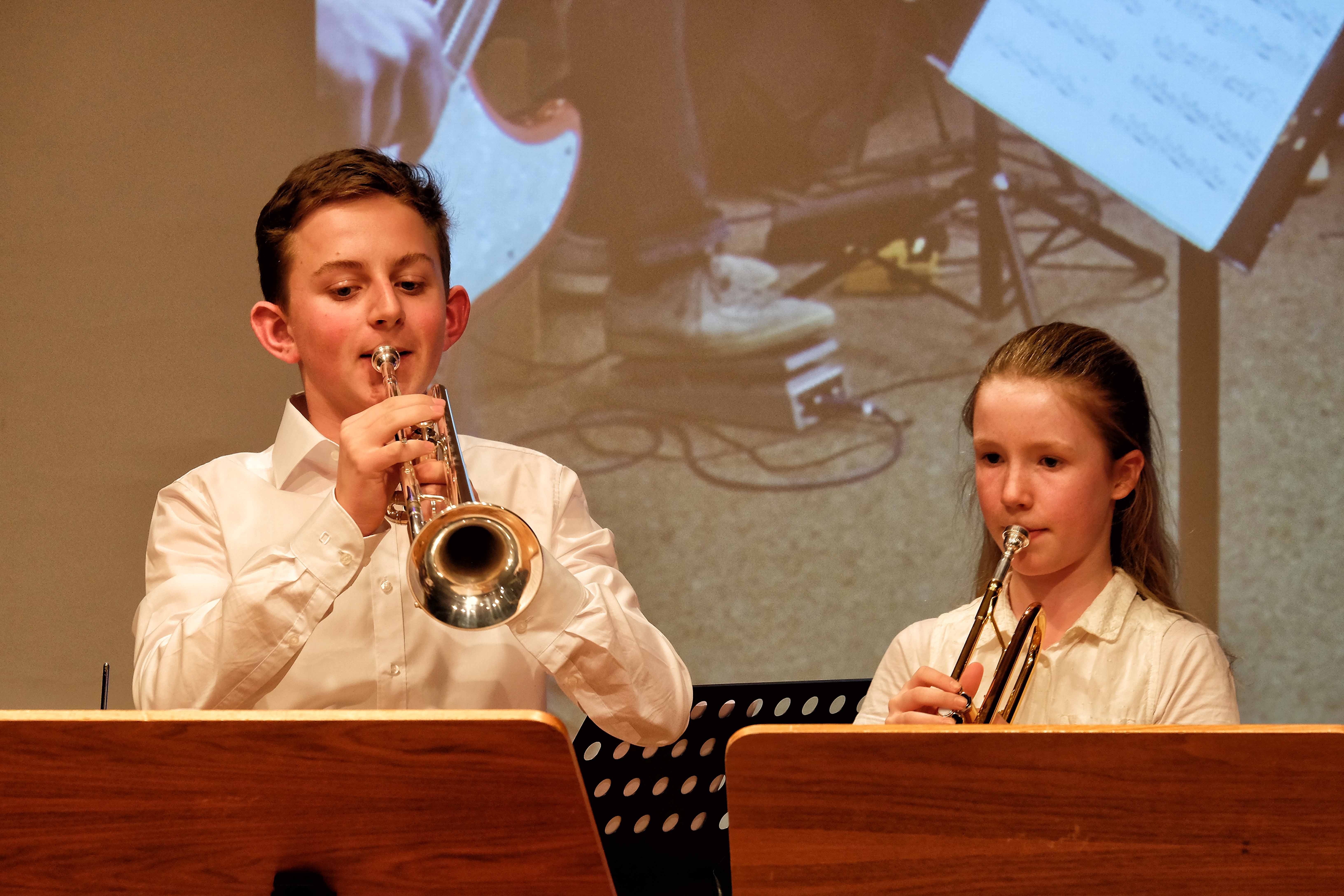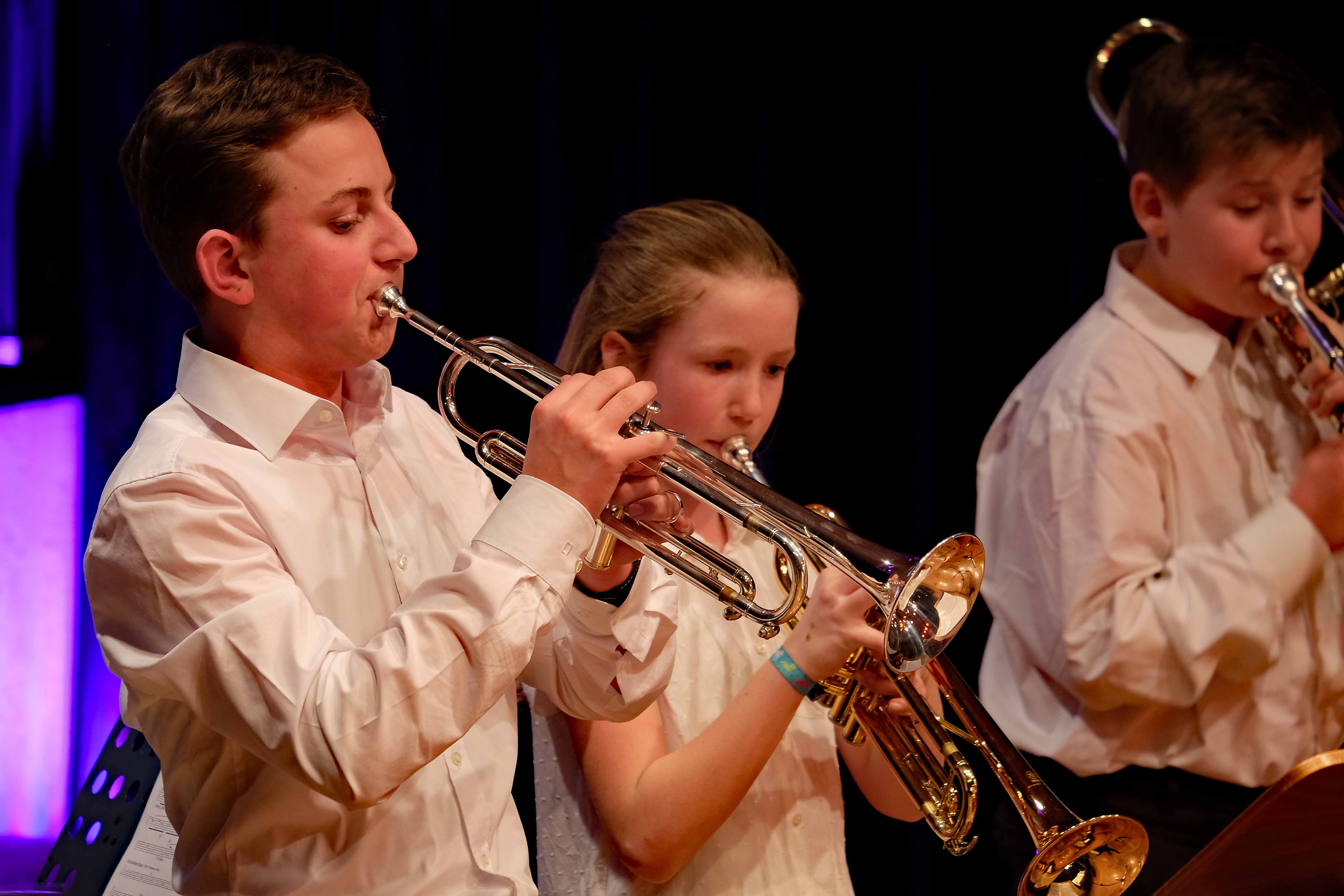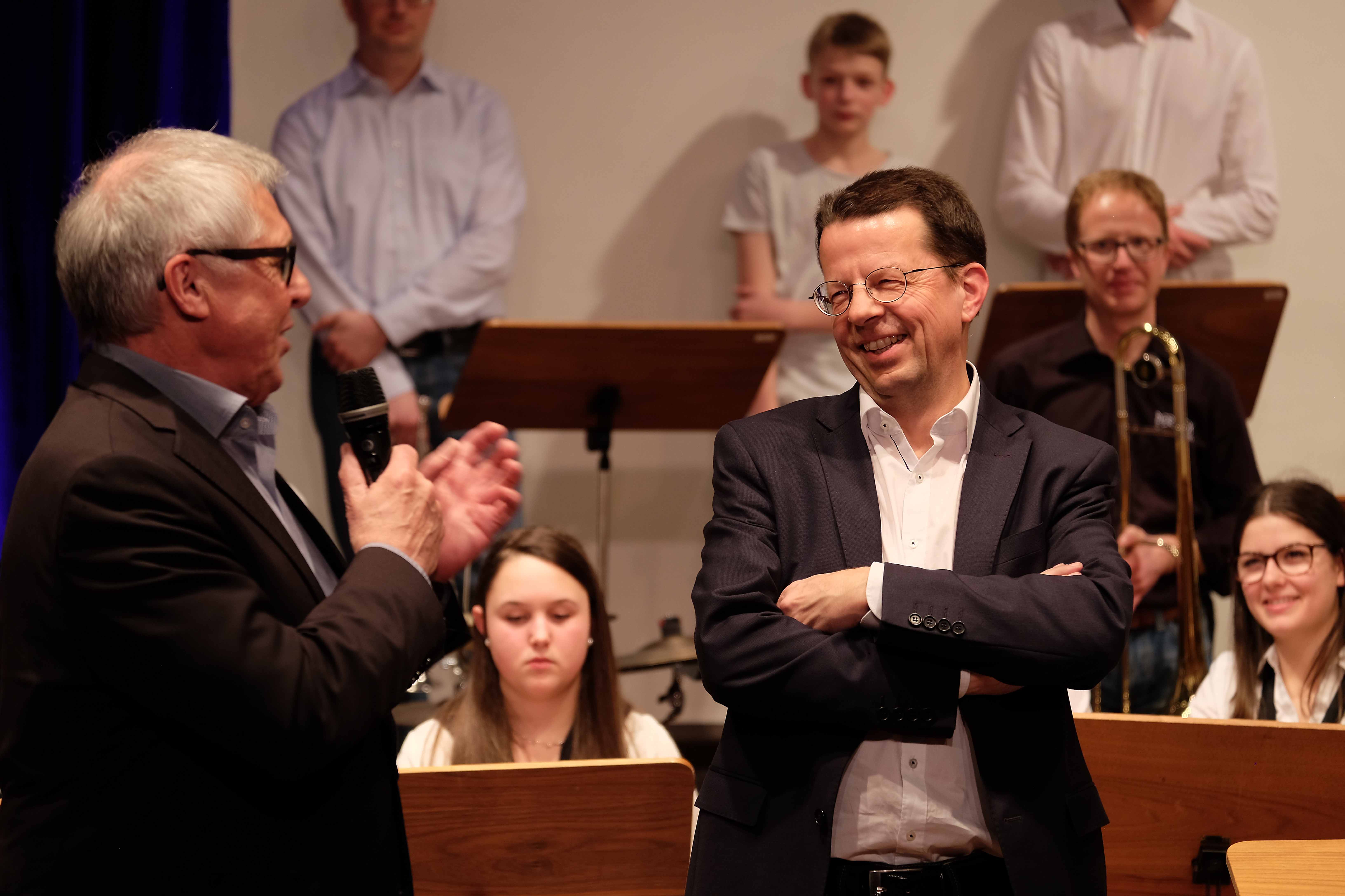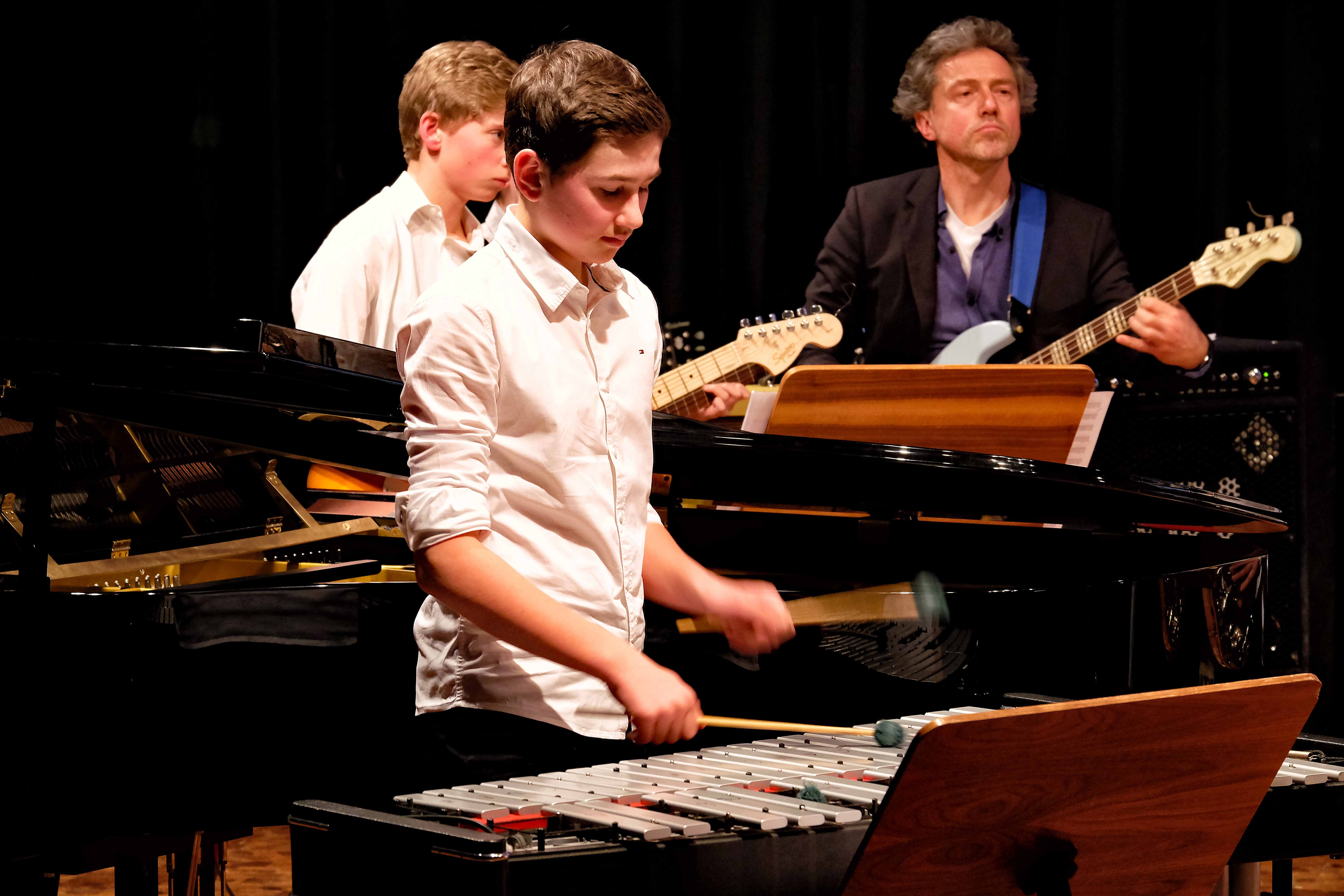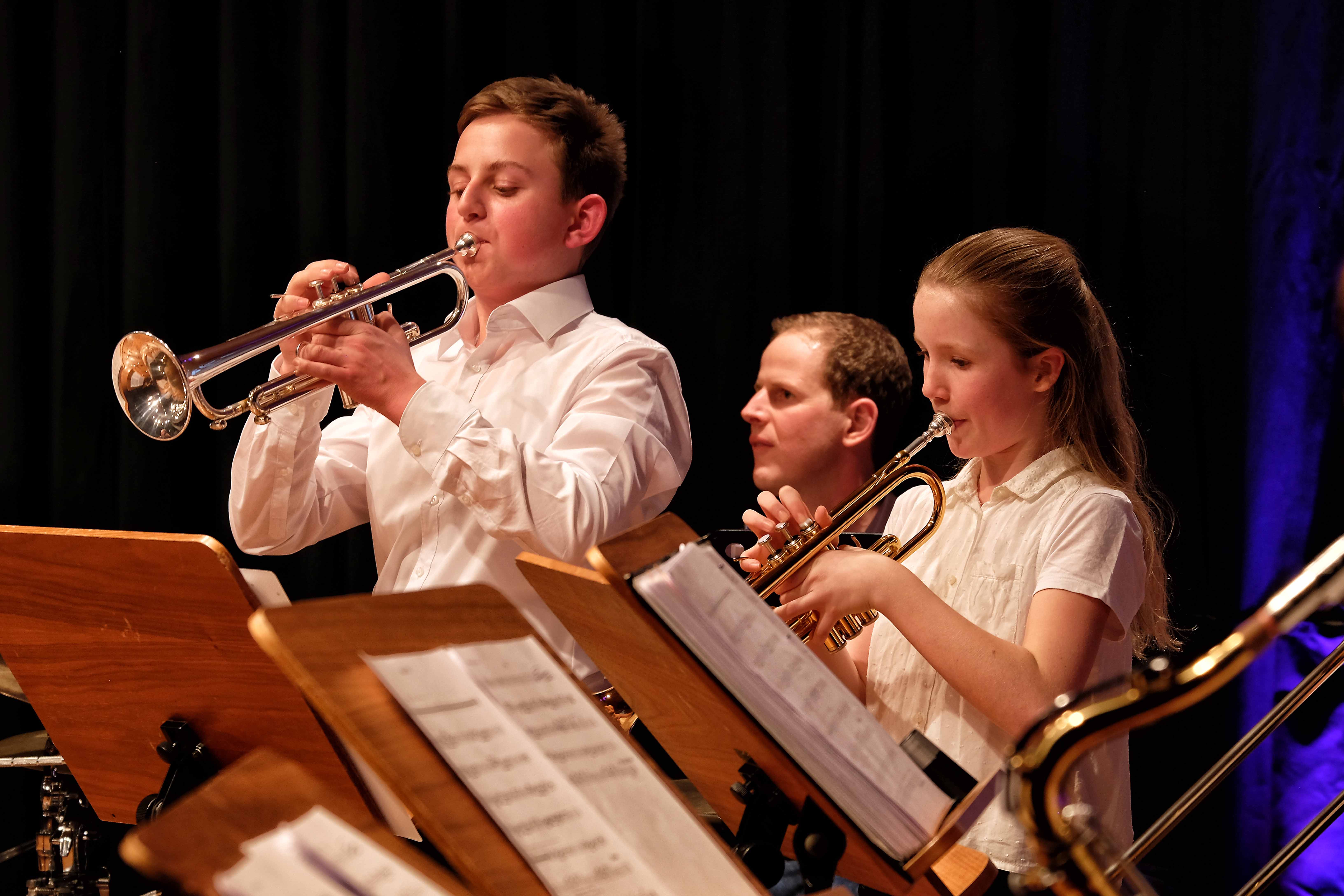 Und weil all diese Talente sich in besonderer Weise mit ihren Instrumenten hervorgetan und teilweise geradezu brilliert haben, möchten wir sie an dieser Stelle namentlich und bildlich würdigen (an dieser Stelle ein herzliches Dankeschön an Frank Keller, der diesen Abend wunderbar eingefangen hat). So spielten auf den Altsaxophonen Timon Frey, Nina Grether, Anja Necker, Jakob Krauss, Andrea Stickel, Florian Schuchter, Gabriel Ahl, Julia Junginger, Nadja Köberle und Verena Weichert. Die Tenorsaxophone ließen Martina und Jule Heisele, Samuel Junginger sowie Manuela Ittner ertönen. An der Trompete begeisterten Benjamin Vollbrecht, Attila Holczer, Ralf Müller und Alina Bantle-Müller sowie Marvin Nagel. Die Posaunen erklangen durch Lea Grether, Jonathan und Tobias Schied, Aaron Rau, Oliver Engling, Erik und Fabian Sucher sowie Andreas Köpf. Ihr Können am Piano bzw. Flügel zeigten Lukas Ignatzi, Klara Schmid und Emely Brehm. Die Gitarristen an diesem Abend waren Tim Buttkus, Stefan Eltgen, Max Maier Christian Bahls, Joshua Dittes und Oliver Germani. Für die tieferen Töne sorgten Alex Rösch, Jakob Kälble, Jakob Schmid und Peter Sucher am Bass sowie Tobias Schied mit der Tuba. Den anderen Teil der Rhythmus-Sektion am Schlagzeug übernahmen in souveräner Manier Julius Rinke, Benedict Schmid, Luis und Valentin Maier, Peter Sucher und Samuel Haffter. Last but not least glänzten Dominik Wiedemann und Aaron Rau am Vibraphon.