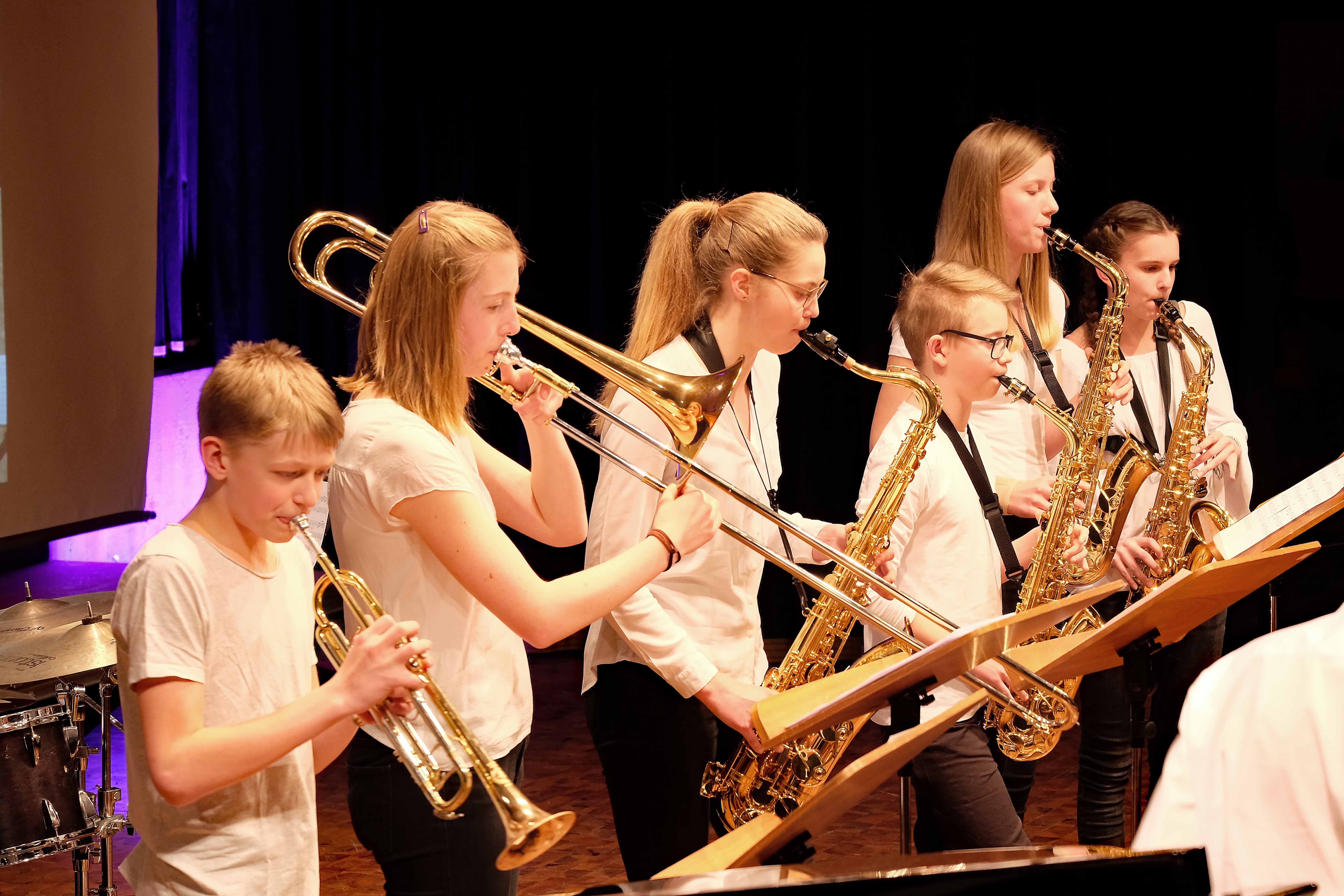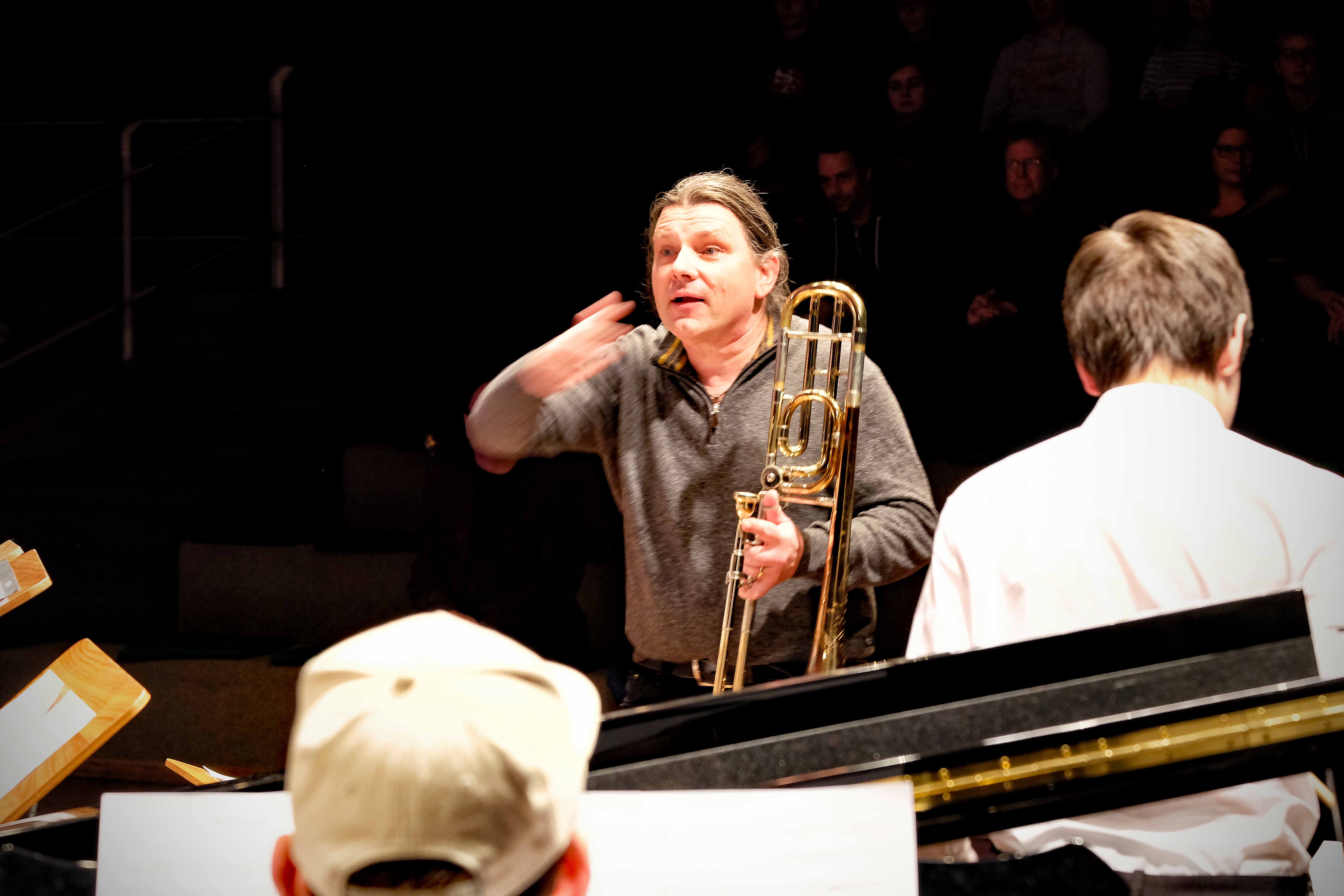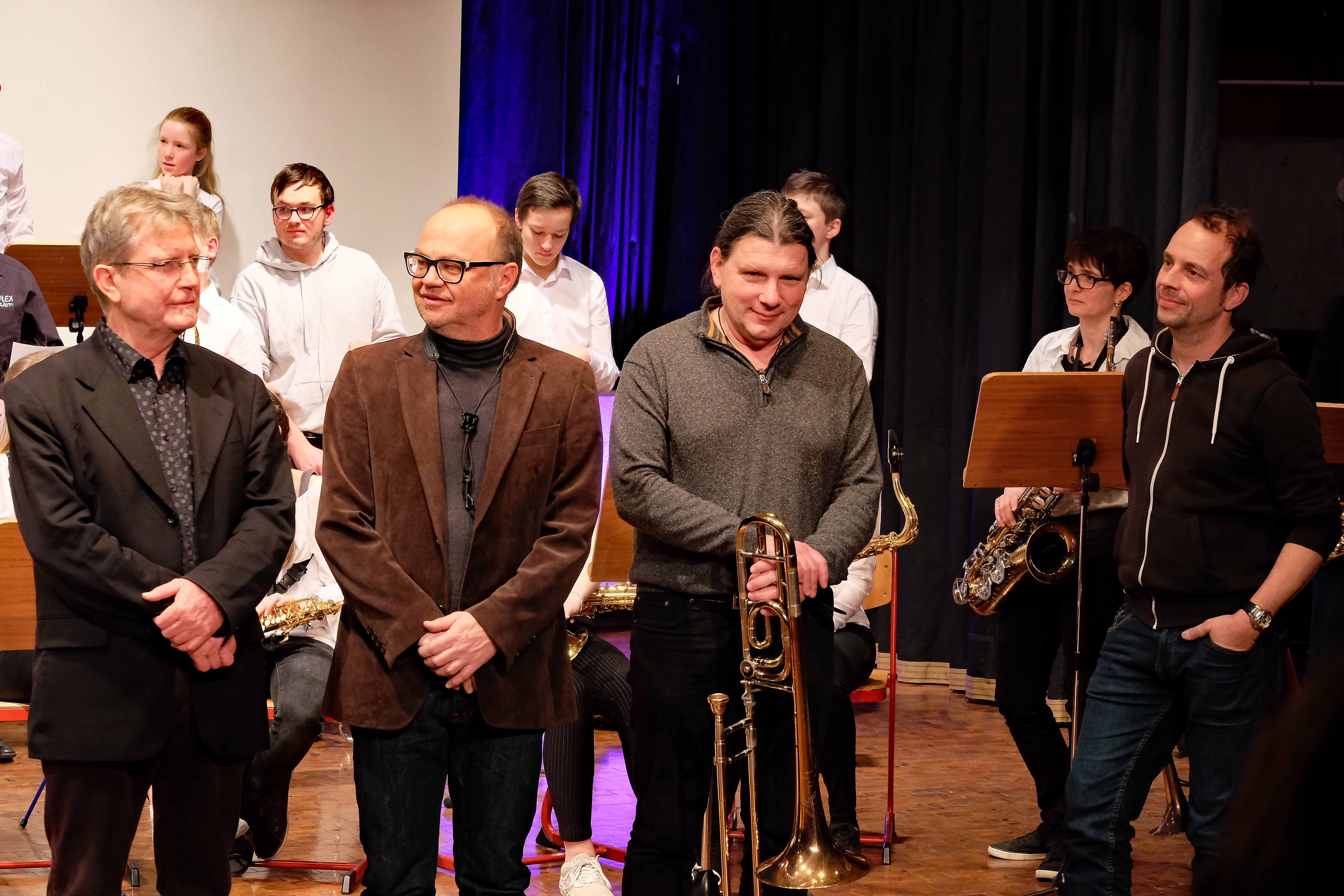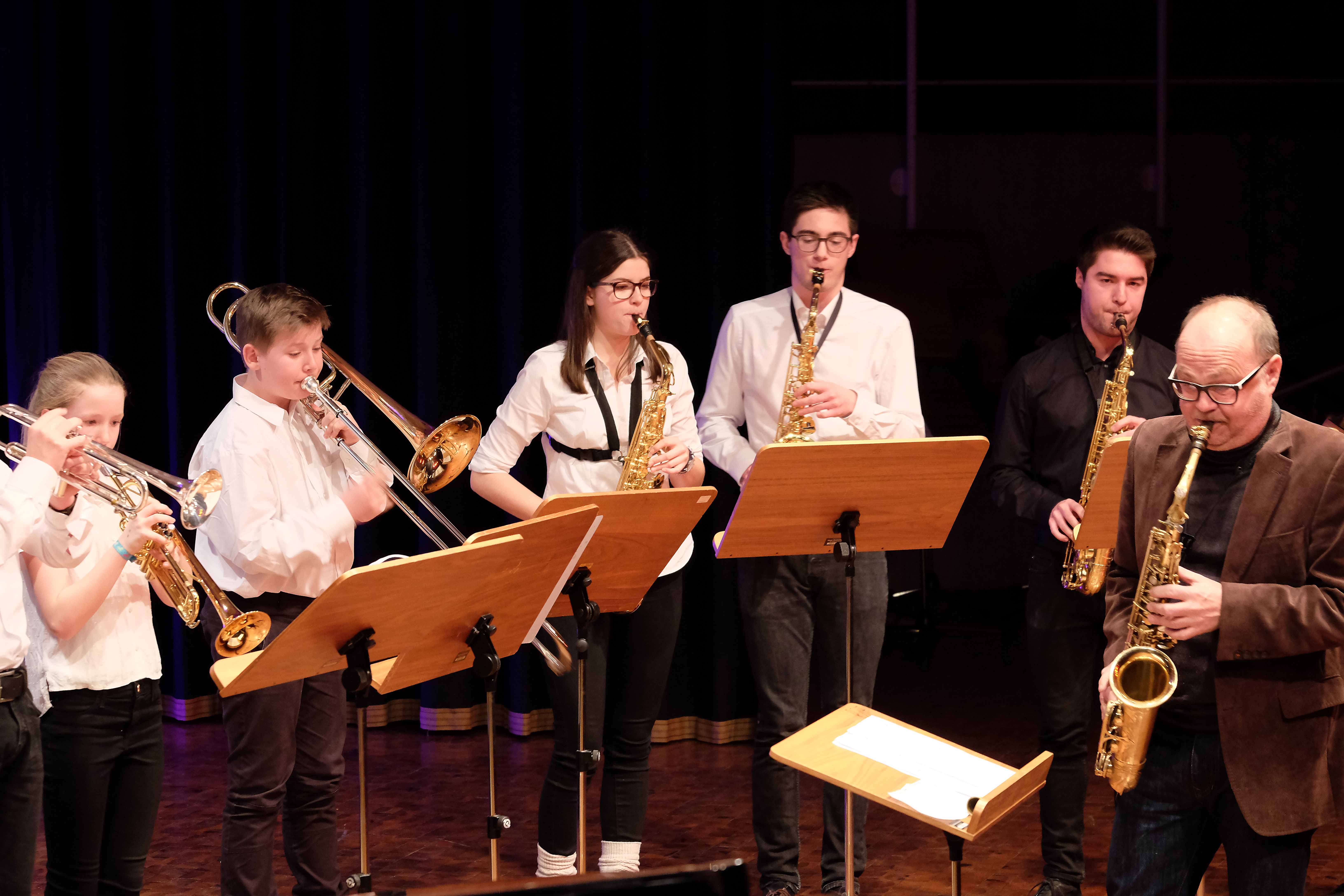 Es lag ein Knistern in der Luft der Kulturmulde des Werkgymnasiums, als sich am Samstagabend die Ränge füllten und sich das Auditorium bereit machte, um sich das Abschlusskonzert des 20. Jazzworkshops anzuhören. Seit dem Freitagmorgen probten hierfür viele Schülerinnen und Schüler von WeG, HG, des MSG, SG, HeT sowie externe Musiker und natürlich die renomierten Jazzdozenten Eberhard Budziat (Posaune), Martin Schrack (Piano), Klaus Graf (Saxophon) und Joo Kraus (Trompete). Im Anschluss an einen erfolgreichen ersten Probetag (2.03.2018) gaben in der Dualen Hochschule in Kooperation mit „Jazz Heidenheim e.V.“ besagte Dozenten ein Konzert als „Martin Schrack Sextett“ (zusätzlich Axel Kühn am Bass und Felix Schrack am Schlagzeug) und verzauberten den vollbesetzten Saal, nur um am nächsten Tag gleich weiter zu proben und erneut ein Konzert zu geben. Eine Liebe zur Musik, die jeder Hörer spüren kann. So auch am Samstagabend im Werkgymnasium.