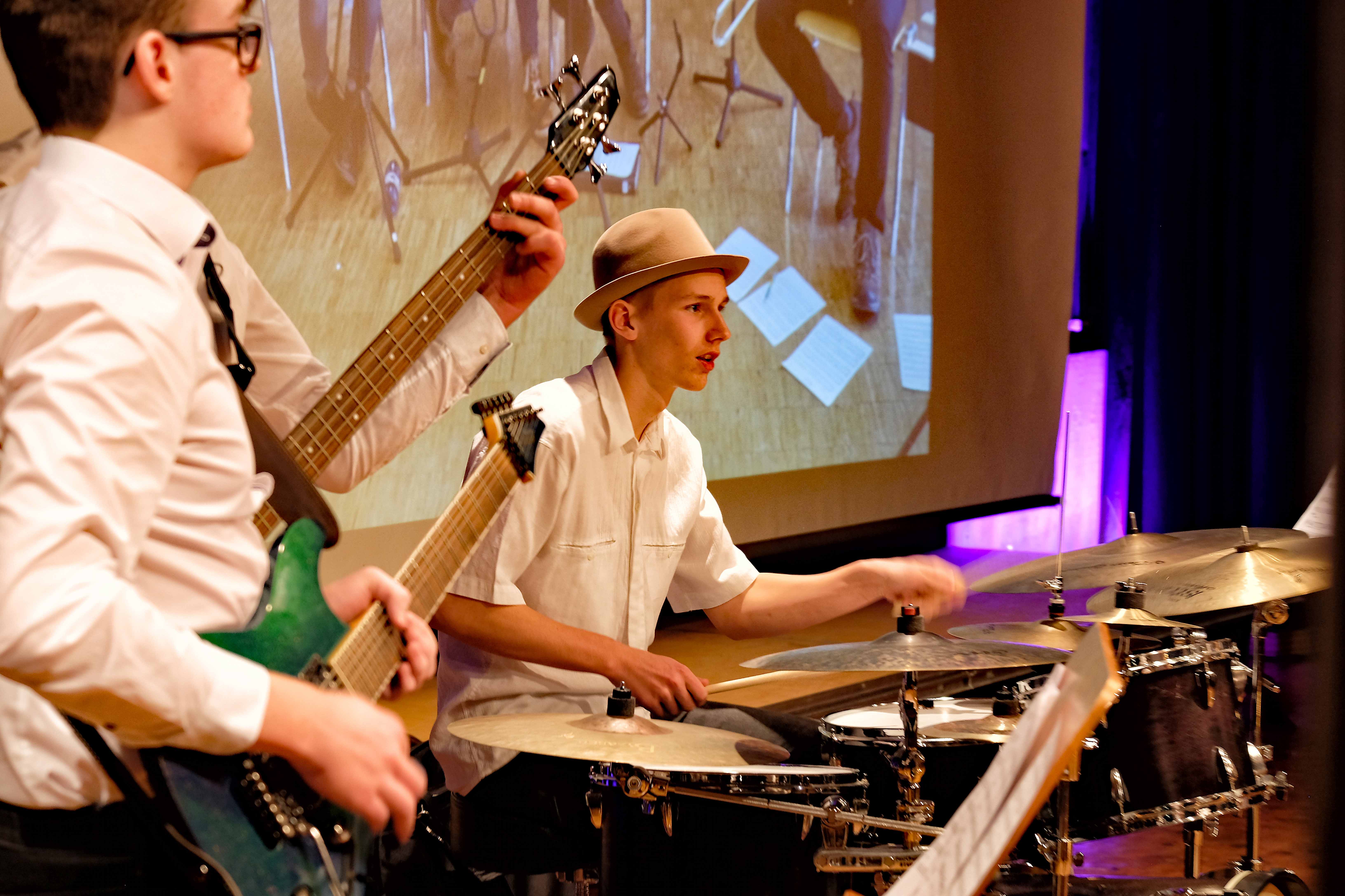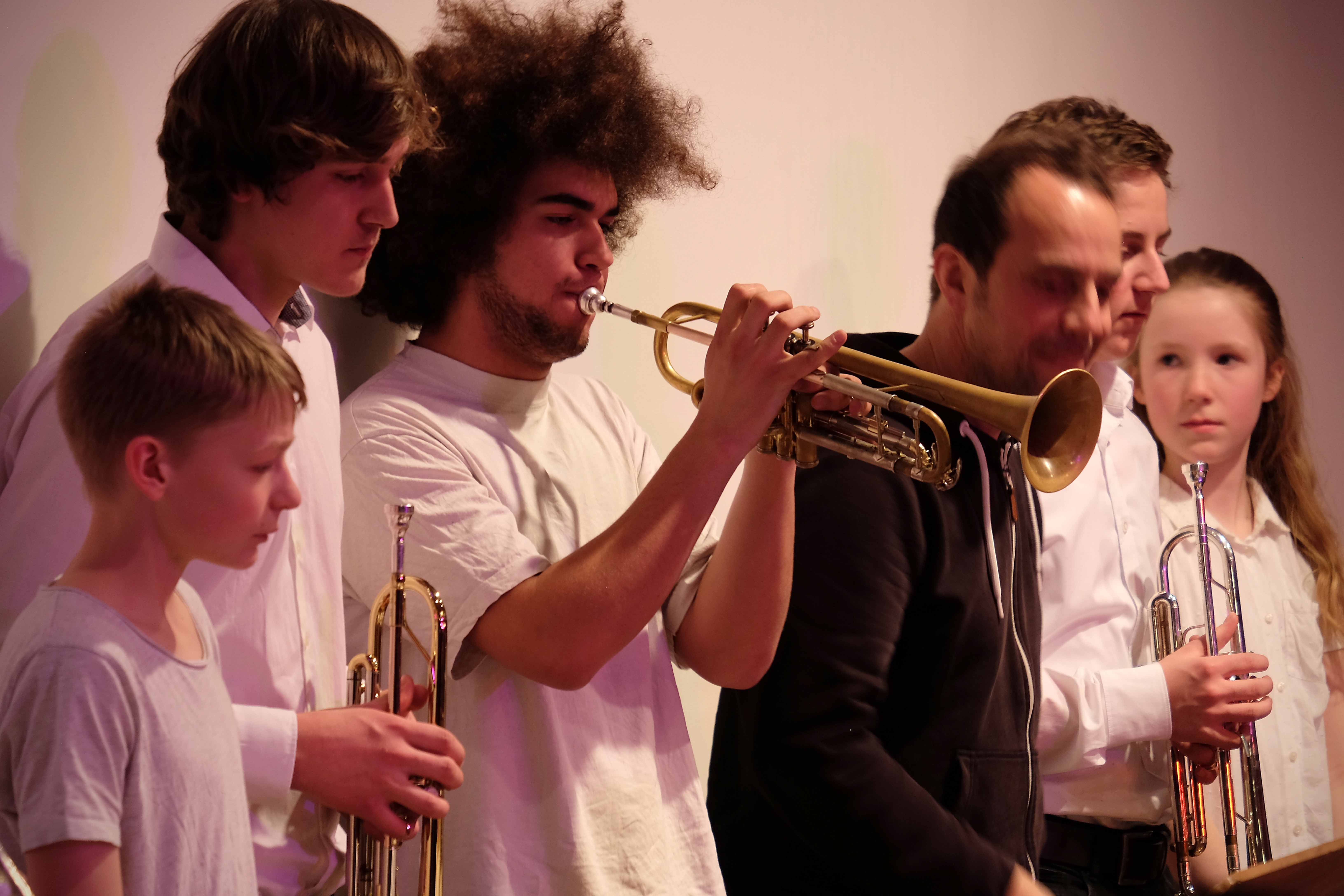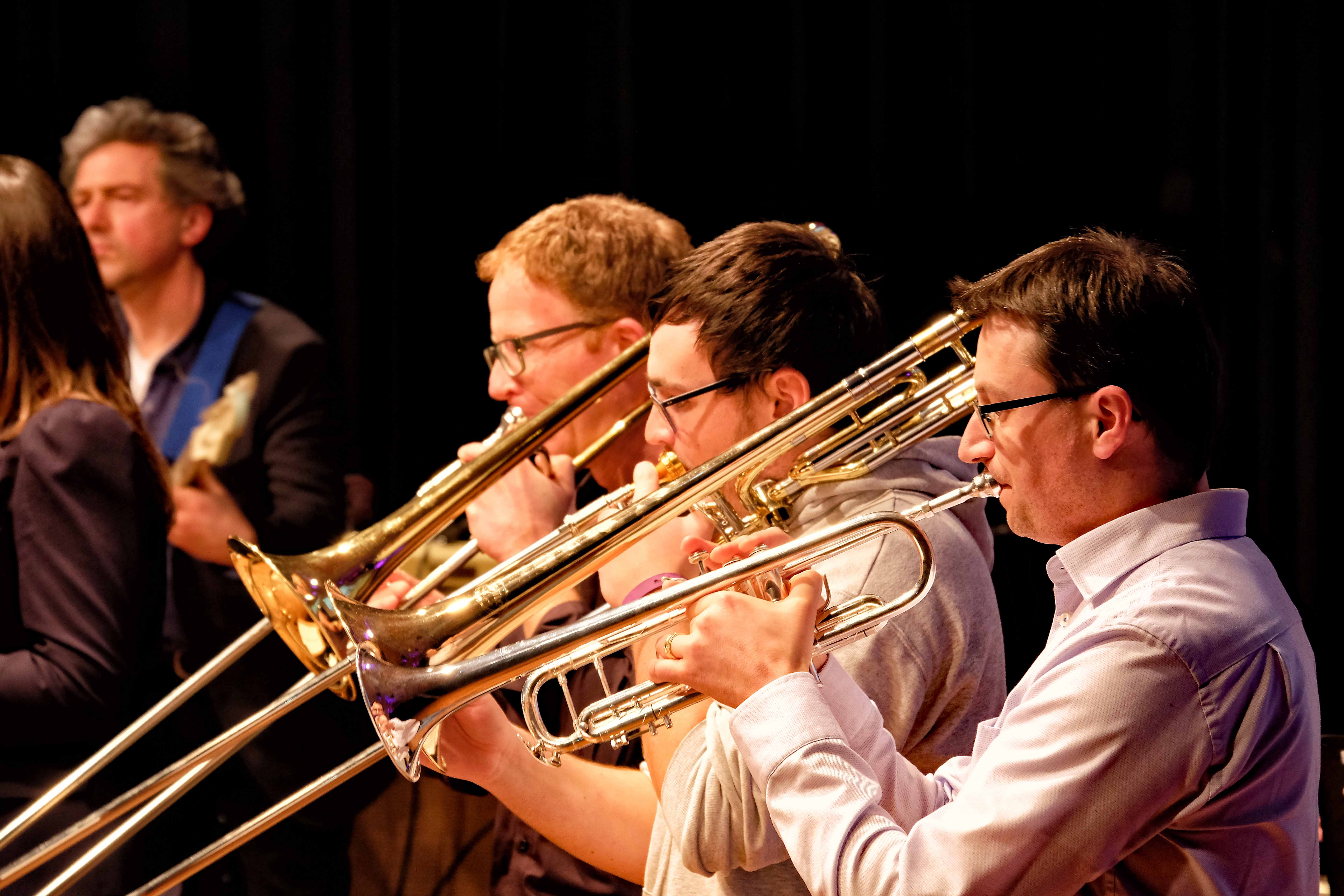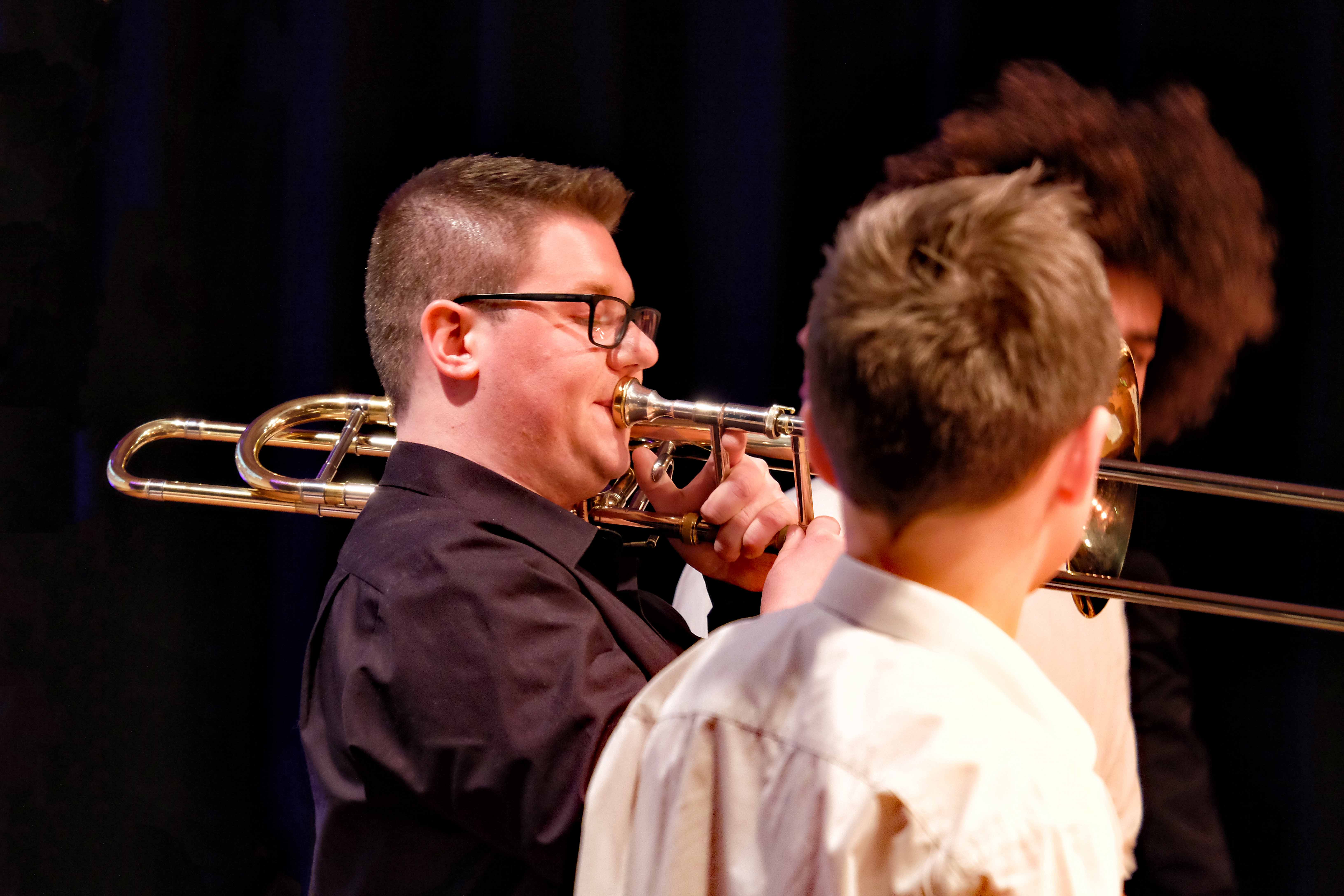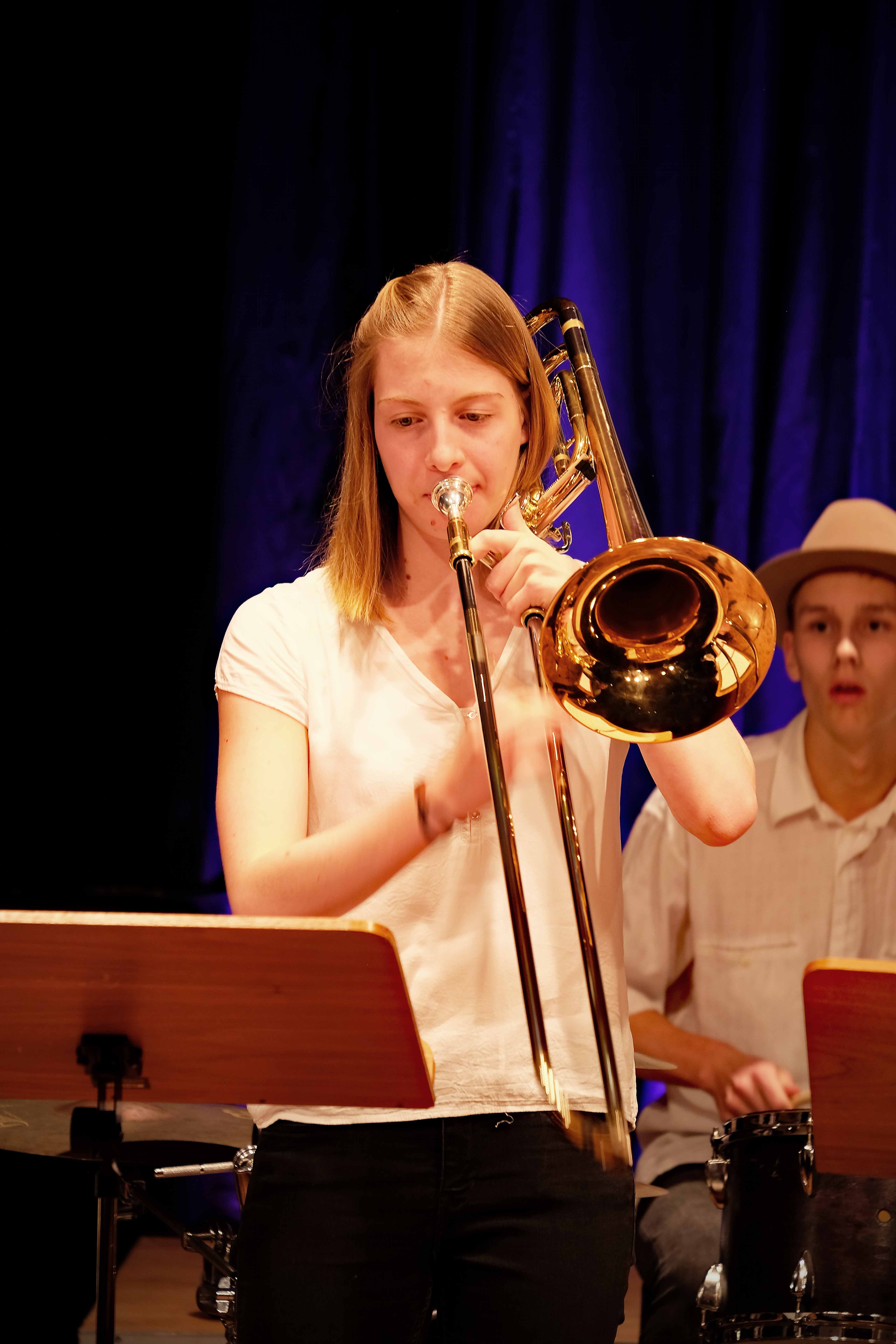 Es lag ein Knistern in der Luft der Kulturmulde des Werkgymnasiums, als sich am Samstagabend die Ränge füllten und sich das Auditorium bereit machte, um sich das Abschlusskonzert des 20. Jazzworkshops anzuhören. Seit dem Freitagmorgen probten hierfür viele Schülerinnen und Schüler von WeG, HG, des MSG, SG, HeT sowie externe Musiker und natürlich die renomierten Jazzdozenten Eberhard Budziat (Posaune), Martin Schrack (Piano), Klaus Graf (Saxophon) und Joo Kraus (Trompete). Im Anschluss an einen erfolgreichen ersten Probetag (2.03.2018) gaben in der Dualen Hochschule in Kooperation mit „Jazz Heidenheim e.V.“ besagte Dozenten ein Konzert als „Martin Schrack Sextett“ (zusätzlich Axel Kühn am Bass und Felix Schrack am Schlagzeug) und verzauberten den vollbesetzten Saal, nur um am nächsten Tag gleich weiter zu proben und erneut ein Konzert zu geben. Eine Liebe zur Musik, die jeder Hörer spüren kann. So auch am Samstagabend im Werkgymnasium.