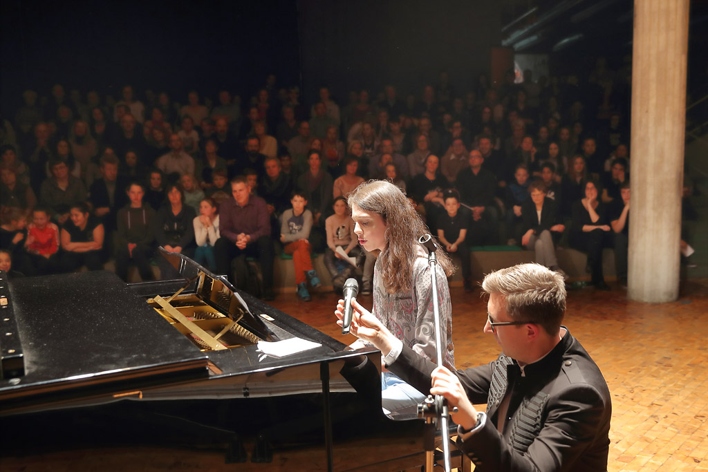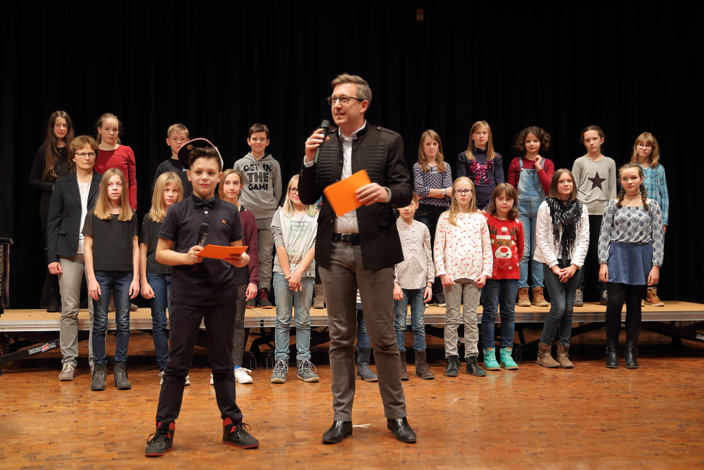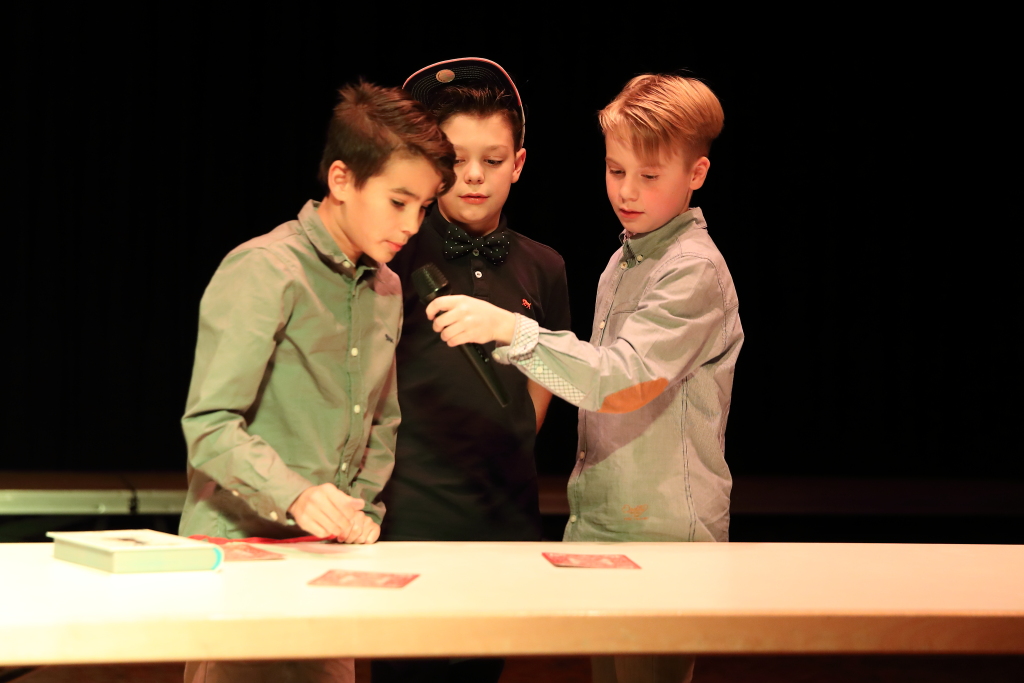 Auch während der Umbaupausen gab es keine Gelegenheit sich zu langweilen. Dafür sorgte ein außergewöhnliches Moderationsteam, bestehend aus Marco Graša, der als Theaterpädagoge auch für die Organisation des Abends verantwortlich war, und dem Fünftklässler Marlon Caca, der seine Aufgabe toll meisterte. Die zwei führten mit viel Witz und Leichtigkeit durch den Abend, sodass auch die Umbaupausen zu einer kleinen Vorführung wurden.
