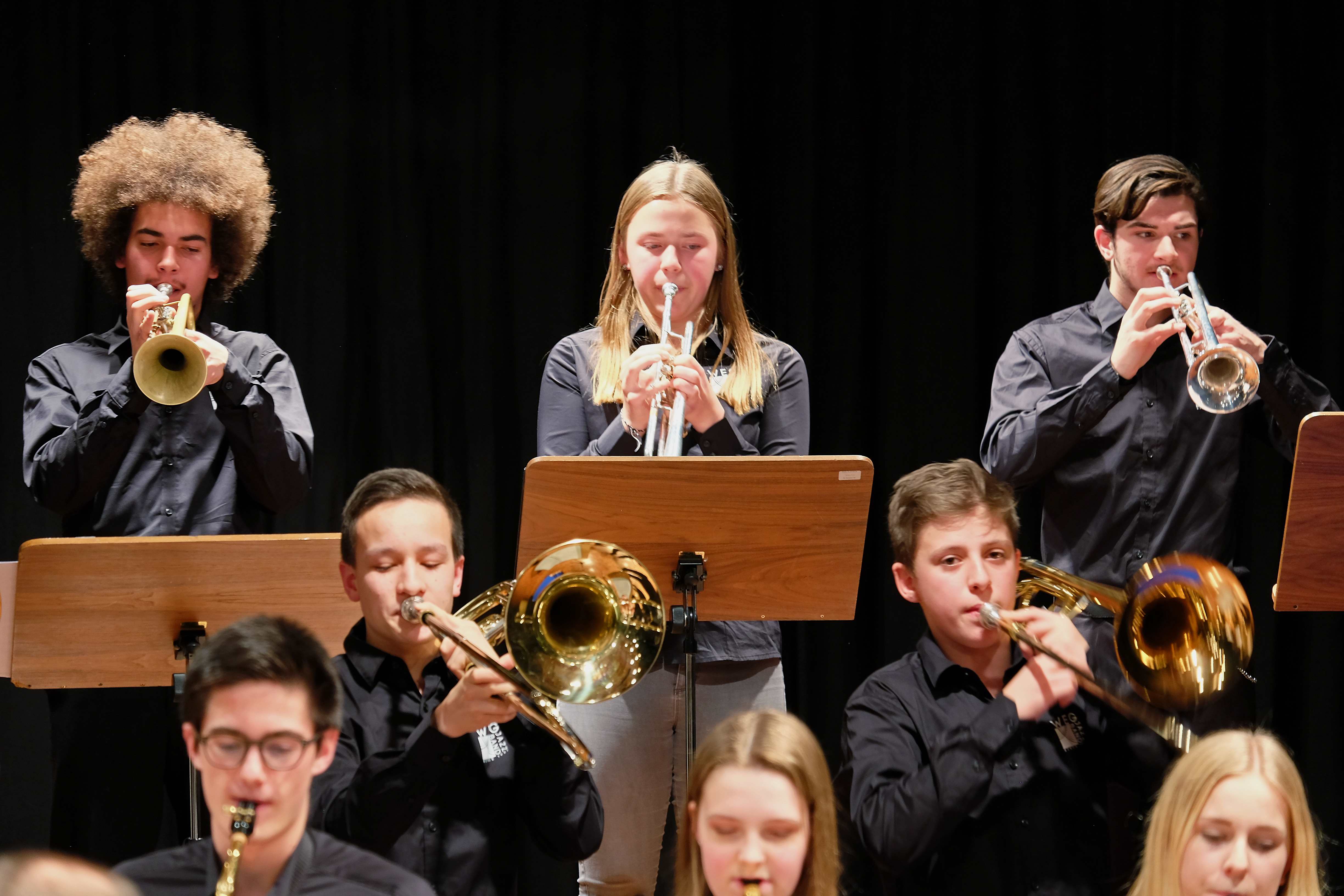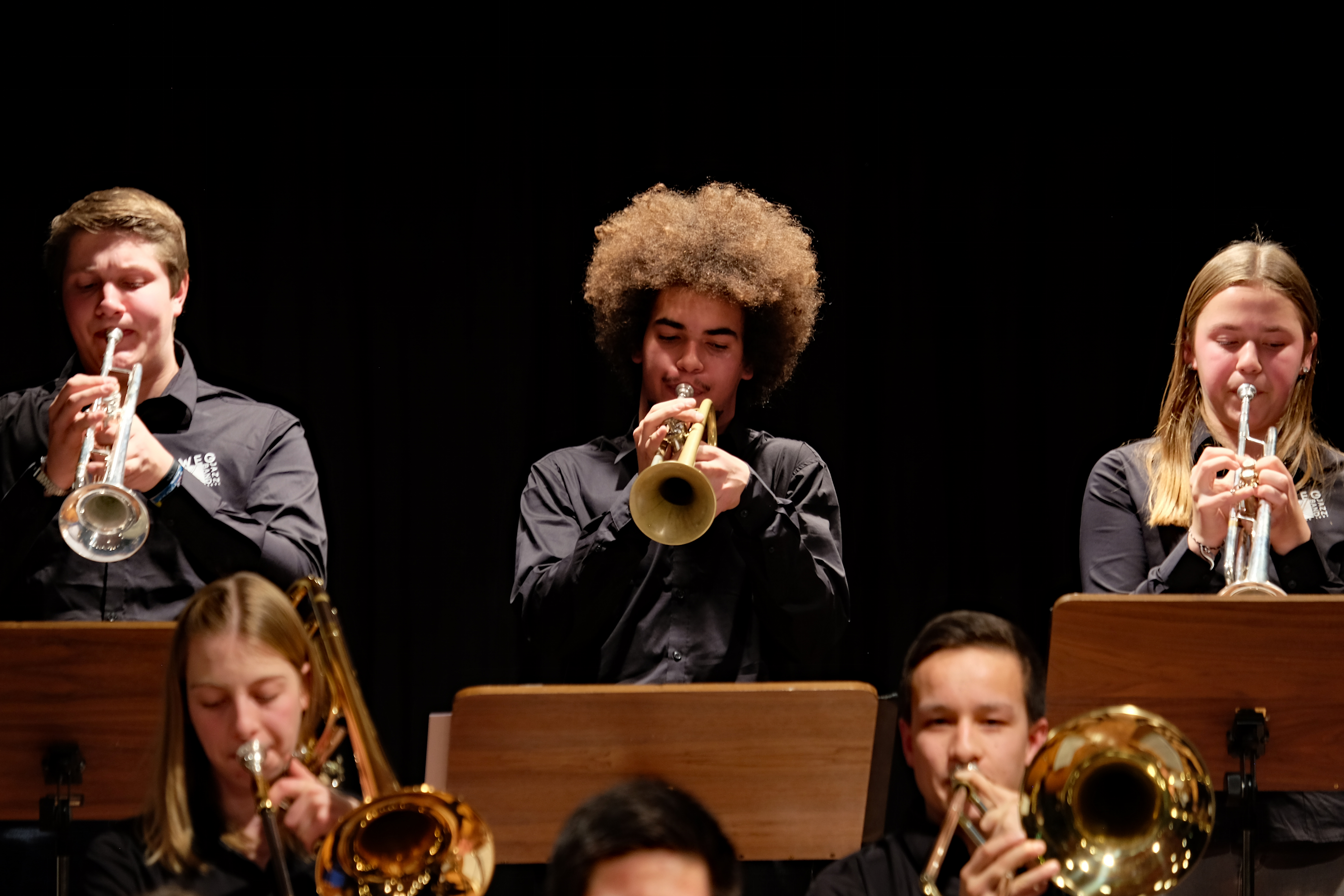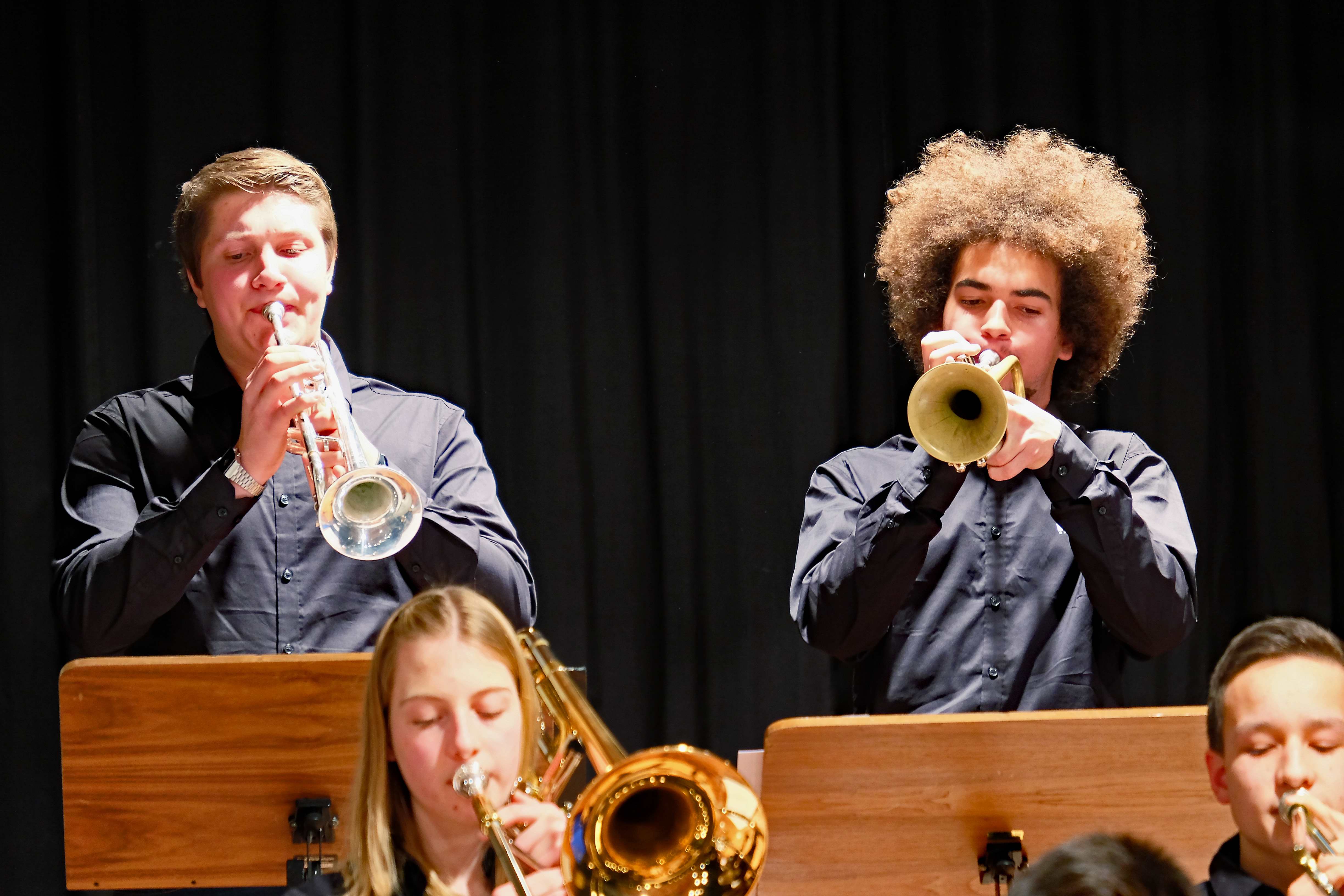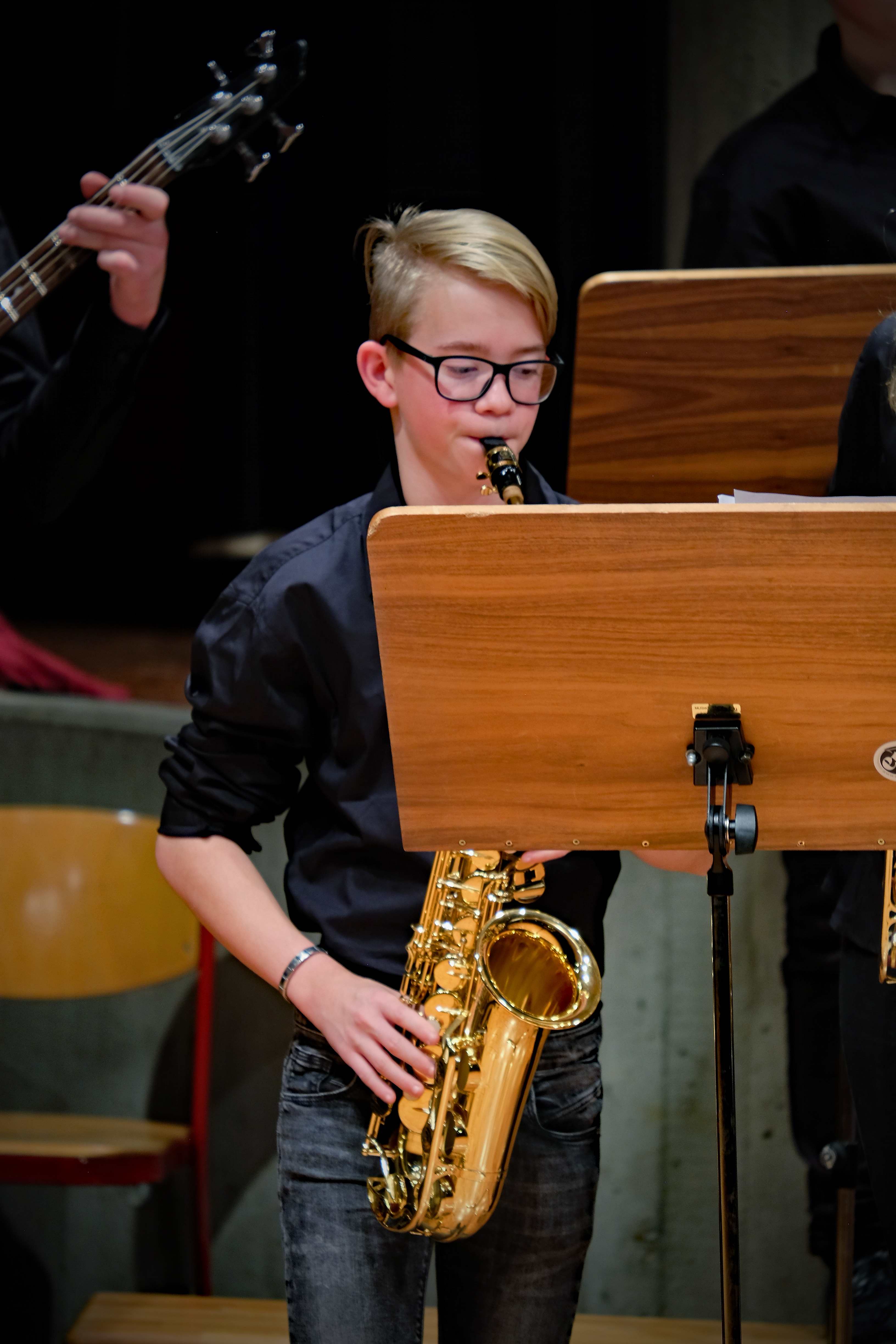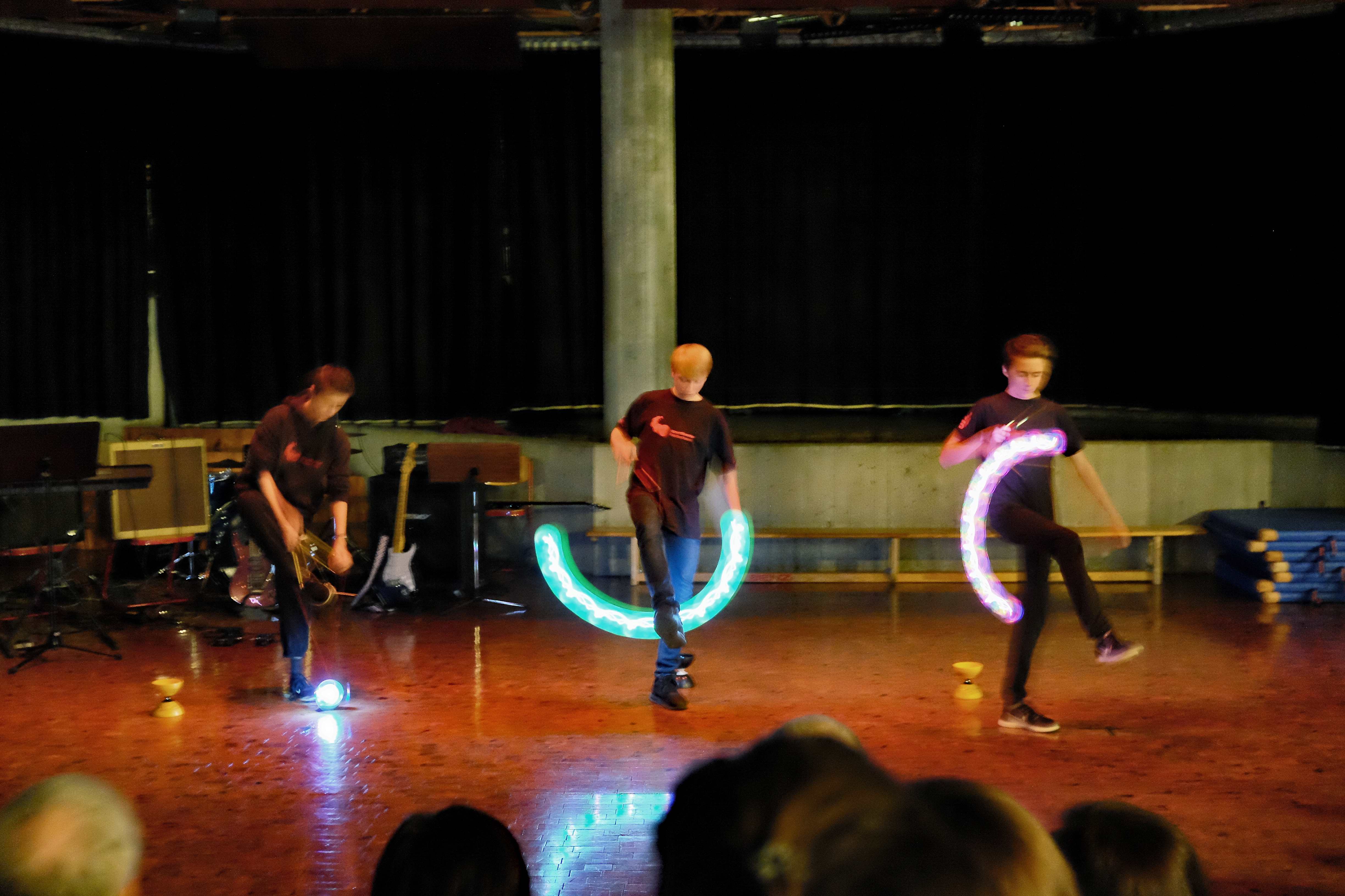 Die Eröffnung gestaltete der Unterstufenchor unter der Leitung von Helga Weber, gefolgt von einem vierhändig gespielten Stück des Komponisten Randall Compton. Stimmungsvoll ging es weiter mit einer illuminierten Diabolo-Einlage und der Unterstufen-Jazzband, die das Publikum mit einer Variation von „Lady in Black“ zum Mitsingen animierte. Eine Harfen-Sérenade von Alphouse Hasselman setzte hier einen Kontrapunkt, denn hier war es mucksmäuschenstill. Aber auch der Sport sollte an diesem Abend nicht fehlen: Gleich zwei Einlagen mit einer Mischung aus Tanz und Akrobatik durften die Zuschauer an diesem Abend bestaunen. Die Vielseitigkeit des Programms wurde ergänzt durch eine Zaubershow, eine Tuba-Solovorstellung mit perkussiven Elementen sowie weihnachtlichen Liedern der Schneeflockenband, bestehend aus Fünftklässlern. Die Pause läutete mit beeindruckenden Bläsersätzen und einer souveränen rhythmischen Begleitung die Jazzband von Joachim Kocsis ein.