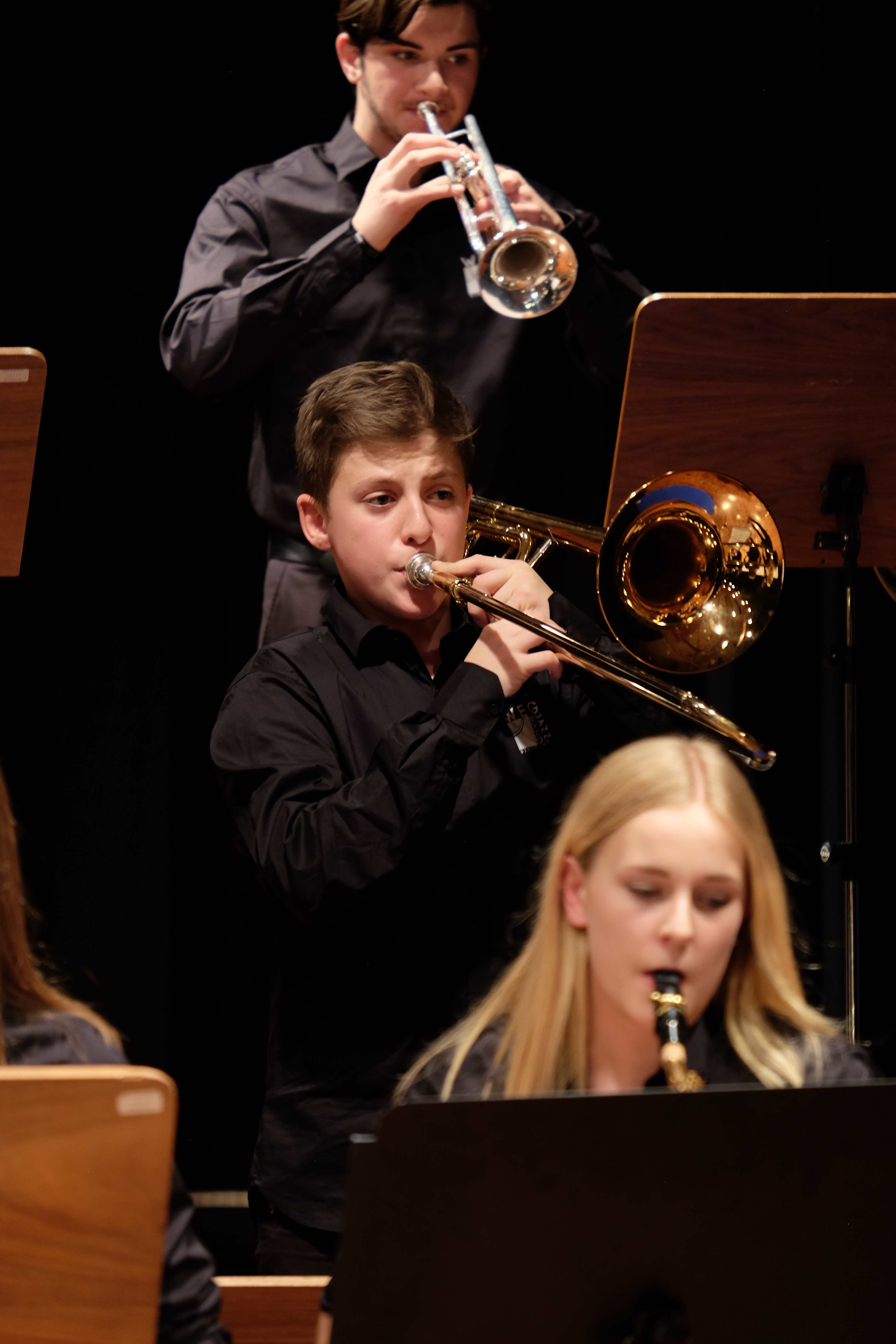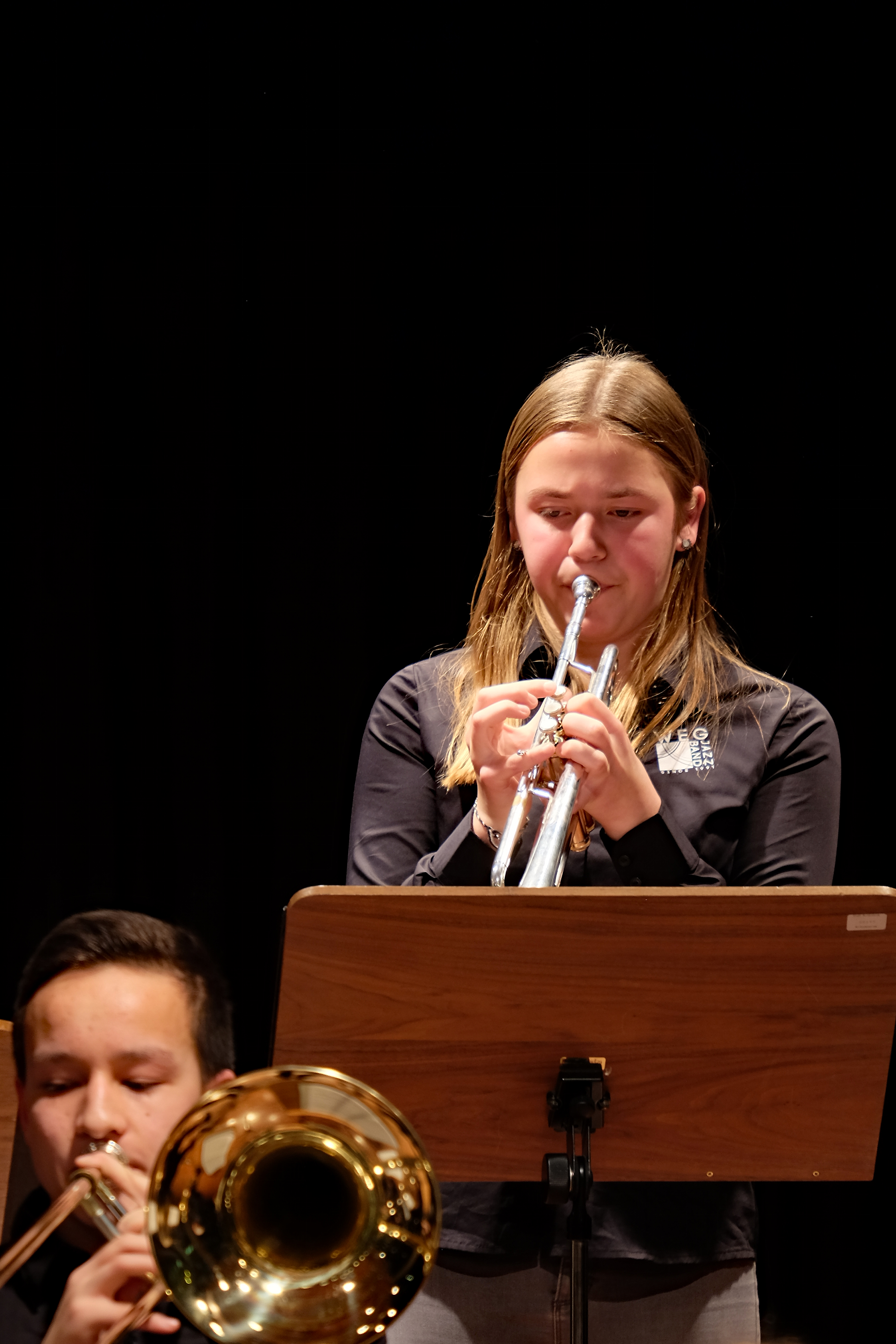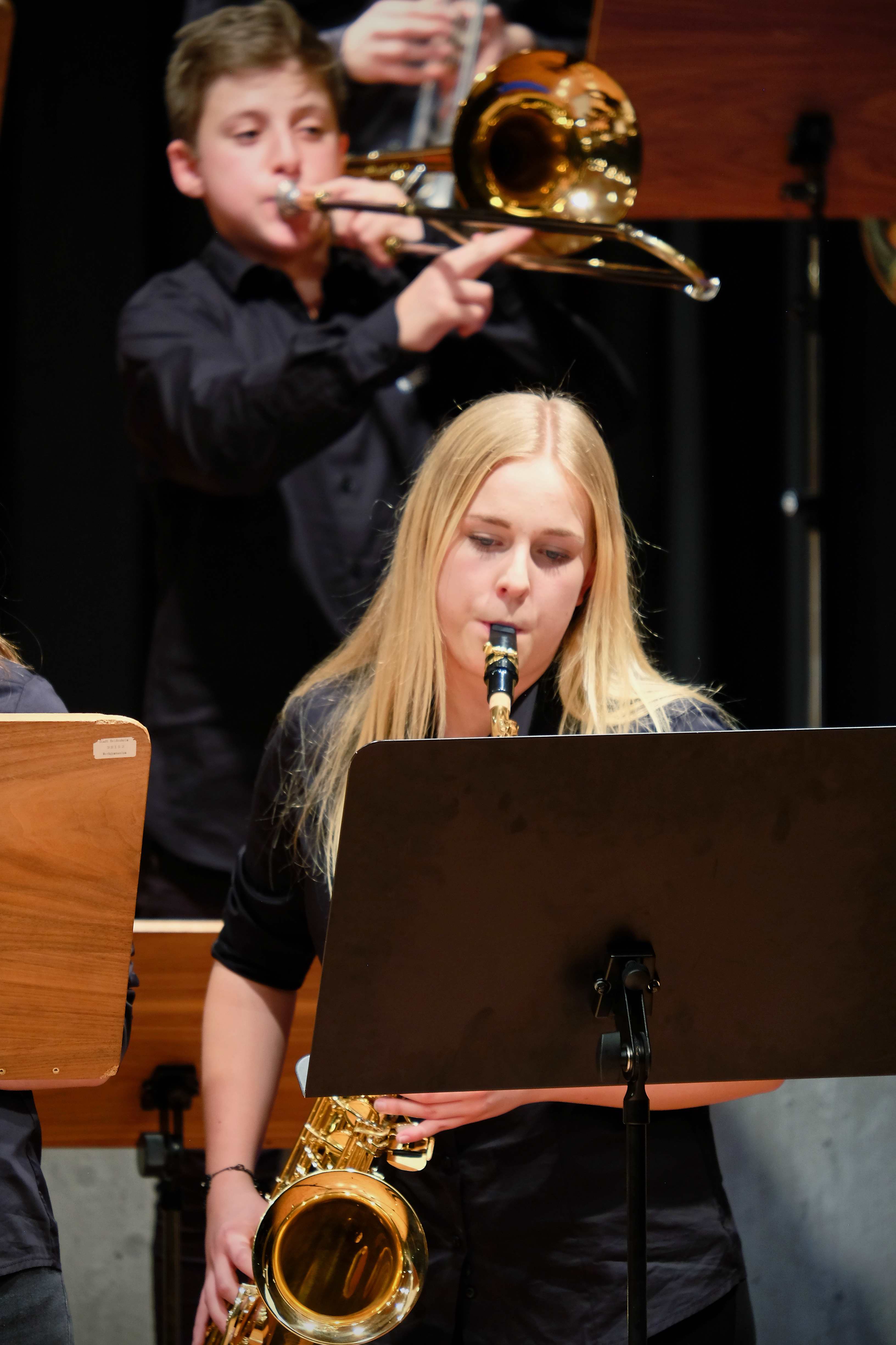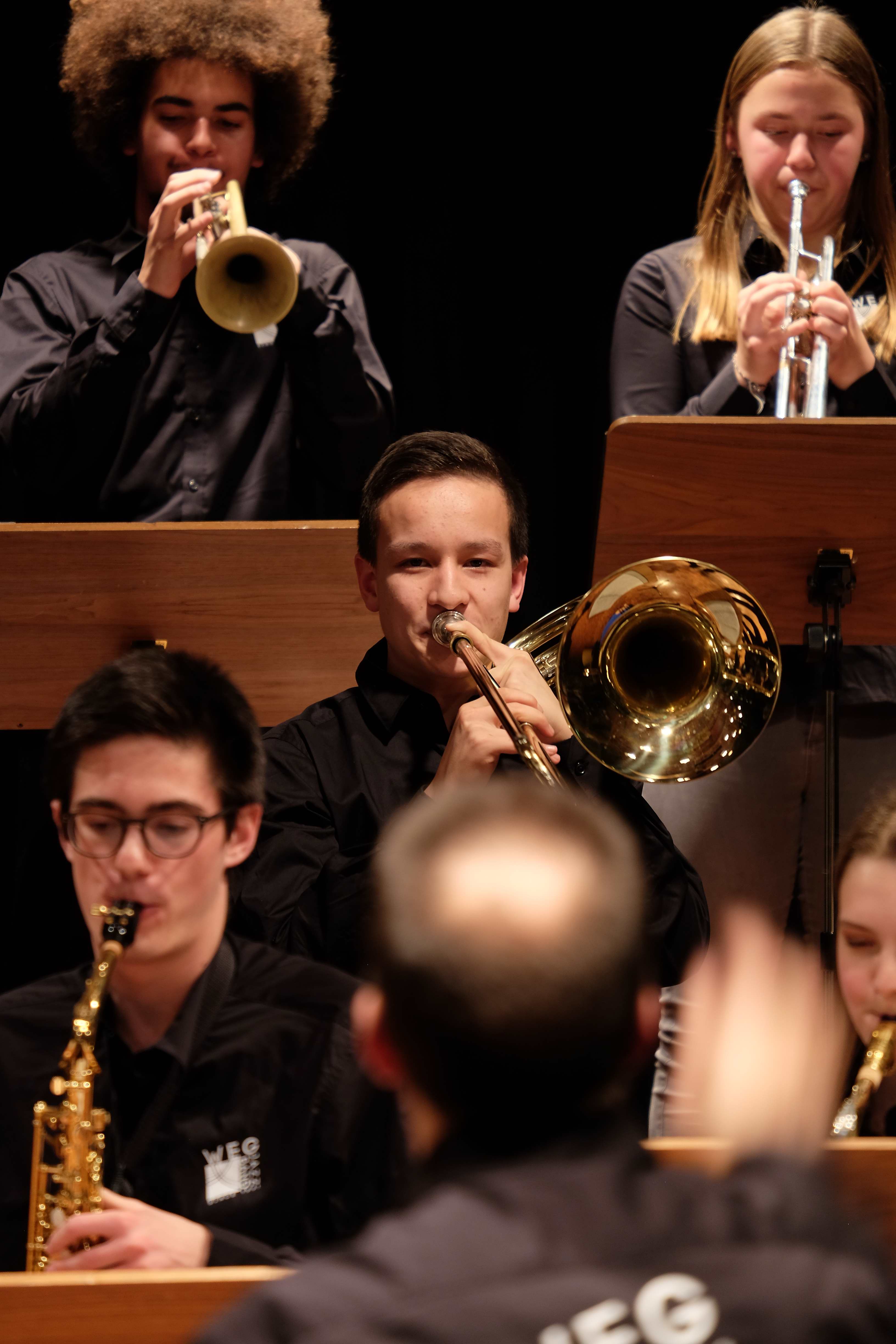 Die Eröffnung gestaltete der Unterstufenchor unter der Leitung von Helga Weber, gefolgt von einem vierhändig gespielten Stück des Komponisten Randall Compton. Stimmungsvoll ging es weiter mit einer illuminierten Diabolo-Einlage und der Unterstufen-Jazzband, die das Publikum mit einer Variation von „Lady in Black“ zum Mitsingen animierte. Eine Harfen-Sérenade von Alphouse Hasselman setzte hier einen Kontrapunkt, denn hier war es mucksmäuschenstill. Aber auch der Sport sollte an diesem Abend nicht fehlen: Gleich zwei Einlagen mit einer Mischung aus Tanz und Akrobatik durften die Zuschauer an diesem Abend bestaunen. Die Vielseitigkeit des Programms wurde ergänzt durch eine Zaubershow, eine Tuba-Solovorstellung mit perkussiven Elementen sowie weihnachtlichen Liedern der Schneeflockenband, bestehend aus Fünftklässlern. Die Pause läutete mit beeindruckenden Bläsersätzen und einer souveränen rhythmischen Begleitung die Jazzband von Joachim Kocsis ein.