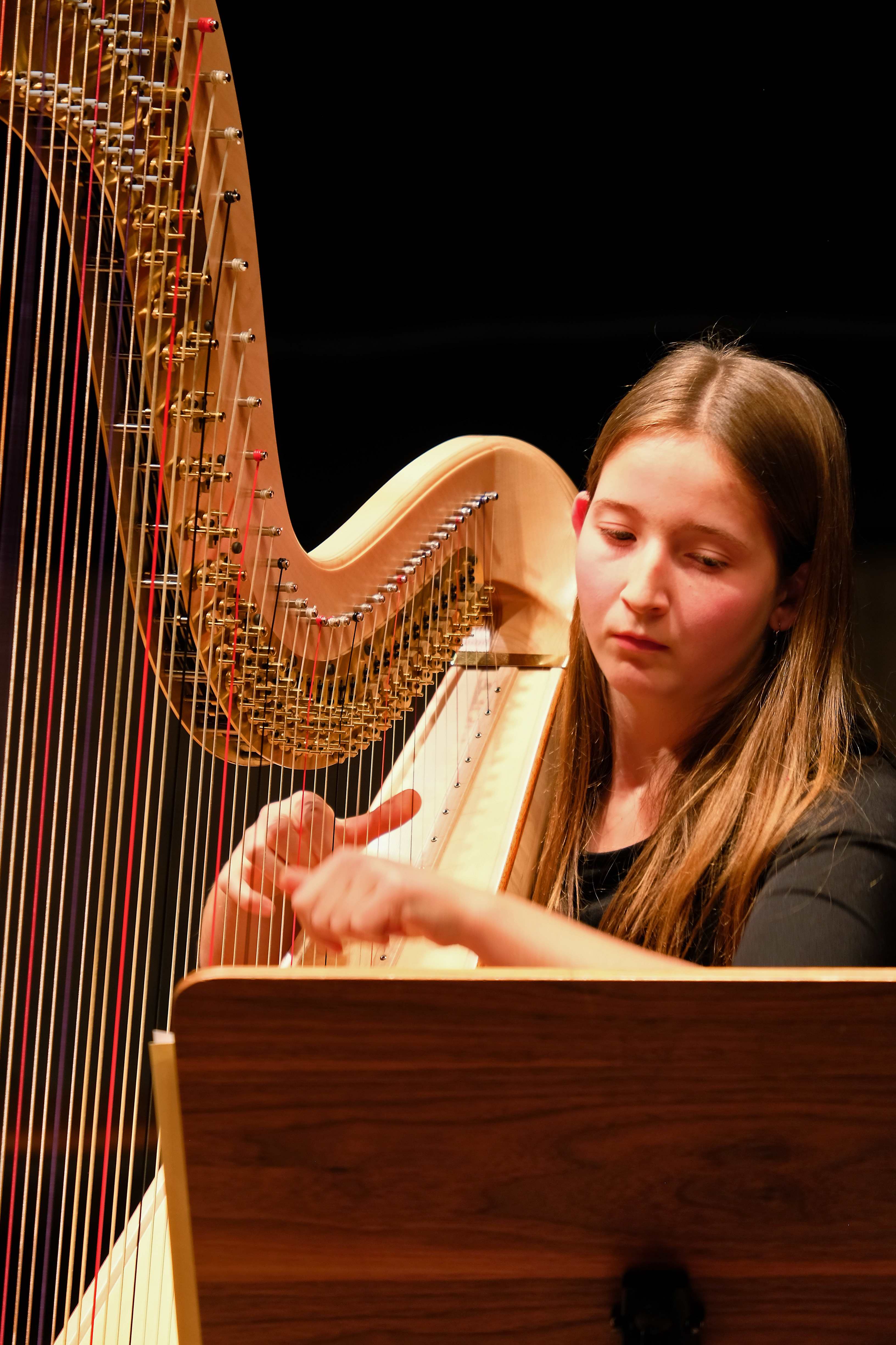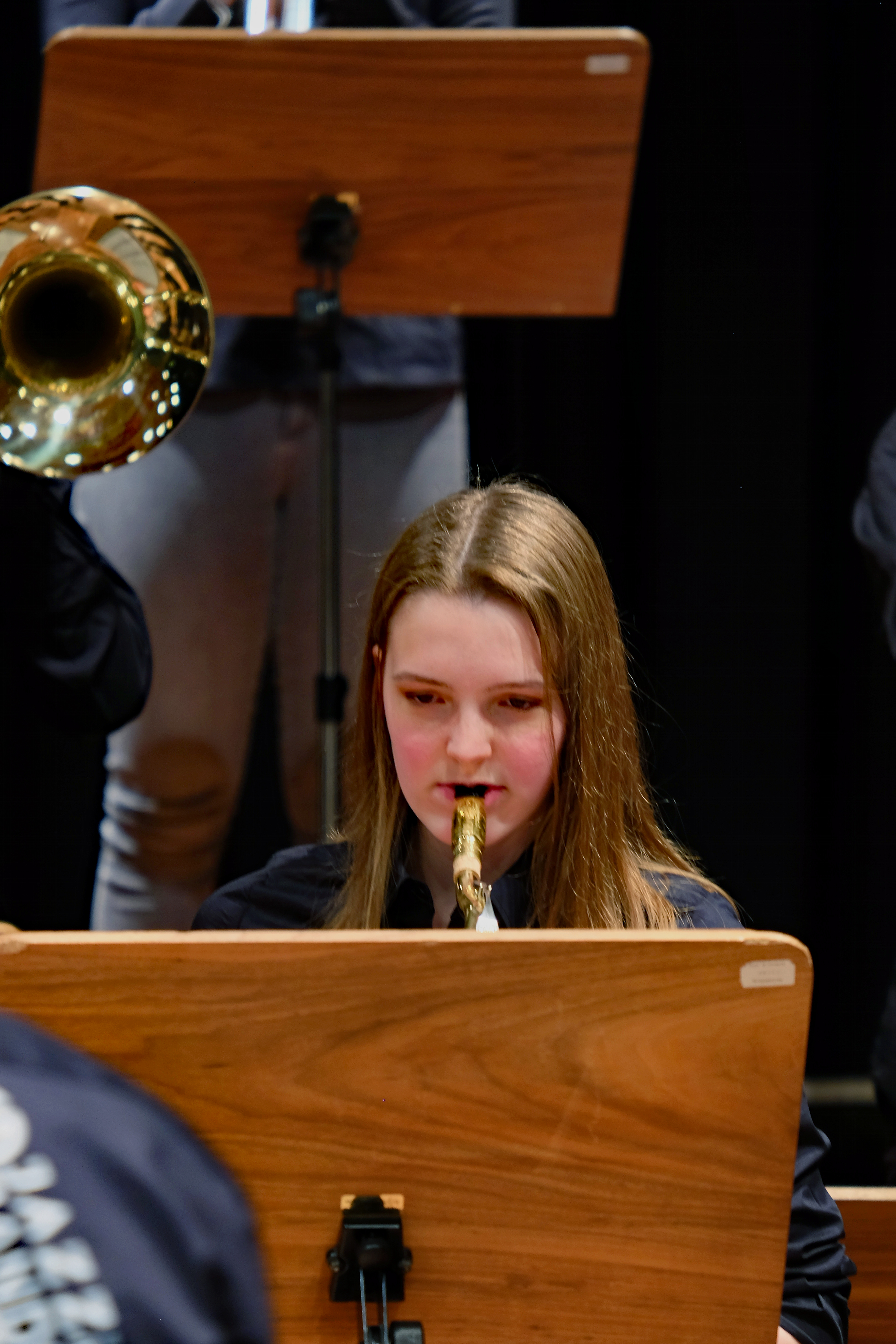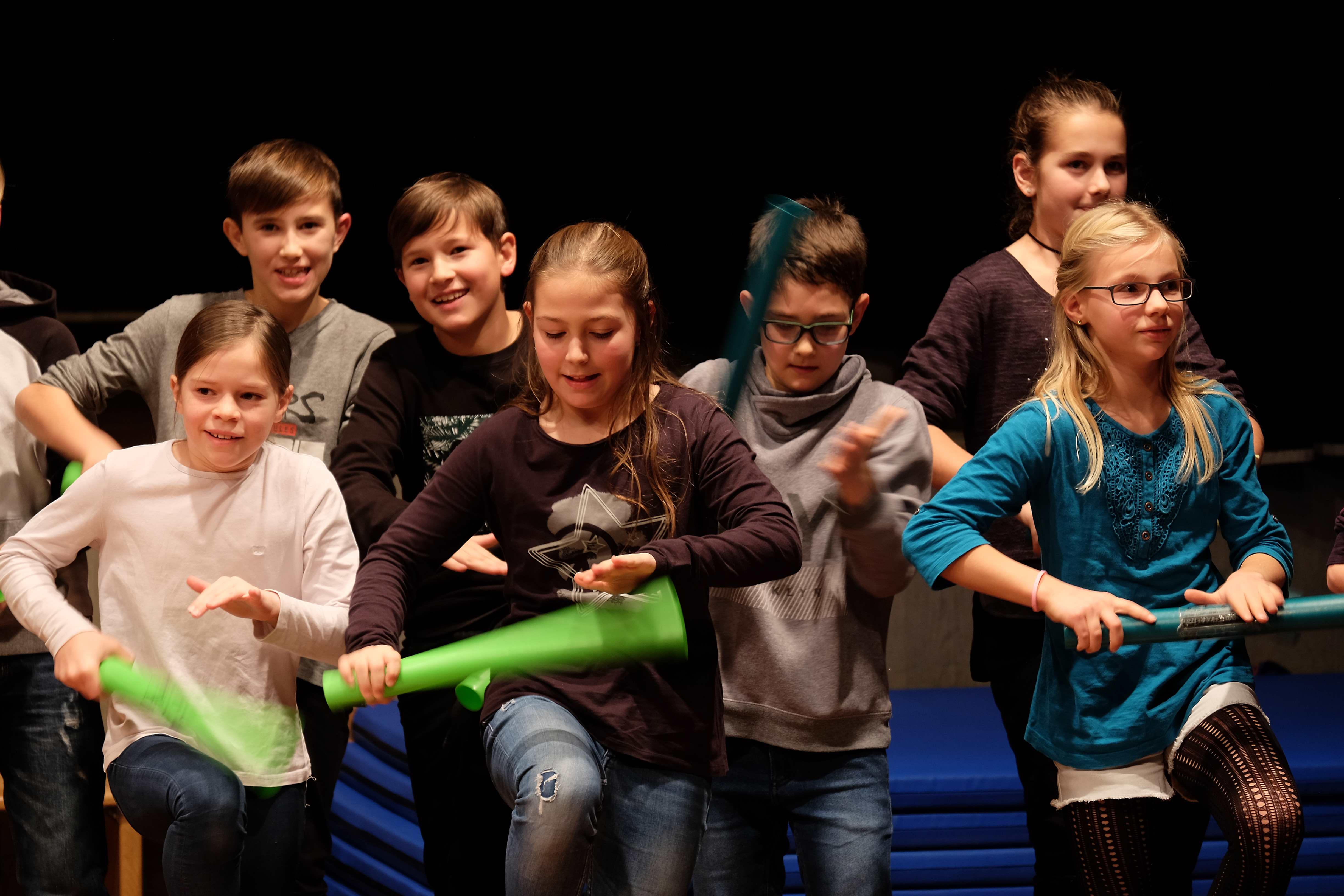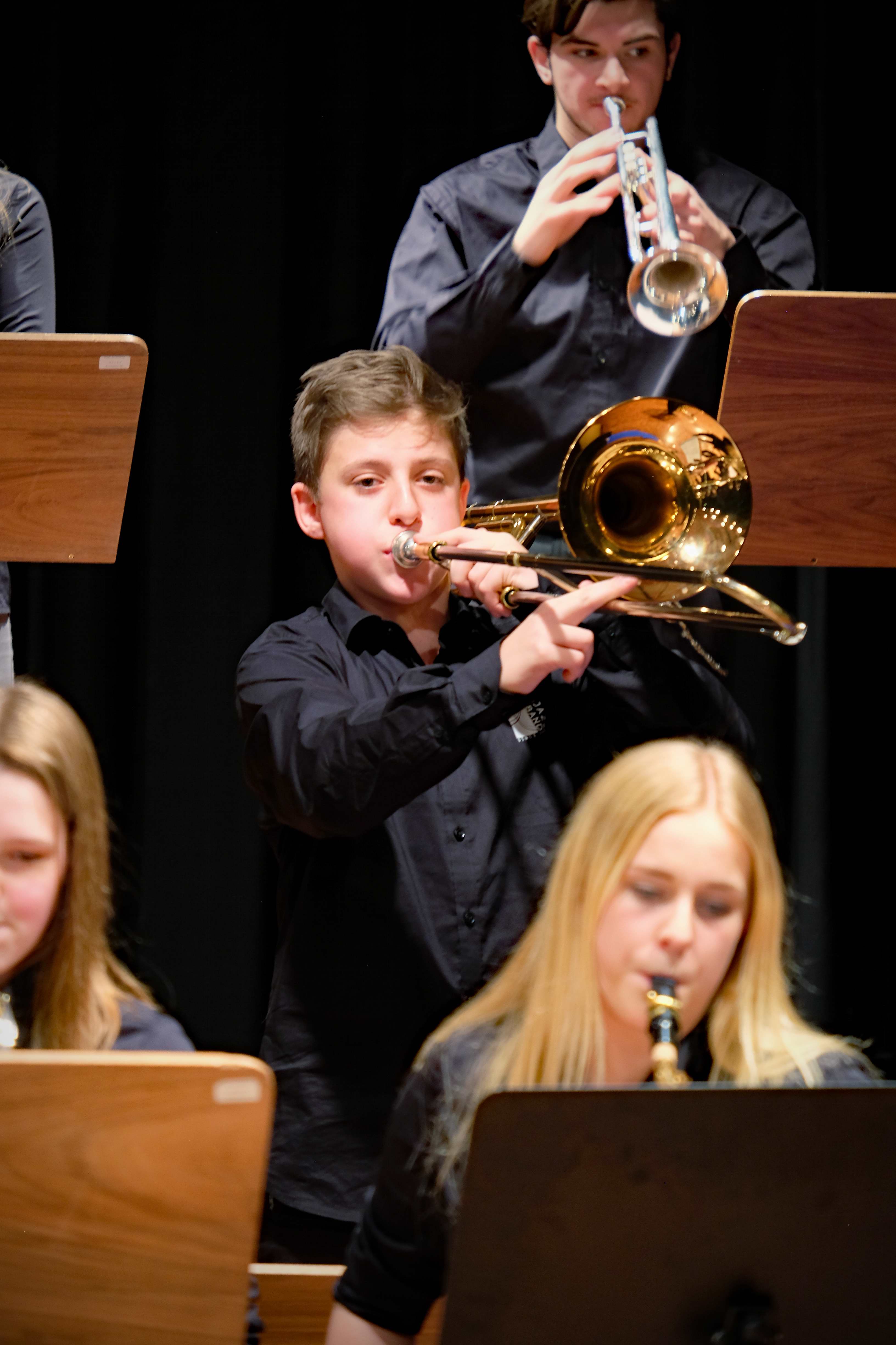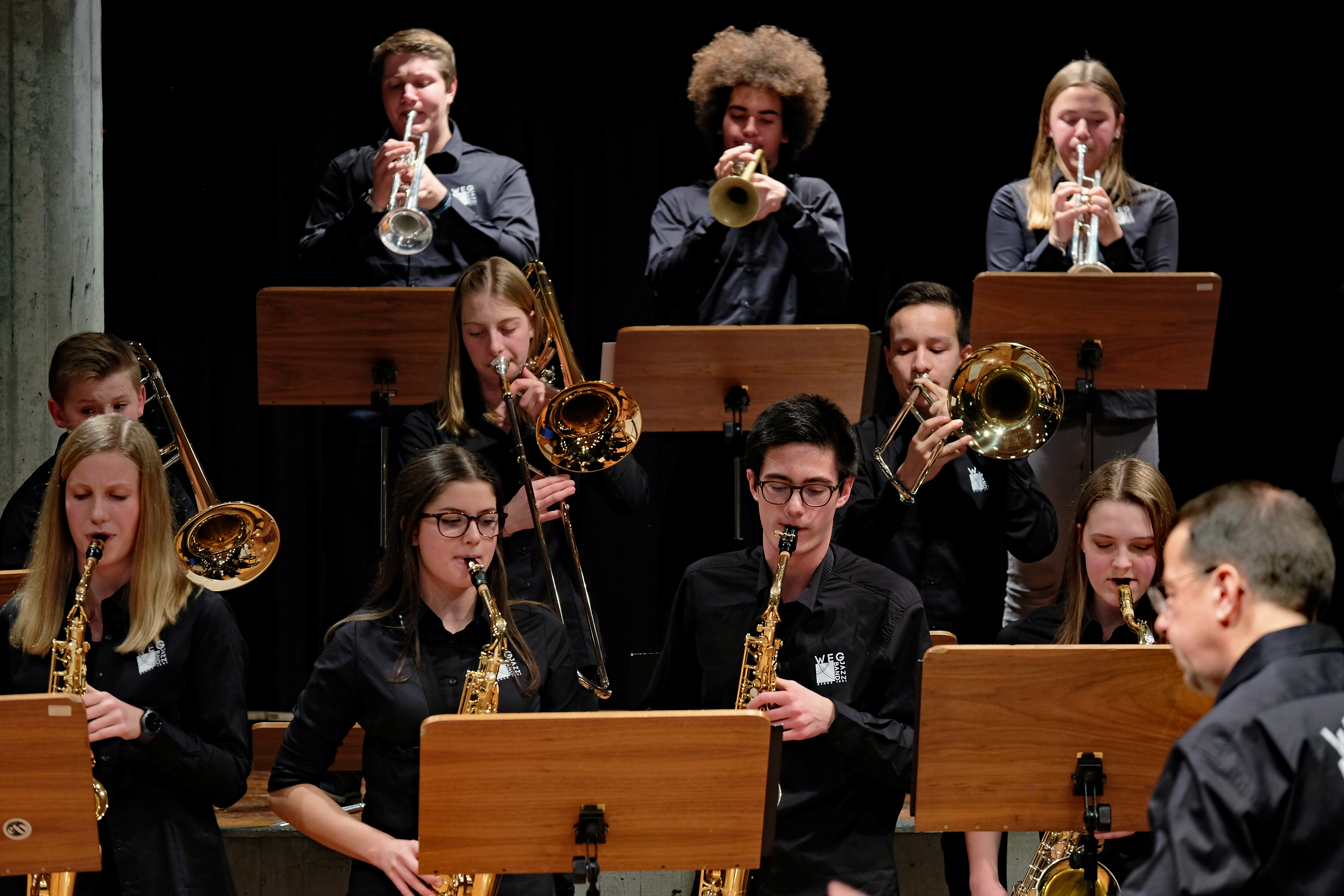 Die Eröffnung gestaltete der Unterstufenchor unter der Leitung von Helga Weber, gefolgt von einem vierhändig gespielten Stück des Komponisten Randall Compton. Stimmungsvoll ging es weiter mit einer illuminierten Diabolo-Einlage und der Unterstufen-Jazzband, die das Publikum mit einer Variation von „Lady in Black“ zum Mitsingen animierte. Eine Harfen-Sérenade von Alphouse Hasselman setzte hier einen Kontrapunkt, denn hier war es mucksmäuschenstill. Aber auch der Sport sollte an diesem Abend nicht fehlen: Gleich zwei Einlagen mit einer Mischung aus Tanz und Akrobatik durften die Zuschauer an diesem Abend bestaunen. Die Vielseitigkeit des Programms wurde ergänzt durch eine Zaubershow, eine Tuba-Solovorstellung mit perkussiven Elementen sowie weihnachtlichen Liedern der Schneeflockenband, bestehend aus Fünftklässlern. Die Pause läutete mit beeindruckenden Bläsersätzen und einer souveränen rhythmischen Begleitung die Jazzband von Joachim Kocsis ein.