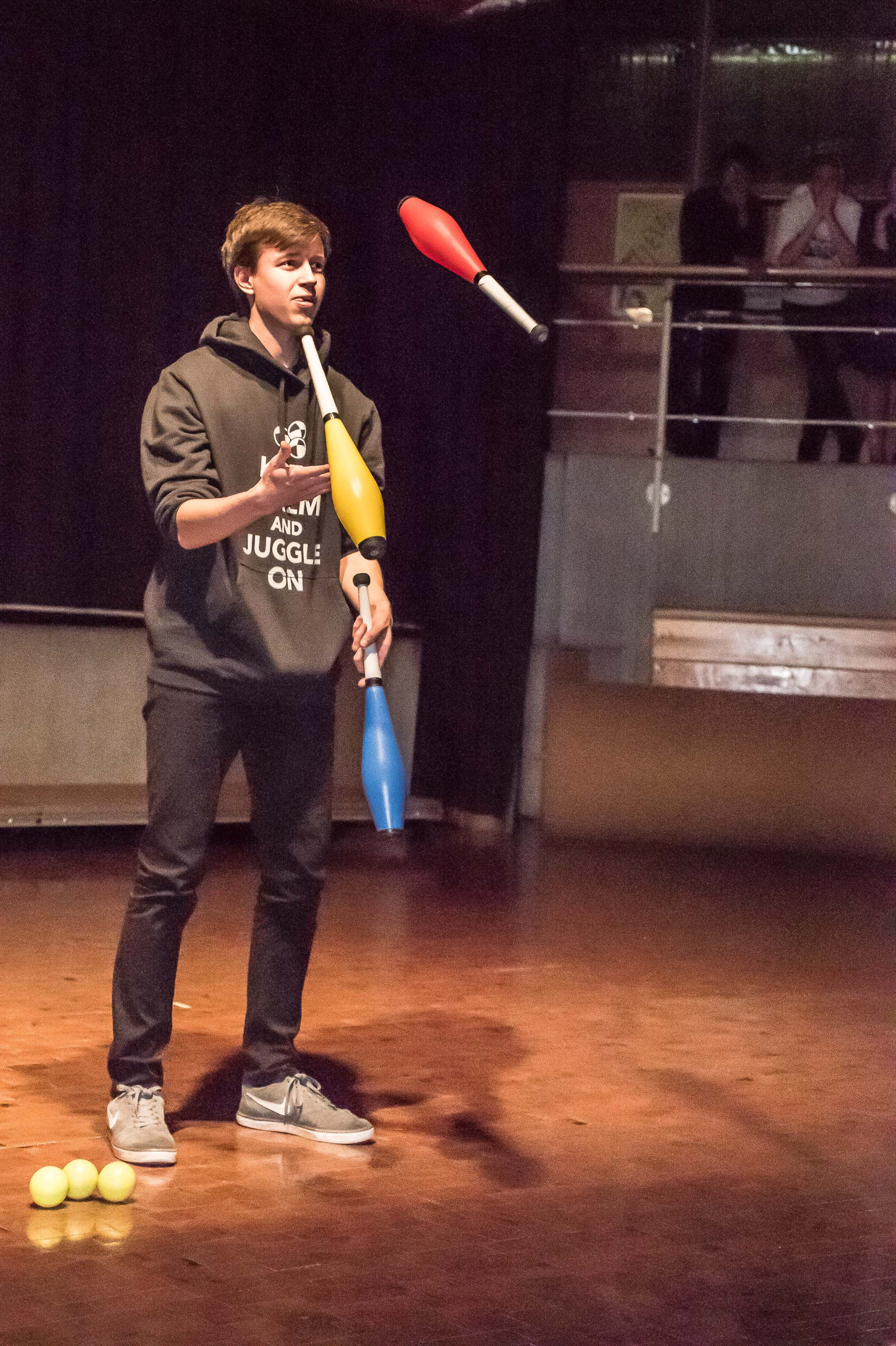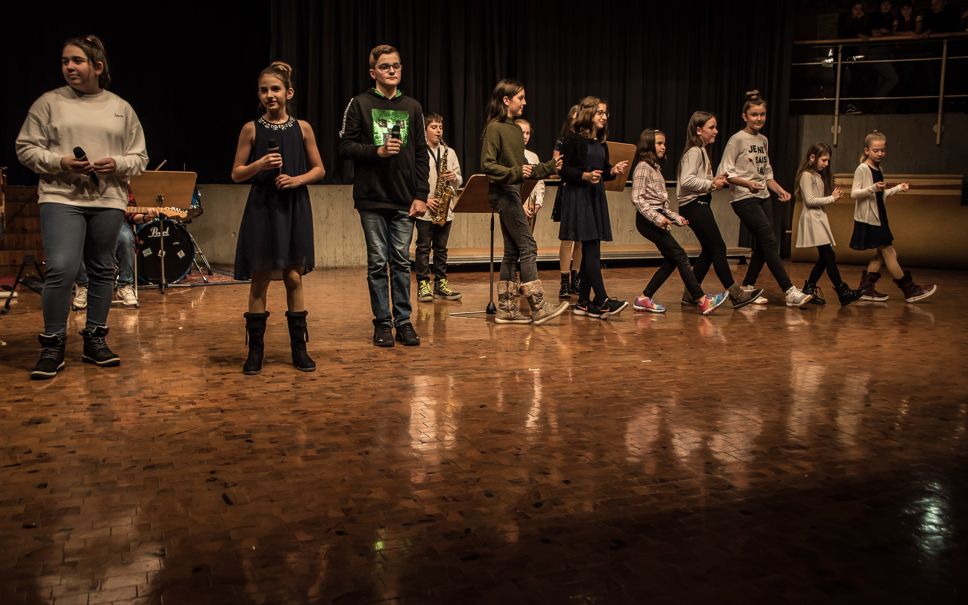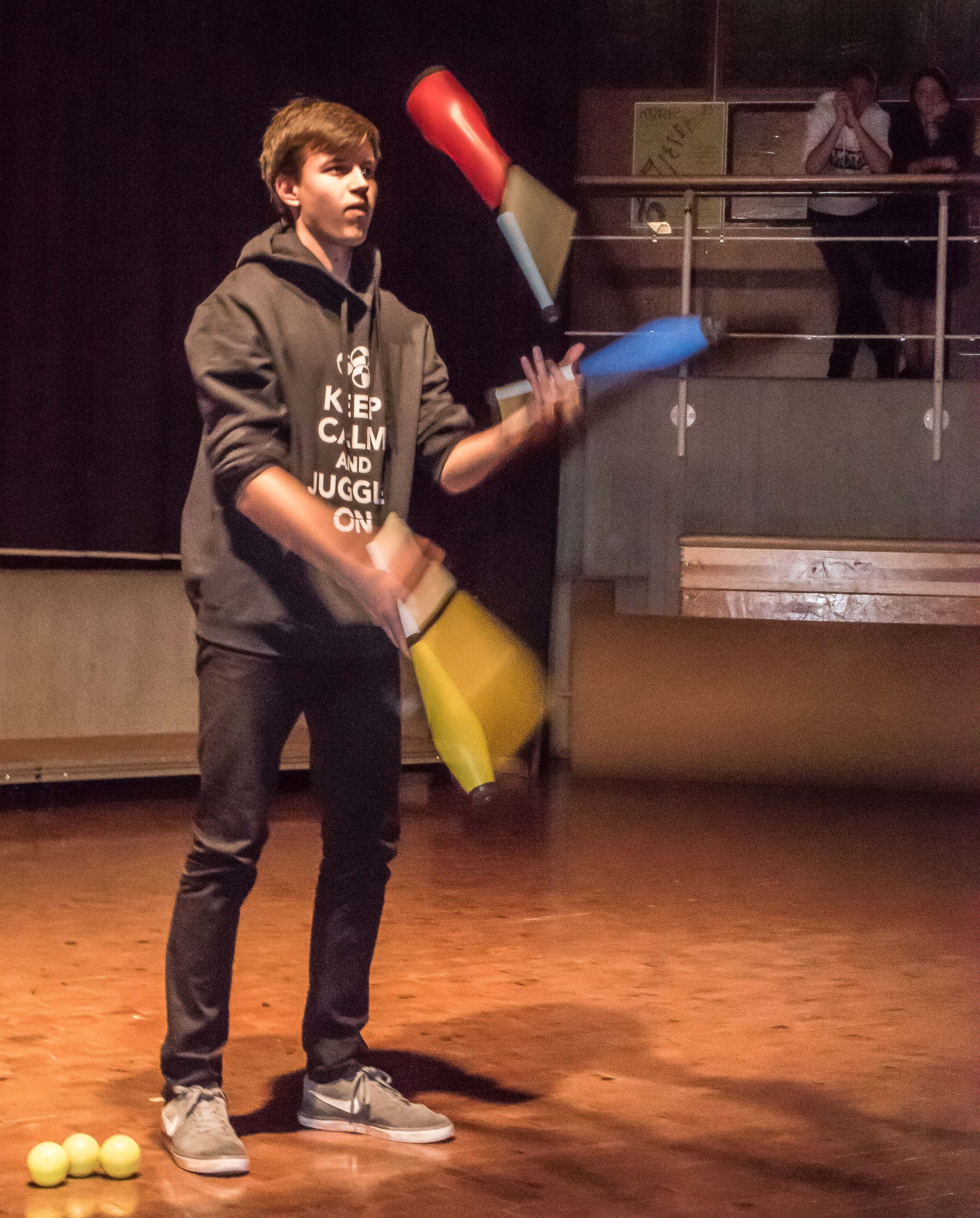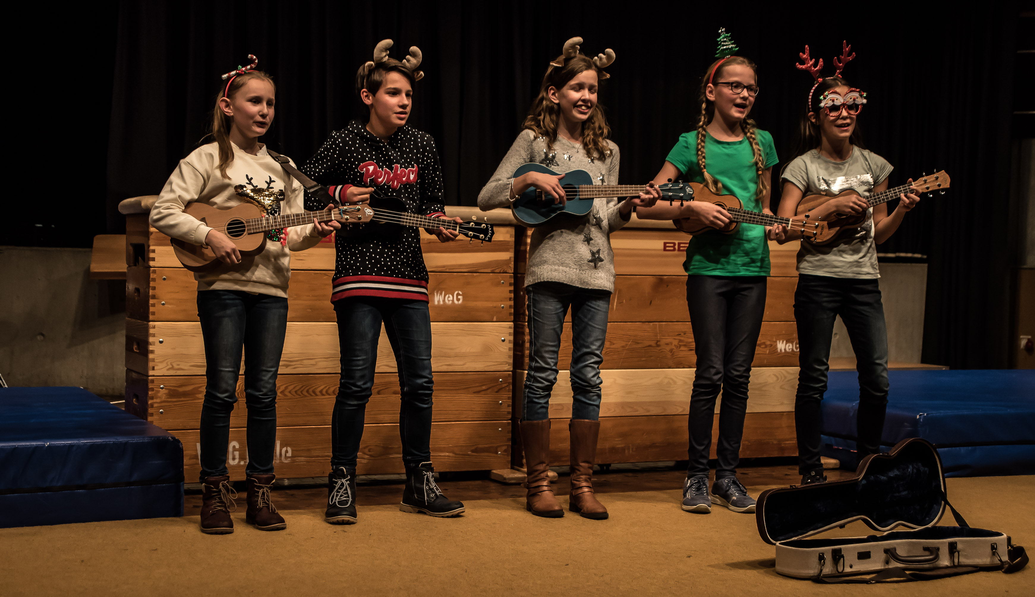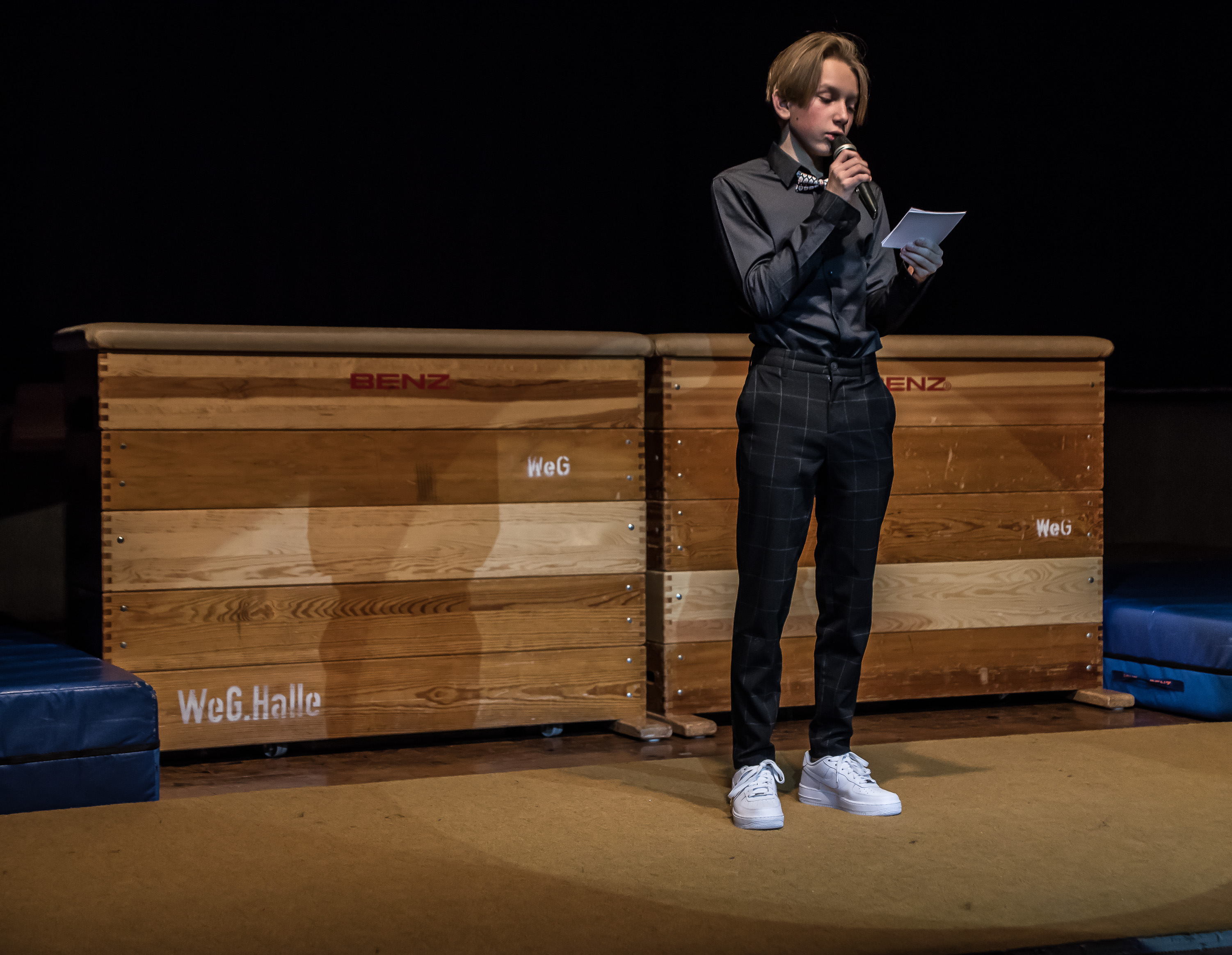 Nach der musikalischen Begrüßung durch die Unterstufenband von Joachim Kocsis und einem Willkommensgruß des Schulleiters übernahm umgehend das charmante Duo Darija Lazic und Fabian Flinner die Moderation und führte das Publikum gekonnt durch den Abend. "Das Spinnenlied" sorgte mit selbst gestalteten Plakaten für einiges Schmunzeln in der Gästereihe, während die Jonglagenummer von Mattis Bühler die Besucher zum Staunen brachte. Angeleitet von Fabian Hess, Peter Hank und Choreographin Dina Tanzmann legten Selina Appel, Nina Kokot, Mona Lakhal, Juliana Richter und Dominika Tajpsz einen gelungenen Auftritt zum Song "Faded" von Alan Walker auf die Fläche. Weihnachtliche Stimmung verbreitete der Unterstufenchor von Helga Weber mit seinen Titeln "Rock my soul" und dem rührenden Song "Wunder gescheh´n". Dina Tanzmann ließ es sich nicht nehmen, als Ehemalige mit dem Chor zu proben und ihn am Abend am Piano zu begleiten.