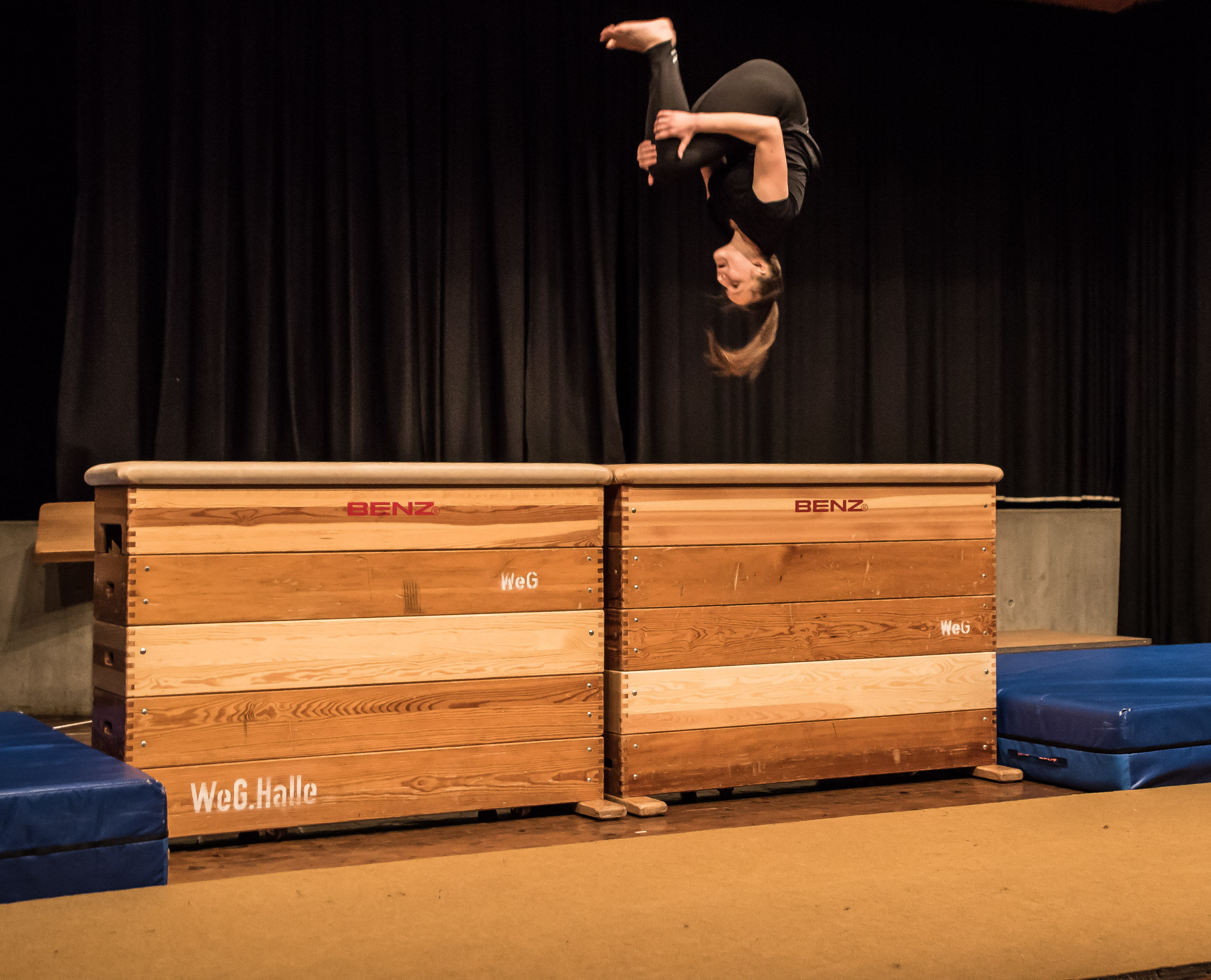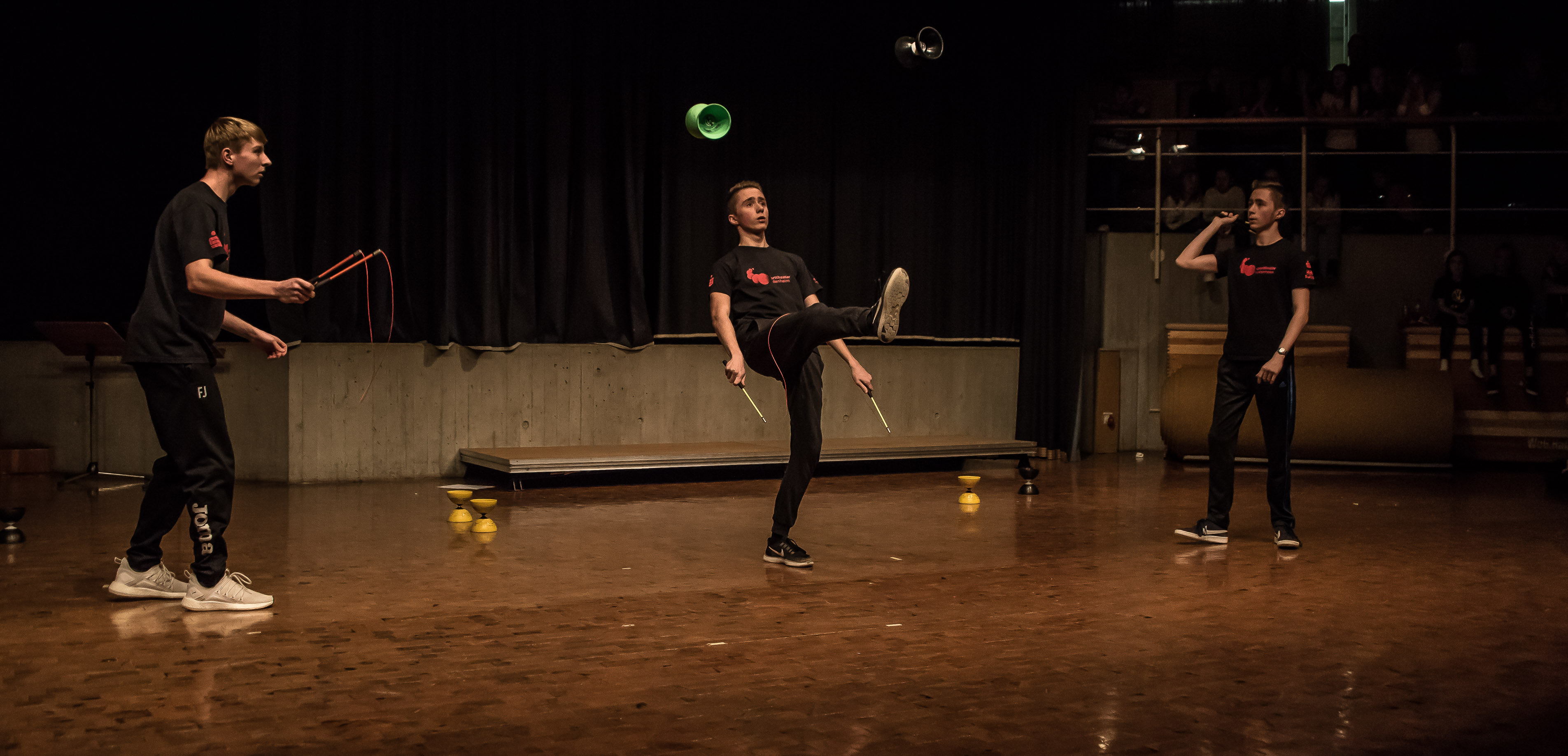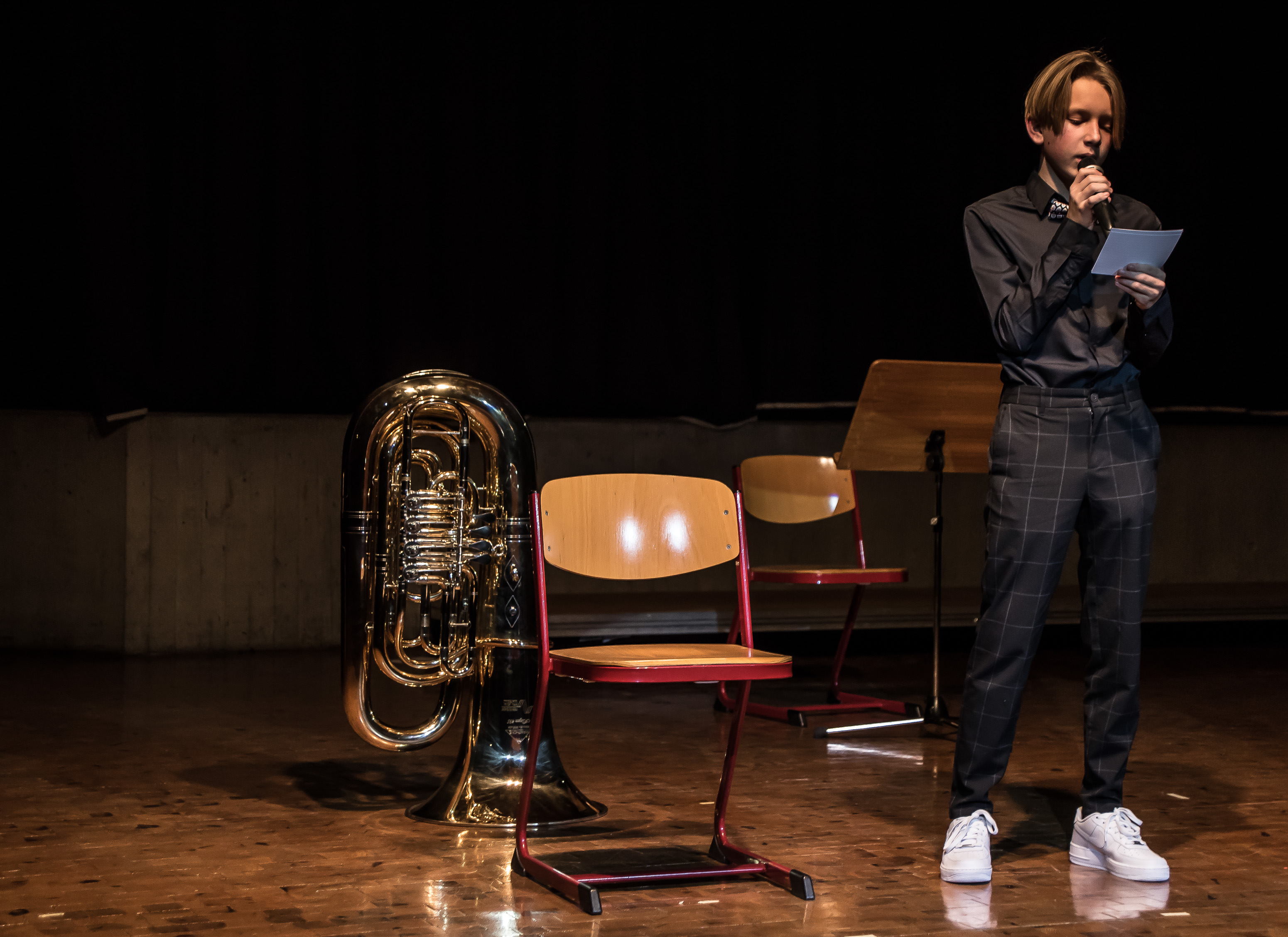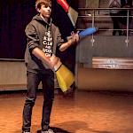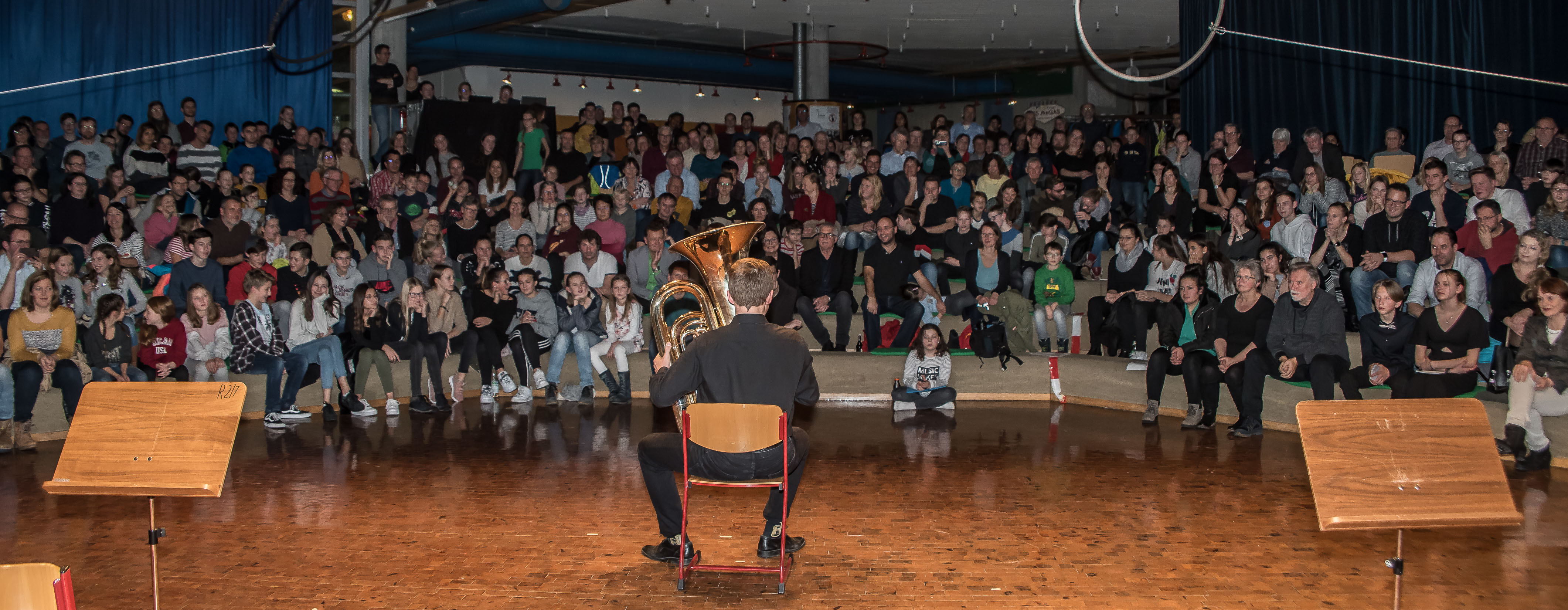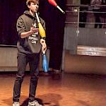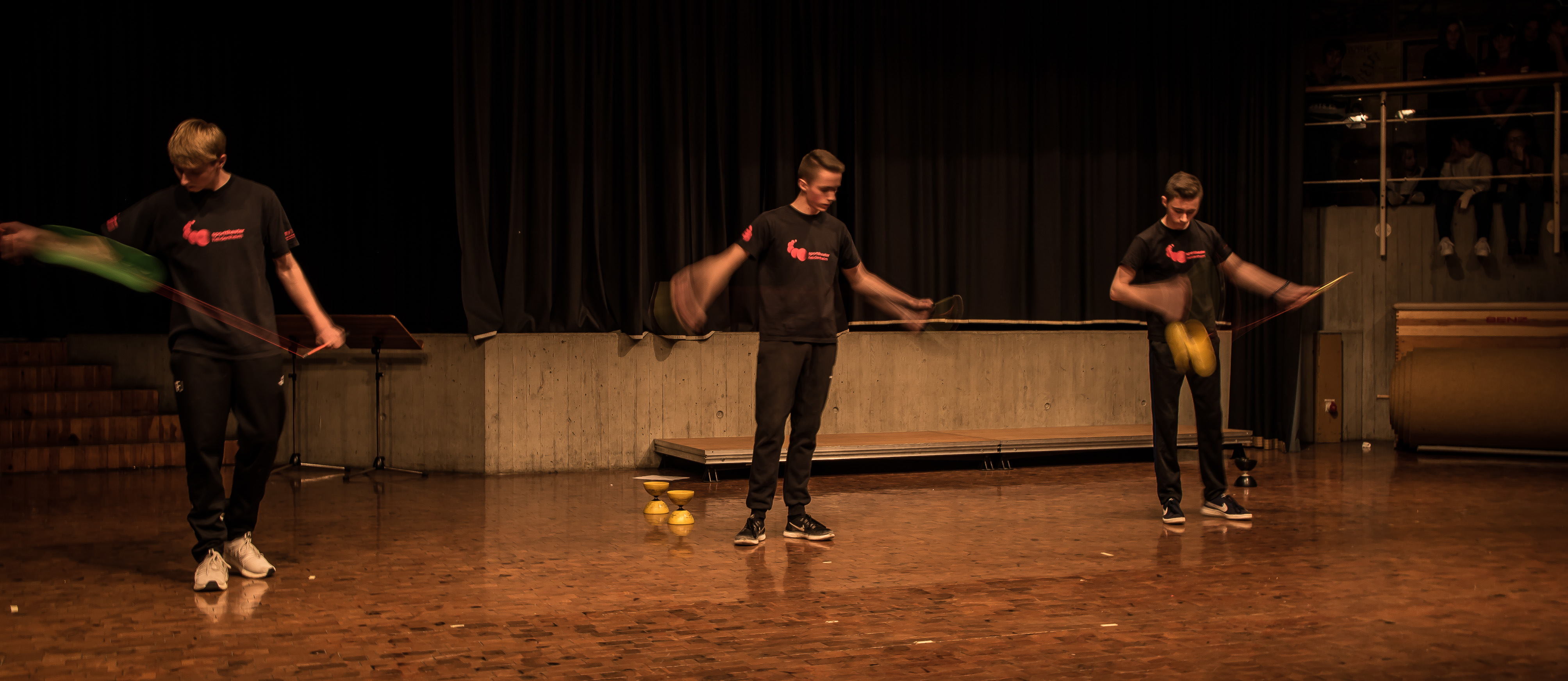 Nach der guten Bewirtung durch Vertreter der achten Klassen wurde der Abend schwungvoll fortgesetzt. Songwriterin Anna Hank, die nicht zum ersten Mal einen selbst geschriebenen Titel vortrug, schaffte es umgehend, die Zurückgekehrten mit "Musizieren" und ihrer authentischen Art einzunehmen. Sie verriet dem Publikum im Interview mit Moderator Fabian Flinner dann auch, wie manchmal Songs entstehen. Es folgte der zweite Auftritt der Sportakrobatinnen Kira Lorenz, Inka Lämmlein, Emma Spack und Nelly Stoltz an Ringen, die man eher vom Hoola-Hoop kennt, wo teils spektakuläre Figuren und Balancefähigkeiten zu sehen waren. Im Anschluss daran zeigte Julian Törke mit einem Poetry-Slam, dass er nicht nur schauspielerisches, sondern auch poetisches Talent besitzt. Die in seinem Text angesprochenen "Minuten in Echtzeit" standen dabei aber im klaren Gegensatz zu dem kurzweiligen Programm, das mit dem virtuosen Vortrag am Flügel von Aylina Ashkenov und den Diabolo-Künstlern Florian Jäger und den Zwillingen Max und Paul Weiß, die ihr Können ebenfalls beim Heidenheimer Sporttheater regelmäßig an neue Grenzen führen und eine tolle Choreographie einstudiert hatten, fortgesetzt wurde. Benjamin Hoster (Gitarre) und Emily Mundt sorgten mit dem gefühlvoll vorgetragenen Titel "Let her go" von Passenger für einen Gänsehautmoment. Dass Sport, Musik und Tanz ganz eng beieinander liegen, konnte man am präzis vorgetragenen Auftritt der Hip-Hop-Tänzerinnen Milena Krieger, Selin Musinoglu, Linda Opitz sowie Alexandra Slavinschi sehen. Der letzte Solo-Auftritt war Tobias Schied mit seiner Tuba vorbehalten, der einmal mehr mit einem Augenzwinkern unterschiedliche Facetten seines Instrumentes demonstrierte. Vor der Verabschiedung und dem Dank an alle Mitwirkenden wusste am Ende des viel zu schnell vorübergegangenen Abends der Große Chor unter Leitung von Tina Greulich und Julia Strasser am Flügel mit dem Titel "This is me" stimmlich zu überzeugen.