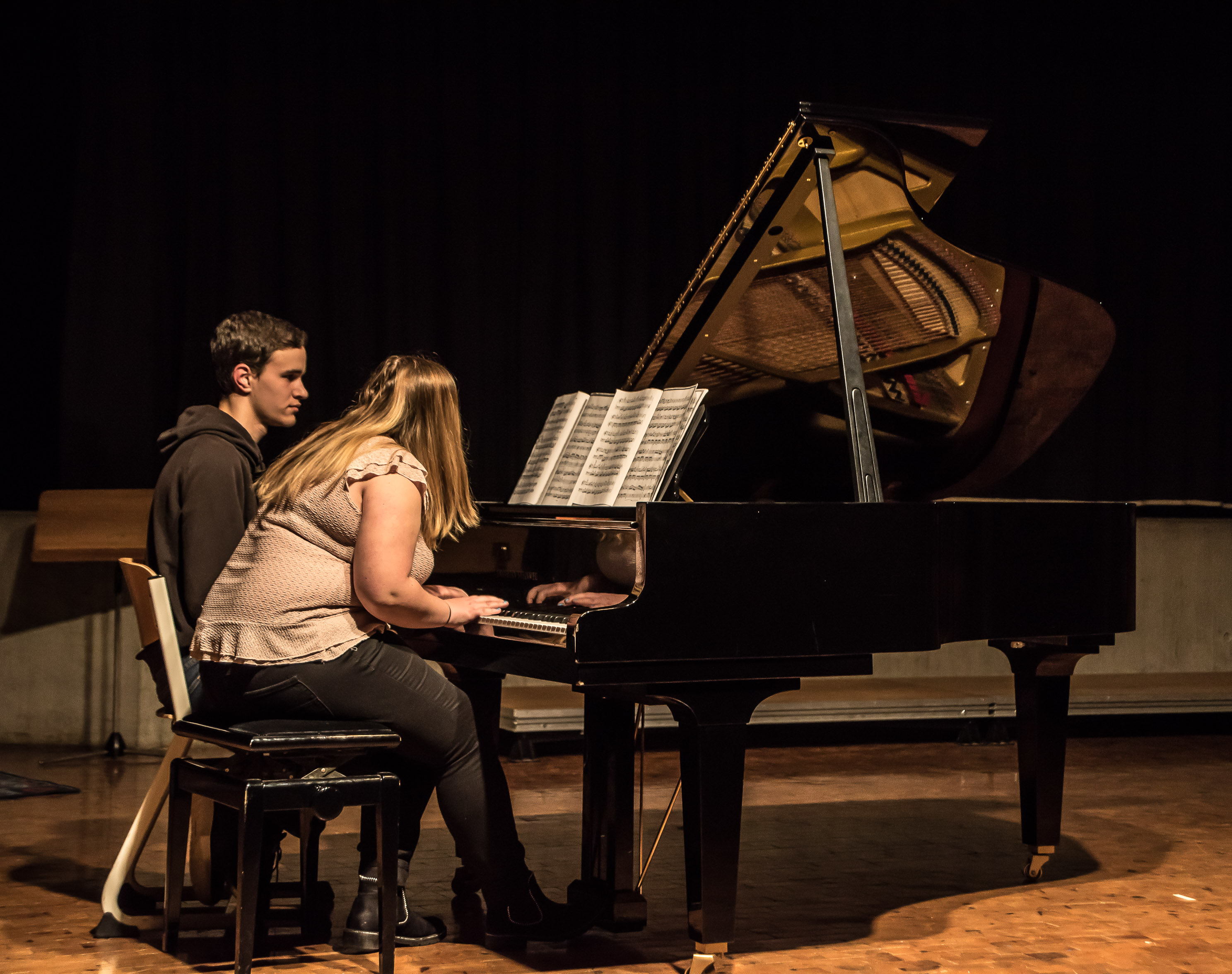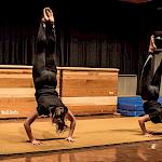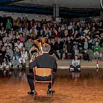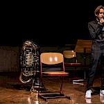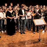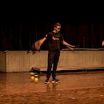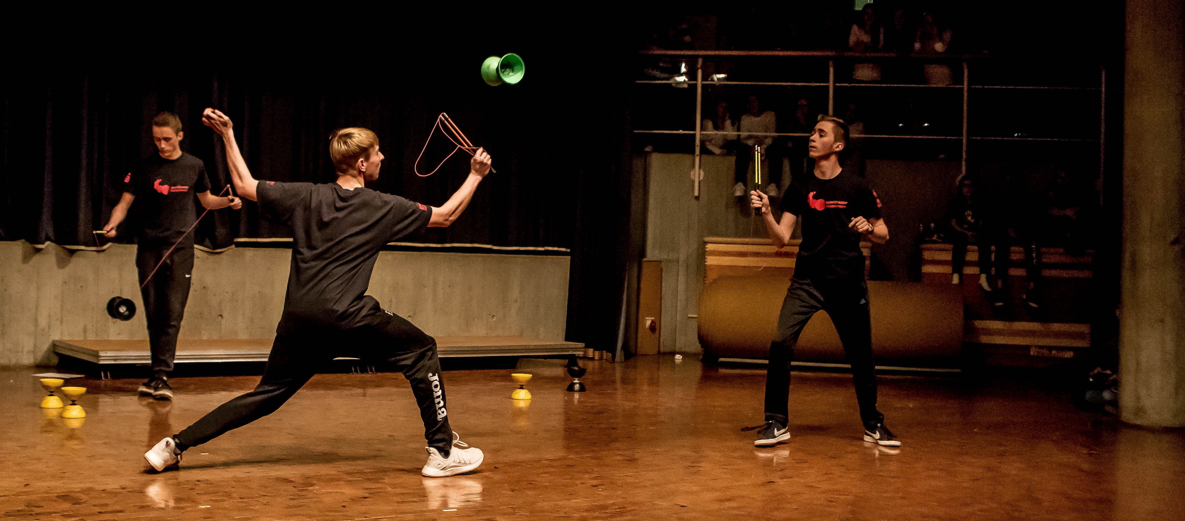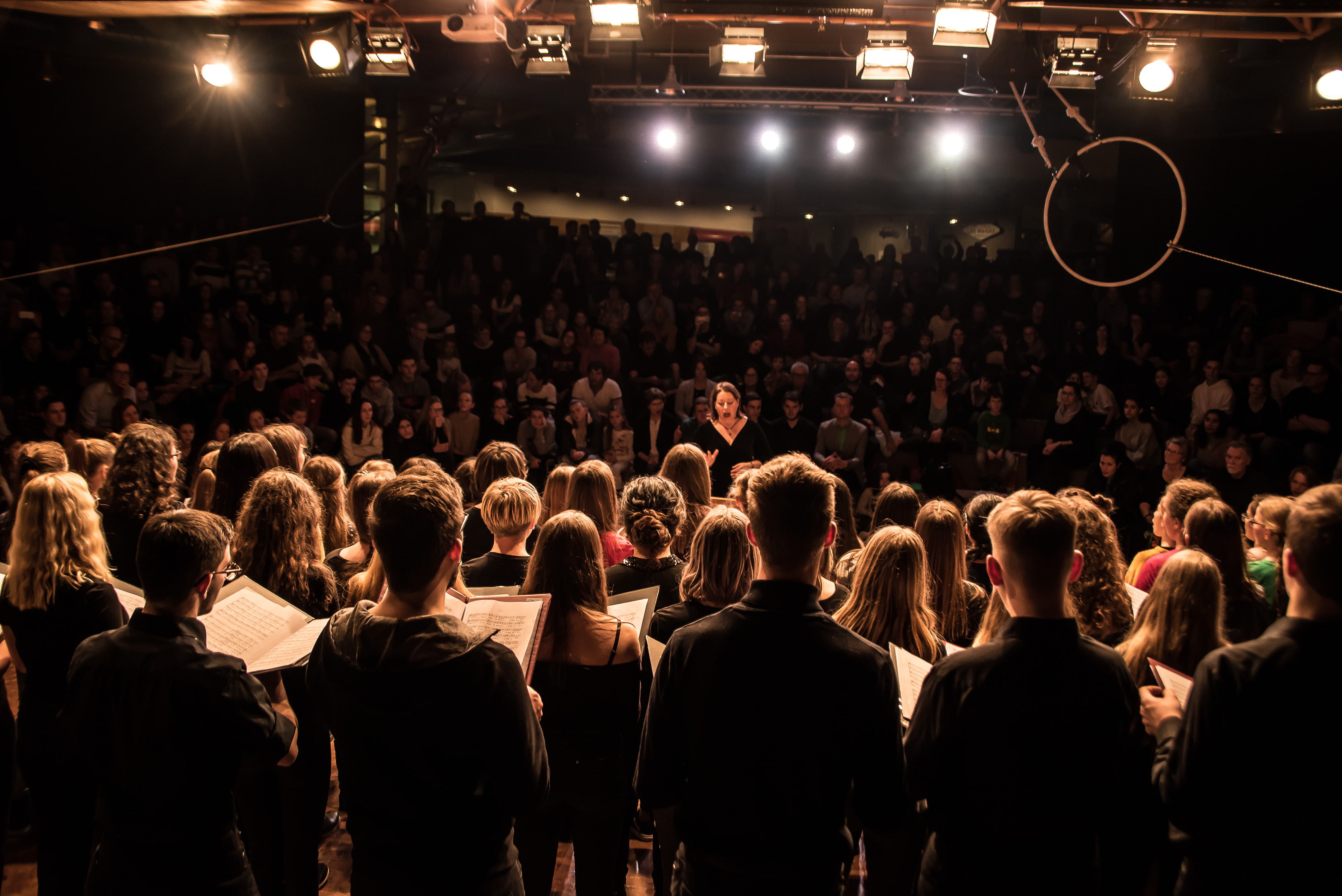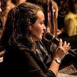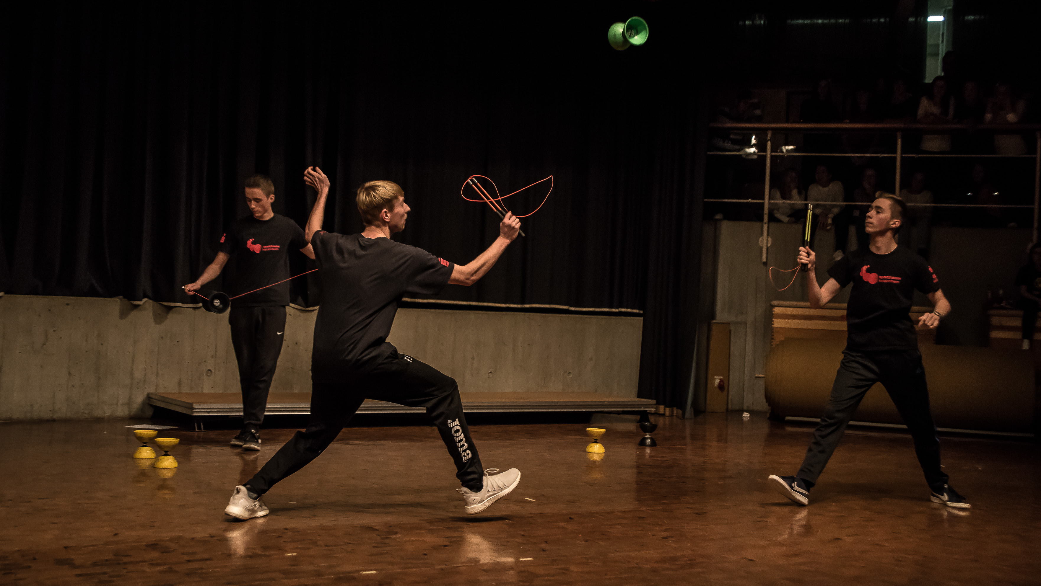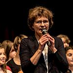 Nach der guten Bewirtung durch Vertreter der achten Klassen wurde der Abend schwungvoll fortgesetzt. Songwriterin Anna Hank, die nicht zum ersten Mal einen selbst geschriebenen Titel vortrug, schaffte es umgehend, die Zurückgekehrten mit "Musizieren" und ihrer authentischen Art einzunehmen. Sie verriet dem Publikum im Interview mit Moderator Fabian Flinner dann auch, wie manchmal Songs entstehen. Es folgte der zweite Auftritt der Sportakrobatinnen Kira Lorenz, Inka Lämmlein, Emma Spack und Nelly Stoltz an Ringen, die man eher vom Hoola-Hoop kennt, wo teils spektakuläre Figuren und Balancefähigkeiten zu sehen waren. Im Anschluss daran zeigte Julian Törke mit einem Poetry-Slam, dass er nicht nur schauspielerisches, sondern auch poetisches Talent besitzt. Die in seinem Text angesprochenen "Minuten in Echtzeit" standen dabei aber im klaren Gegensatz zu dem kurzweiligen Programm, das mit dem virtuosen Vortrag am Flügel von Aylina Ashkenov und den Diabolo-Künstlern Florian Jäger und den Zwillingen Max und Paul Weiß, die ihr Können ebenfalls beim Heidenheimer Sporttheater regelmäßig an neue Grenzen führen und eine tolle Choreographie einstudiert hatten, fortgesetzt wurde. Benjamin Hoster (Gitarre) und Emily Mundt sorgten mit dem gefühlvoll vorgetragenen Titel "Let her go" von Passenger für einen Gänsehautmoment. Dass Sport, Musik und Tanz ganz eng beieinander liegen, konnte man am präzis vorgetragenen Auftritt der Hip-Hop-Tänzerinnen Milena Krieger, Selin Musinoglu, Linda Opitz sowie Alexandra Slavinschi sehen. Der letzte Solo-Auftritt war Tobias Schied mit seiner Tuba vorbehalten, der einmal mehr mit einem Augenzwinkern unterschiedliche Facetten seines Instrumentes demonstrierte. Vor der Verabschiedung und dem Dank an alle Mitwirkenden wusste am Ende des viel zu schnell vorübergegangenen Abends der Große Chor unter Leitung von Tina Greulich und Julia Strasser am Flügel mit dem Titel "This is me" stimmlich zu überzeugen.