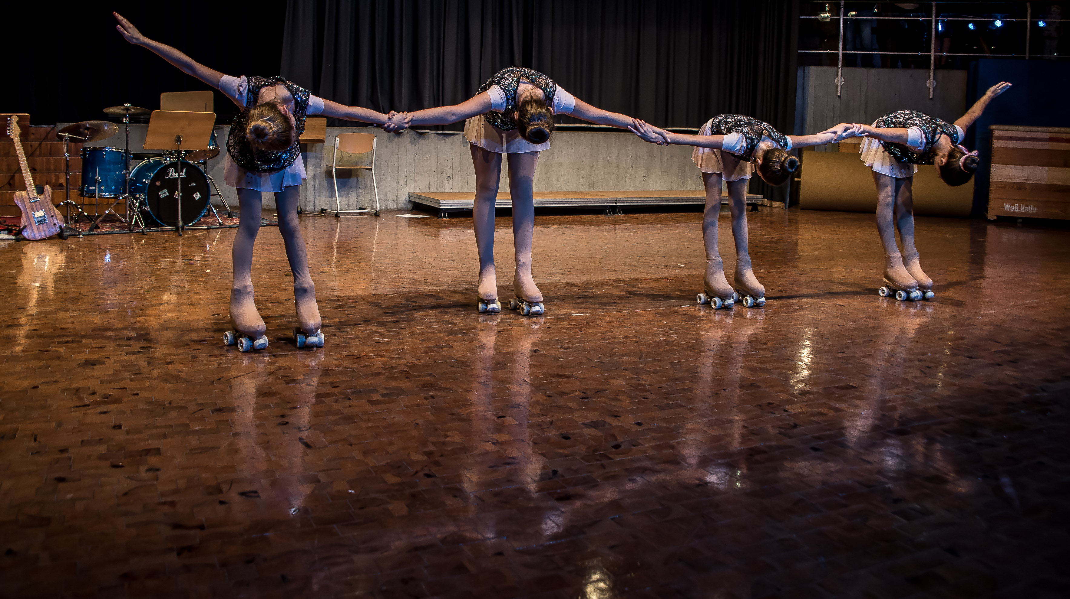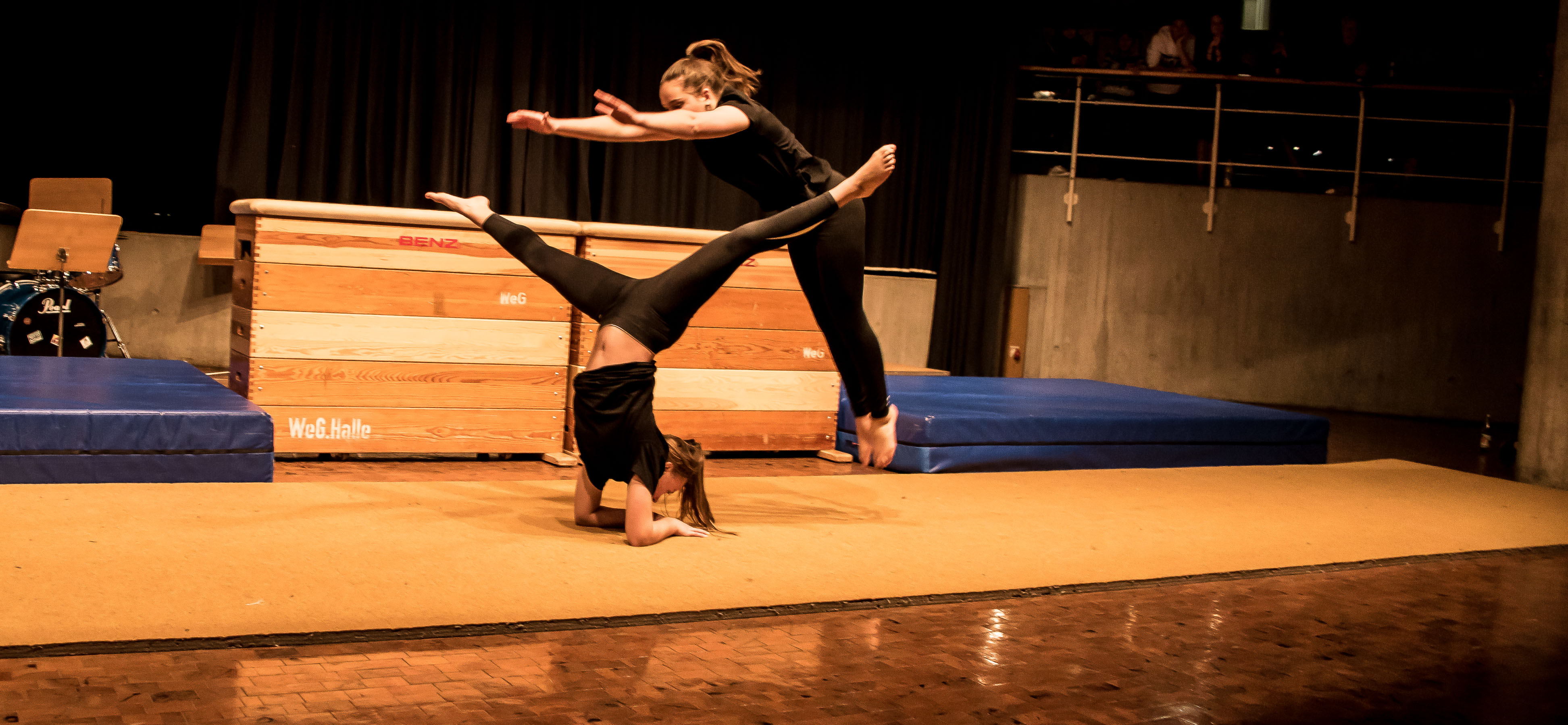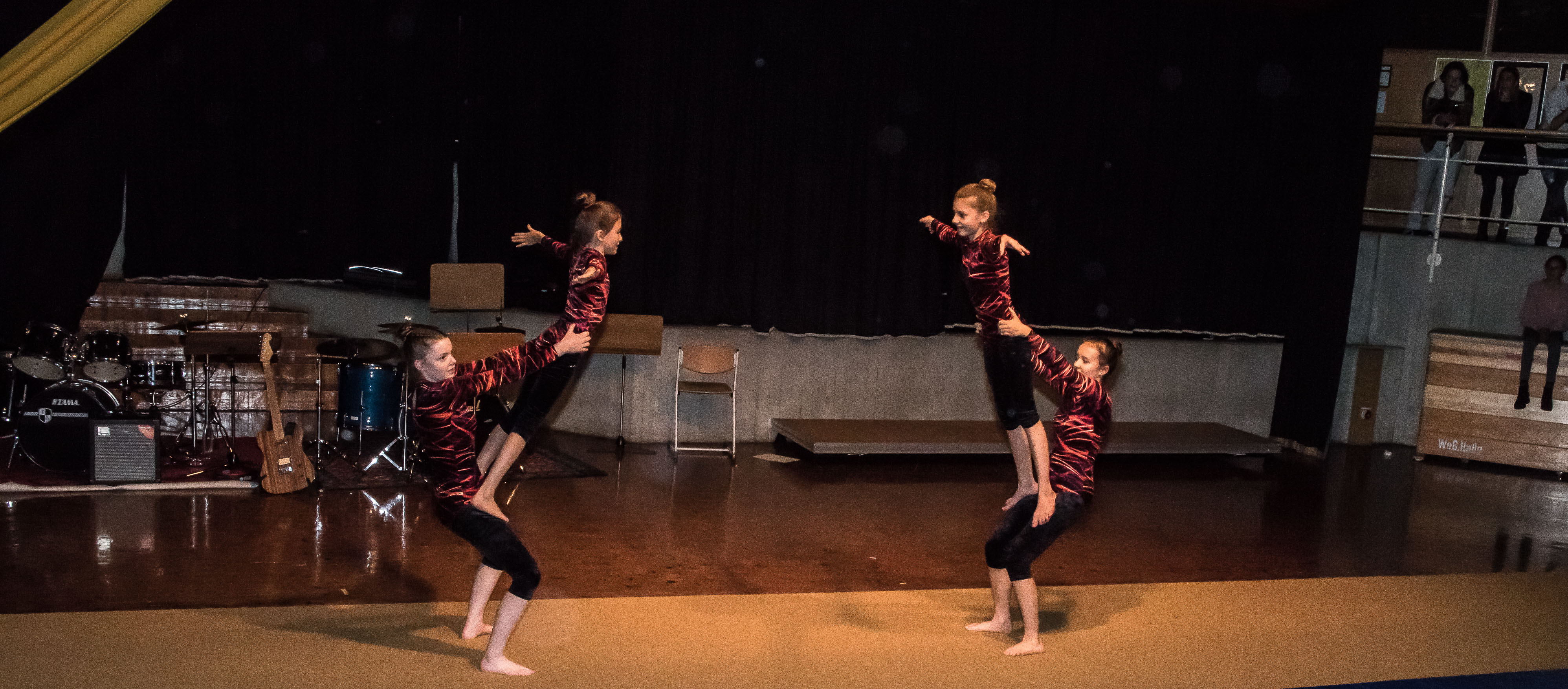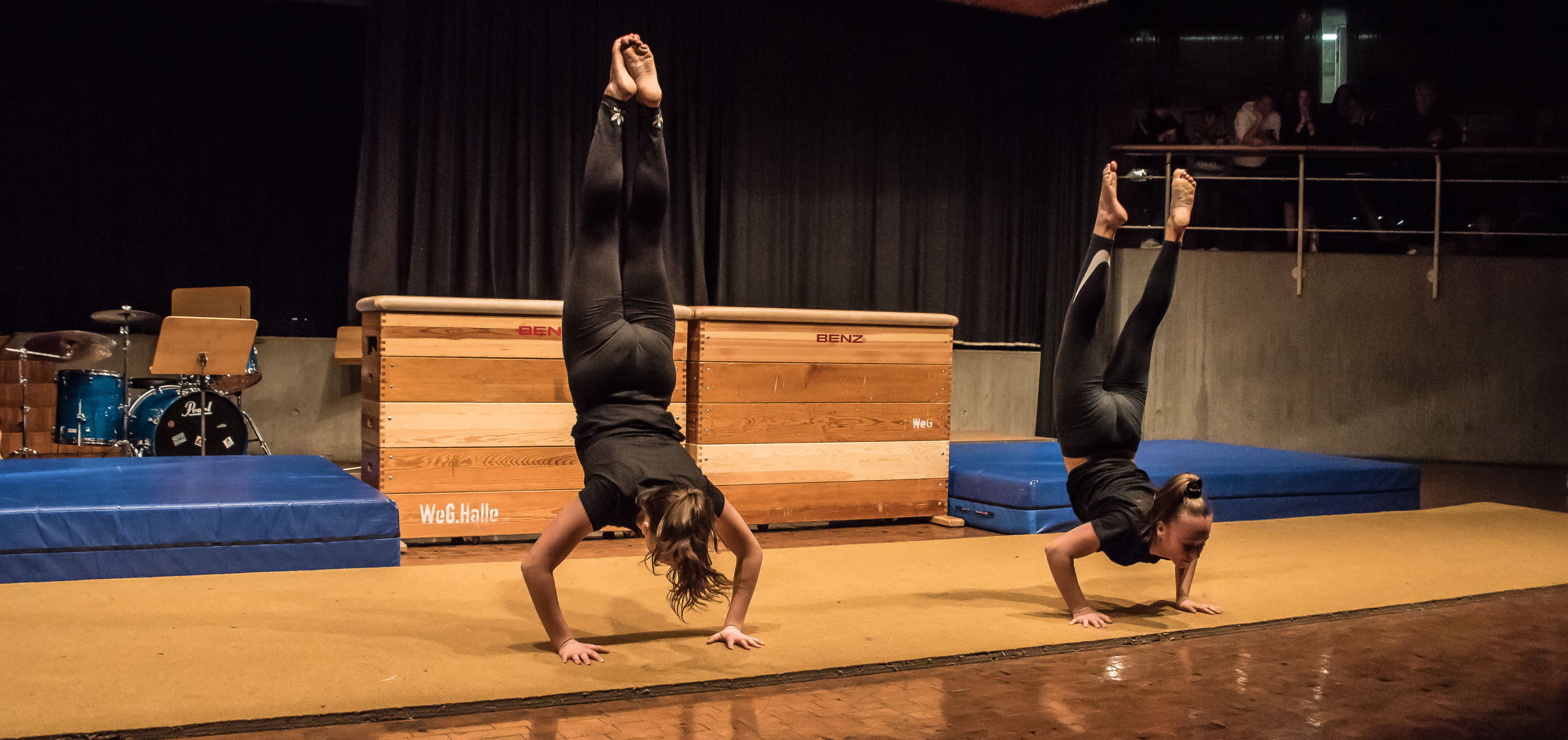 Den Auftakt zum sportlich-akrobatischen Teil des Abends machte die Rollschuh-Gruppe der 6c mit Jennifer Grimm, Zuleijka Fispan, Louisa Eisenmann und Sophie Brück, die ihr Können auf dem Parkett zeigten. In der ersten Hälfte des Programms wechselten sich dann musikalische Beiträge von Emily Brehm am Flügel mit einer Einlage aus der Rhythmischen Sportgymnastik von Emily Leitner und Aline Grohmann aus der 5c genauso ab, wie der humorvoll gestaltete Auftritt der Ukulele-AG von Frau Rickert mit der souverän dargebotenen Turnshow von Amy Klaric und Sophie Ebel aus Klassenstufe 8, die von Frau Westfahl unterstützt wurden.