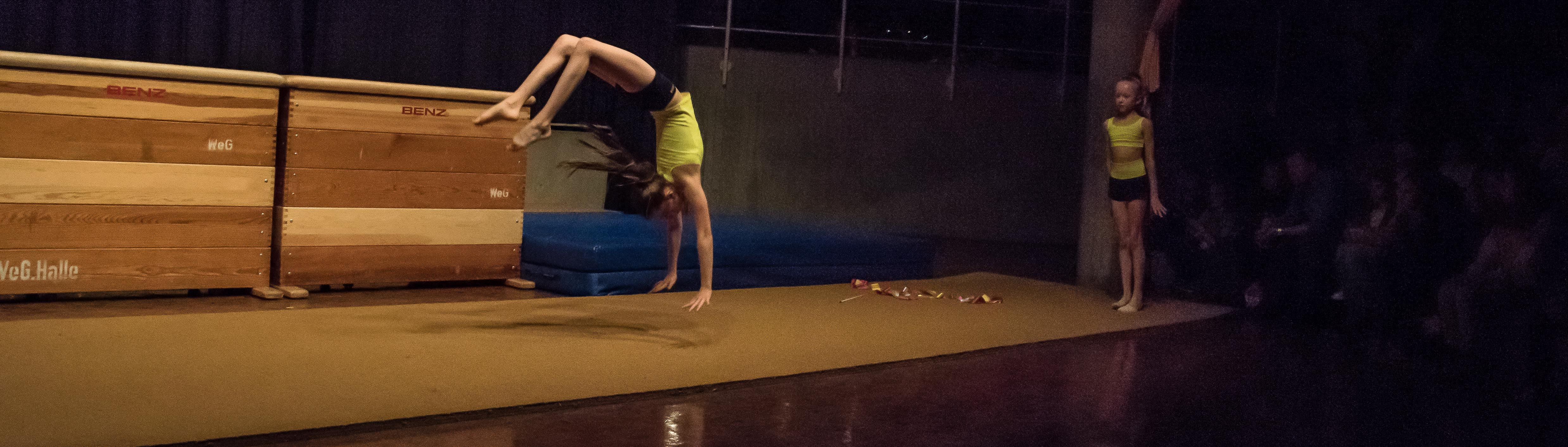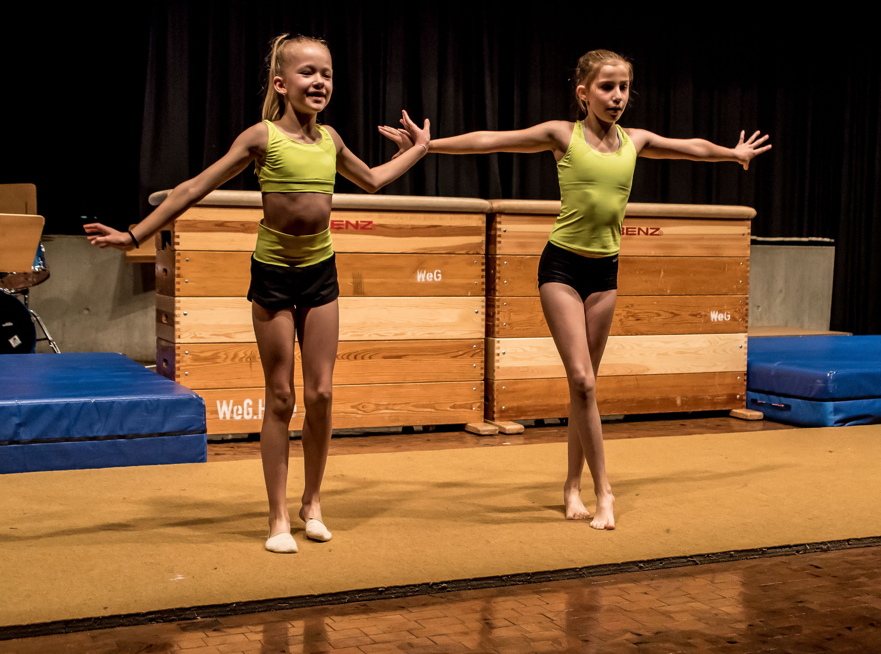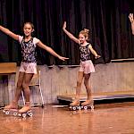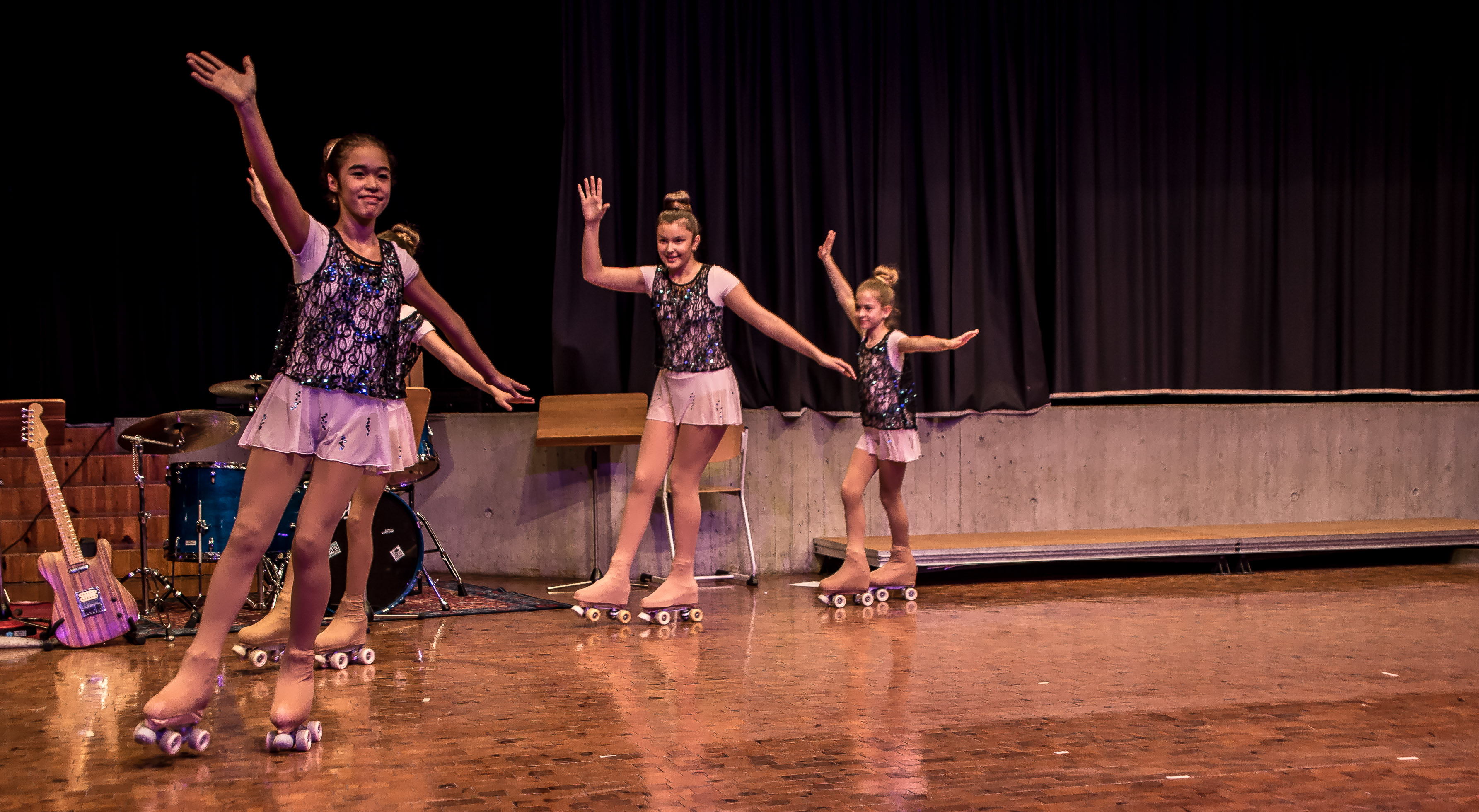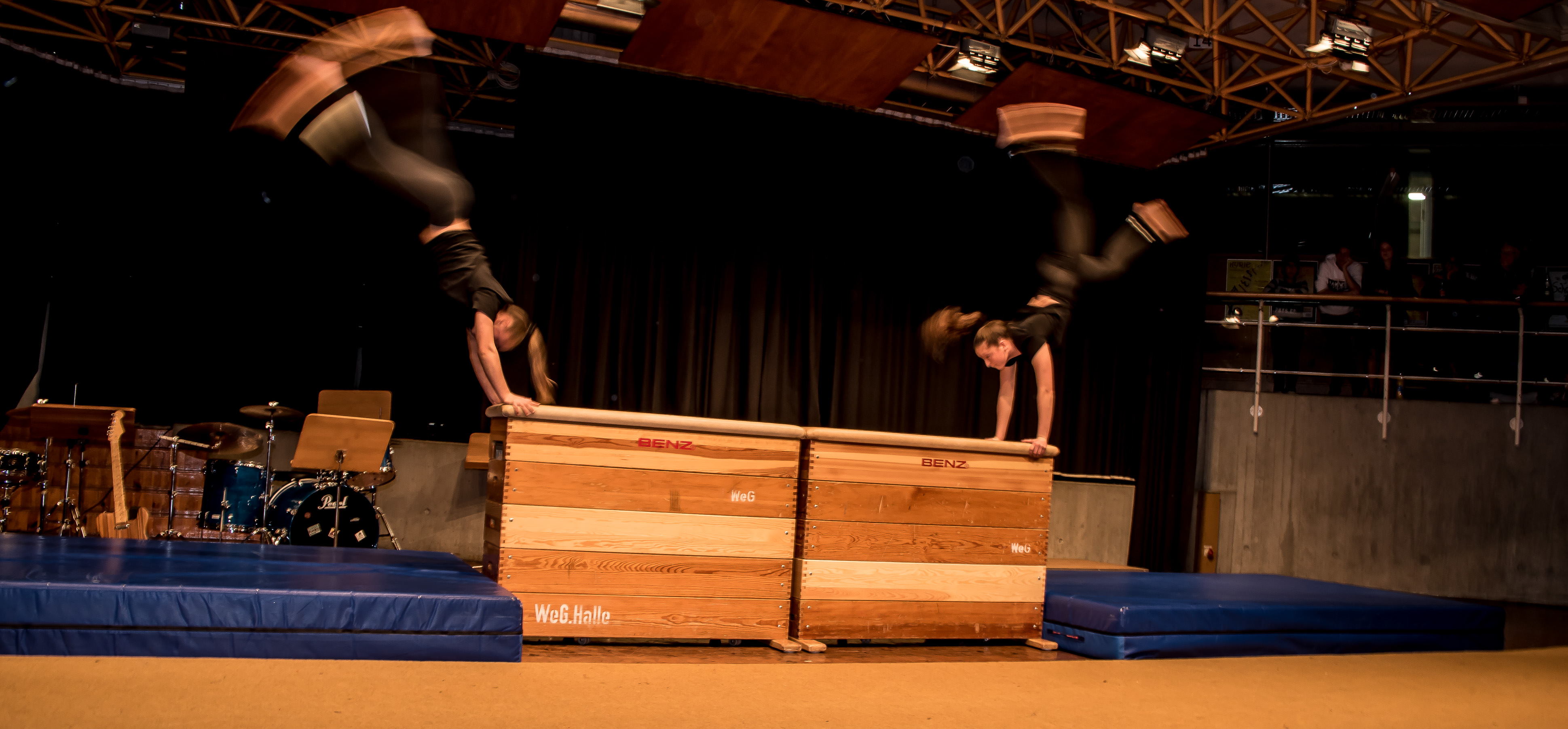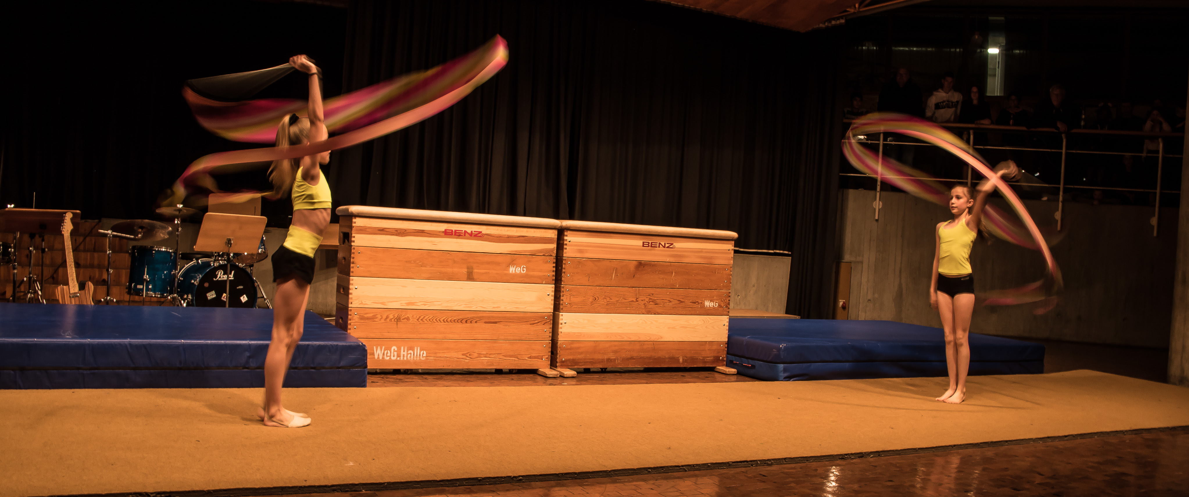 Den Auftakt zum sportlich-akrobatischen Teil des Abends machte die Rollschuh-Gruppe der 6c mit Jennifer Grimm, Zuleijka Fispan, Louisa Eisenmann und Sophie Brück, die ihr Können auf dem Parkett zeigten. In der ersten Hälfte des Programms wechselten sich dann musikalische Beiträge von Emily Brehm am Flügel mit einer Einlage aus der Rhythmischen Sportgymnastik von Emily Leitner und Aline Grohmann aus der 5c genauso ab, wie der humorvoll gestaltete Auftritt der Ukulele-AG von Frau Rickert mit der souverän dargebotenen Turnshow von Amy Klaric und Sophie Ebel aus Klassenstufe 8, die von Frau Westfahl unterstützt wurden.