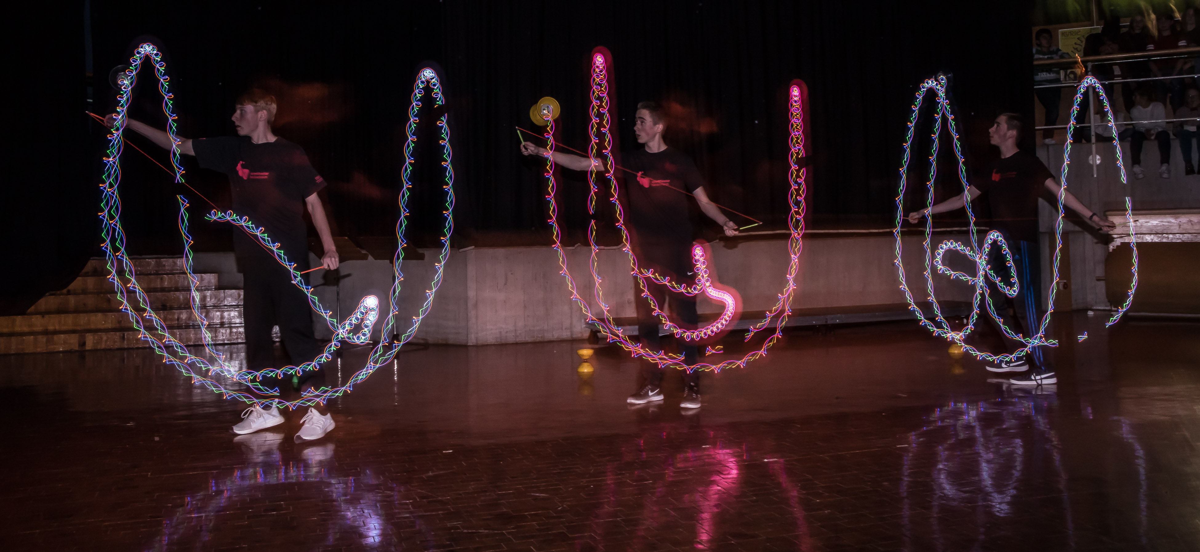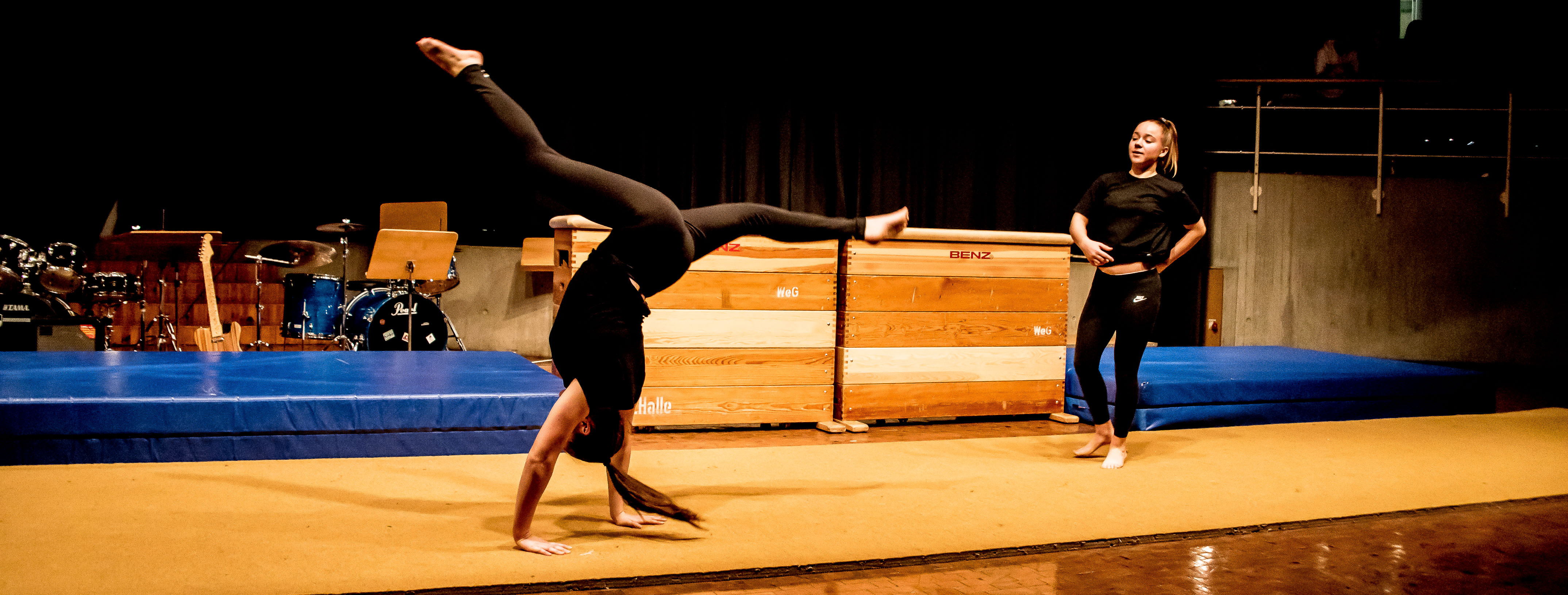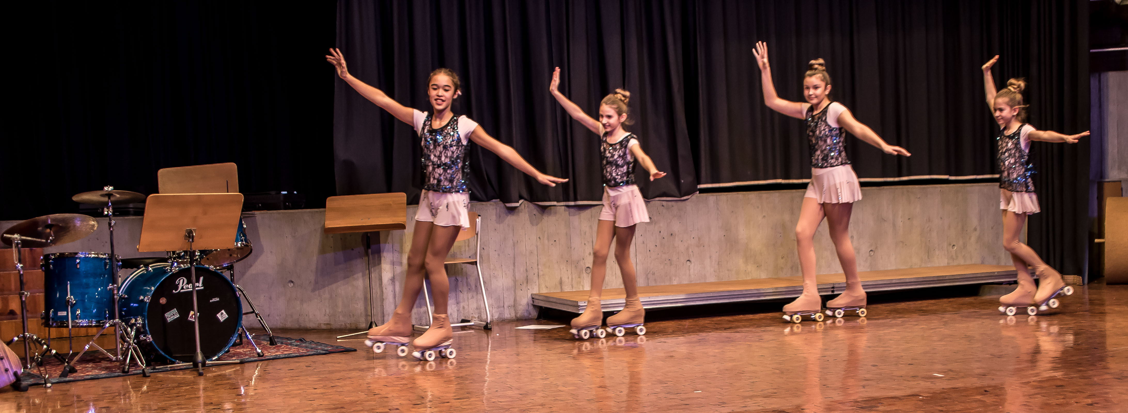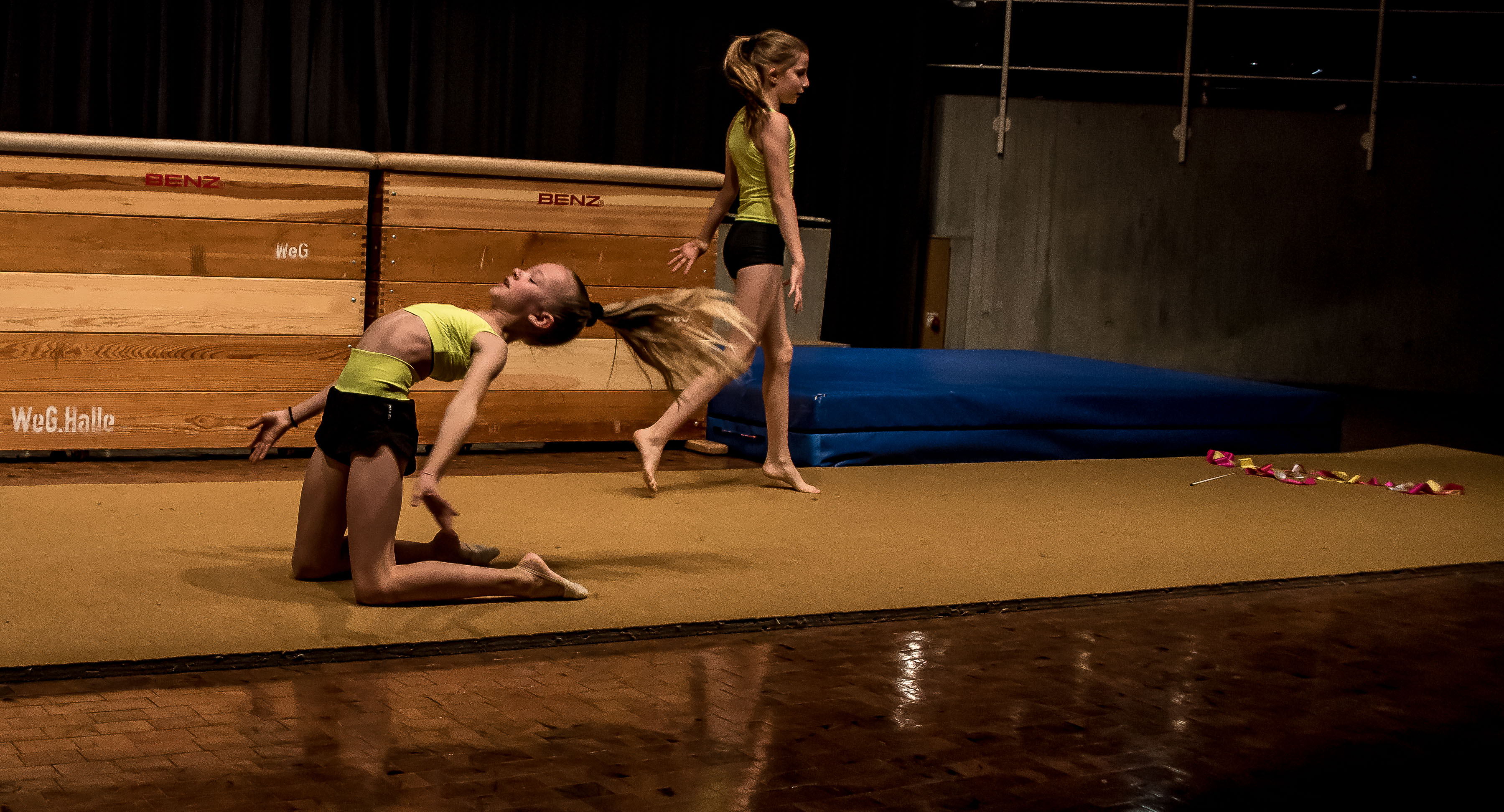 Den Auftakt zum sportlich-akrobatischen Teil des Abends machte die Rollschuh-Gruppe der 6c mit Jennifer Grimm, Zuleijka Fispan, Louisa Eisenmann und Sophie Brück, die ihr Können auf dem Parkett zeigten. In der ersten Hälfte des Programms wechselten sich dann musikalische Beiträge von Emily Brehm am Flügel mit einer Einlage aus der Rhythmischen Sportgymnastik von Emily Leitner und Aline Grohmann aus der 5c genauso ab, wie der humorvoll gestaltete Auftritt der Ukulele-AG von Frau Rickert mit der souverän dargebotenen Turnshow von Amy Klaric und Sophie Ebel aus Klassenstufe 8, die von Frau Westfahl unterstützt wurden.