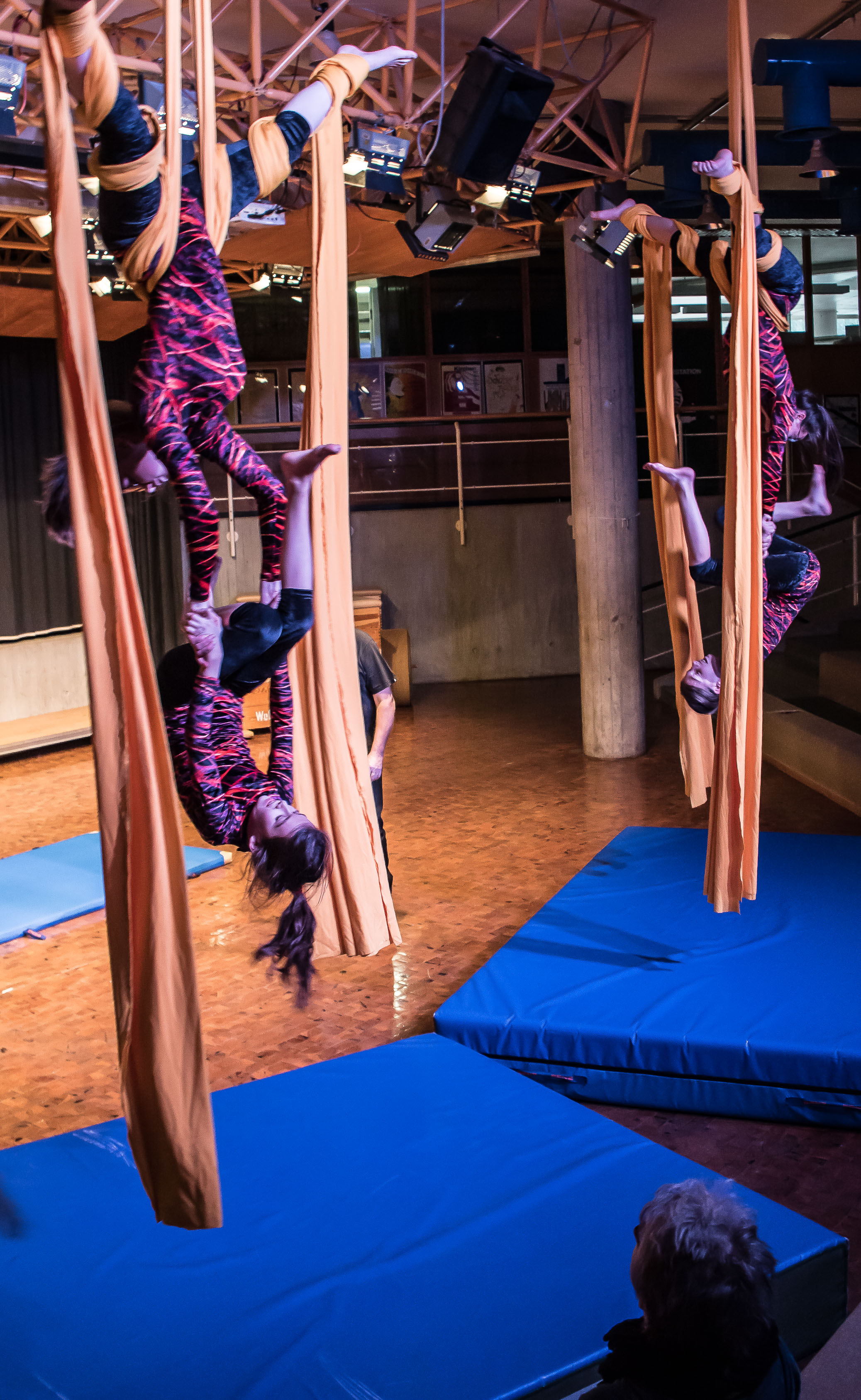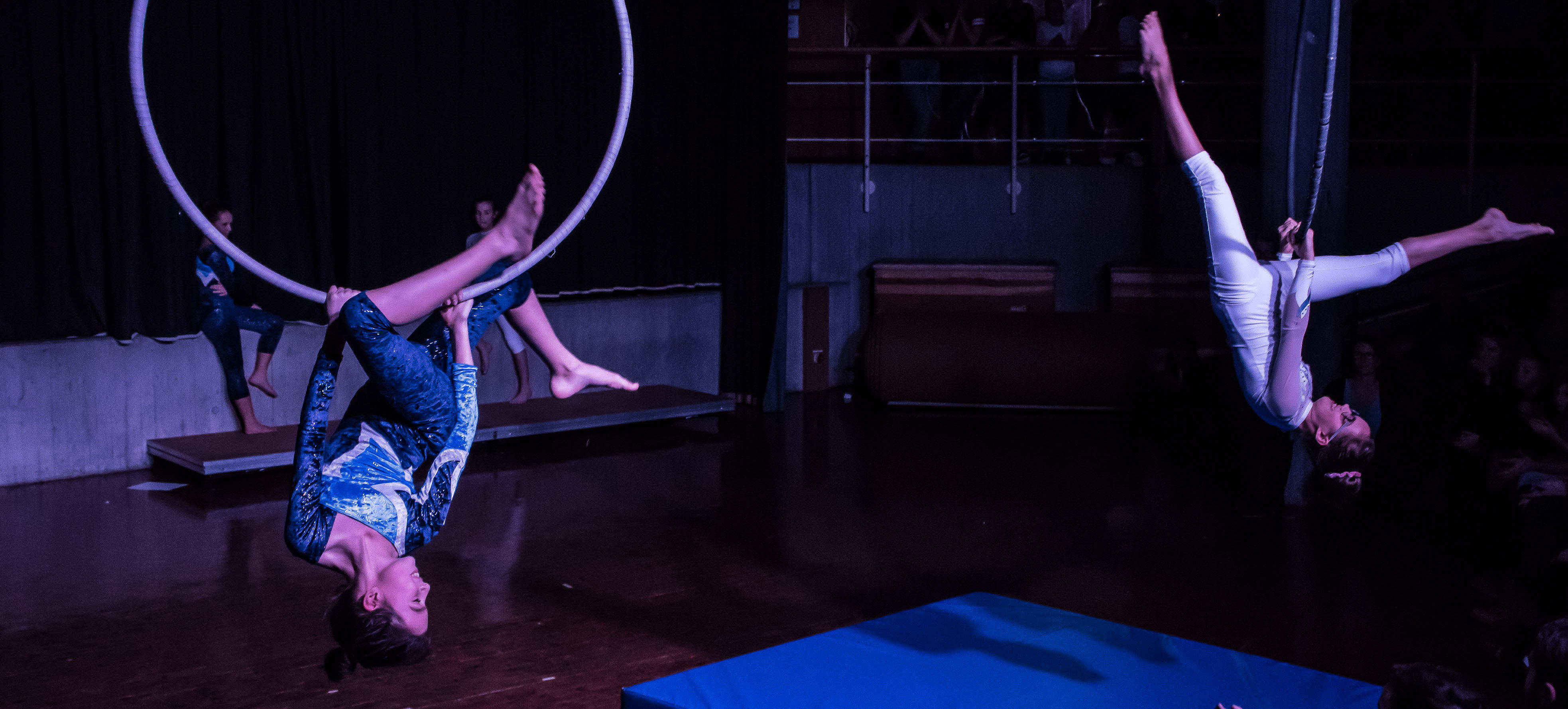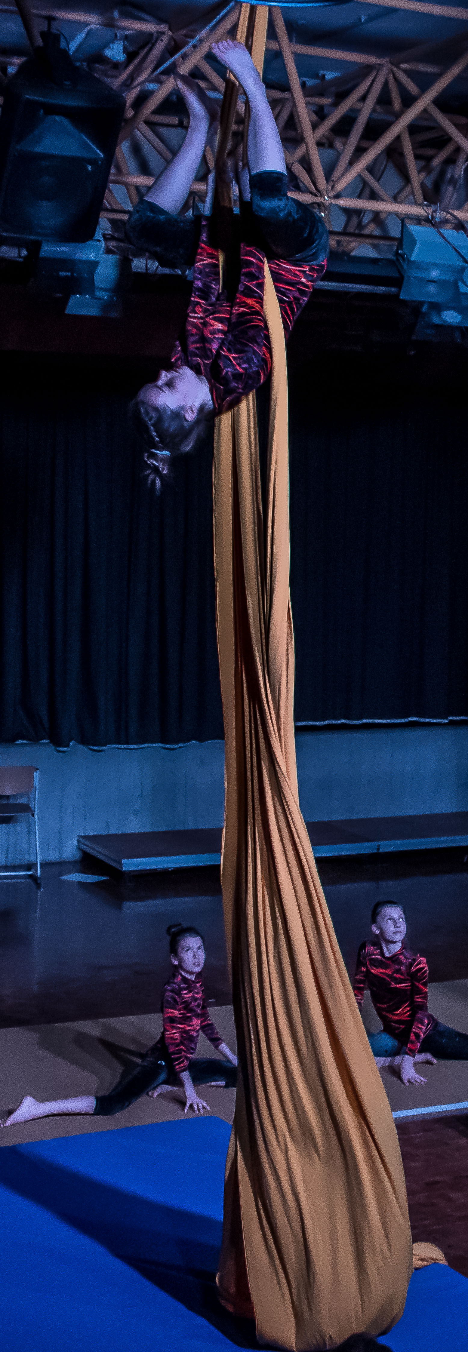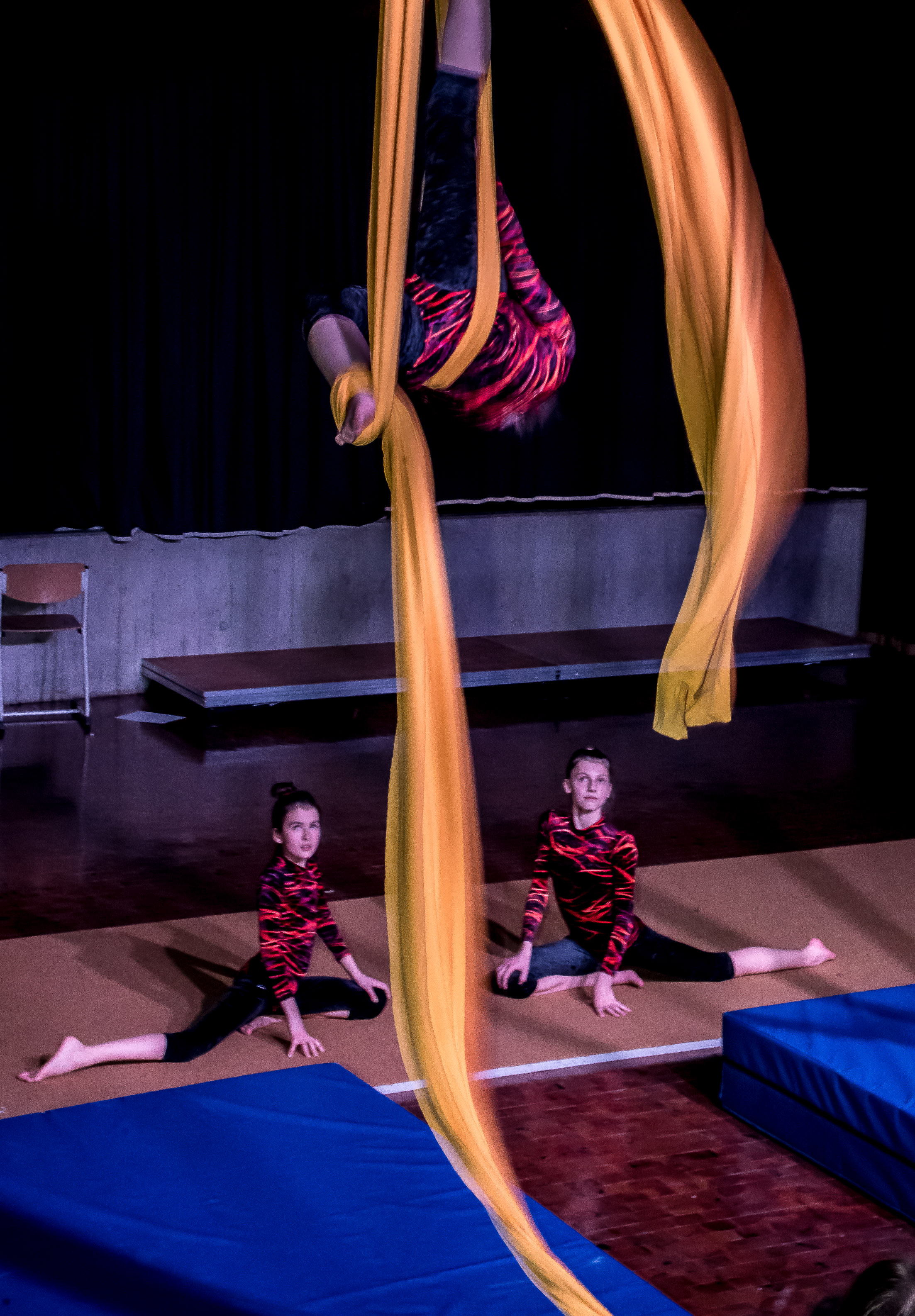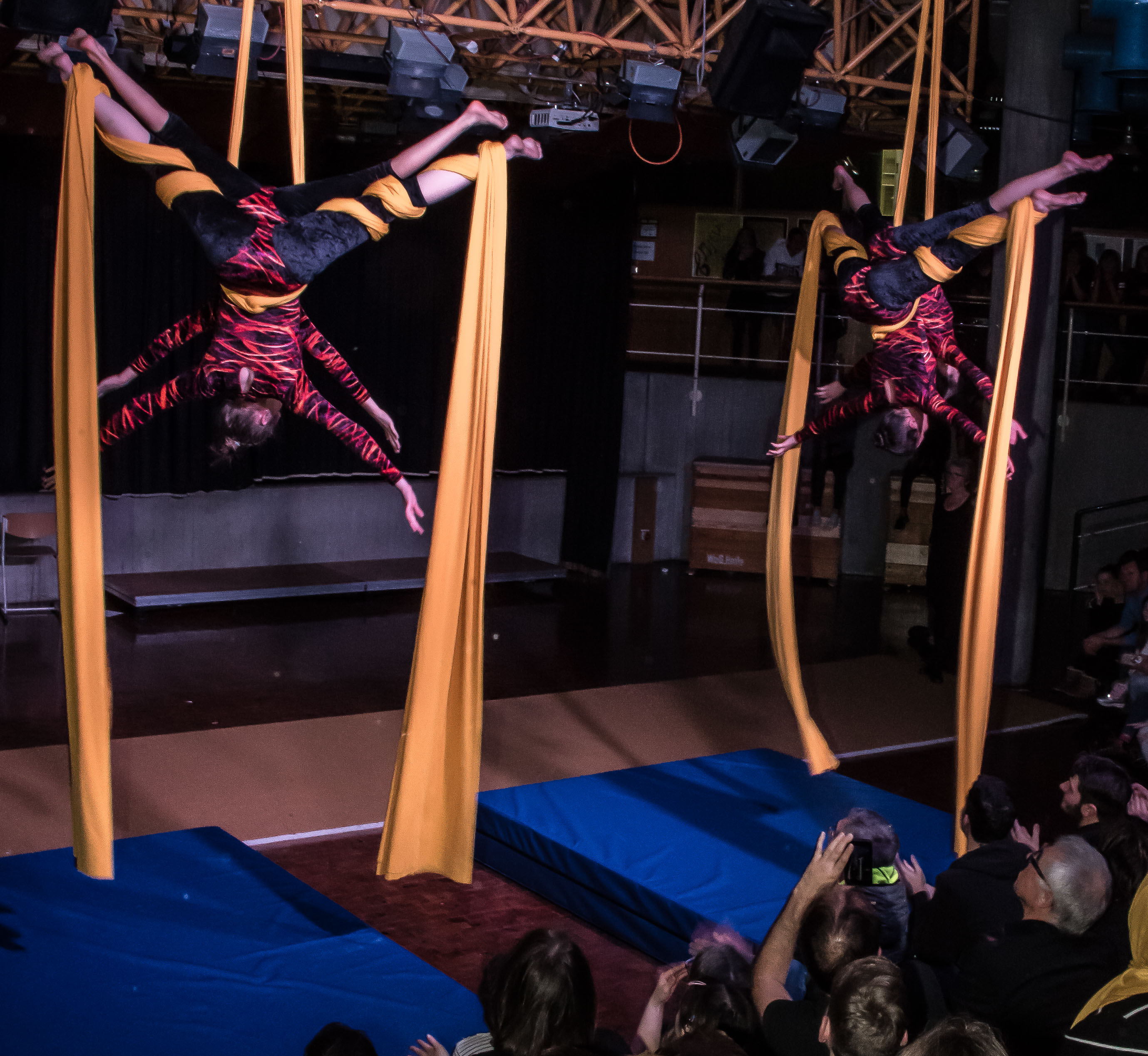 Eindrucksvoller Abschluss der ersten Programmhälfte war schließlich die Akrobatiknummer an den Vertikaltüchern, die Ronja Lämmlein, Nelly Stoltz und die Geschwister Hanna und Eva Tilscher in Kooperation mit dem Sporttheater Heidenheim unter Leitung von Familie Hensolt präsentierten.