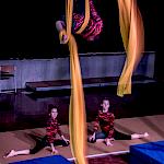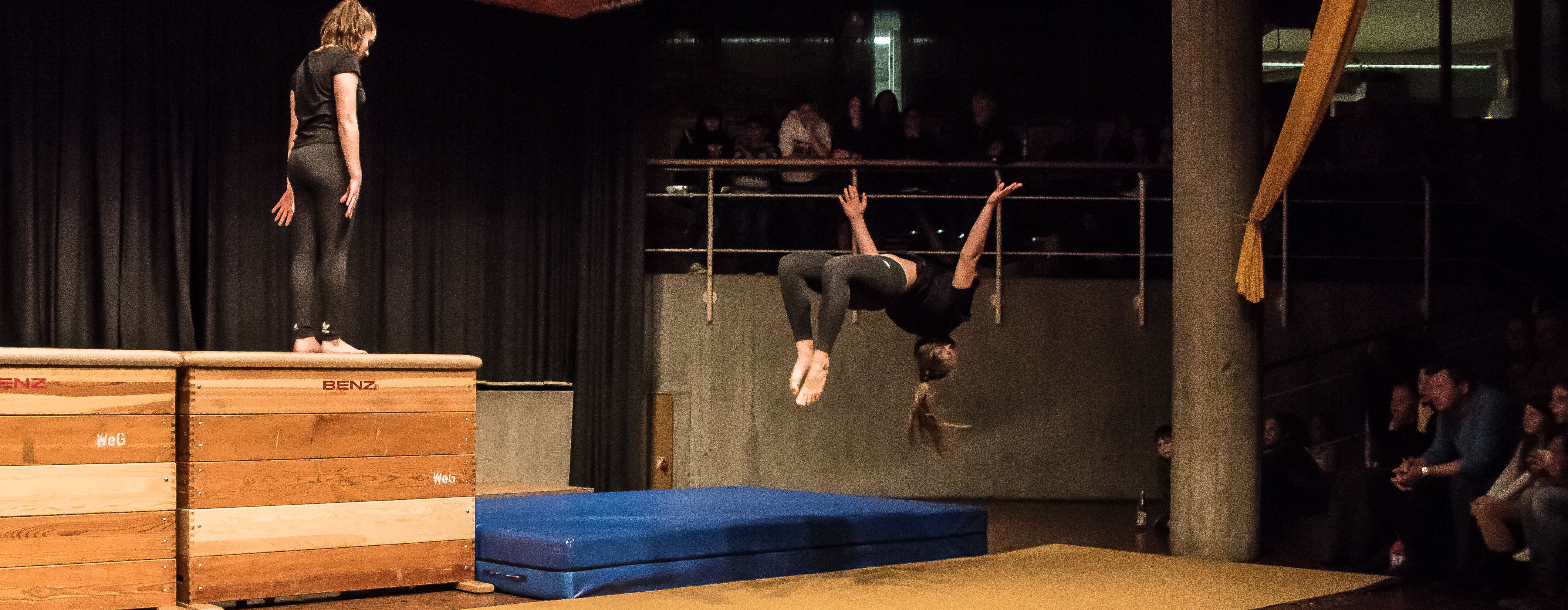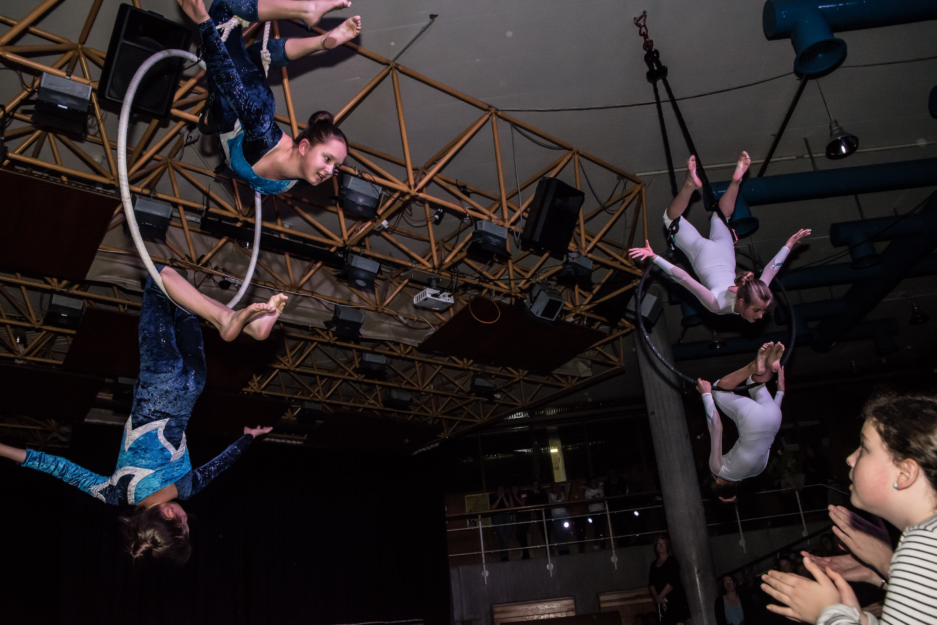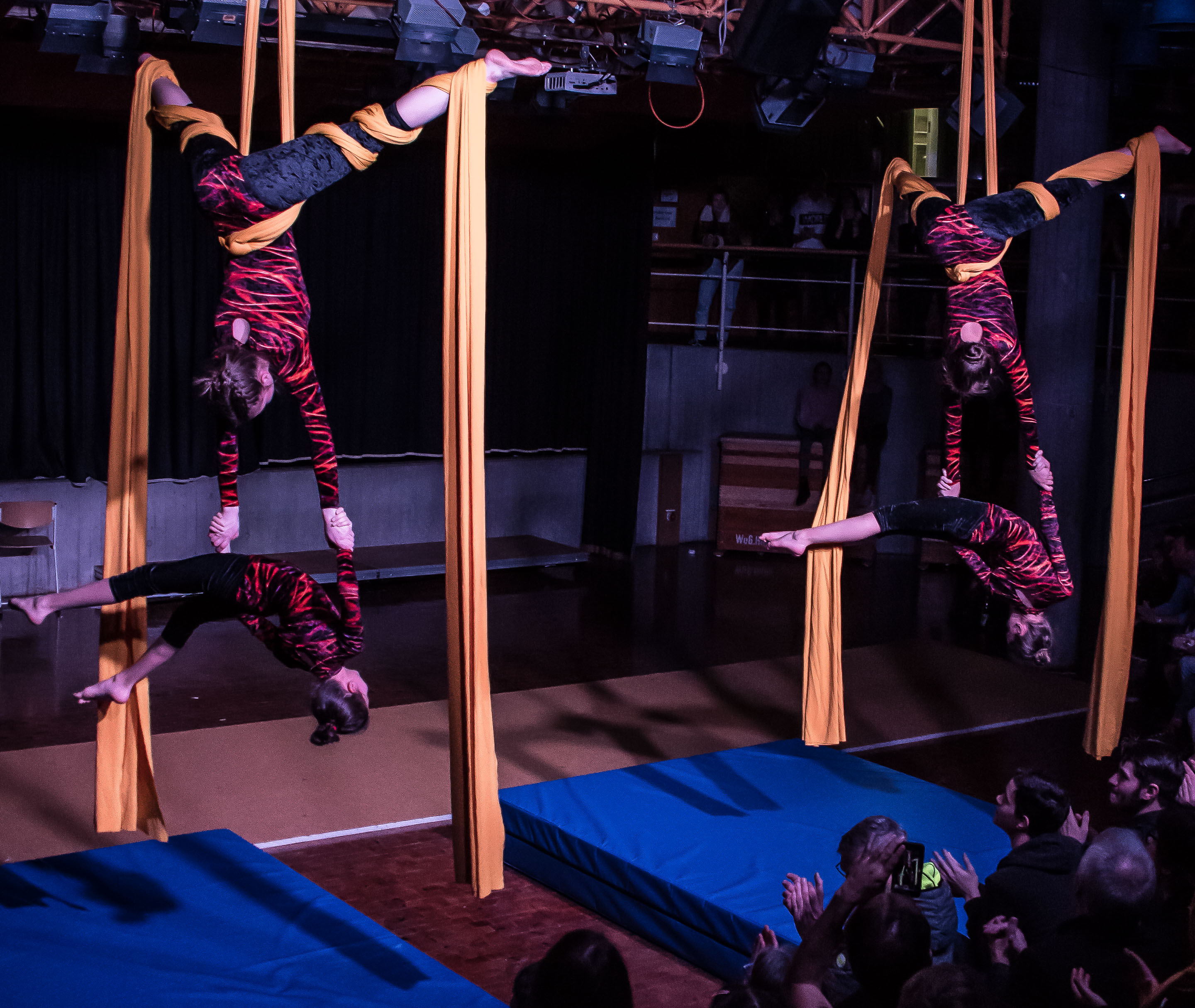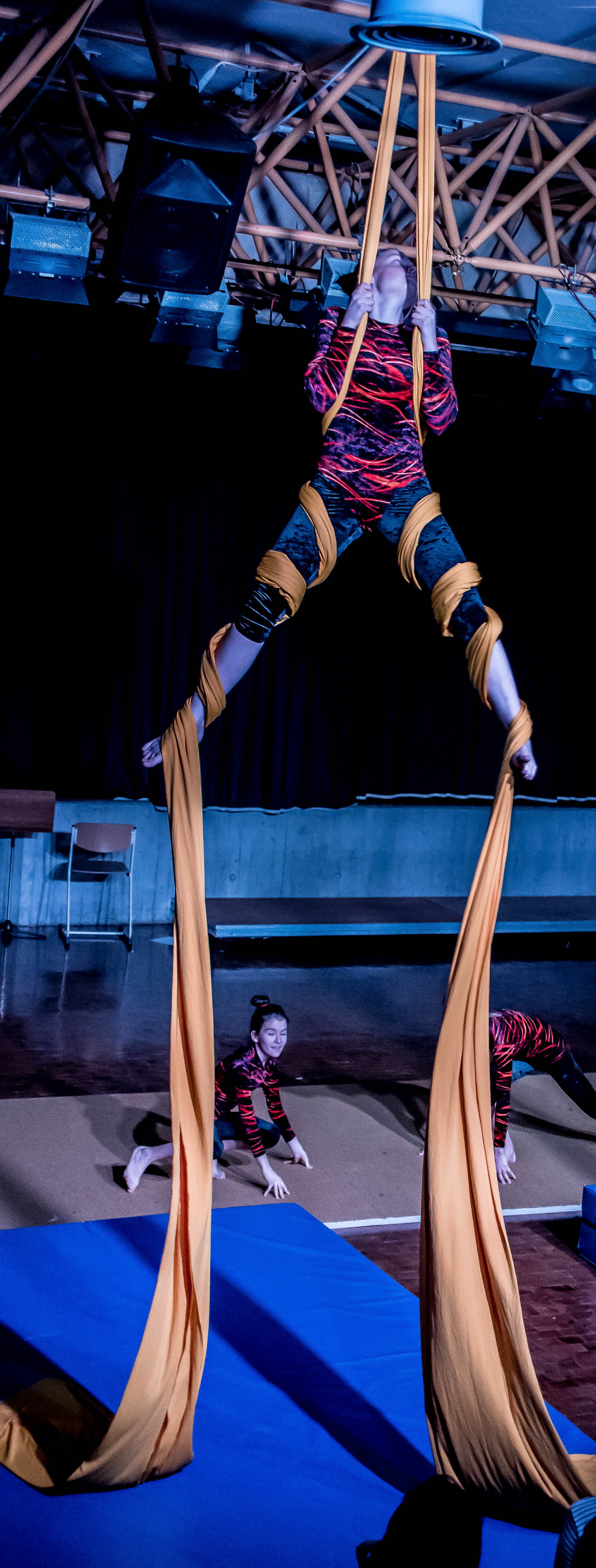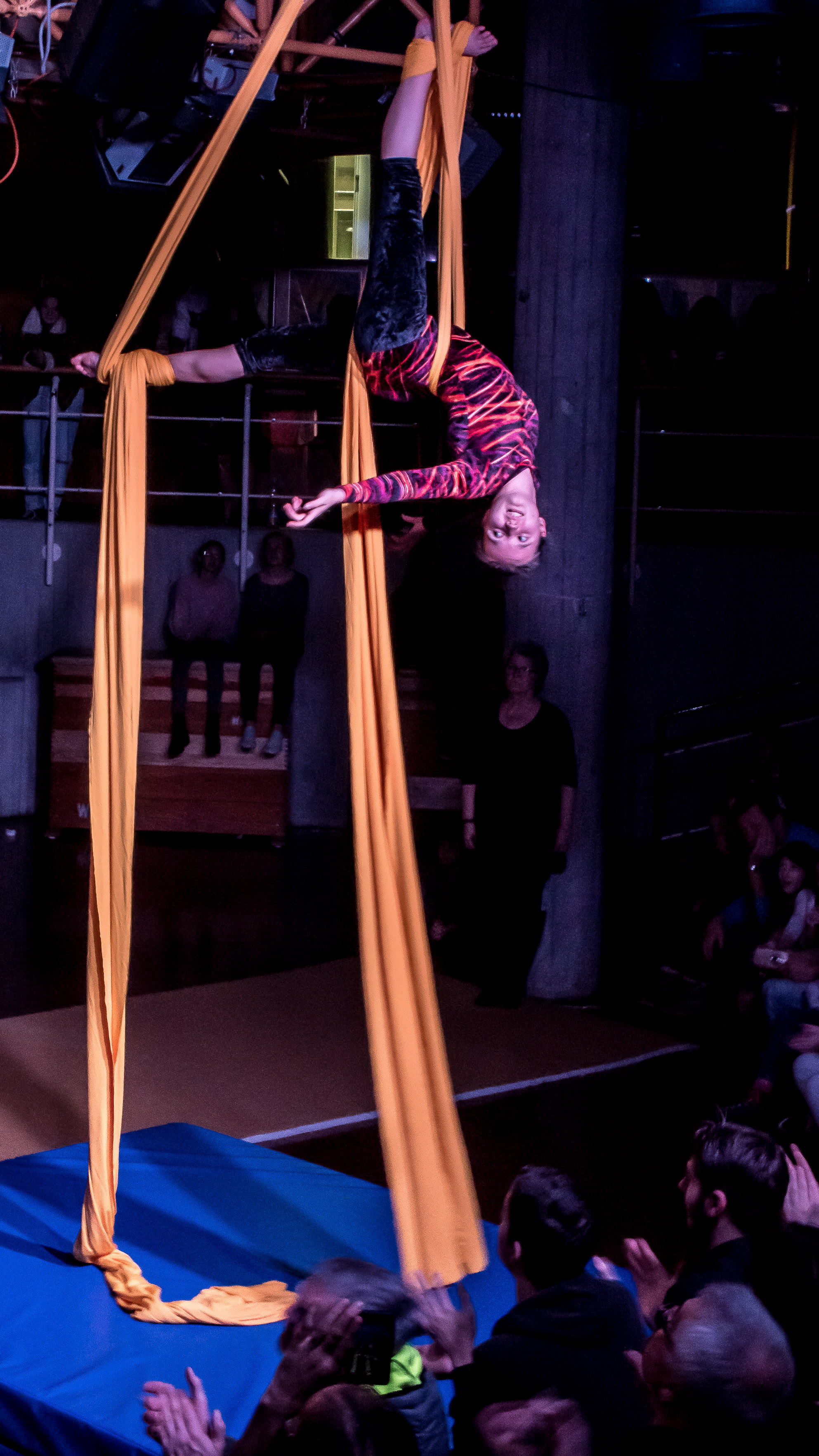 Eindrucksvoller Abschluss der ersten Programmhälfte war schließlich die Akrobatiknummer an den Vertikaltüchern, die Ronja Lämmlein, Nelly Stoltz und die Geschwister Hanna und Eva Tilscher in Kooperation mit dem Sporttheater Heidenheim unter Leitung von Familie Hensolt präsentierten.