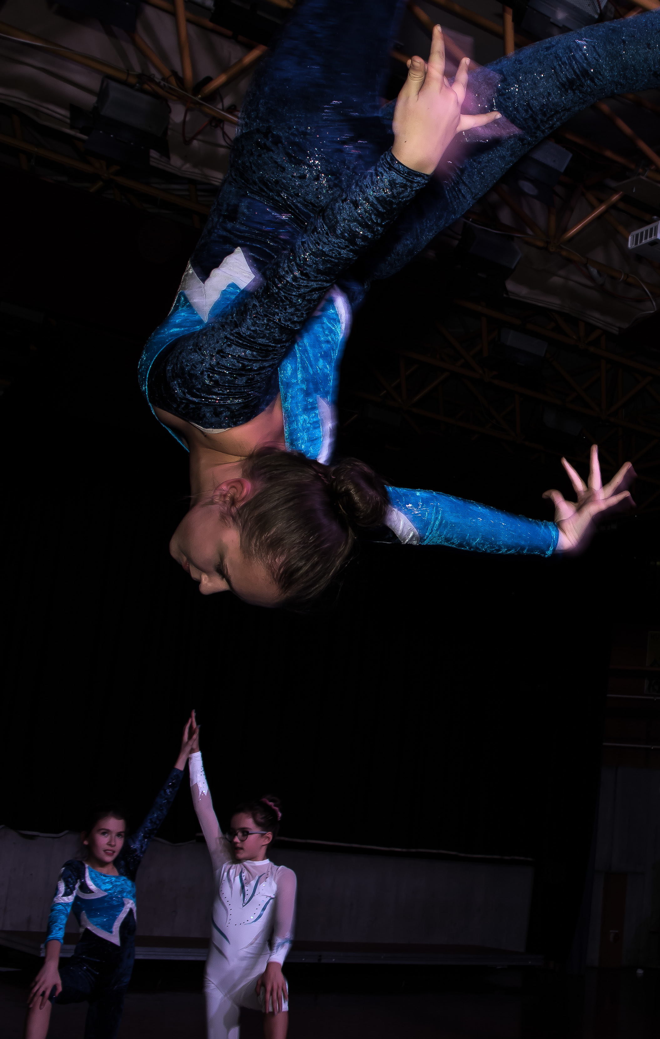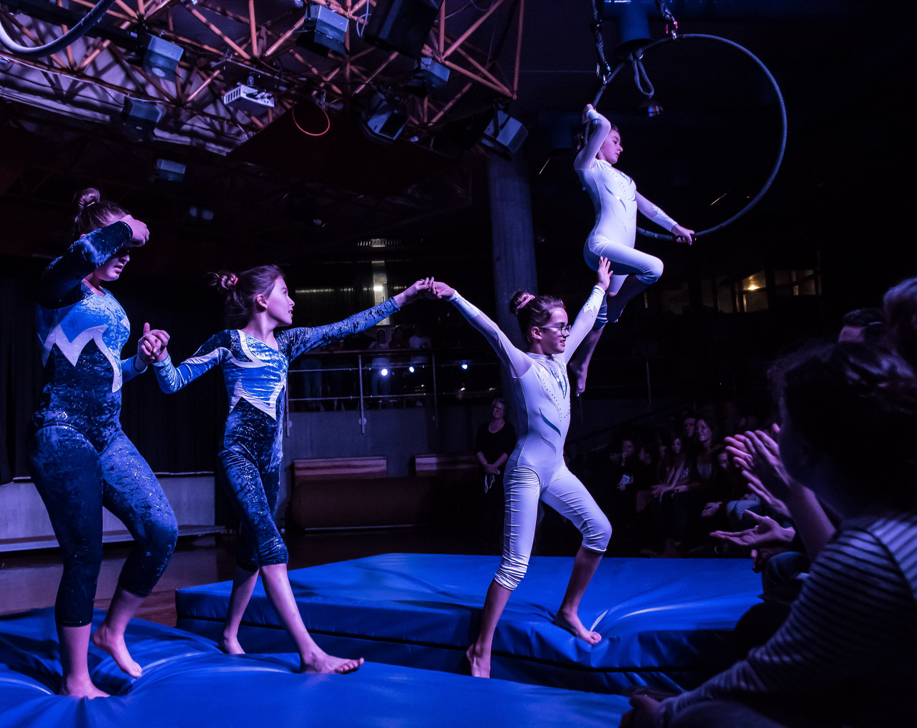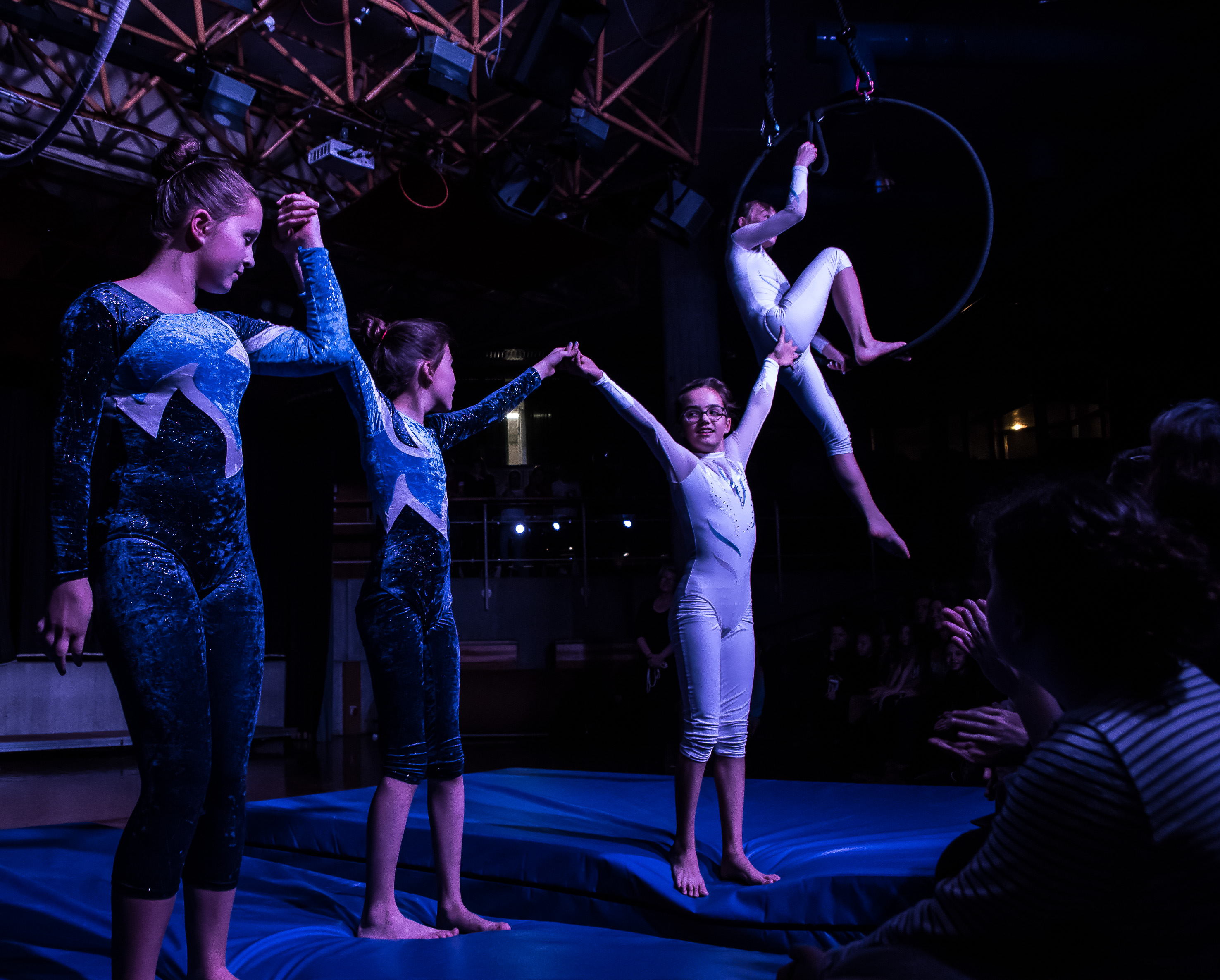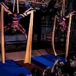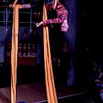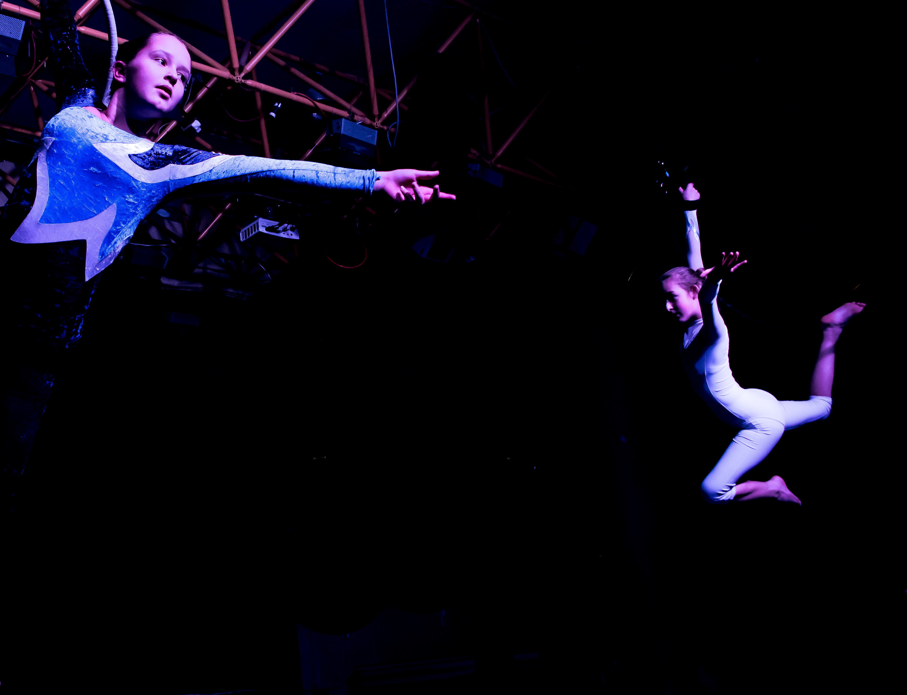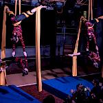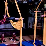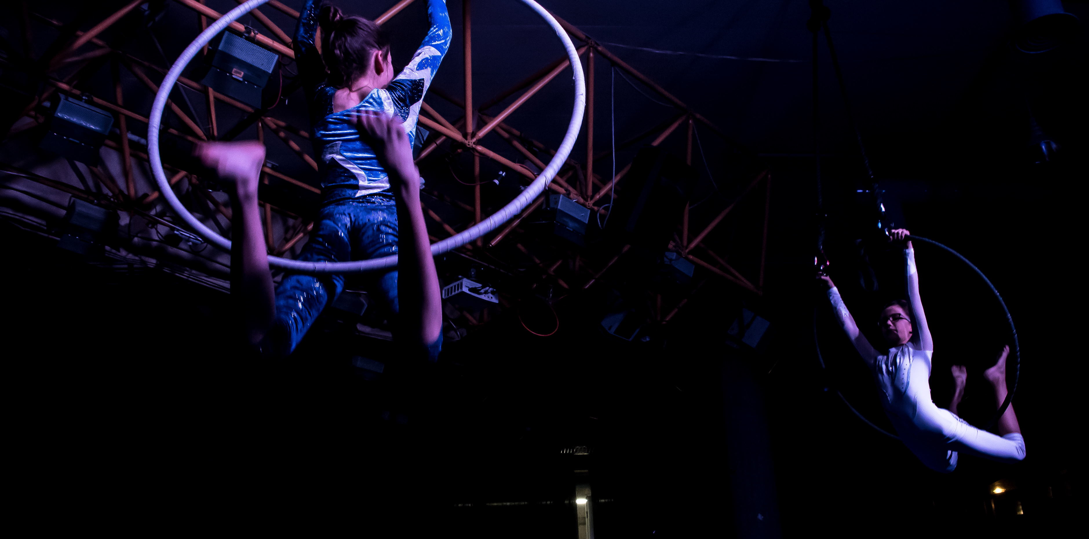 Eindrucksvoller Abschluss der ersten Programmhälfte war schließlich die Akrobatiknummer an den Vertikaltüchern, die Ronja Lämmlein, Nelly Stoltz und die Geschwister Hanna und Eva Tilscher in Kooperation mit dem Sporttheater Heidenheim unter Leitung von Familie Hensolt präsentierten.