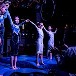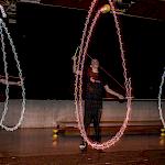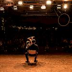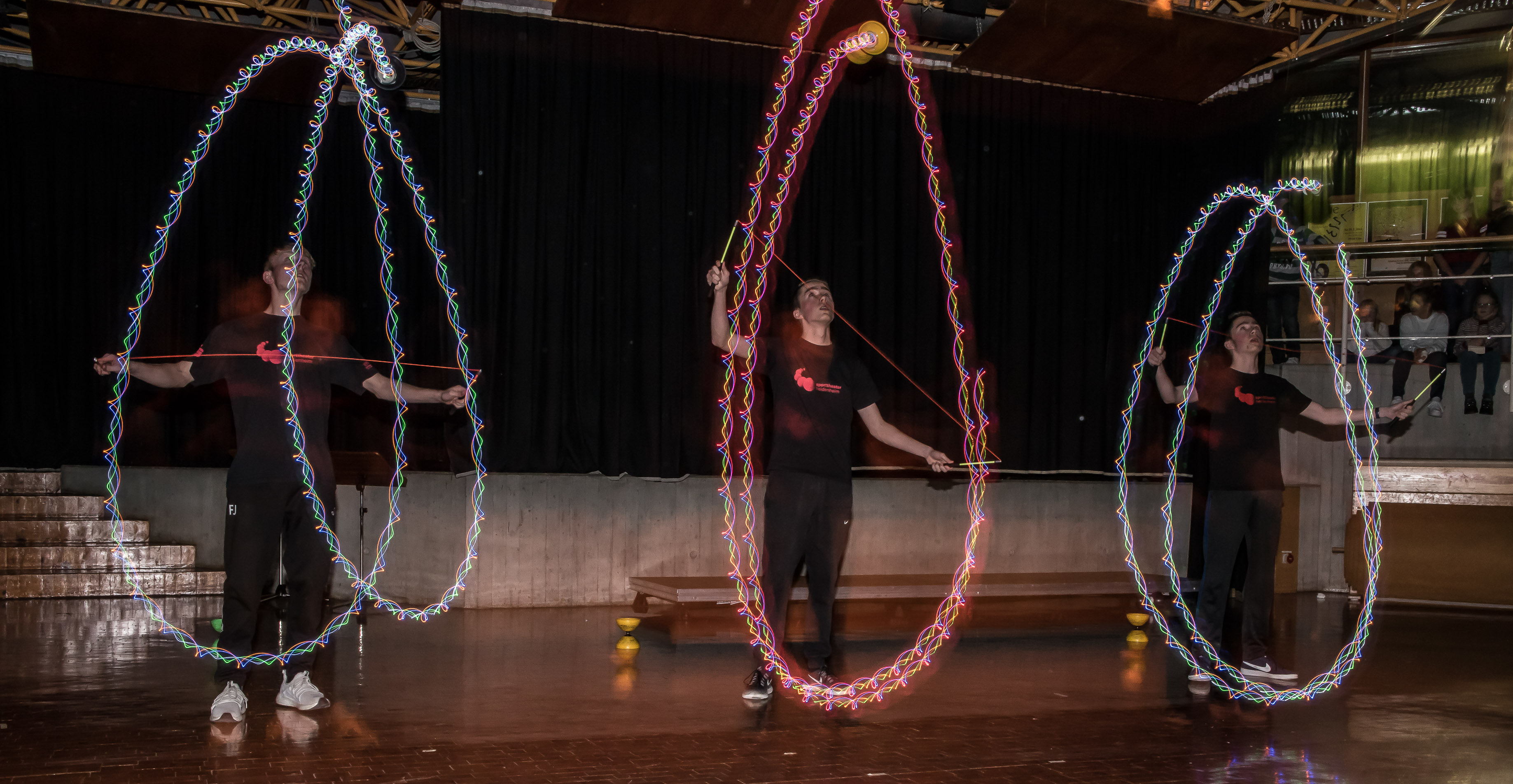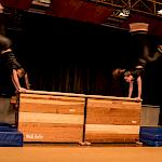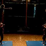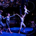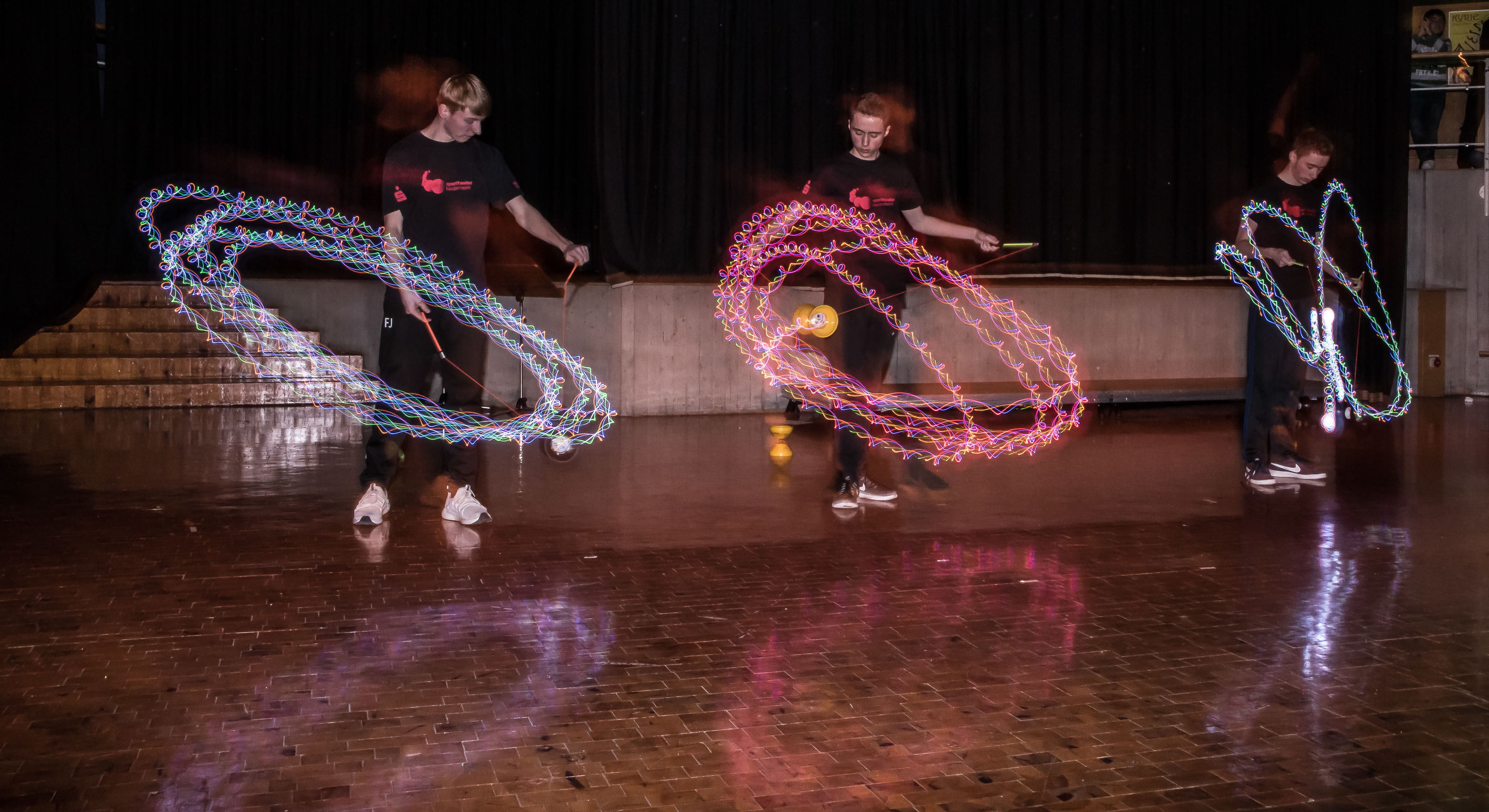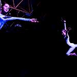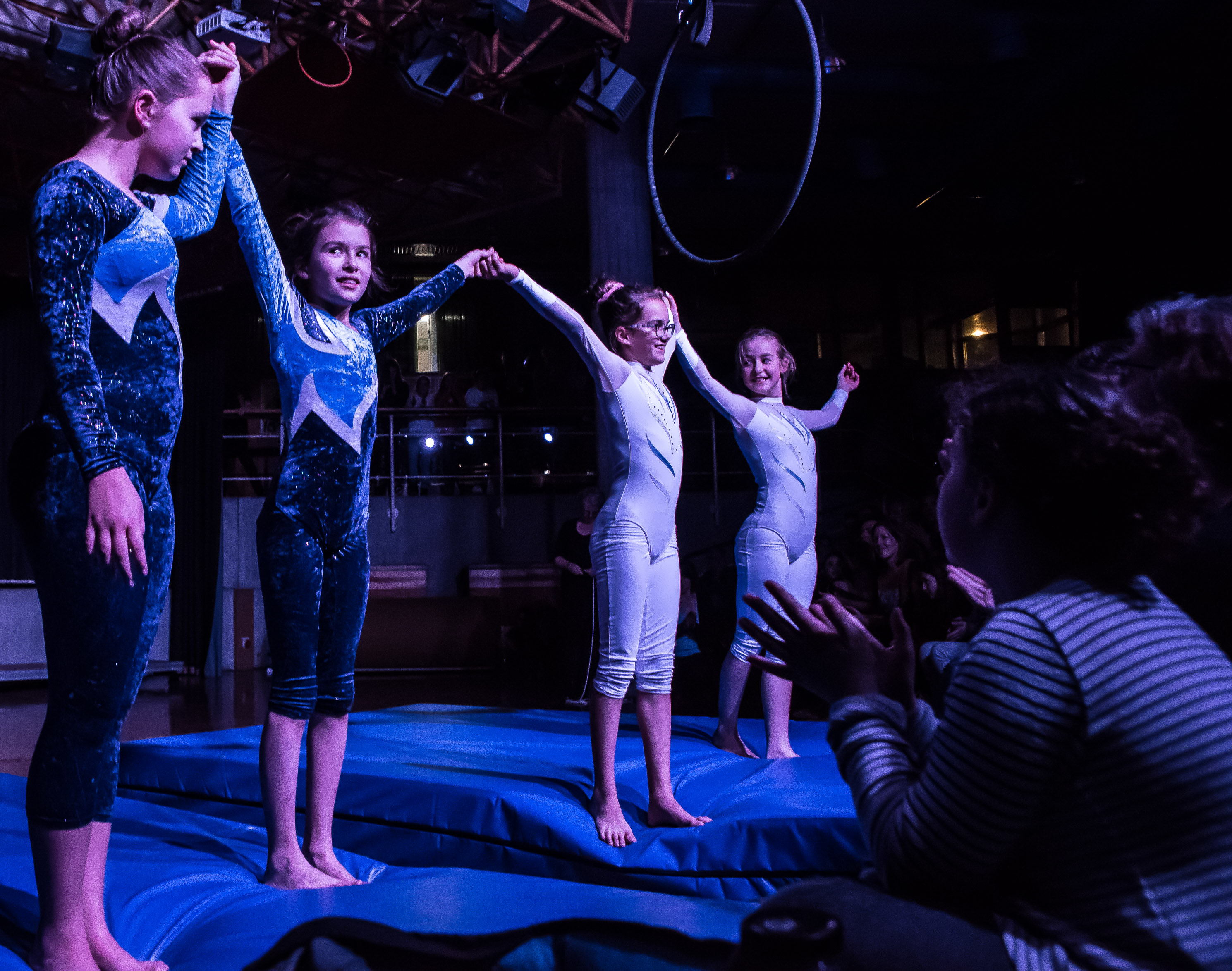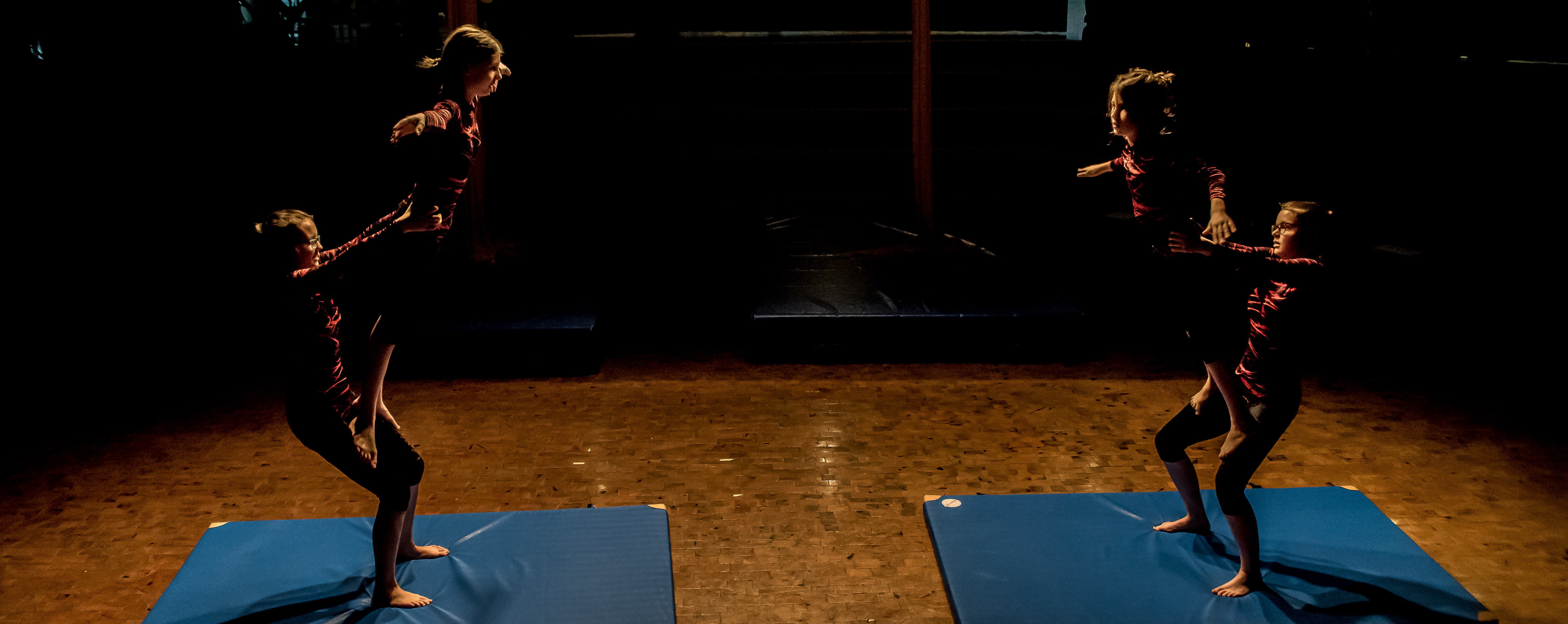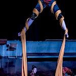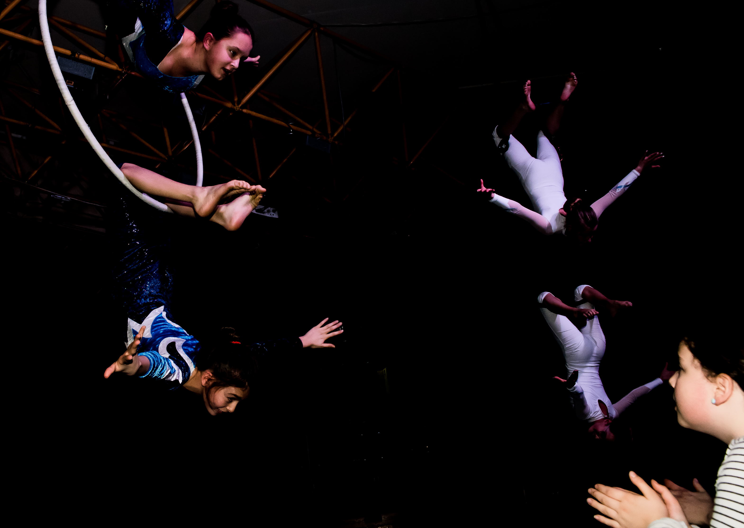 Eindrucksvoller Abschluss der ersten Programmhälfte war schließlich die Akrobatiknummer an den Vertikaltüchern, die Ronja Lämmlein, Nelly Stoltz und die Geschwister Hanna und Eva Tilscher in Kooperation mit dem Sporttheater Heidenheim unter Leitung von Familie Hensolt präsentierten.