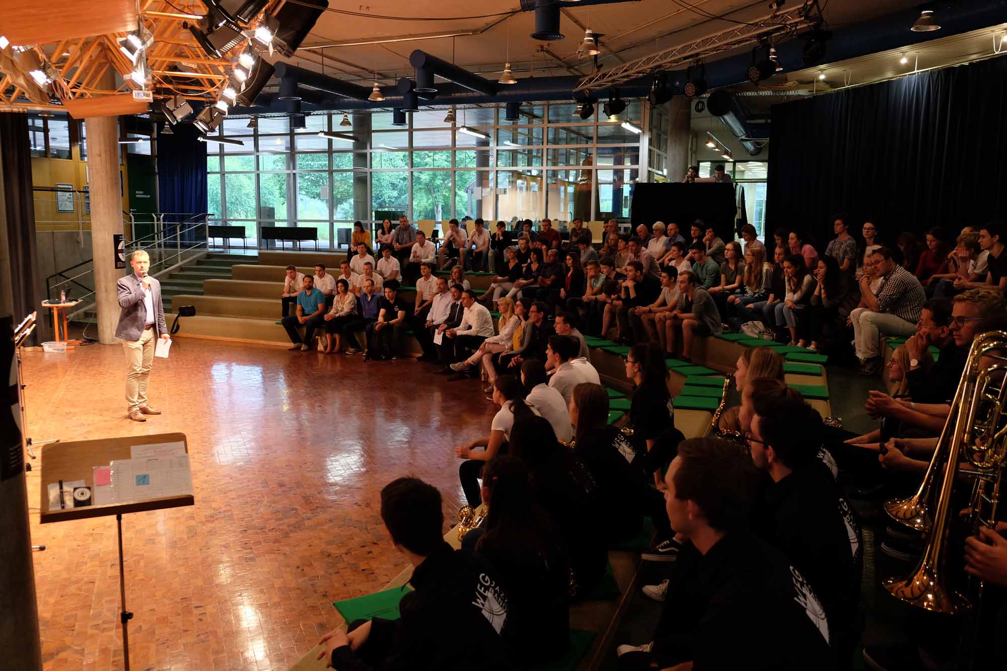 Bei wahrhaft sommerlichen Temperaturen, umrahmt von den mitreißenden Klängen der WeG-Jazzband, feierten die diesjährigen Teilnehmer des Modularen Unterrichts den überaus erfolgreichen Abschluss ihres Projekts zum Kennenlernen verschiedener Ingenieursberufe. Dazu hatten Projektkoordinator Frank Keller und Schulleiter Ralf Kiesel alle Projektbeteiligten der BSH und Schulleiter Markus Kuhn vom Margarete-Steiff-Gymnasium in Giengen ans WeG eingeladen. Im Rahmen des Modularen Unterrichts waren zwölf Schülerinnen und Schüler über vier Monate hinweg jeweils einen Nachmittag pro Woche im BSH-Werk in Giengen, um von den Mitarbeiterinnen und Mitarbeitern aus allen Bereichen der BSH zu lernen, was es alles braucht, damit am Schluss beim Kunden ein fertiges Kühl- und Gefriergerät über viele Jahre hinweg zuverlässig seinen Dienst tun kann. In ihrer Abschlusspräsentation stellten die zwölf Schülerinnen und Schüler alle Schritte zur Herstellung eines Kühl- und Gefriergerätes vor. Dabei luden sie die sie unterrichtenden Dozenten des Teams der BSH dazu ein, auch aus ihrer Sicht nochmals herauszustellen, wie erfreulich für beide Seiten diese besondere Form der Zusammenarbeit war.