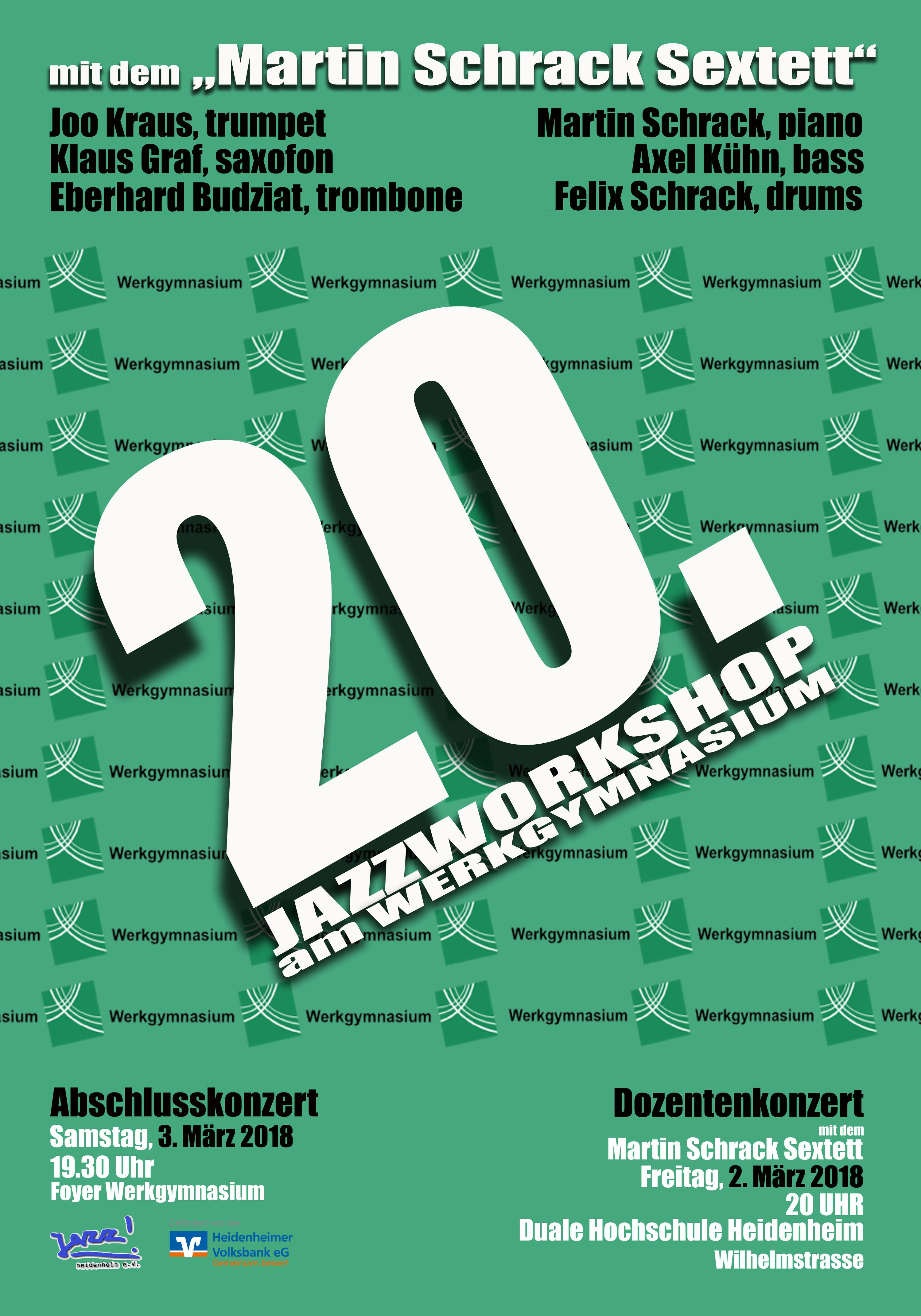 Zum zwanzigsten Mal gibt es ihn mittlerweile, den „Jazzworkshop am Werkgymnasium“. Schülerinnen und Schüler des Werkgymnasiums und verschiedener anderer Schulen proben zwei Tage lang mit professionellen Jazzmusikern und zeigen bei ihrem Abschlusskonzert, was sie in zwei Tagen erarbeitet haben. Beim 20. Jubiläum sind zusätzlich Mitglieder der Bigband „Perplex“ aus Achern mit dabei. Auftreten werden an dem Abend vier Jazz-Combos in unterschiedlicher Besetzung und eine Bigband mit allen Workshopteilnehmern. Sie werden Arrangements wie „Cold Duck Time“ und den Swing-Titel „Sing, sing, sing“ von Louis Prima zum Besten geben. Geleitet werden die Combos und auch die gemeinsame Bigband an dem Abend von den vier Routiniers Prof. Martin Schrack, den man sonst als Jazzpianisten kennt, dem Jazz-Trompeter Joo Krauss, dem aus der SWR-Bigband bekannten Saxophonisten Klaus Graf und dem Lokalmatador und Leiter der „Bigband Steinheim“ Eberhard Budziat. Das Abschlusskonzert zu der zweitägigen Veranstaltung findet am Samstag, dem 3. März 2018, im Foyer des Werkgymnasiums statt und beginnt um 19.30 Uhr. Nach dem Besuch wird um Spenden zur Deckung der Unkosten gebeten.