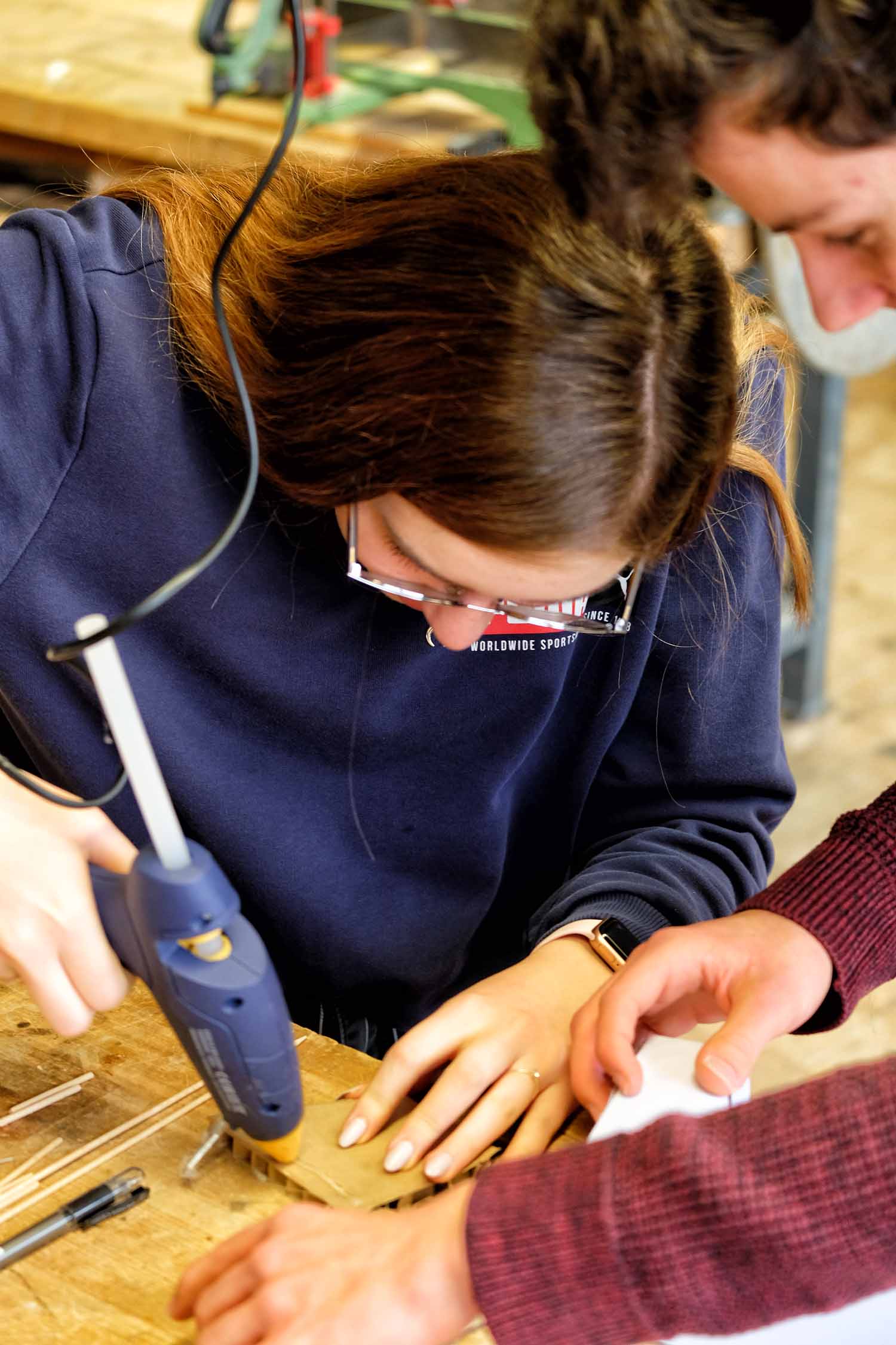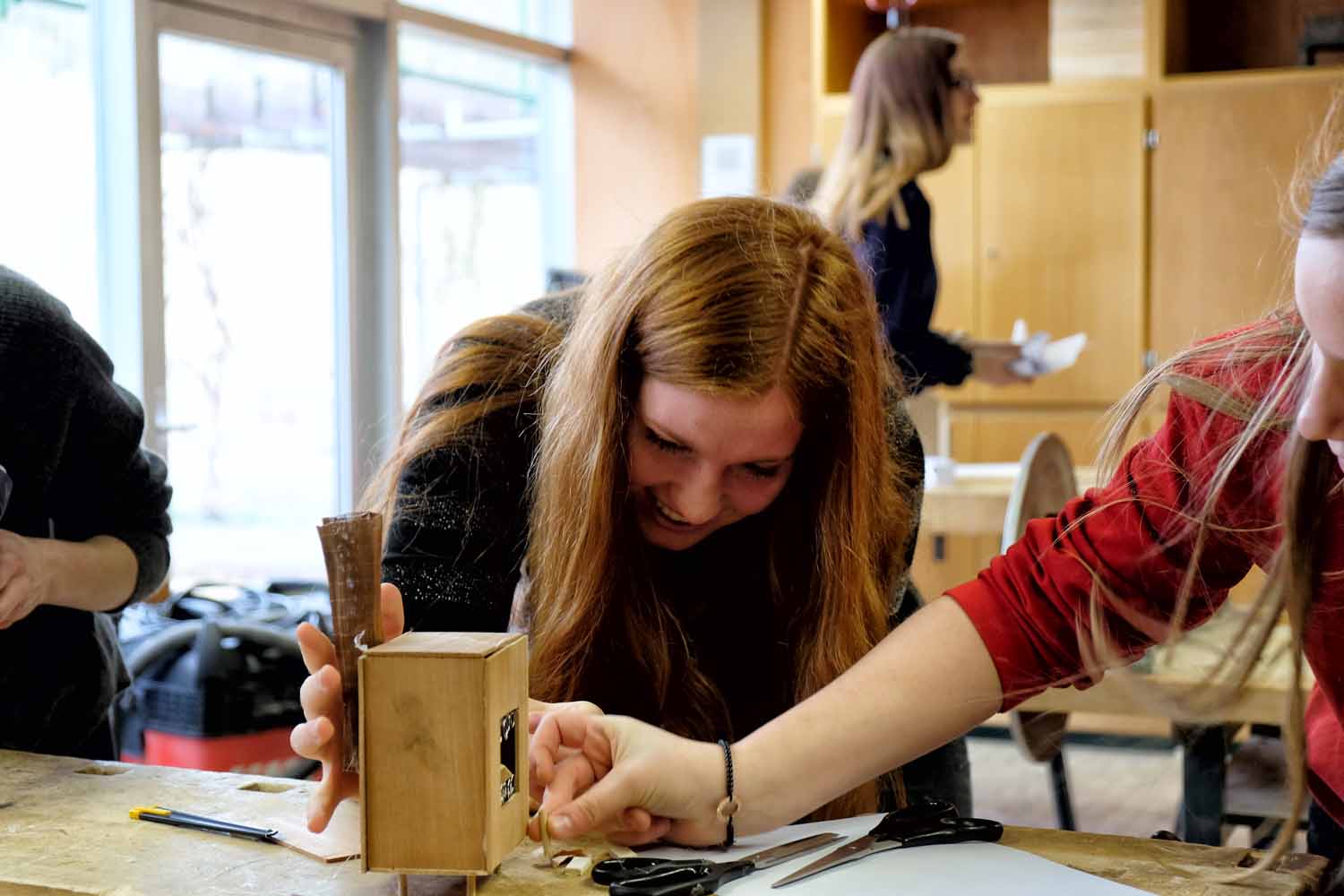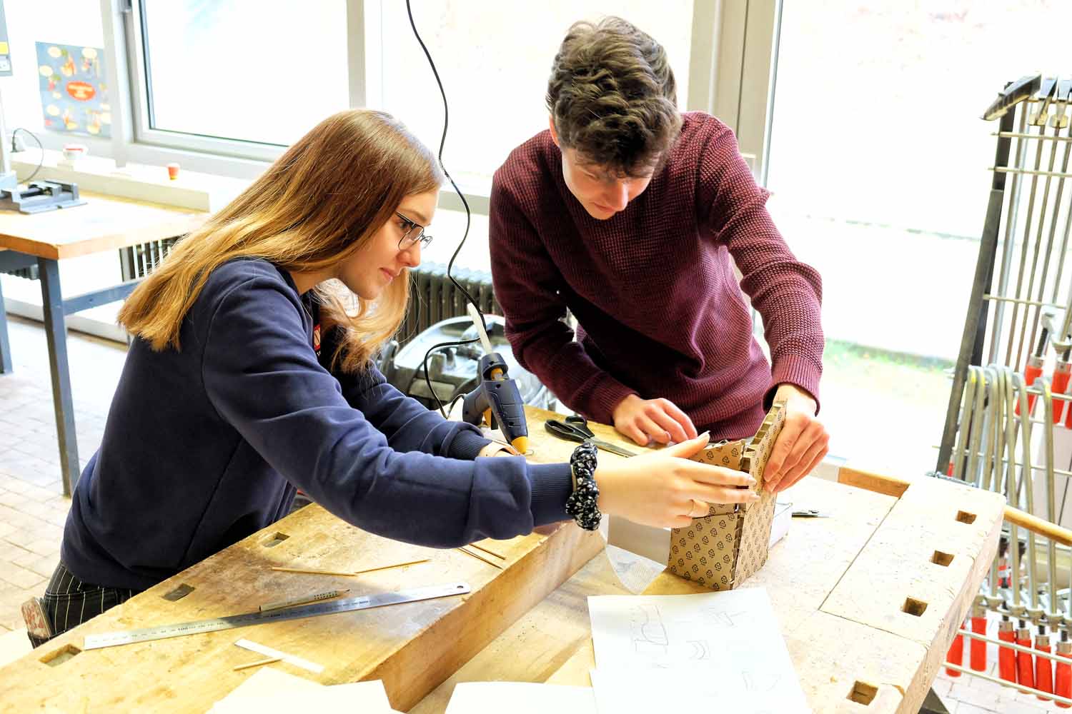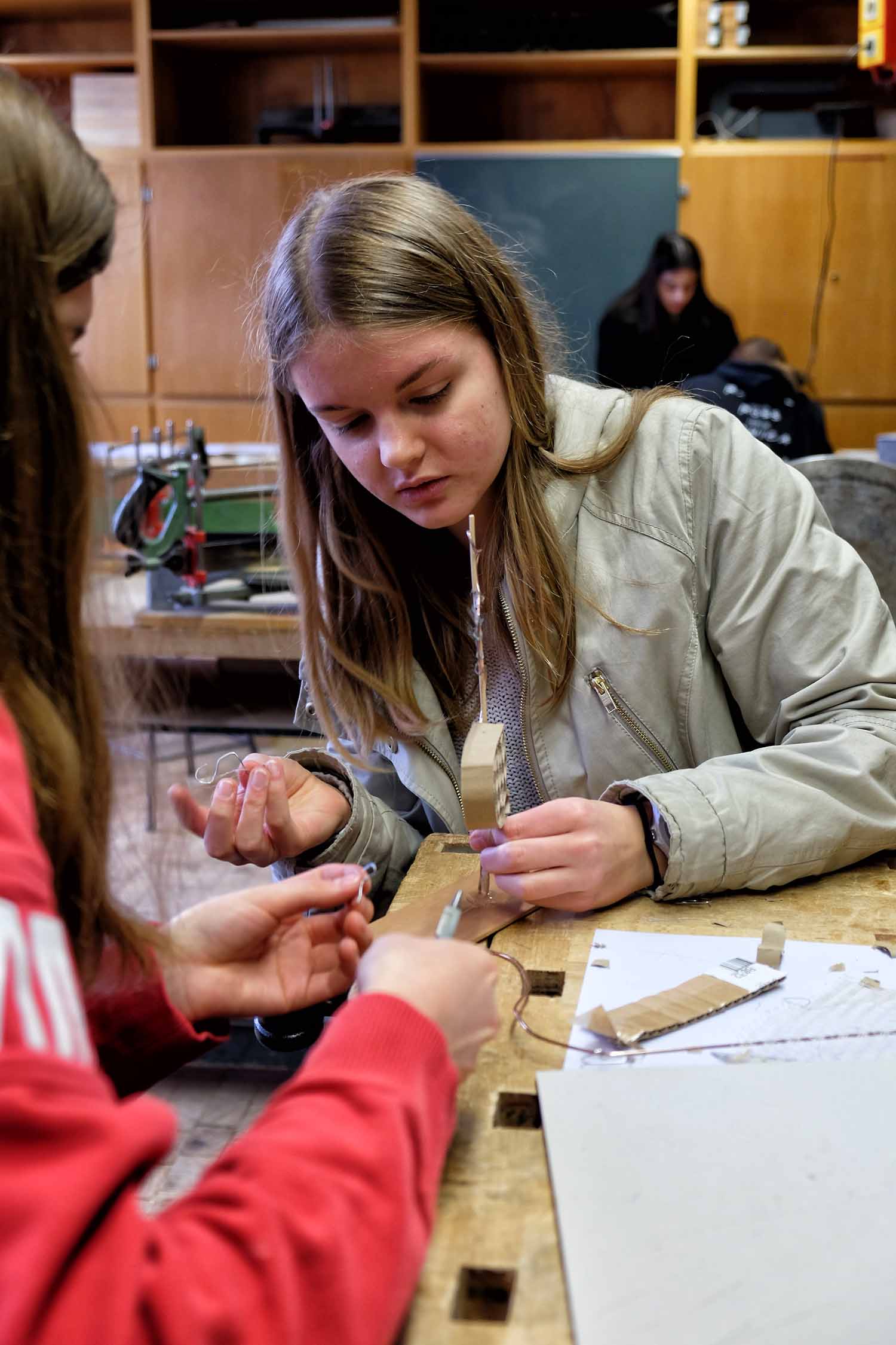Jeden Tag nehmen wir Produkte in die Hand, die erst dadurch entstanden sind, dass Menschen aus ganz unterschiedlicher Perspektive auf dieses Produkt schauen: Techniker, Materialwissenschaftler, Betriebswirtschaftler, Ingenieure und eben Designer; sie alle sorgen dafür, dass ein Produkt entsteht, das wir gerne in die Hand nehmen, das das erfüllt, was Verbraucher erwarten. Und gerade in diesem Entwicklungsprozess leisten Produktdesignende Enormes, weil Funktion und Ästhetik in ein ideales Verhältnis zu bringen sind. Steffi Moser, im ALUMNI Netzwerk bereits zum zweiten Mal aktiv, konfrontierte die Schülerinnen und Schüler darum von Anfang an mit der Situation, in der Produktdesignende heute arbeiten: Ganz aus der Perspektive von Kunden und Anwendenden denkend, stehen am Anfang viele Möglichkeiten, Materialien, Vorgaben und Wünsche. Und so brachte sie denn auch genau diesen Workflow in die Räume des Kurses A mit. Auf den Tischen lagen Materialien aus Holz, Metall, Papier, Glas und Kunststoff und viele Werkzeuge und Gerätschaften. Doch bevor diese zum Einsatz kommen konnten, ging Steffi Moser in ihrer Einführung nochmals auf die professionelle Situation ein, wonach Design jenseits der technischen Notwendigkeiten verzichtbar erscheinen könnte. Doch mit dem Design eines Produkts sei eben mehr verbunden. So transportiere Design immer auch eine Botschaft, ein Gefühl, setze auf eine Beziehung des Anwendenden zum Produkt selbst. Und darum befassten sich die Schülerinnen und Schüler anfangs mit Begriffen, die genau diese weiche, diese Gefühlsebene zum Produkt beschreiben. Und dann machten sich die Schülerinnen und Schülern ans Werk, klebten und leimten, sägten und bogen, formten und schnitten, probierten aus und verwarfen bereits Entstandenes wieder. Am Ende war der kreative Output beachtlich. Im teamorientierten Arbeiten konnten alle Schülerinnen und Schüler ganz praktisch erleben, was Produktdesign ausmacht und was es braucht, um zu einem abschließenden Ergebnis in klar begrenzter Zeit zu gelangen. Steffi Moser war am Schluss nicht nur sichtlich zufrieden, sondern auch stolz auf die Ergebnisse der Schülerinnen und Schüler, die im Rahmen einer abschließenden Werkschau ihre Ergebnisse erläuterten und ein differenziertes Feedback bekamen. Für die Schülerinnen und Schüler war dies sicherlich ein doppelter Gewinn, den Studiengang Produktdesign von seiner beruflichen Realität her wahrzunehmen und andererseits in Steffi Moser eine Expertin für die Fragen zu Studium und Beruf im Bereich des Produktdesigns erlebt zu haben. Frank Keller, Koordinator für die Berufs- und Studienorientierung am Werkgymnasium, bedankte sich bei sehr zufriedenen Schülerinnen und Schülern für deren engagiertes Arbeiten, bei seinem Kollegen Alexander Spohn für dessen Betreuung des Workshops und bei der Produktdesignerin Steffi Moser, die mit ihrem Workshop im Rahmen des Alumni Netzwerkes erneut einen herausragenden Beitrag geleistet habe.
