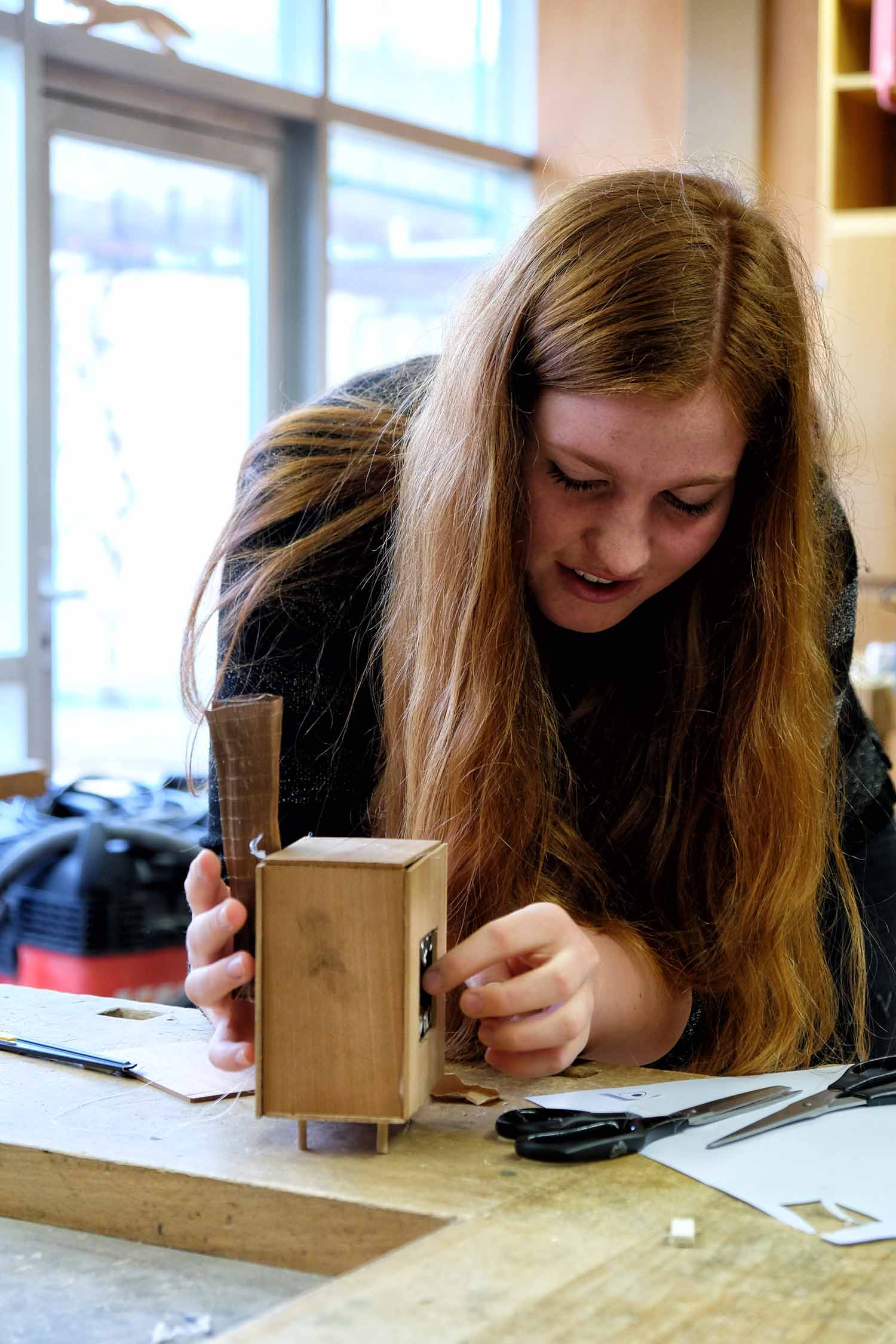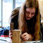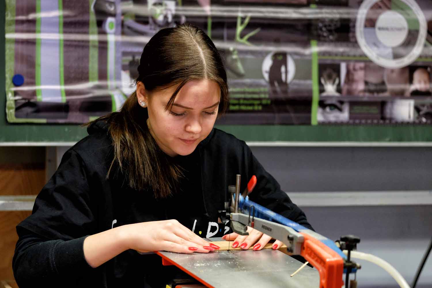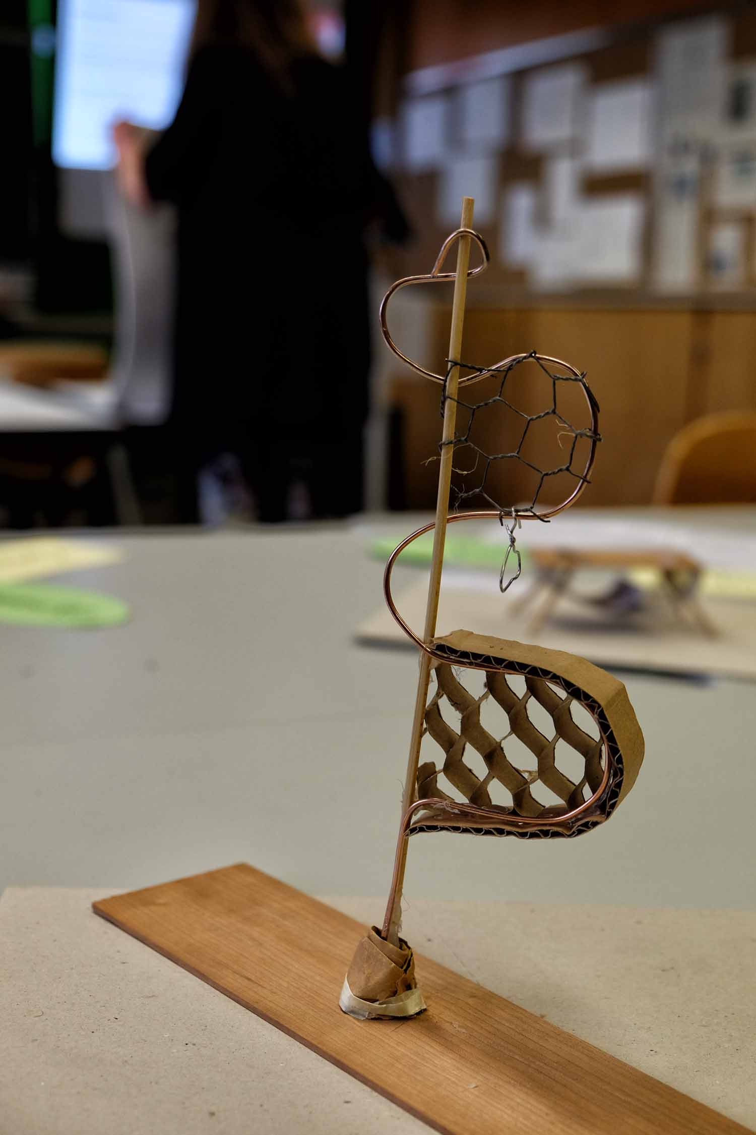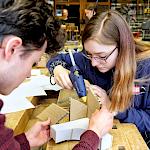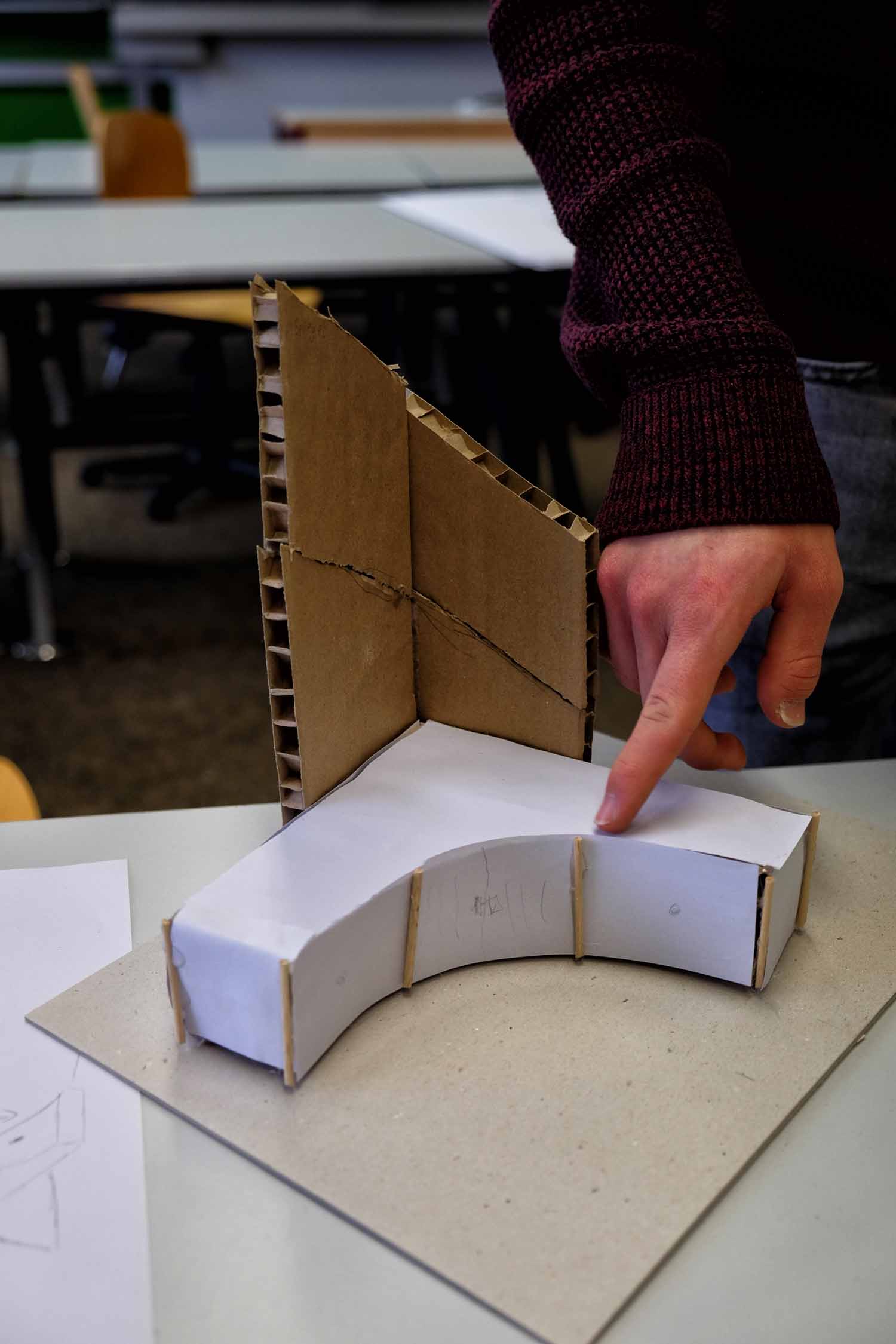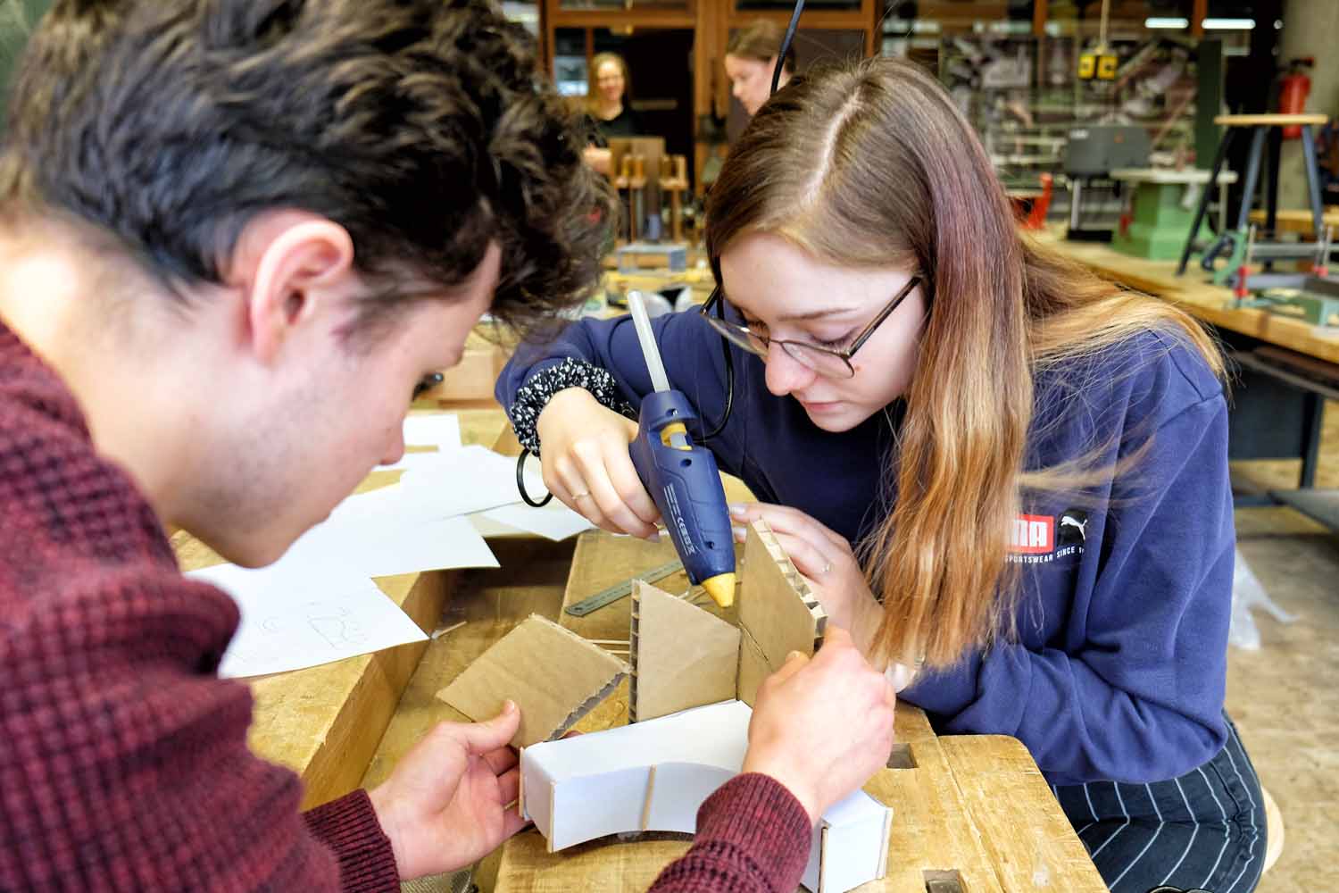 Jeden Tag nehmen wir Produkte in die Hand, die erst dadurch entstanden sind, dass Menschen aus ganz unterschiedlicher Perspektive auf dieses Produkt schauen: Techniker, Materialwissenschaftler, Betriebswirtschaftler, Ingenieure und eben Designer; sie alle sorgen dafür, dass ein Produkt entsteht, das wir gerne in die Hand nehmen, das das erfüllt, was Verbraucher erwarten. Und gerade in diesem Entwicklungsprozess leisten Produktdesignende Enormes, weil Funktion und Ästhetik in ein ideales Verhältnis zu bringen sind. Steffi Moser, im ALUMNI Netzwerk bereits zum zweiten Mal aktiv, konfrontierte die Schülerinnen und Schüler darum von Anfang an mit der Situation, in der Produktdesignende heute arbeiten: Ganz aus der Perspektive von Kunden und Anwendenden denkend, stehen am Anfang viele Möglichkeiten, Materialien, Vorgaben und Wünsche. Und so brachte sie denn auch genau diesen Workflow in die Räume des Kurses A mit. Auf den Tischen lagen Materialien aus Holz, Metall, Papier, Glas und Kunststoff und viele Werkzeuge und Gerätschaften. Doch bevor diese zum Einsatz kommen konnten, ging Steffi Moser in ihrer Einführung nochmals auf die professionelle Situation ein, wonach Design jenseits der technischen Notwendigkeiten verzichtbar erscheinen könnte. Doch mit dem Design eines Produkts sei eben mehr verbunden. So transportiere Design immer auch eine Botschaft, ein Gefühl, setze auf eine Beziehung des Anwendenden zum Produkt selbst. Und darum befassten sich die Schülerinnen und Schüler anfangs mit Begriffen, die genau diese weiche, diese Gefühlsebene zum Produkt beschreiben. Und dann machten sich die Schülerinnen und Schülern ans Werk, klebten und leimten, sägten und bogen, formten und schnitten, probierten aus und verwarfen bereits Entstandenes wieder. Am Ende war der kreative Output beachtlich. Im teamorientierten Arbeiten konnten alle Schülerinnen und Schüler ganz praktisch erleben, was Produktdesign ausmacht und was es braucht, um zu einem abschließenden Ergebnis in klar begrenzter Zeit zu gelangen. Steffi Moser war am Schluss nicht nur sichtlich zufrieden, sondern auch stolz auf die Ergebnisse der Schülerinnen und Schüler, die im Rahmen einer abschließenden Werkschau ihre Ergebnisse erläuterten und ein differenziertes Feedback bekamen. Für die Schülerinnen und Schüler war dies sicherlich ein doppelter Gewinn, den Studiengang Produktdesign von seiner beruflichen Realität her wahrzunehmen und andererseits in Steffi Moser eine Expertin für die Fragen zu Studium und Beruf im Bereich des Produktdesigns erlebt zu haben. Frank Keller, Koordinator für die Berufs- und Studienorientierung am Werkgymnasium, bedankte sich bei sehr zufriedenen Schülerinnen und Schülern für deren engagiertes Arbeiten, bei seinem Kollegen Alexander Spohn für dessen Betreuung des Workshops und bei der Produktdesignerin Steffi Moser, die mit ihrem Workshop im Rahmen des Alumni Netzwerkes erneut einen herausragenden Beitrag geleistet habe.