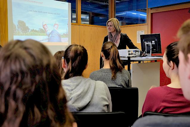Aus der großen Fülle an Studien- und Berufsorientierungsmessen ragt die Fachmesse für Ausbildung und Studium „Vocatium“, die in diesem Jahr am 5. Mai wieder in der Stadthalle Aalen stattfinden wird, sicherlich schon wegen ihres Konzepts heraus. Dieses Konzept sorgt durch gute Vorbereitung der teilnehmenden Schülerinnen und Schüler schon vor dem eigentlichen Messetermin dafür, dass Termine für Einzelgespräche mit potentiellen Ausbildungsanbietern und Firmen, die duale Studienplätze besetzen wollen, vereinbart sind. Dieses Procedere den interessierten Schülerinnen und Schülern nahe zu bringen, war Aufgabe von Dorothee Mack, die im Namen des Instituts für Talententwicklung, das die Messe „Vocatium“ plant, organisiert und durchführt, für eine Informationsveranstaltung an die Schule gekommen war. In Vortrag und Gespräch konnte sie mit den Schülerinnen und Schülern den Ablauf der Messe und die dazu nötigen Vorbereitungsbausteine anschaulich erläutern und viele aufkommende Fragen auch gleich beantworten. So vorbereitet haben die Schülerinnen und Schüler nun die Möglichkeit, sich für die Messe anzumelden. Wir wünschen dabei viel Erfolg.