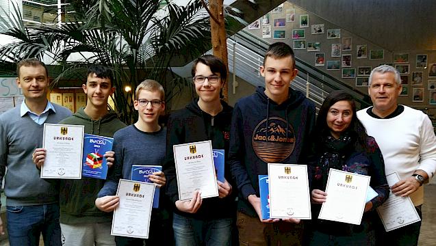 Unser Foto zeigt (von links betrachtet) Schulleiter Ralf Kiesel, die Preisträger Yusuf Ceper, Jonas Bahmann, Marlon Baß und Jan Konold, zusammen mit ihren Mathematiklehrern Frau Assem und Herrn Opitz (d. Aufnahme stammt vom 3. März 2020).