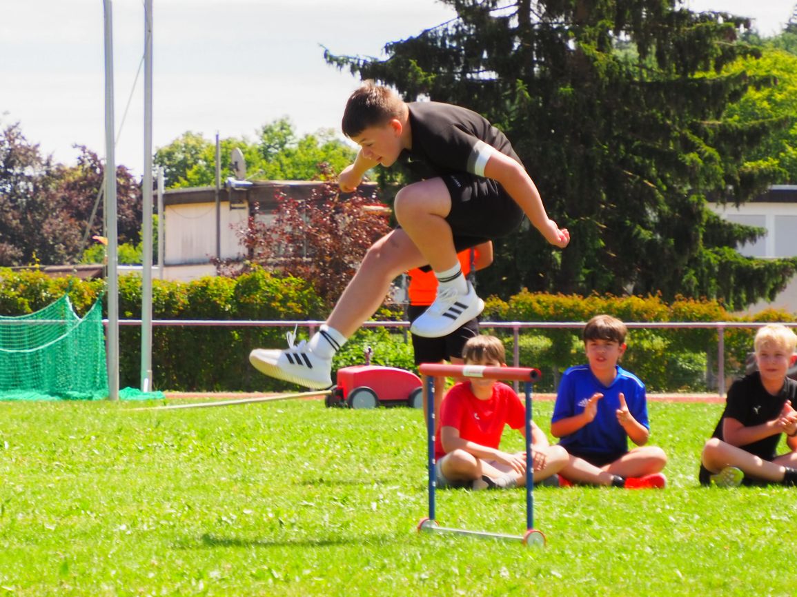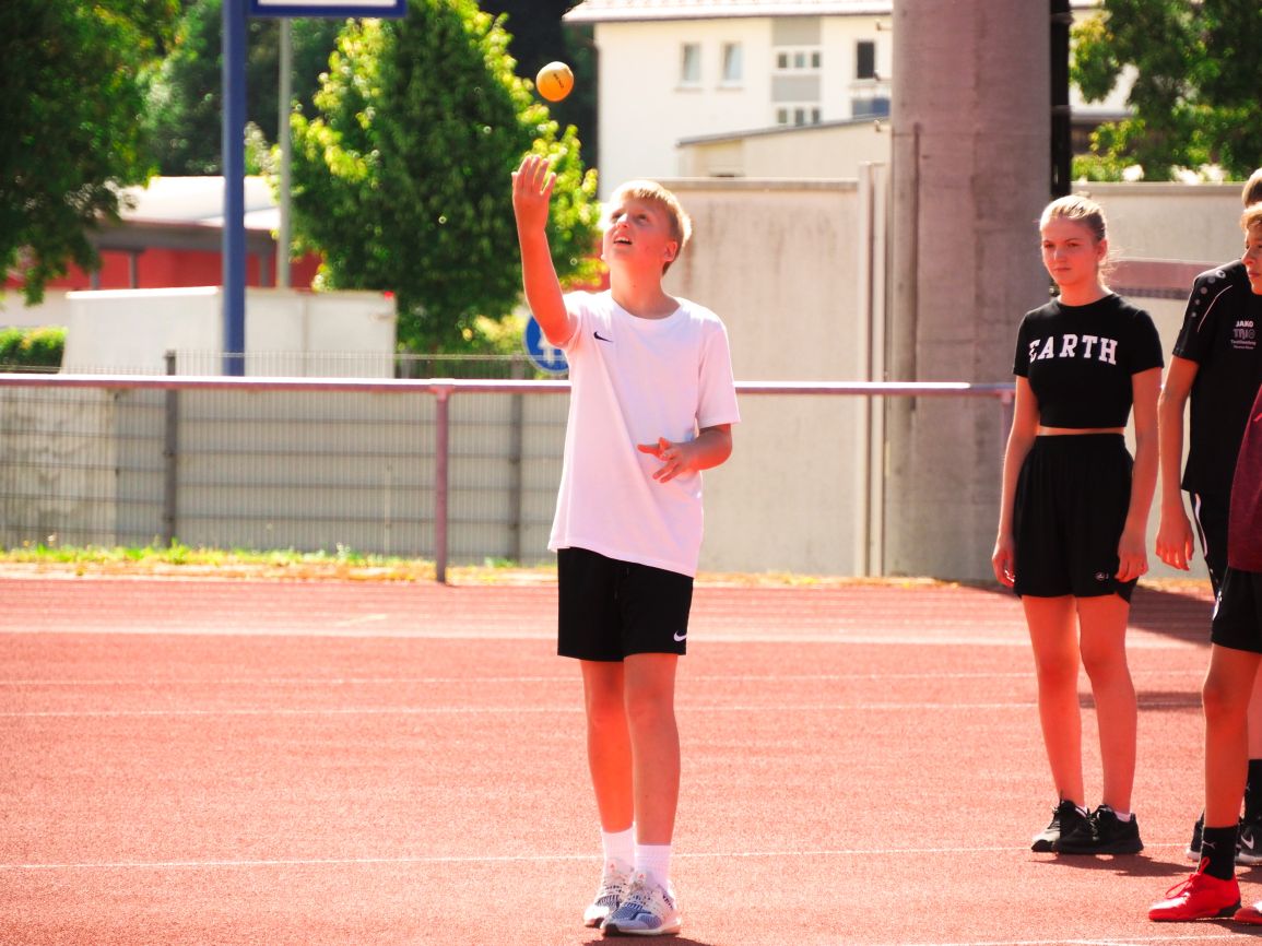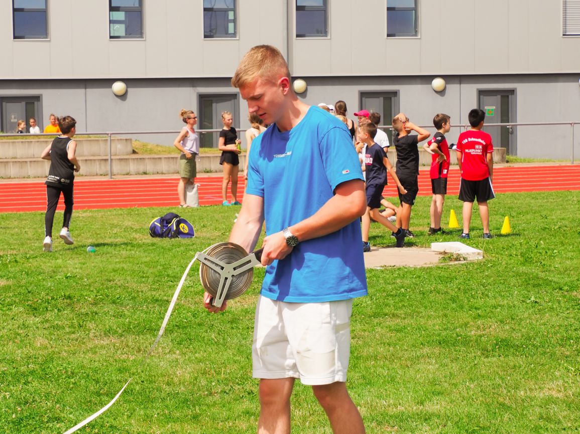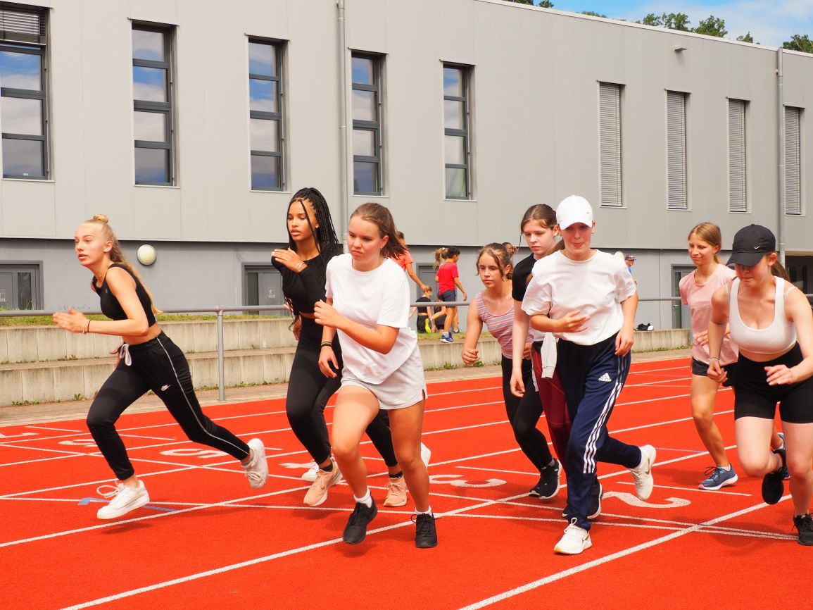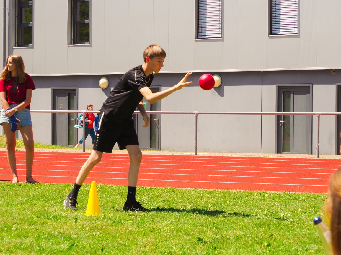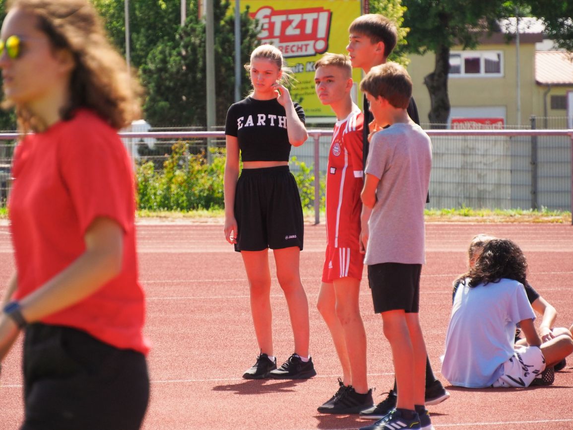 Nachdem coronabedingt die Bundesjugendspiele 2020 und 2021 ausfallen mussten, wurde die Organisation in diesem Jahr zu einer besonderen Herausforderung. Immerhin sollten an diesem 13. Juli, einem Mittwochvormittag, insgesamt elf Klassen aus den Klassenstufen 5 bis 7 in einem straffen Zeitplan die vier Disziplinen Schlagballweitwurf, 800-m- bzw. 1000-m-Lauf, Weitsprung und den Sprint über Strecken 50 oder 75 Meter absolvieren. Zum Abschluss gab es noch Staffelwettkämpfe, bei denen sich die einzelnen Klassenstufen lautstark miteinander messen konnten.