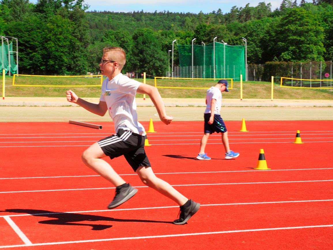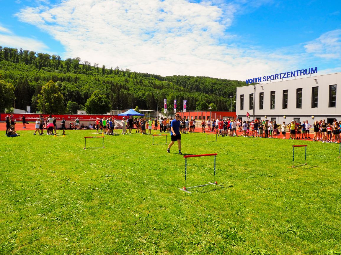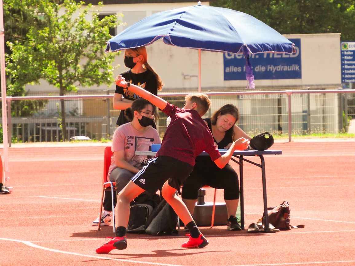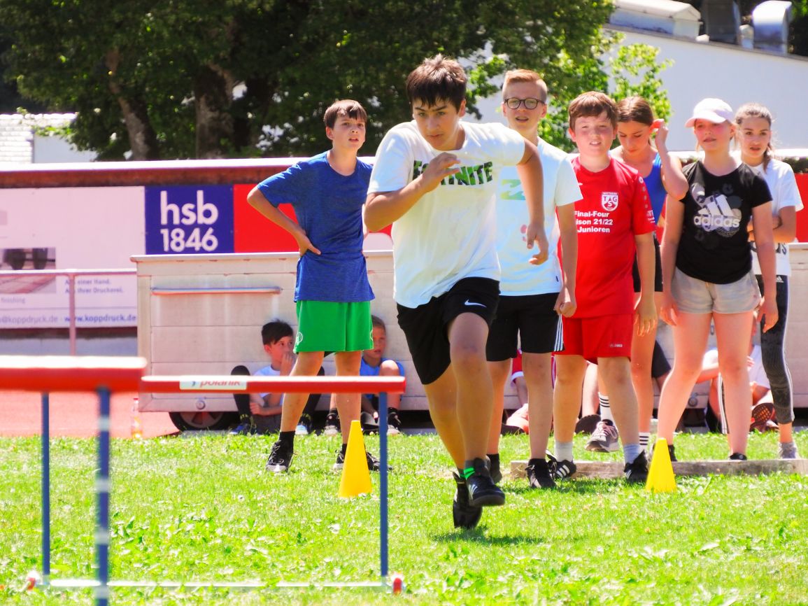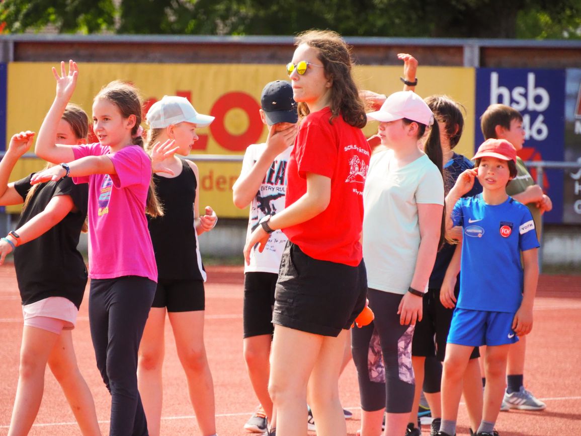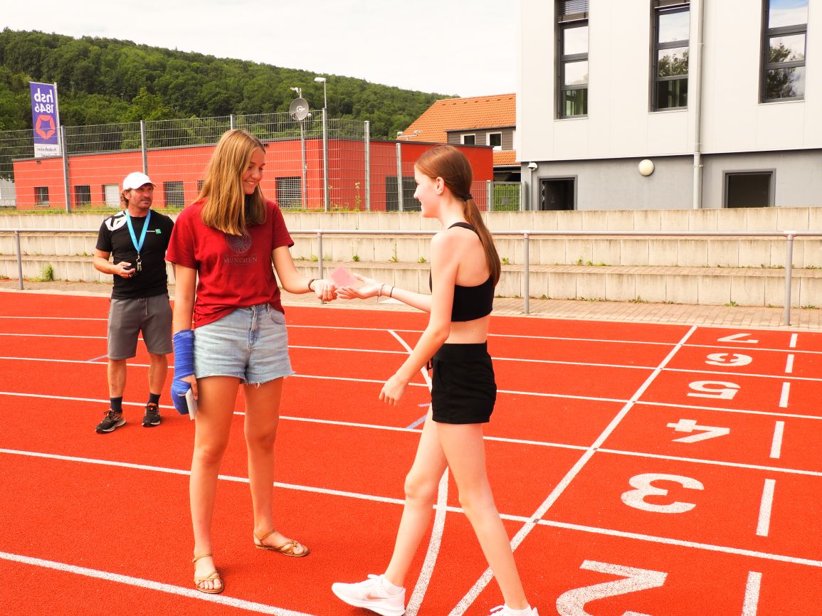 Nachdem coronabedingt die Bundesjugendspiele 2020 und 2021 ausfallen mussten, wurde die Organisation in diesem Jahr zu einer besonderen Herausforderung. Immerhin sollten an diesem 13. Juli, einem Mittwochvormittag, insgesamt elf Klassen aus den Klassenstufen 5 bis 7 in einem straffen Zeitplan die vier Disziplinen Schlagballweitwurf, 800-m- bzw. 1000-m-Lauf, Weitsprung und den Sprint über Strecken 50 oder 75 Meter absolvieren. Zum Abschluss gab es noch Staffelwettkämpfe, bei denen sich die einzelnen Klassenstufen lautstark miteinander messen konnten.
