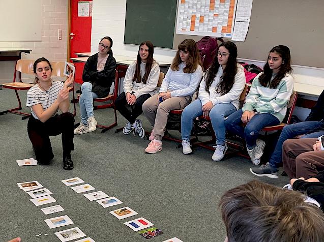 Mit Sprachspielen, Bildkarten und Musik schaffte es Frau Grondin, auch zurückhaltendere Schüler*innen zu aktivieren und alle konnten bei den fast ausschließlich auf französich erklärten Spielregeln feststellen, dass sie schon ziemlich viel französisch verstehen.
