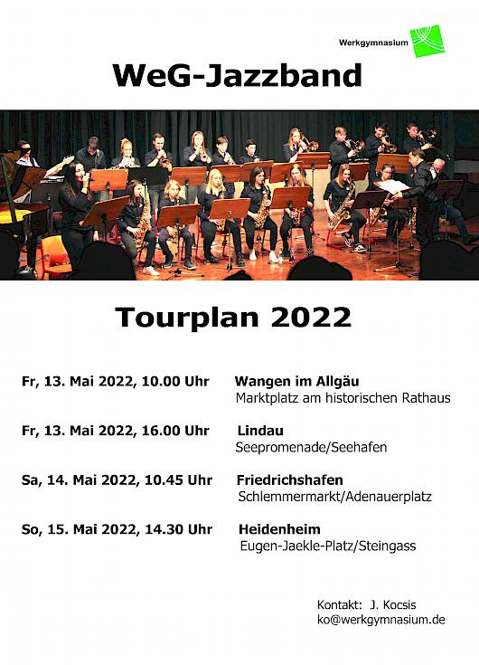 Immer wieder neue Wege geht die "WeG-Jazzband": Im Mai 2022 führt das Ensemble die Probentage im JUFA Sporthotel Wangen im Allgäu durch und bereitet sich dort auf eine Platzkonzert Tournee vor. So werden die Schülerinnen und Schüler mit ihrem Leiter Joachim Kocsis am Freitag, 13. Mai 2022, um 10.00 Uhr auf dem Postplatz in Wangen i. A. vor dem historischen Rathaus und um 16.00 Uhr auf der Seepromenade am Seehafen Lindau vor idyllischem Bodenseepanorama auftreten. Nach dem Transfer und einer Übernachtung in der Graf-Zeppelin Jugendherberge Friedrichshafen ist das Schüerensemble am Samstag eingeladen, um 11.00 Uhr auf dem dortigen Schlemmermarkt aufzutreten. Der Auftritt am Sonntag, 15. Mai 2022, um 14.30 Uhr auf dem Eugen-Jaekle-Platz vor dem Modehaus Steingass bildet quasi als Heimspiel den Abschluss der Tournee. Als Sängerin wirkt in bewährter Manier Ricarda Rickert mit, die das abwechslungsreiche Programm der Jazzband ergänzt. So darf man auch dieses Mal wieder gespannt darauf sein, was die Band musikalisch zu bieten hat.