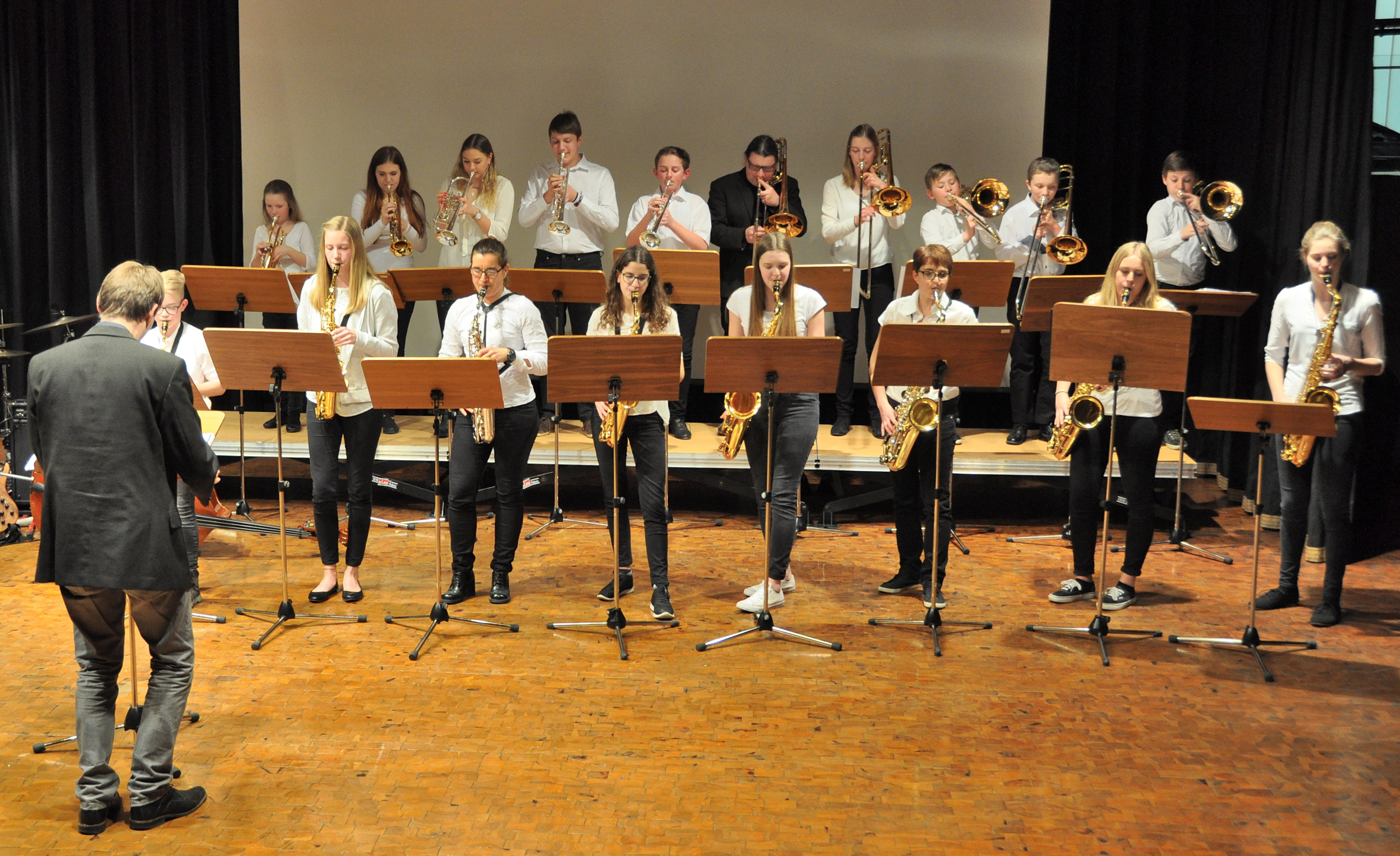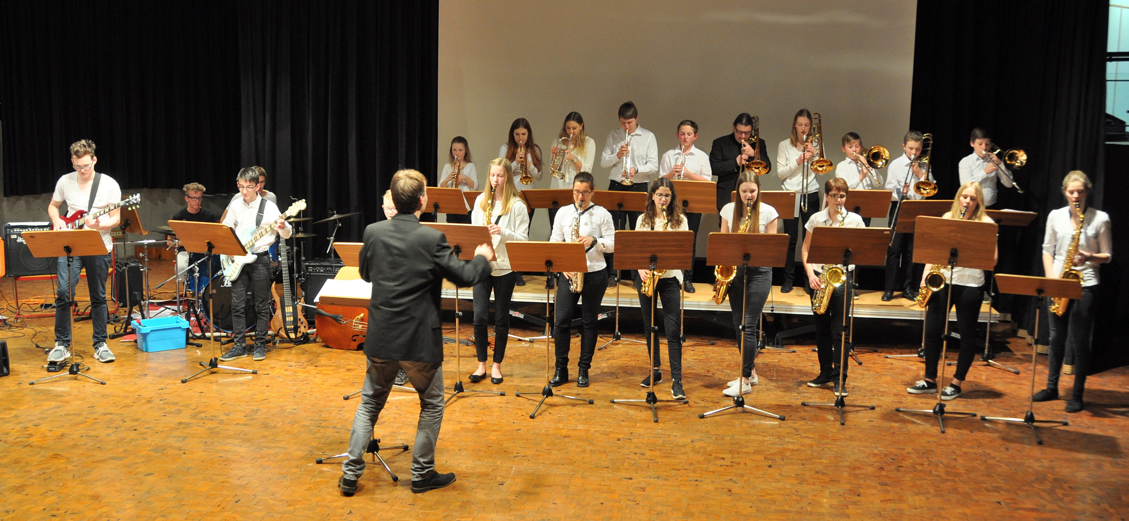 Das Ergebnis der diesjährigen Probenarbeit wurde am vergangenen Samstag in der Kulturmulde des Werkgymnasiums präsentiert. Die Combo von Eberhard Budziat stellte ein Jazz-Panorama vom „St. Louis Blues“ bis hin zu Chet Bakers „Exitus“ vor. Dabei zeigten die jungen Musiker sowohl solistisches Können als auch souveräne Kommunikation, nach welcher die raffinierten Arrangements verlangten. Die zweite Gruppe hatte mit Saxofonist Hubert Winter geprobt, herausgekommen sind wunderschön swingende „Autumn Leaves“ und ein luftiger „Blue Bossa“. Martin Schrack und seine Band beendeten den Reigen der Combo-Darbietungen. Diese Formation hatte eine Komposition im Gepäck, die, so Schrack, „erst vor drei Tagen entstanden“ sei und auf den Namen „The Ostalb“ höre. Auch beim augenzwinkernden „The Party (mit Spätzle und Soß)“ war die Spielfreude der Musiker offensichtlich.