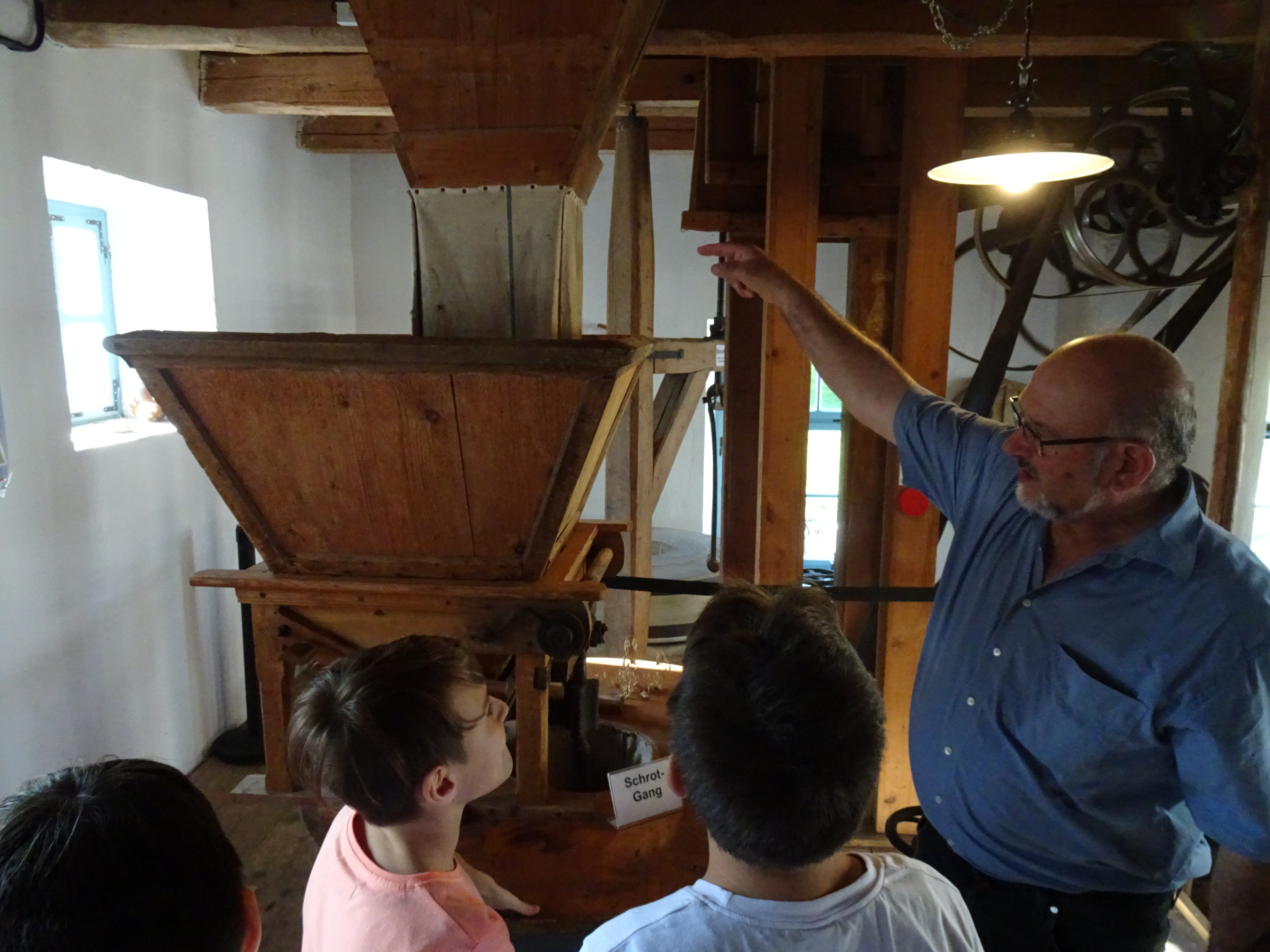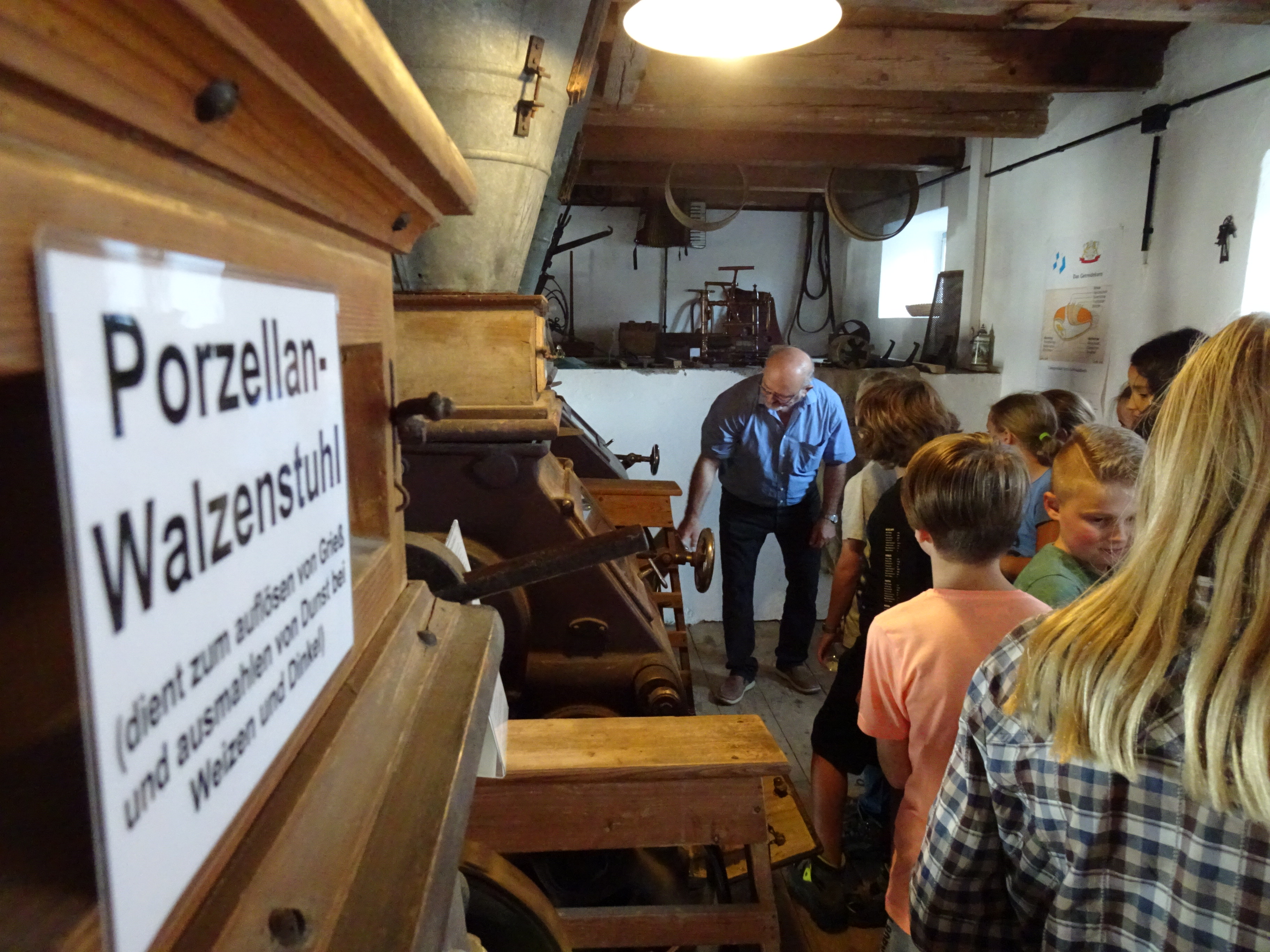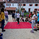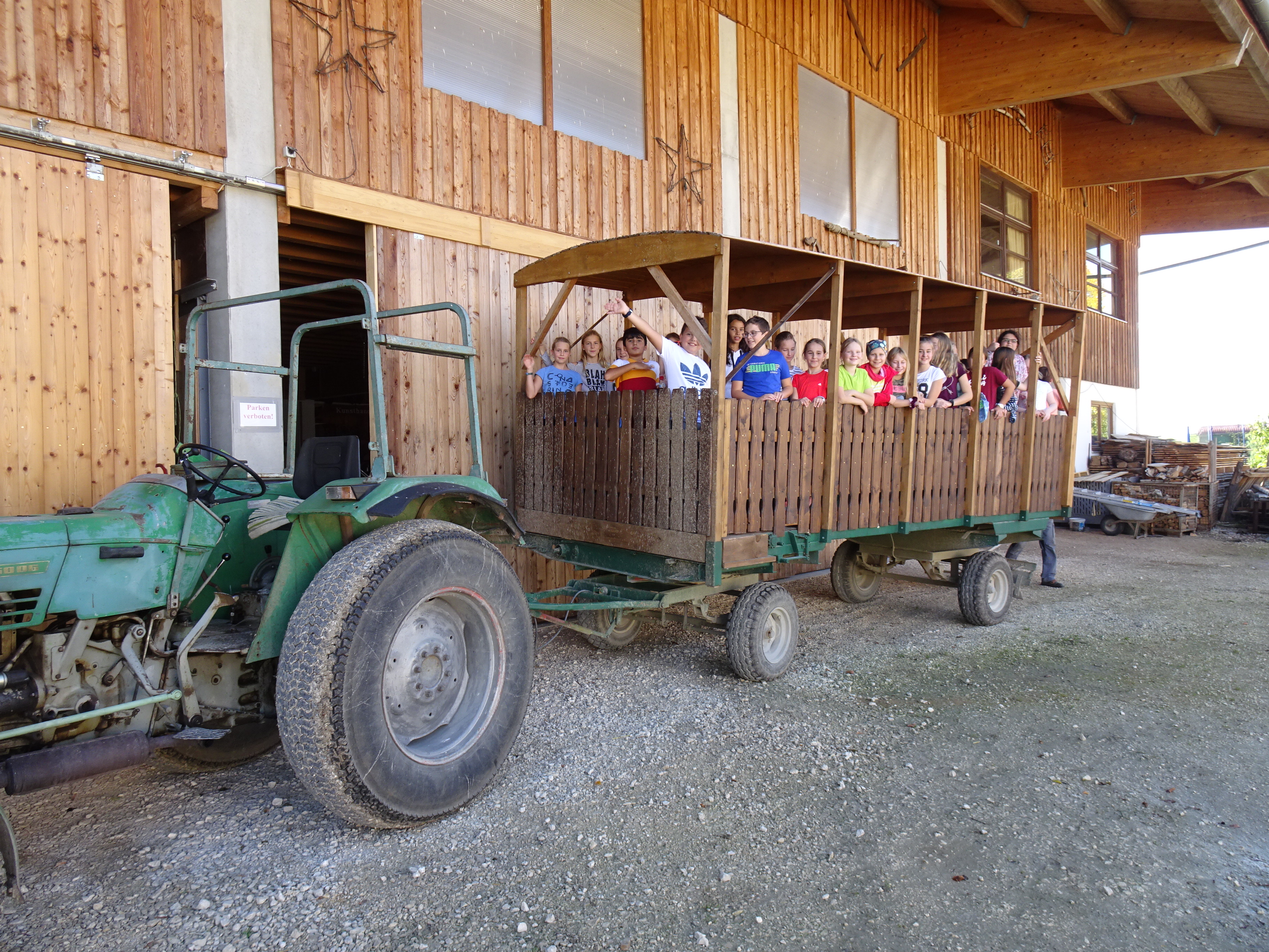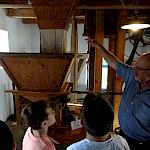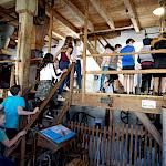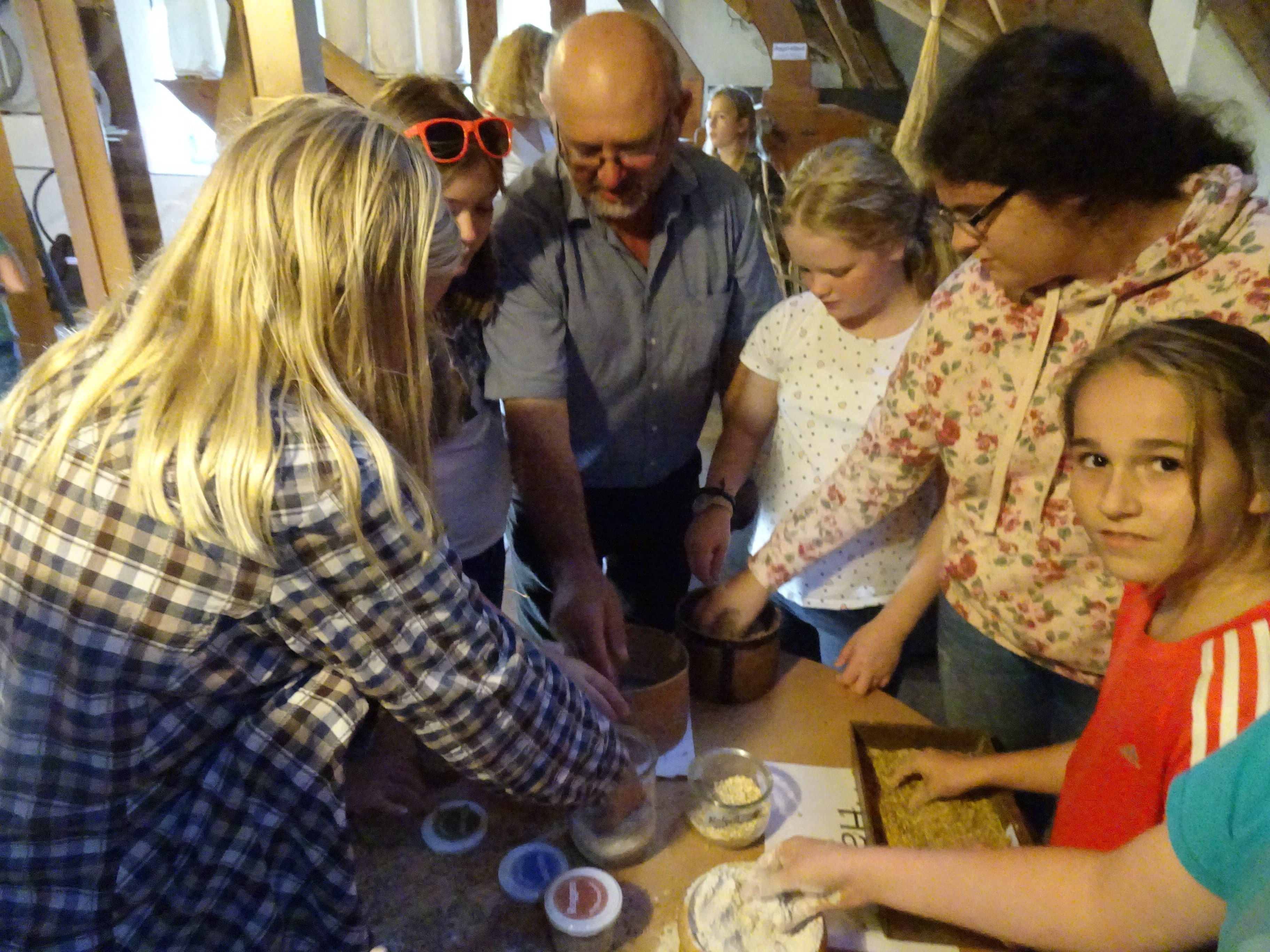 Nach der Ankunft in Mödingen wurde man durch eine Hofführung mit den örtlichen Begebenheiten vertraut gemacht und die Zimmer wurden bezogen. Dann ging es schon los mit dem ersten informativen Programmpunkt, der Mühlenführung. Hier erfuhren die Kinder so einiges über das Müllerhandwerk und durften auch selbst mit anfassen oder ausprobieren. Zur Belohnung gab es ein Bauernhofeis und eine Fahrt mit dem Traktor (s. Foto). Nach einem Fußmarsch und dem Abendessen, wurde gespielt und zum Abschluss eine Nachtwanderung veranstaltet.