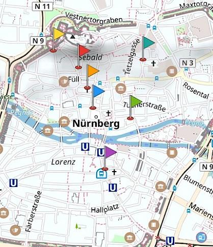 Frühstück, gleich danach Abfahrt nach Nürnberg in eine Trampolinhalle mit Kletterweg (siehe Foto) über den Trampolinen, danach Erkundung der Stadt mittels einer Stadt-Rallye. Man musste die sich auf einer Karte befindlichen Fahnen suchen.