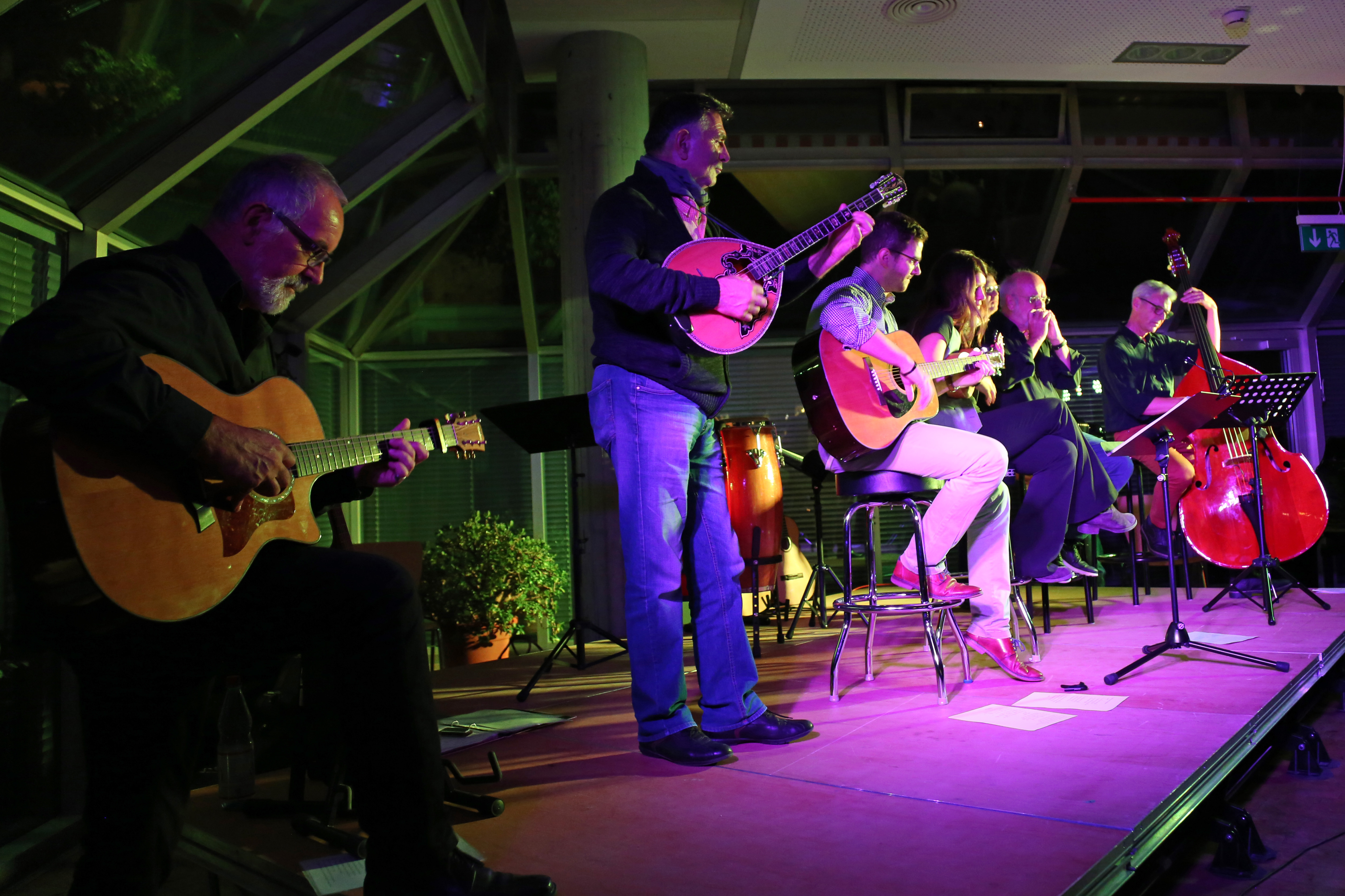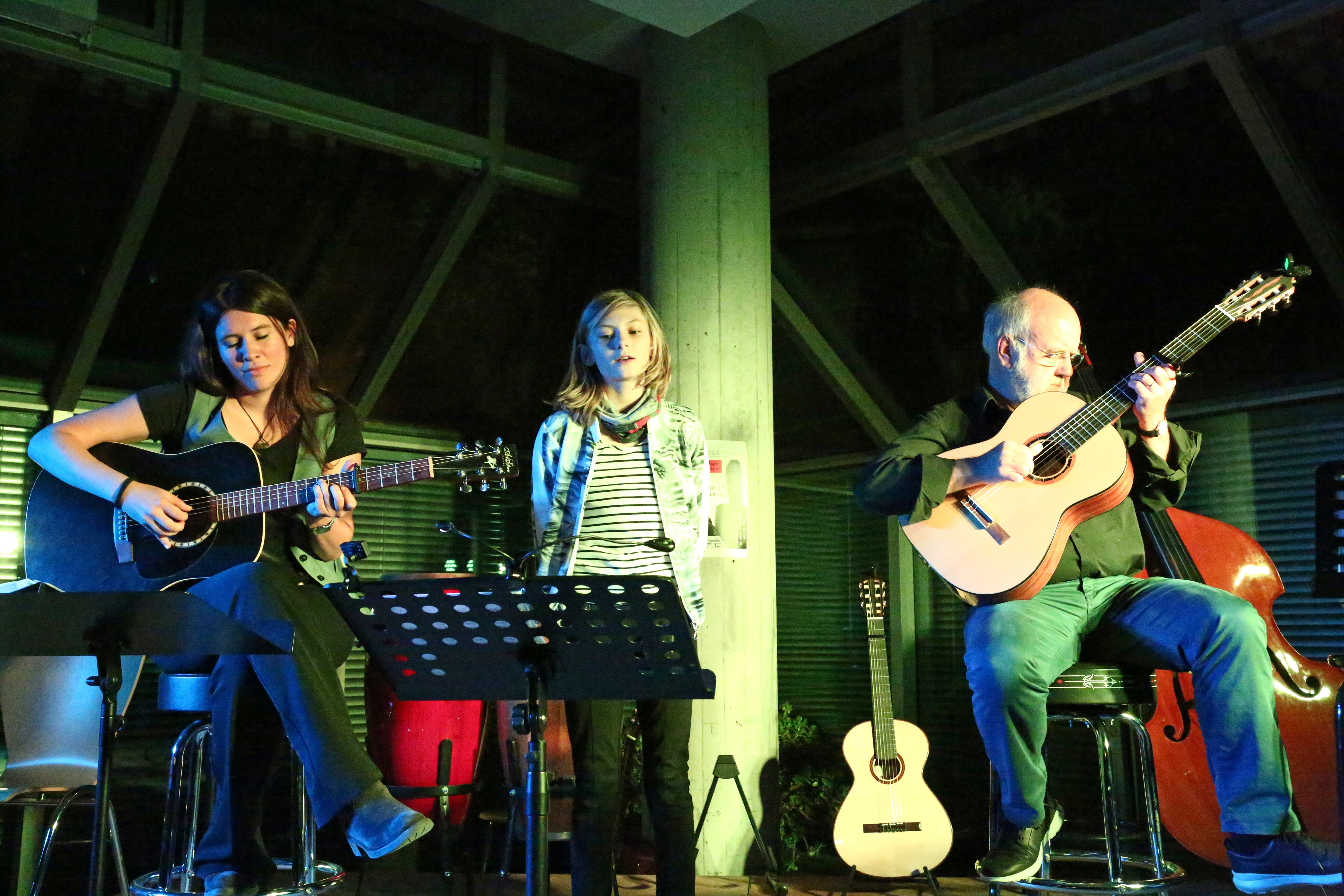 Als am Anfang Leonard Cohens einziger deutscher Top-Ten-Hit „Lover, Lover, Lover“ intoniert wurde, begannen die ersten Zuhörer bereits leise den Refrain mitzusingen. Nichts Neues für die Sängerinnen und Sänger wie Wolfgang Weiss, Ricarda Rickert und Assi Antoniuk, die schon beinahe zum Inventar dieser Reihe zählen. Genauso wie Gerd Schock, seines Zeichens aktiver Lehrer am WeG, der mit seinem Kontrabass und der Gitarre oftmals für die leiseren, melodiösen Töne sorgt. Zusammen mit seinem jungen Kollegen Dirk Kassel brachte er unter anderem Pink Floyds „Grantchester Meadows“ in einer Accoustic-Version zu Gehör.