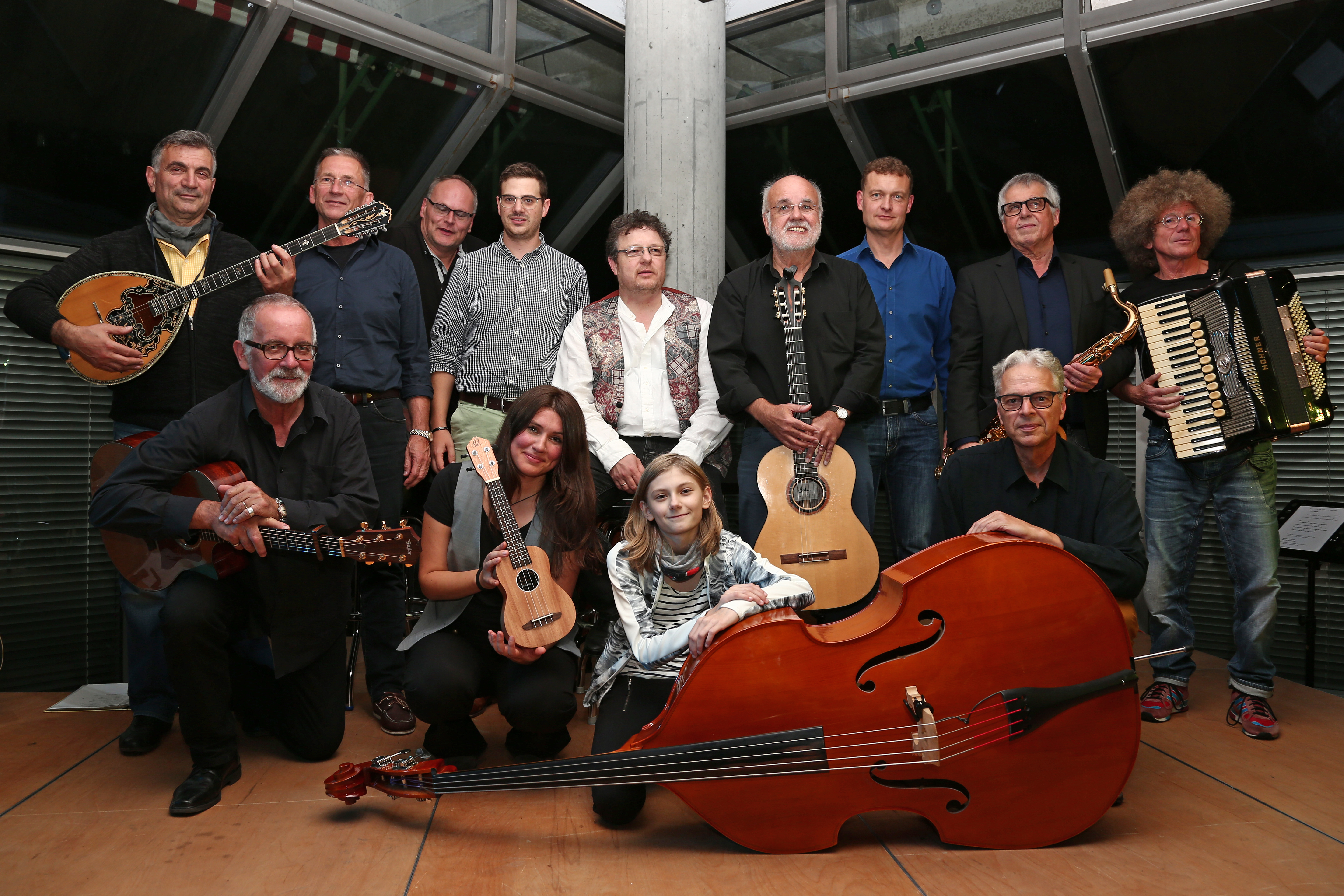 Letzte Proben vor dem eigentlichen Auftritt: Einige Songs werden nochmals angespielt. Dazwischen das Geräusch von Stühlen und Tischen, die umhergerückt werden. Daneben fleißige Hände am Fingerfood-Buffet und gleichzeitig kommen schon die ersten Gäste. Ein fröhliches Hallo, Umarmungen, Alt trifft auf Jung, ehemalige Lehrer freuen sich über ein Wiedersehen mit den früheren Kollegen. Eltern und Schüler in einem lockeren Plausch untereinander. Kurz gesagt: beinahe wie ein Familientreffen. Diese besondere Atmosphäre kennzeichnet wohl am besten diese generationsübergreifende Veranstaltung, bei der vom 12-jährigen Schüler bis zum 75-jährigen Großvater alle Zuhörer auf ihre Kosten kommen.