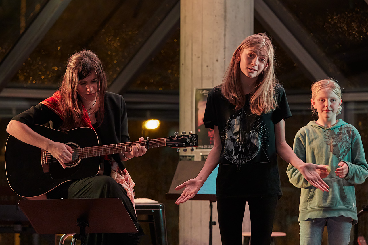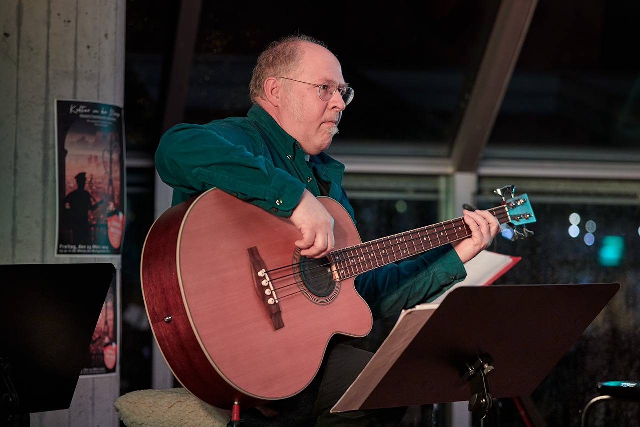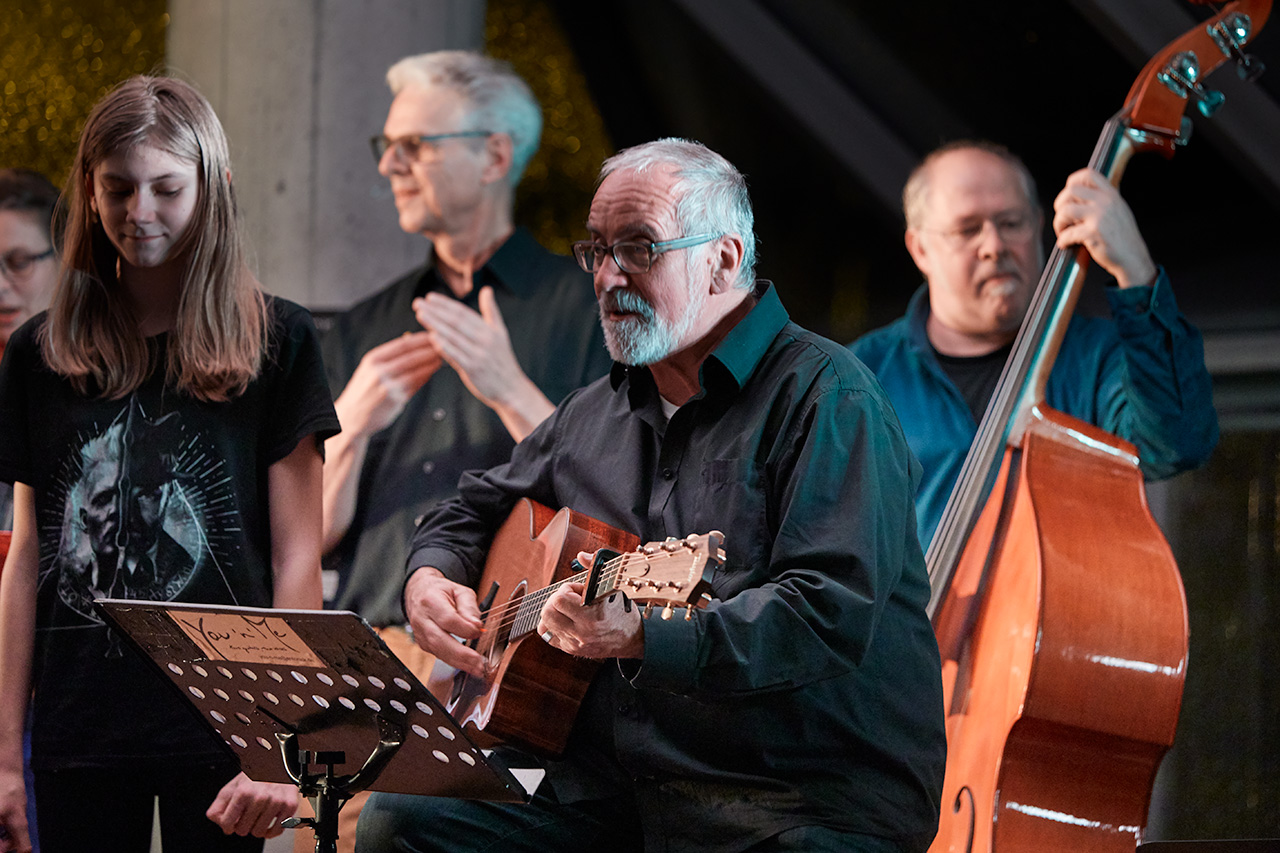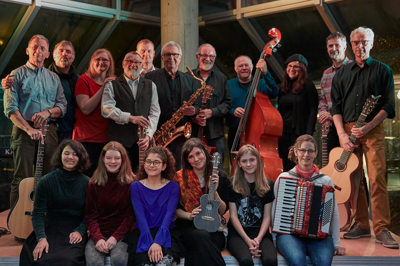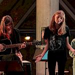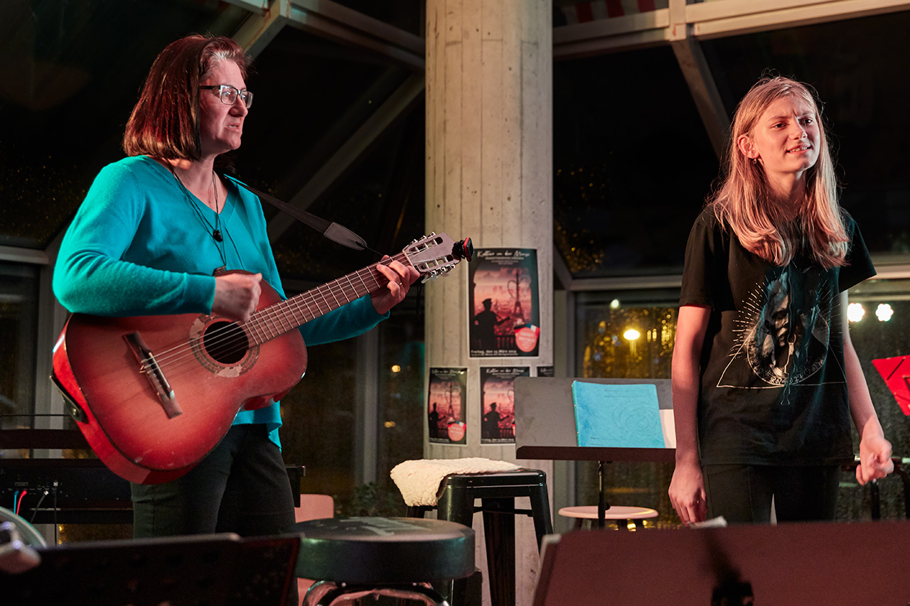 Schließlich war es Zeit für den deutschen Teil. Dass auch Lieder, die zwanzig Jahre alt sind, hochaktuell sein können, zeigte Reinhard Meys „Narrenschiff“, das Michael Loessin mit der Hilfe von Gerd Schock, Johannes Fiedler und Petra Schwab präsentierte. Anna Hank aus der Jahrgangstufe 7 war schon zum wiederholten Male dabei; sie sang „Je ne parle pas français“ von Namika und eine Eigenkomposition: „Du bist ein Geschenk“, begleitet von Mia Hitzler sowie Ricarda Rickert und ihrer Mutter an der Gitarre. Reinhard Mey hat auf seinem letzten Album den ironisch–witzigen Titel „Herr Fellmann, Bonsai und ich“ veröffentlicht, von dem Gerd Schock und Johannes Fiedler eine höchst amüsante Version vortrugen. Zum Schluss versammelten sich alle Akteure auf der Bühne, um Zupfgeigenhansels Lied „Miteinander“ zu intonieren, bei dem fleißig mitgesungen wurde. Die lautstark geforderte Zugabe, Reinhard Meys „Gute Nacht Freunde“ schloss einen für alle Beteiligten - Zuhörer wie Akteure - harmonischen und vergnüglichen musikalischen Abend ab, dem sicher weitere folgen werden.