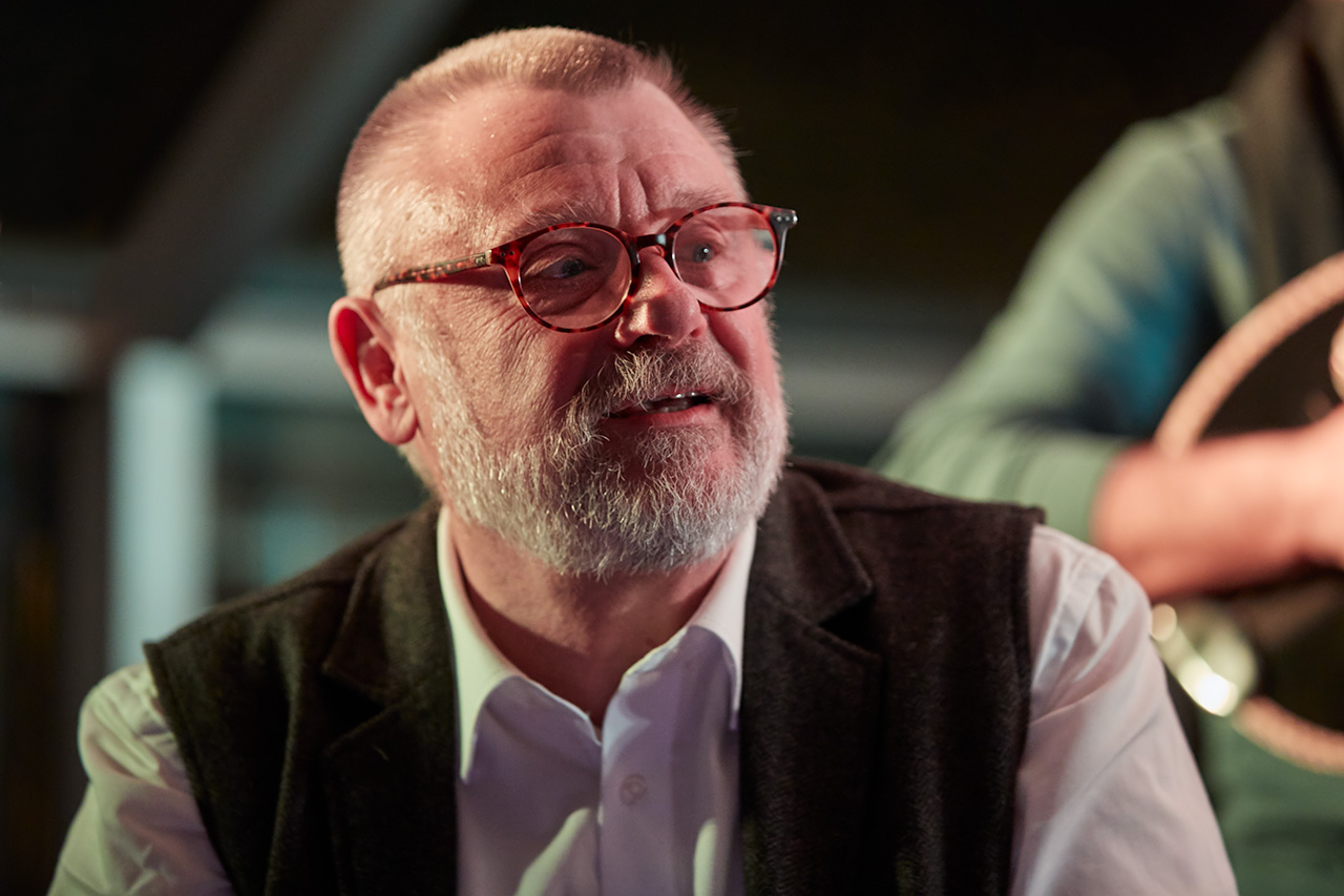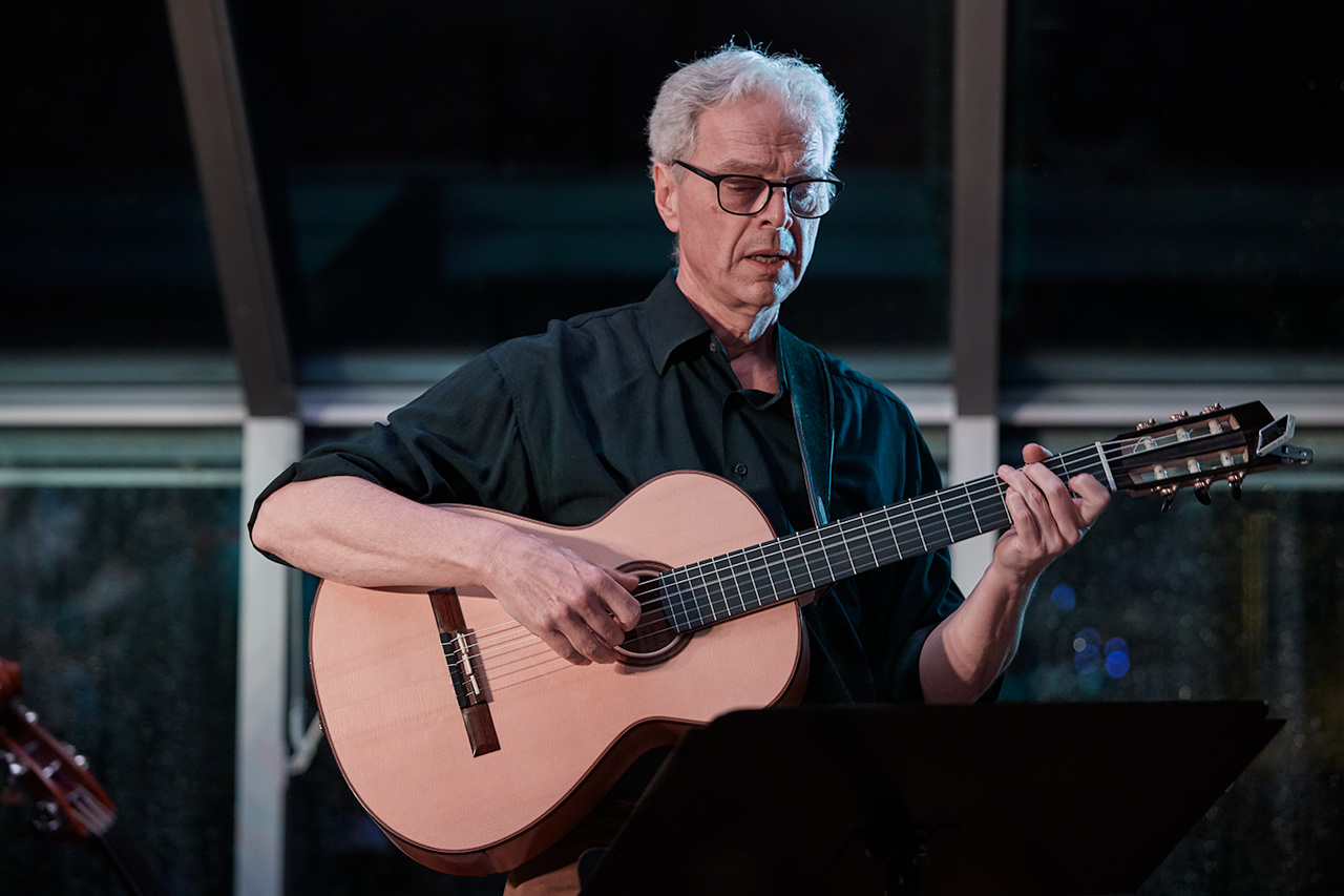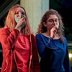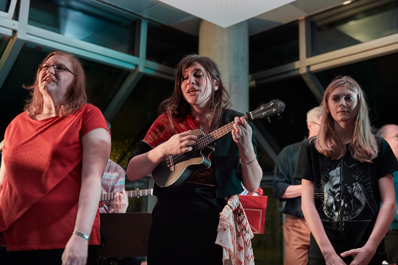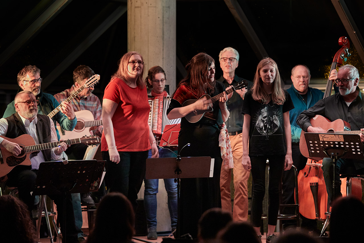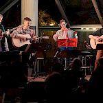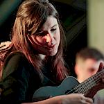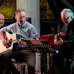 Schließlich war es Zeit für den deutschen Teil. Dass auch Lieder, die zwanzig Jahre alt sind, hochaktuell sein können, zeigte Reinhard Meys „Narrenschiff“, das Michael Loessin mit der Hilfe von Gerd Schock, Johannes Fiedler und Petra Schwab präsentierte. Anna Hank aus der Jahrgangstufe 7 war schon zum wiederholten Male dabei; sie sang „Je ne parle pas français“ von Namika und eine Eigenkomposition: „Du bist ein Geschenk“, begleitet von Mia Hitzler sowie Ricarda Rickert und ihrer Mutter an der Gitarre. Reinhard Mey hat auf seinem letzten Album den ironisch–witzigen Titel „Herr Fellmann, Bonsai und ich“ veröffentlicht, von dem Gerd Schock und Johannes Fiedler eine höchst amüsante Version vortrugen. Zum Schluss versammelten sich alle Akteure auf der Bühne, um Zupfgeigenhansels Lied „Miteinander“ zu intonieren, bei dem fleißig mitgesungen wurde. Die lautstark geforderte Zugabe, Reinhard Meys „Gute Nacht Freunde“ schloss einen für alle Beteiligten - Zuhörer wie Akteure - harmonischen und vergnüglichen musikalischen Abend ab, dem sicher weitere folgen werden.