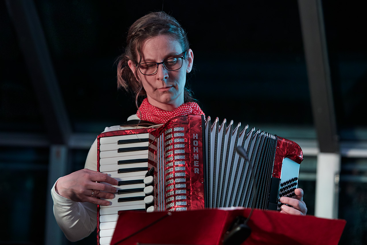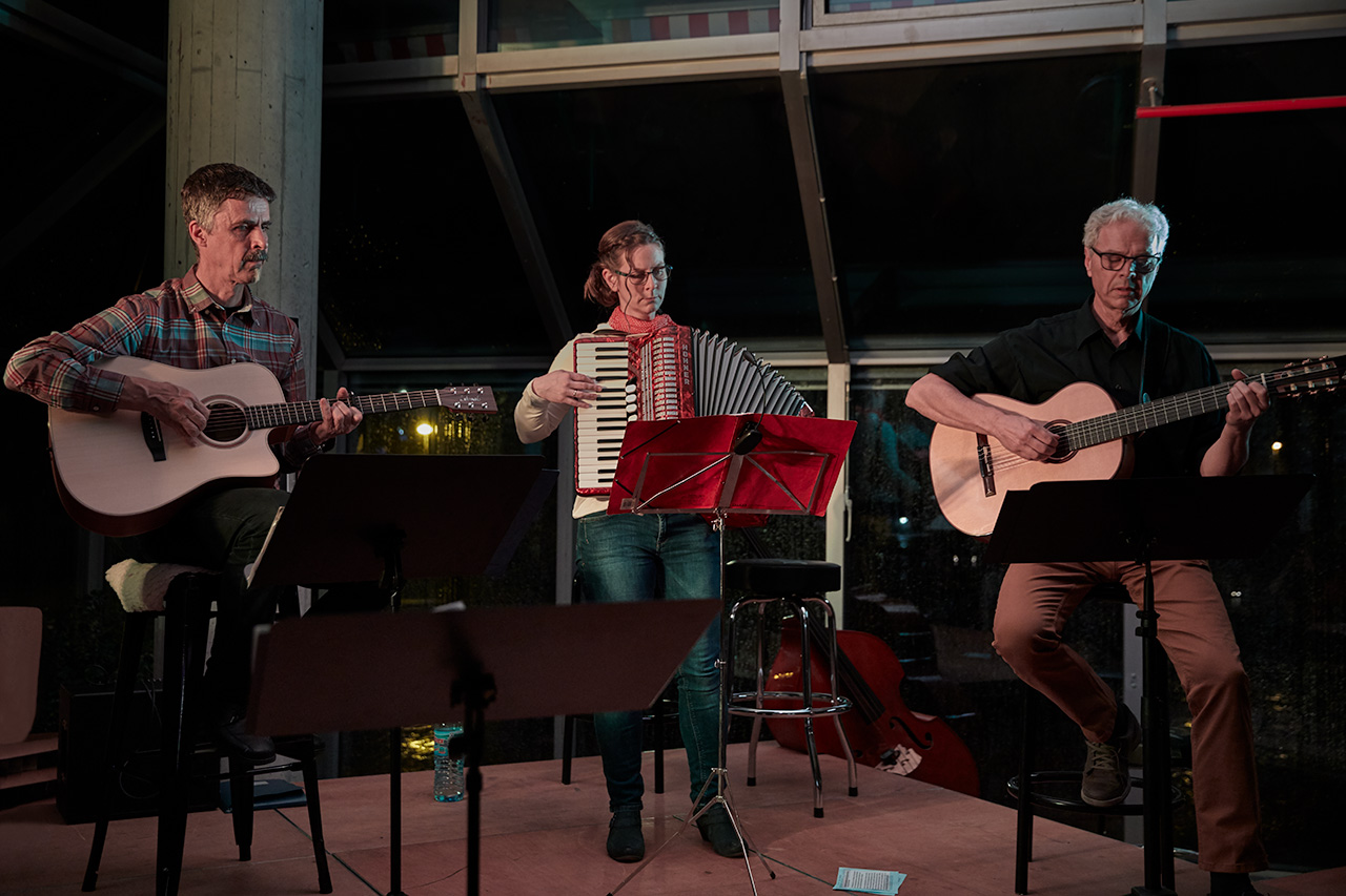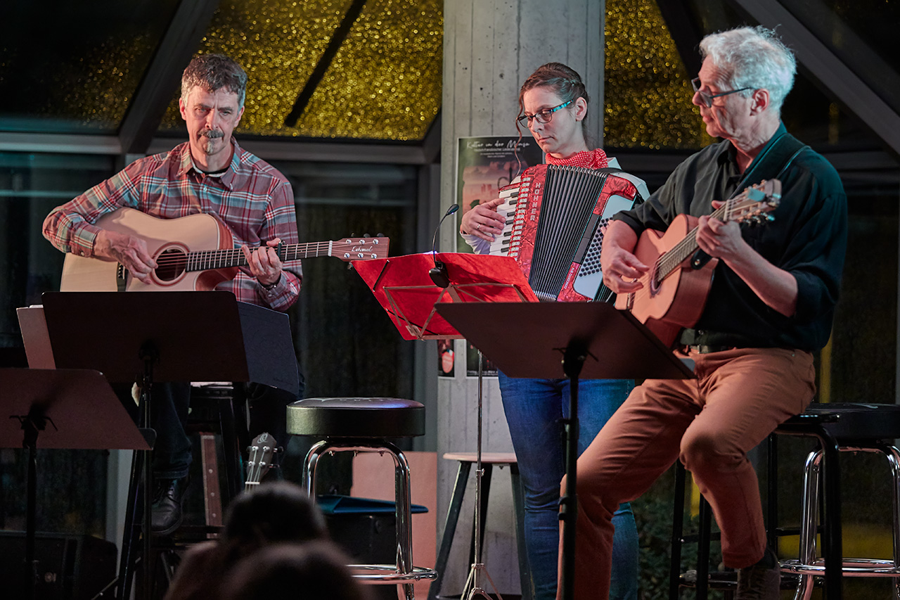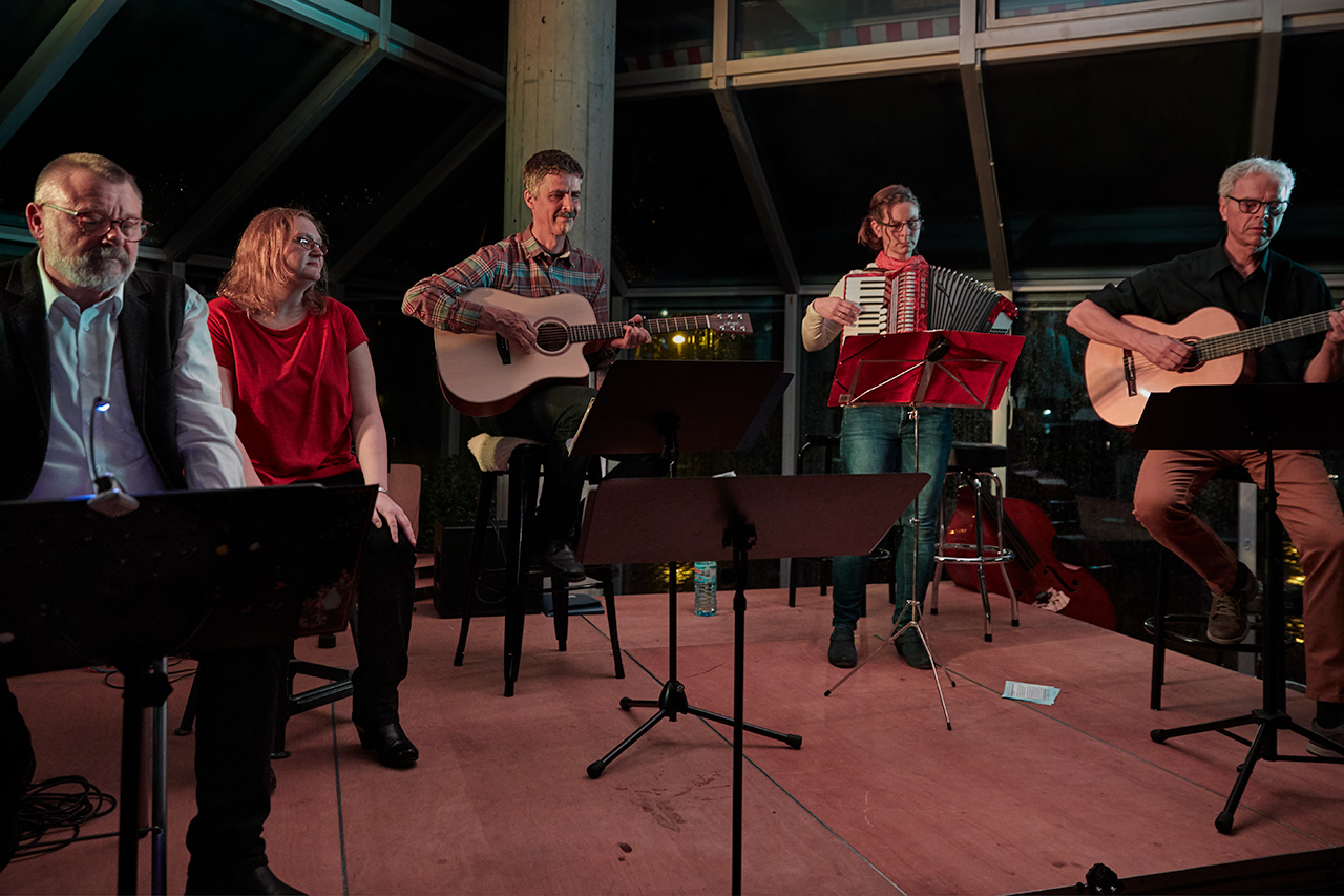 Für die „live lyrics“ sorgte Michael Loessin, der auch den Abend moderierte. Die griechischen Wurzeln Moustakis machte Vassilios Jakovidis mit seiner Bouzuki hörbar und einen sanften Klangteppich legte das Akkordeon von Antje Hofmann, die zusammen mit Gerd Schock am Kontrabass auch den Klassiker „Je ne regrette rien“ von Edith Piaf begleitete, den Petra Schwab souverän präsentierte. Dann übernahmen Ricarda Rickert den Gesangspart und eine Combo aus Andreas Antoniuk, Werner Lehmann und Alexander Spohn die Begleitung. Die enorme Bandbreite der Sängerin zeigte sich in so verschiedenen Titeln wie „On était beau“ von Louane, „Que vendra" vom neuen Album von Zaz und Michel Polnareffs Klassiker aus den 60ern: „La poupée qui fait non“.
