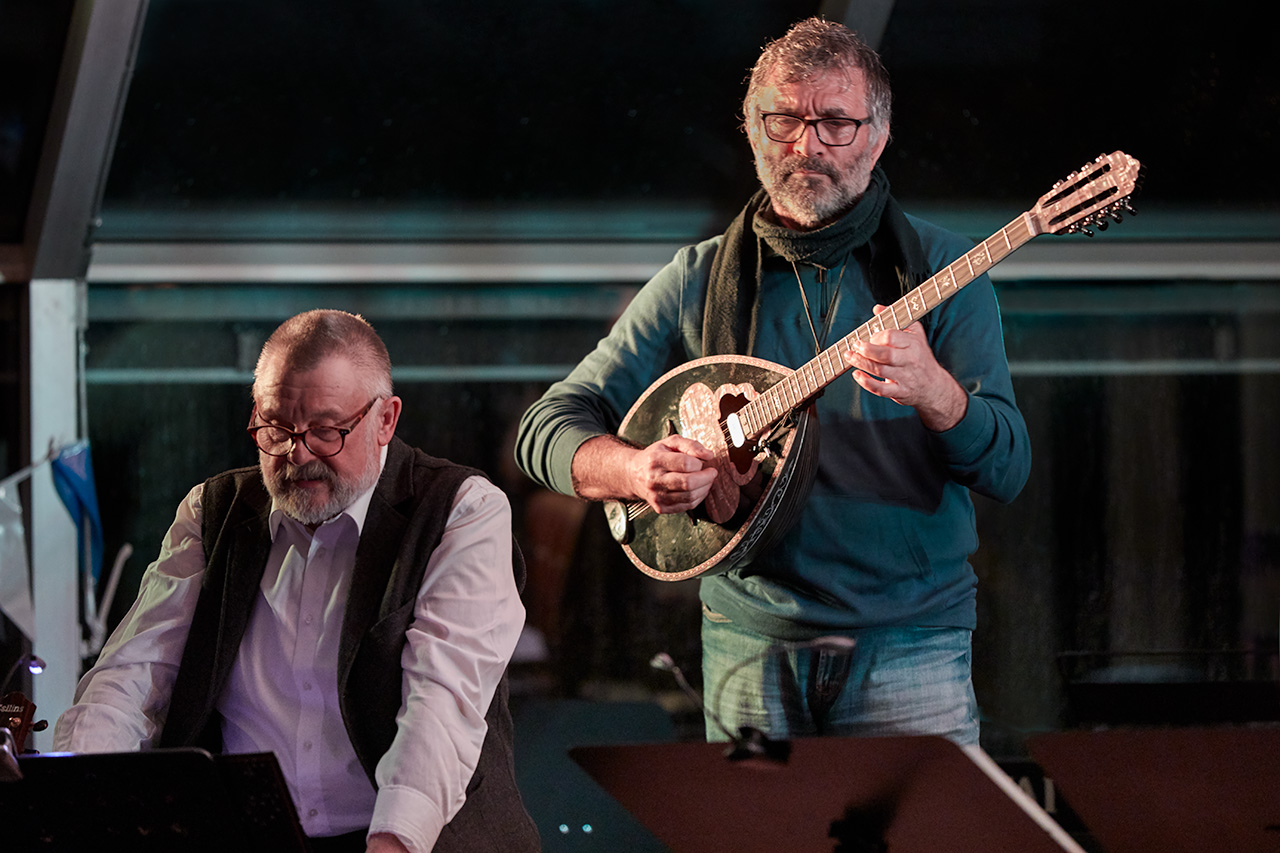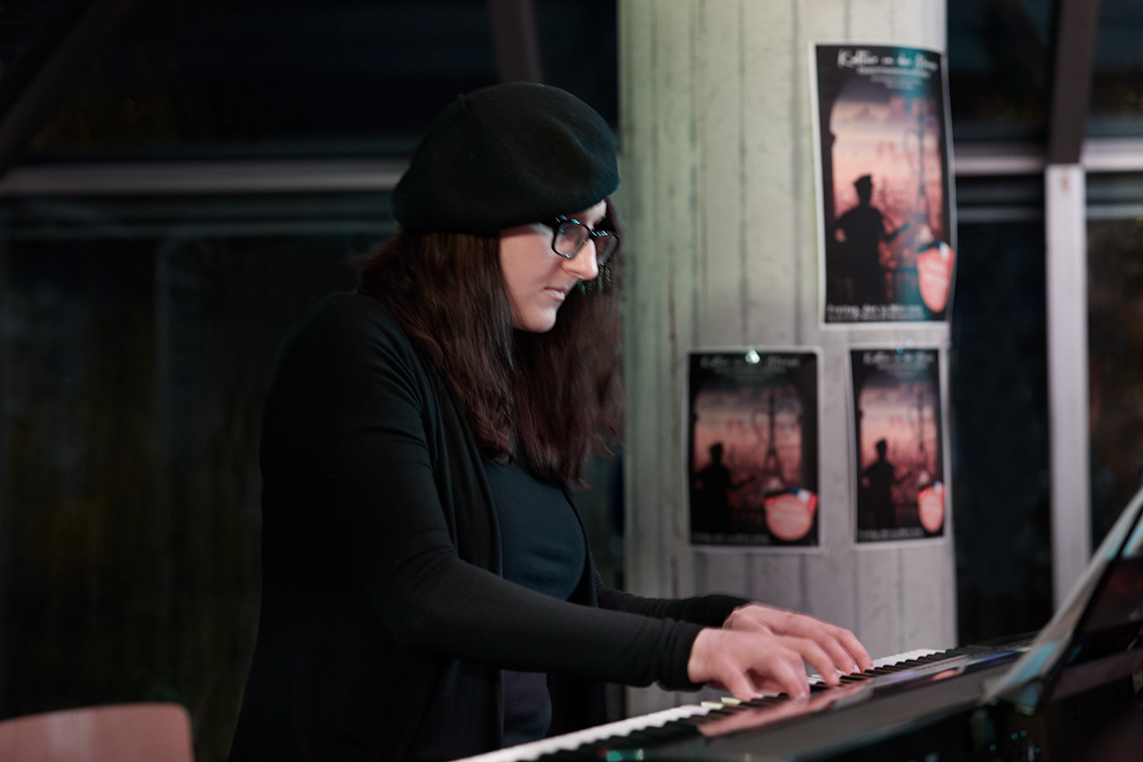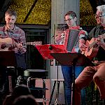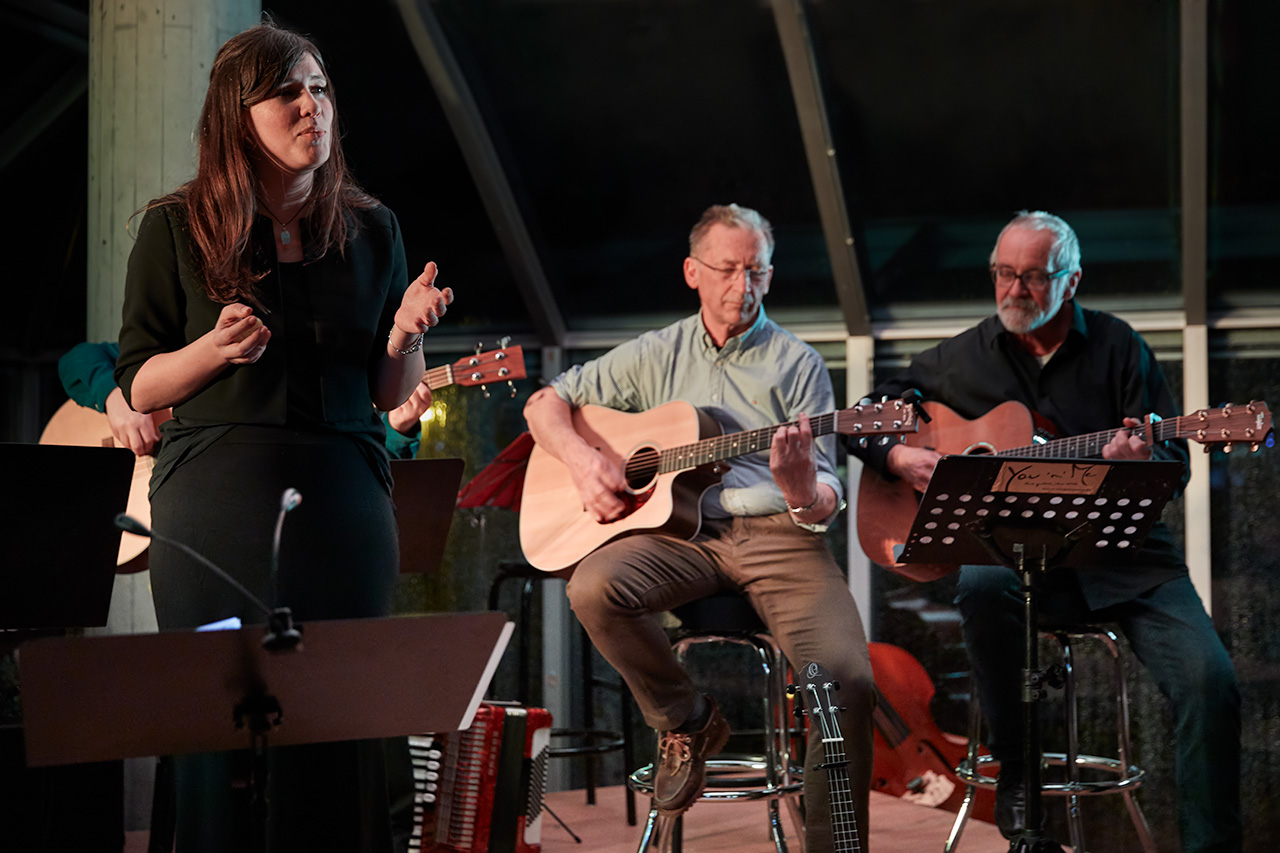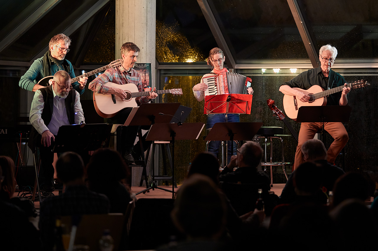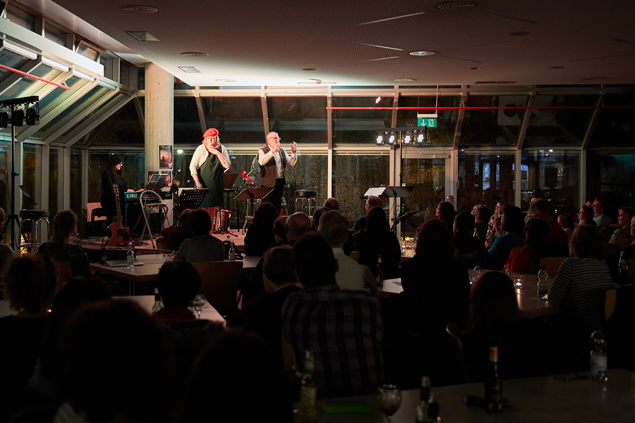 Für die „live lyrics“ sorgte Michael Loessin, der auch den Abend moderierte. Die griechischen Wurzeln Moustakis machte Vassilios Jakovidis mit seiner Bouzuki hörbar und einen sanften Klangteppich legte das Akkordeon von Antje Hofmann, die zusammen mit Gerd Schock am Kontrabass auch den Klassiker „Je ne regrette rien“ von Edith Piaf begleitete, den Petra Schwab souverän präsentierte. Dann übernahmen Ricarda Rickert den Gesangspart und eine Combo aus Andreas Antoniuk, Werner Lehmann und Alexander Spohn die Begleitung. Die enorme Bandbreite der Sängerin zeigte sich in so verschiedenen Titeln wie „On était beau“ von Louane, „Que vendra" vom neuen Album von Zaz und Michel Polnareffs Klassiker aus den 60ern: „La poupée qui fait non“.