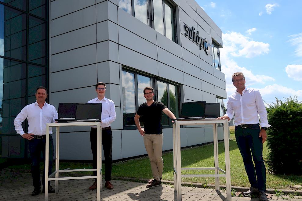 unser Bild zeigt von links nach rechts: Ralf Lenk (Technik / Mitglied der Geschäftsleitung), Oliver Hoffmann (Technik / Auszubildender IT-Systeme), Lukas Meyer-Hilberg, Markus Speiser (Geschäftsführer)