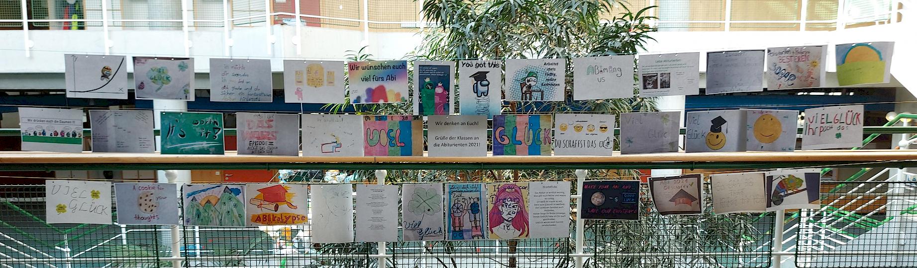 Im Treppenhaus hängen Wünsche! Wünsche von Schülerinnen und Schülern, die den Abis für dieses Jahr ganz besonders alles Gute wünschen! Weil Ihr gerade ja nicht viel im Haus sein könnt, schicken wir Euch die Grüße über unsere Homepage nach Hause. Damit Ihr sie nicht erst an den Prüfungstagen, sondern auch schon vorher zum Ansporn und zur Motivation sehen könnt. Ganz lieben Dank an Frau Löffler für diese schöne Idee und die Umsetzung!!!