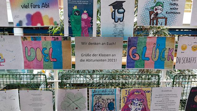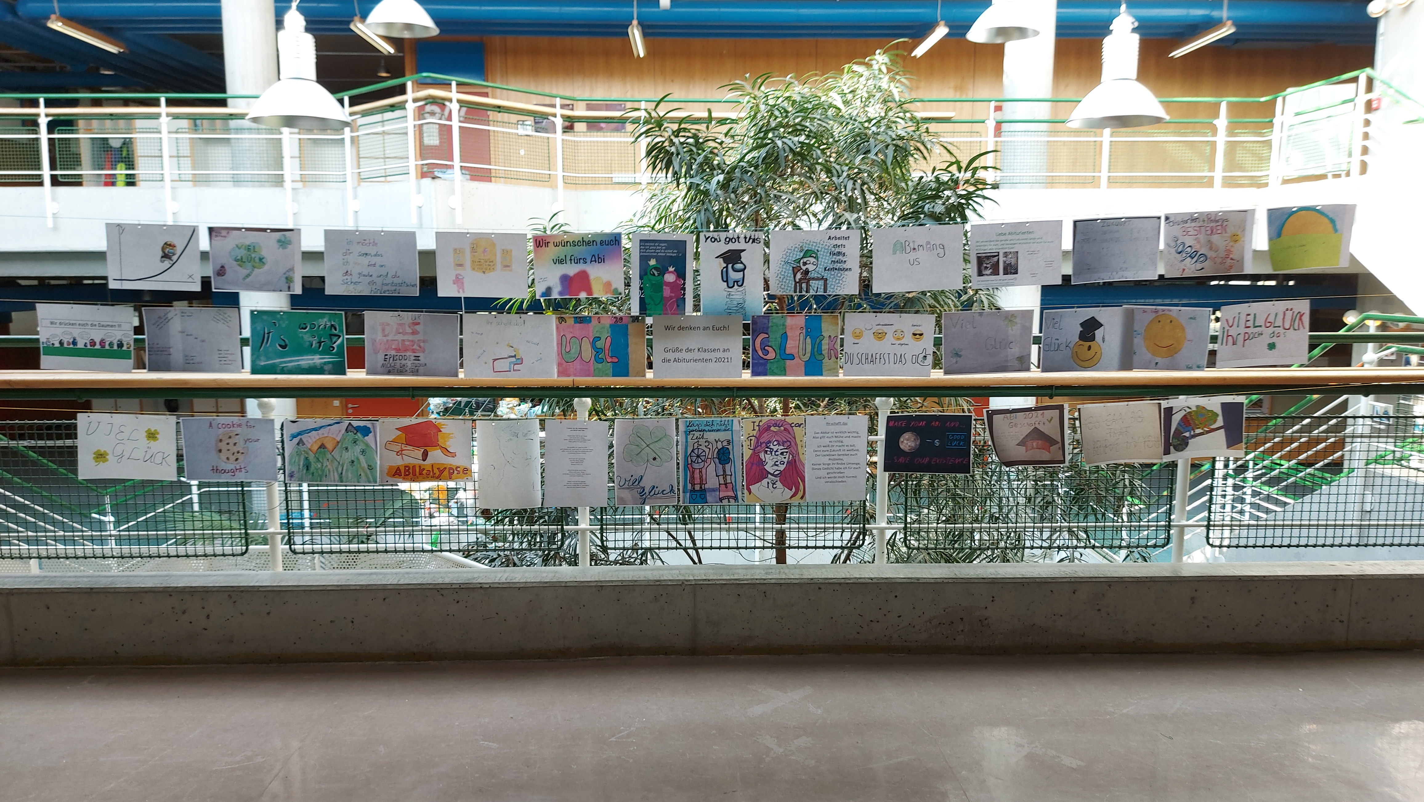 Im Treppenhaus hängen Wünsche! Wünsche von Schülerinnen und Schülern, die den Abis für dieses Jahr ganz besonders alles Gute wünschen! Weil Ihr gerade ja nicht viel im Haus sein könnt, schicken wir Euch die Grüße über unsere Homepage nach Hause. Damit Ihr sie nicht erst an den Prüfungstagen, sondern auch schon vorher zum Ansporn und zur Motivation sehen könnt. Ganz lieben Dank an Frau Löffler für diese schöne Idee und die Umsetzung!!!