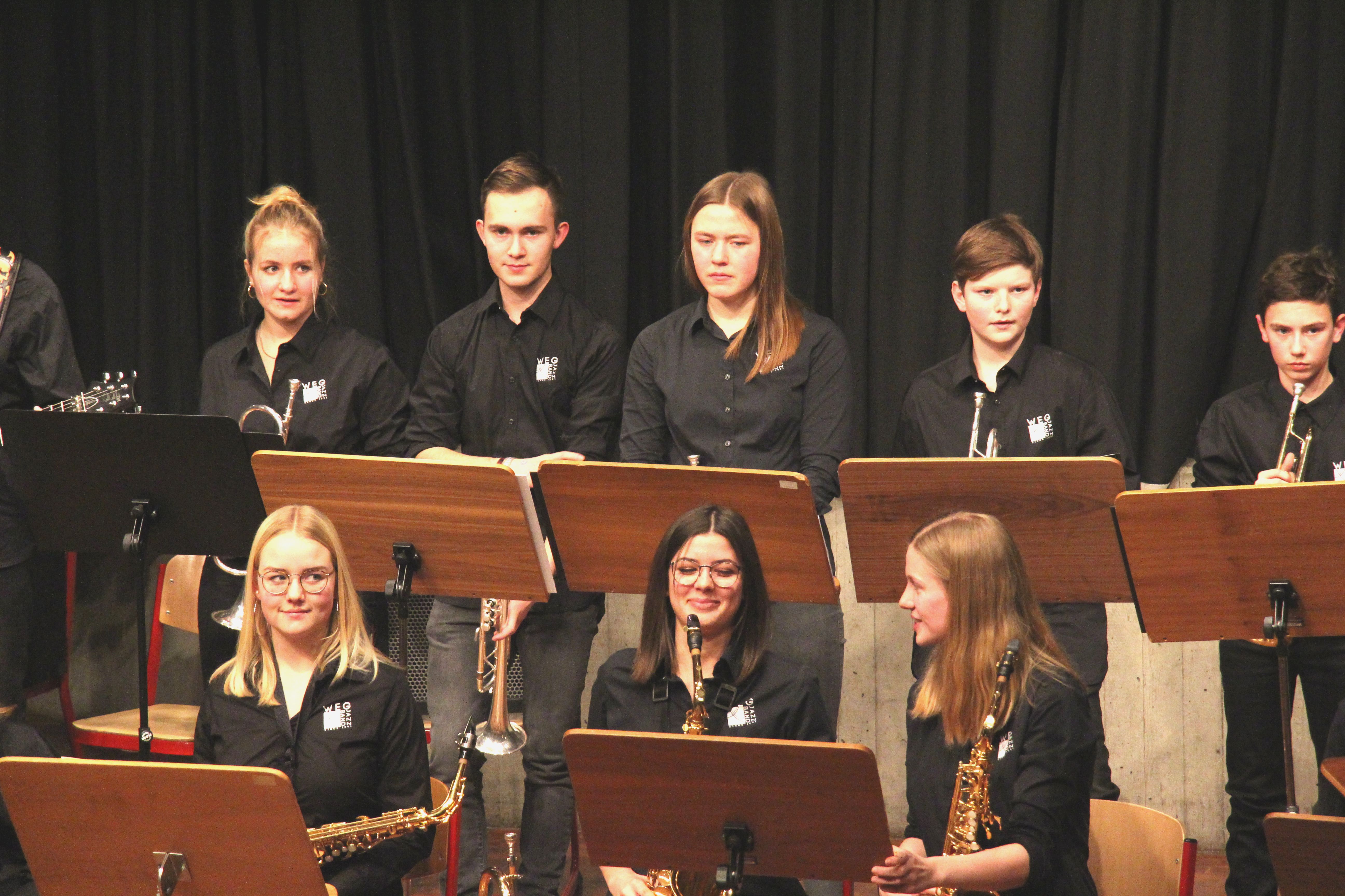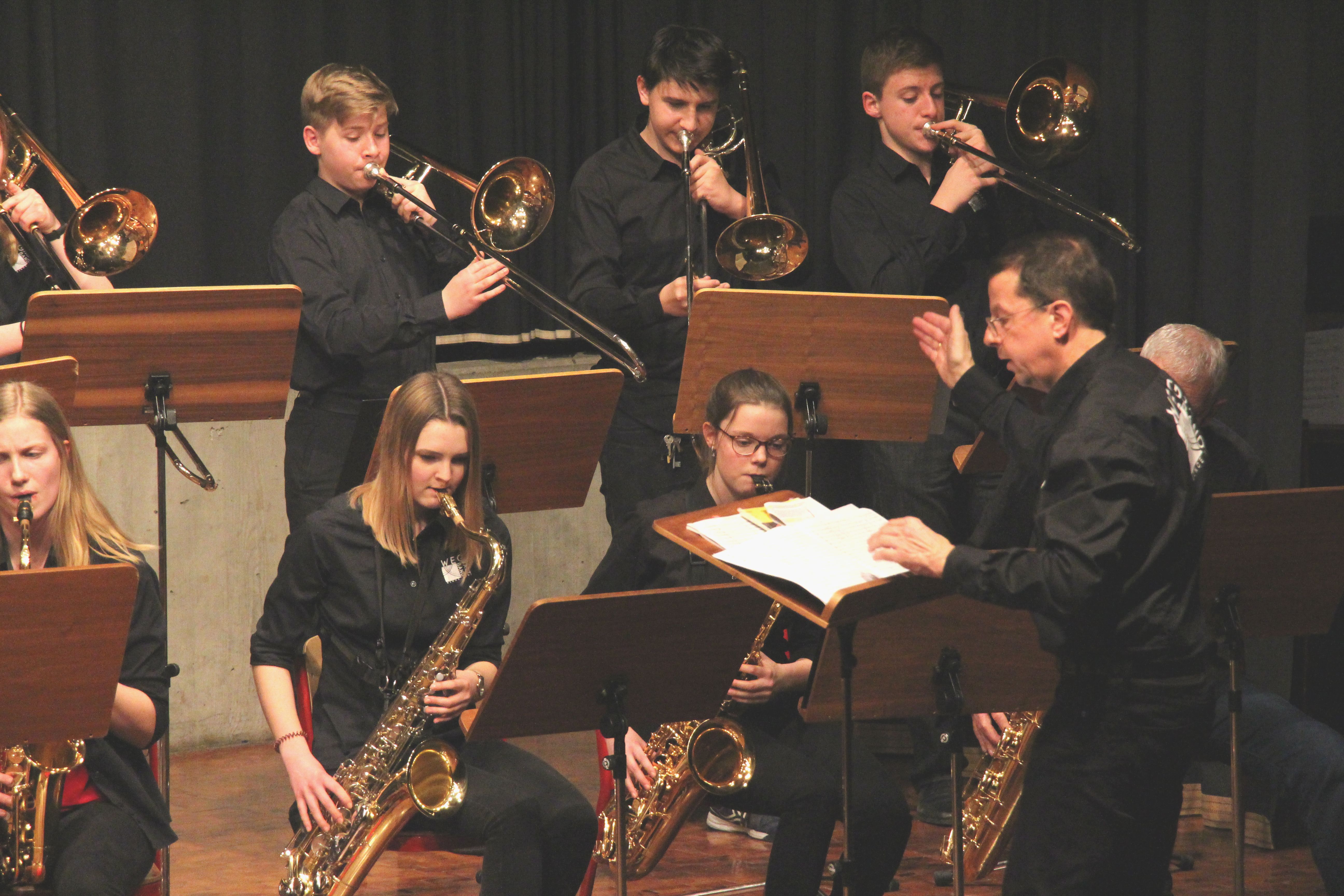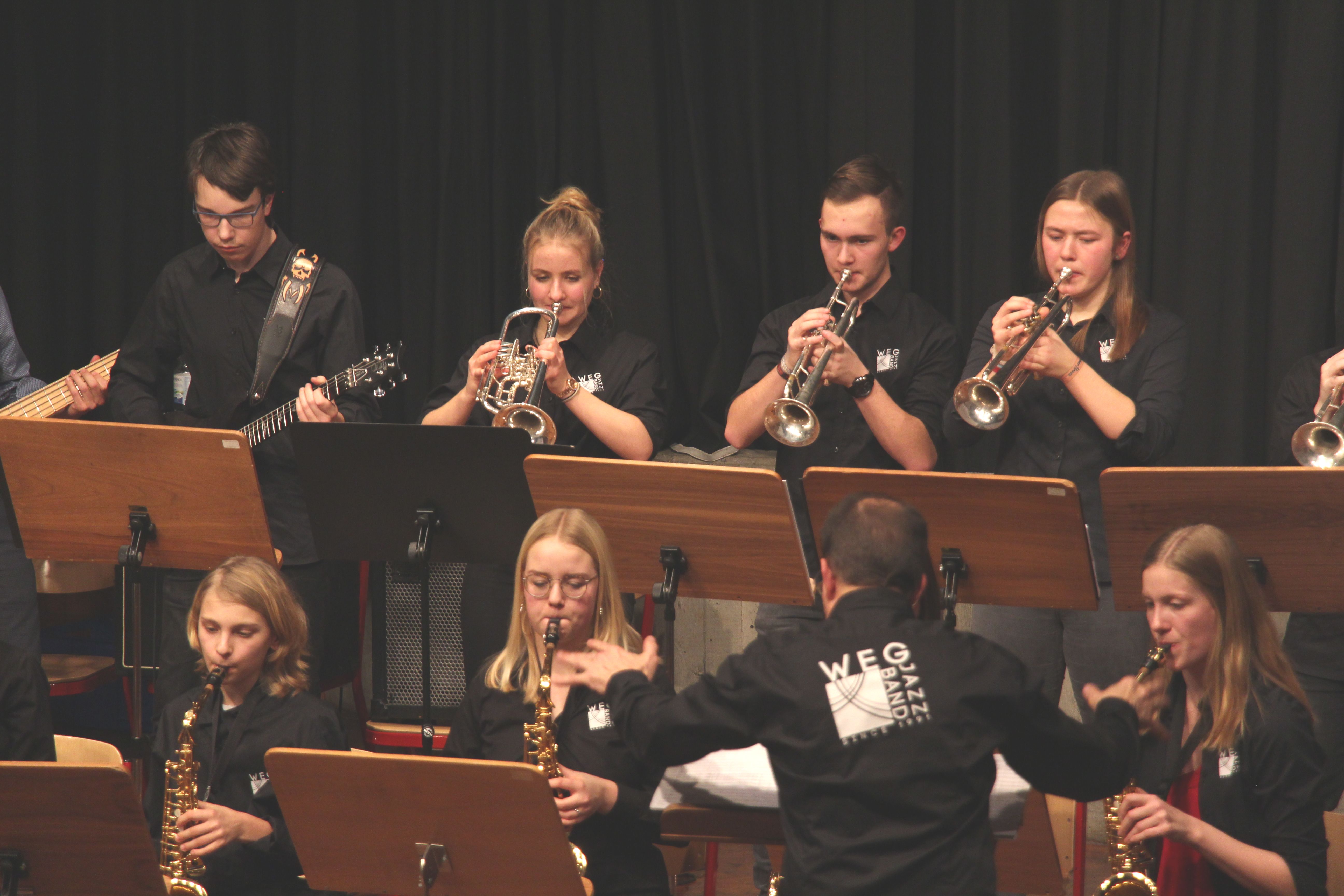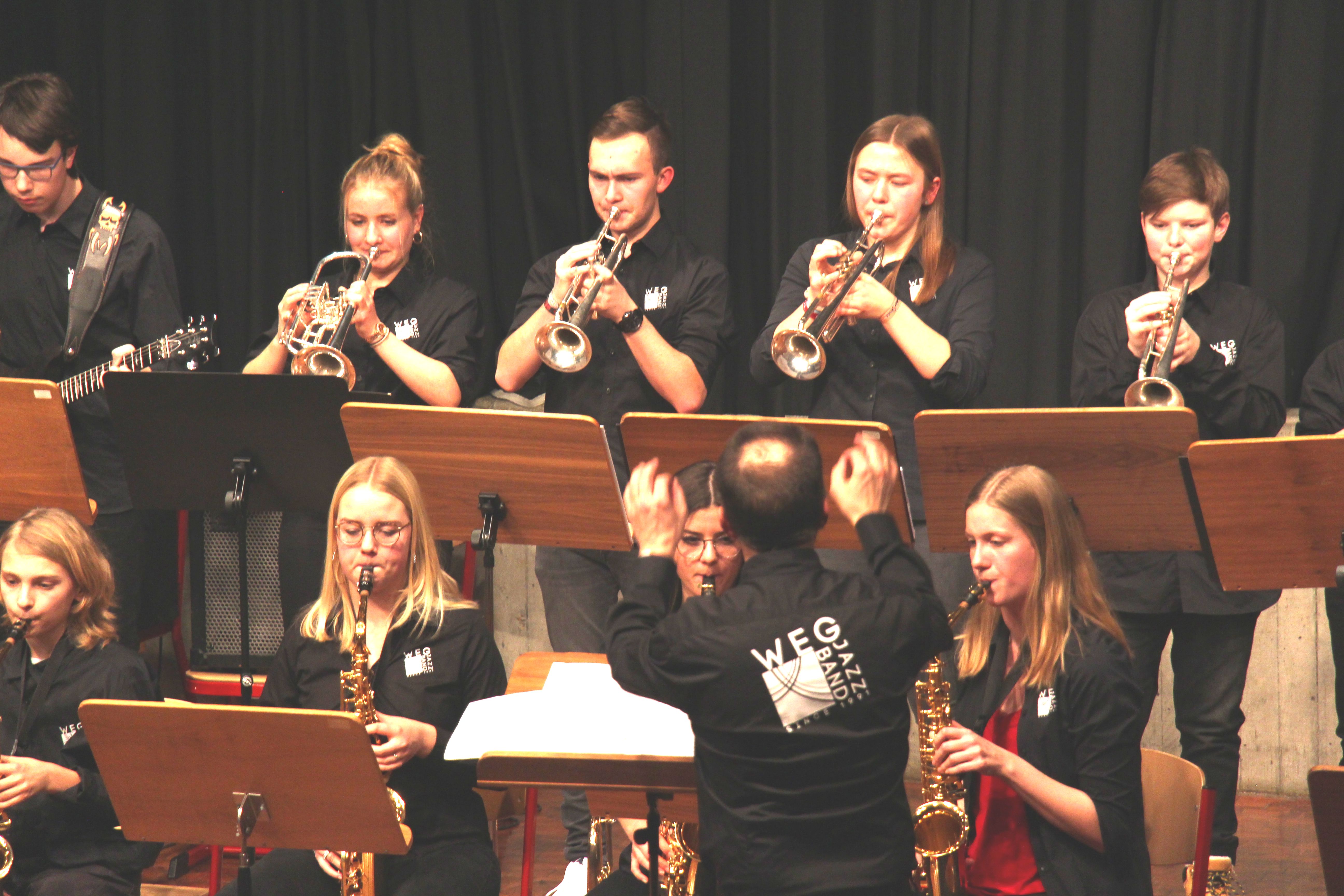 Die Stabübergabe an die „WeG-Jazzband“ erfolgte im Anschluss mit "Pick Up the Pieces", zu dem Harry Berger für sein Saxophonensemble ein Vorspiel komponiert hat, welches von der „WeG-Jazzband“ aufgegriffen und weitergeführt wurde. Dabei zeigte Nina Grether in ihrem Improvisationsteil, zu welchen tollen Leistungen sie mit ihrem Altsaxophon fähig ist. Auch in den folgenden Stücken konnten die Jugendlichen der „WeG-Jazzband“ zeigen, wozu sie solistisch fähig sind: Jonathan Schied improvisierte in der bekannten Ballade „Autumn leaves“ mit seiner Posaune, in Spencer Williams „Basin street blues“ zeigte sich Charlotte Riedel als Stimmführerin des Trompetenregisters in bester Form, während in „Crazy little thing called love“, einem Song der Rockgruppe Queen, wiederum Nina Grether als Solistin hervortrat. Cyndi Laupers lyrisches „Time after time“ wurde ebenfalls sehr einfühlsam, von Emely Brehm begleitet.