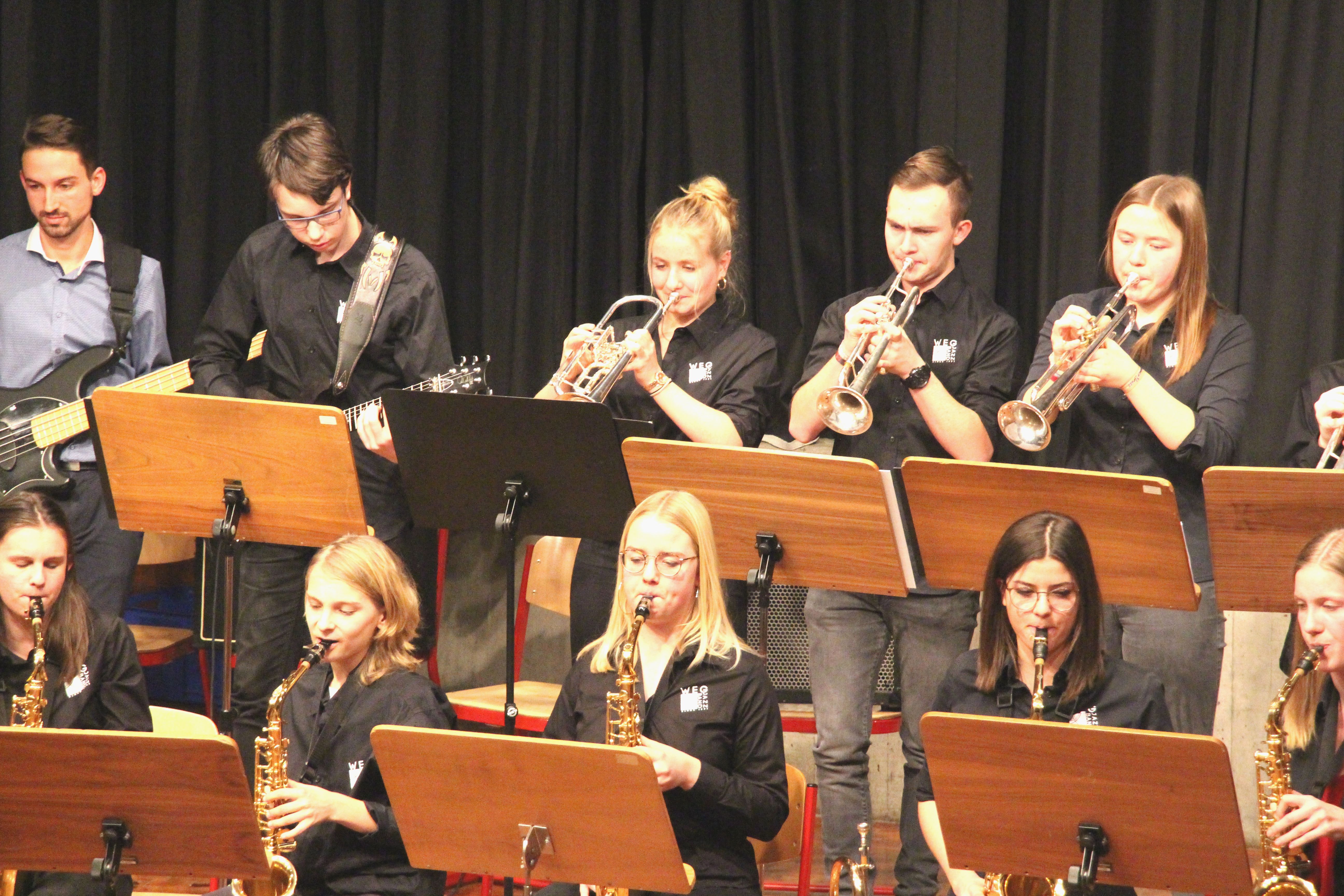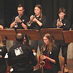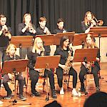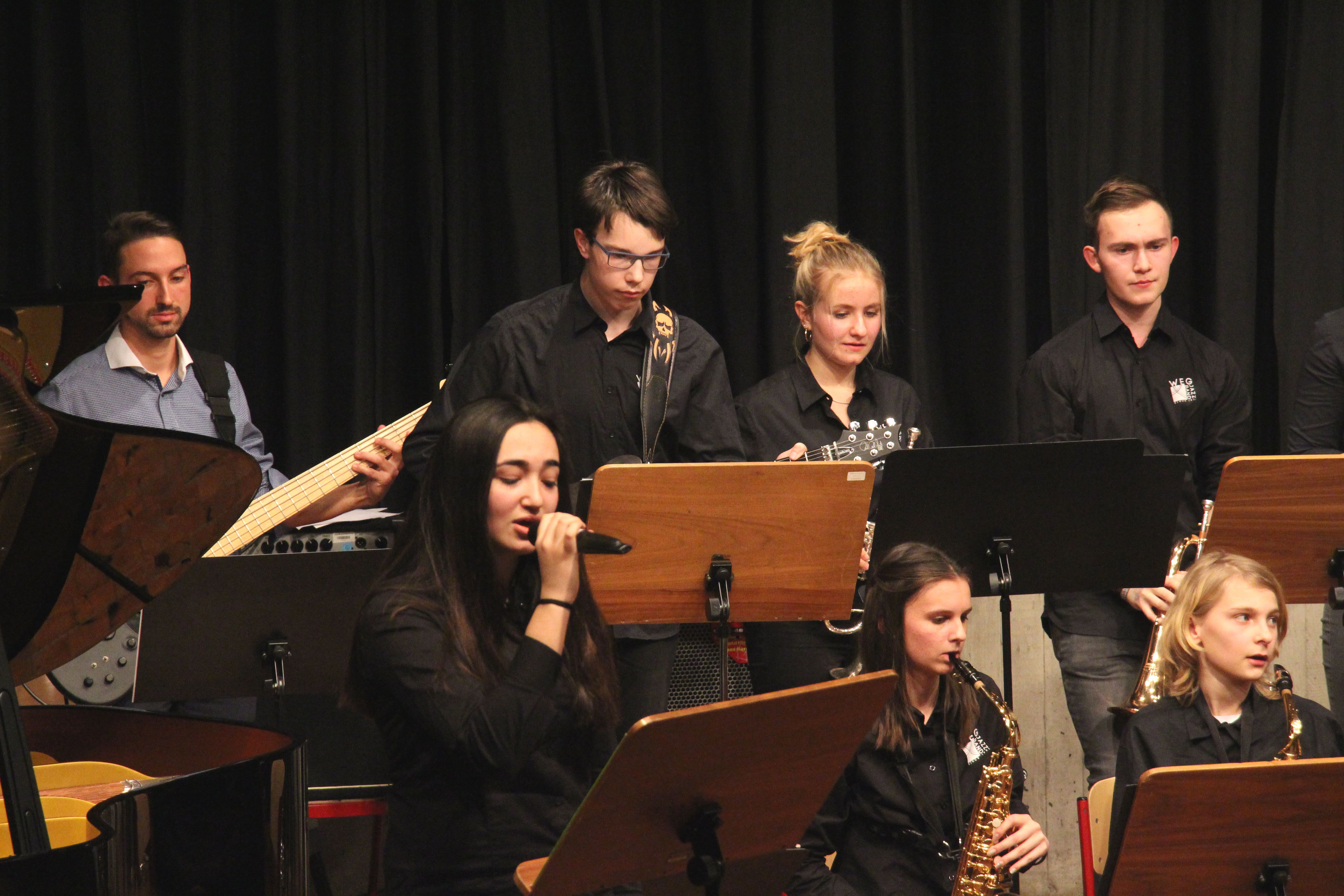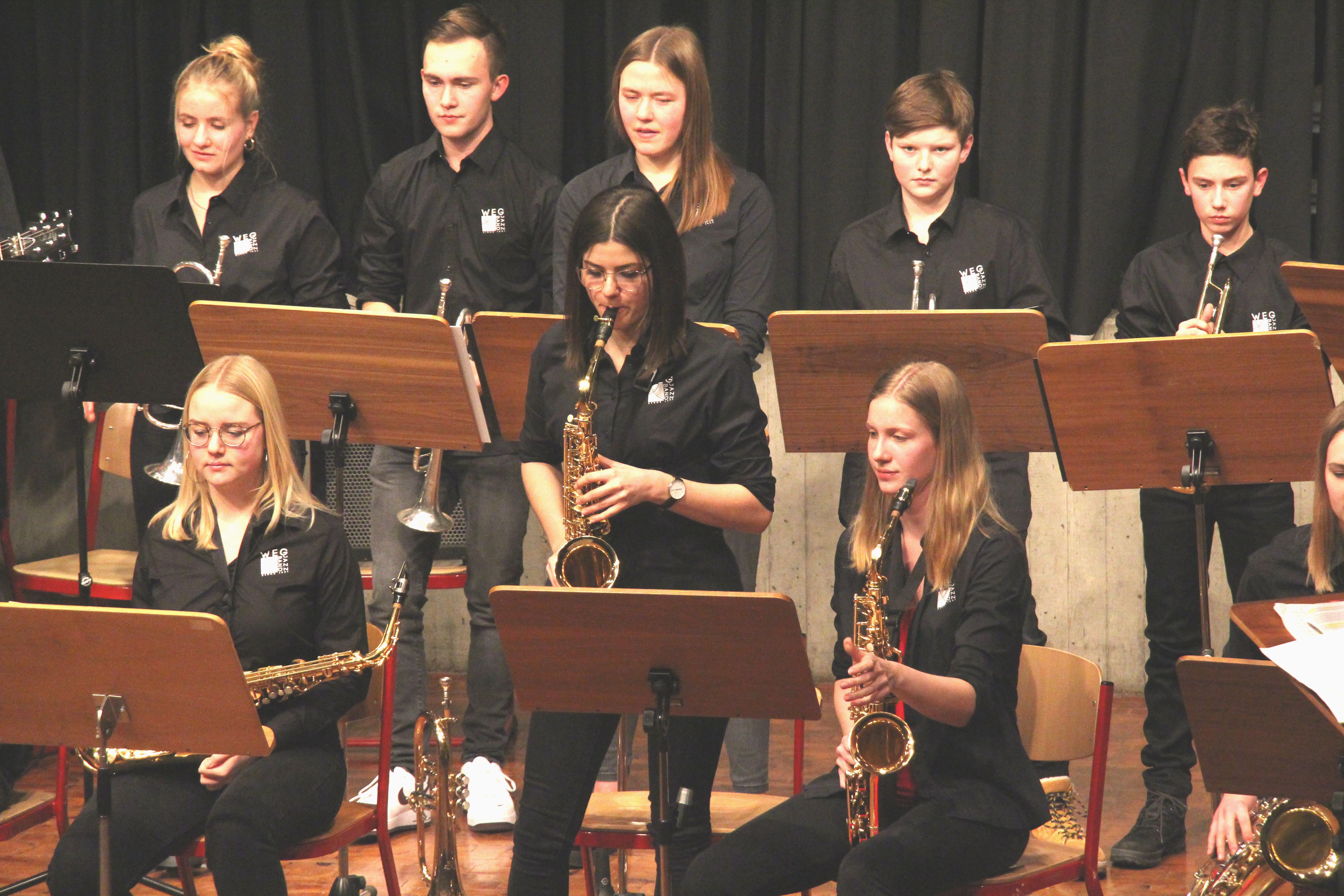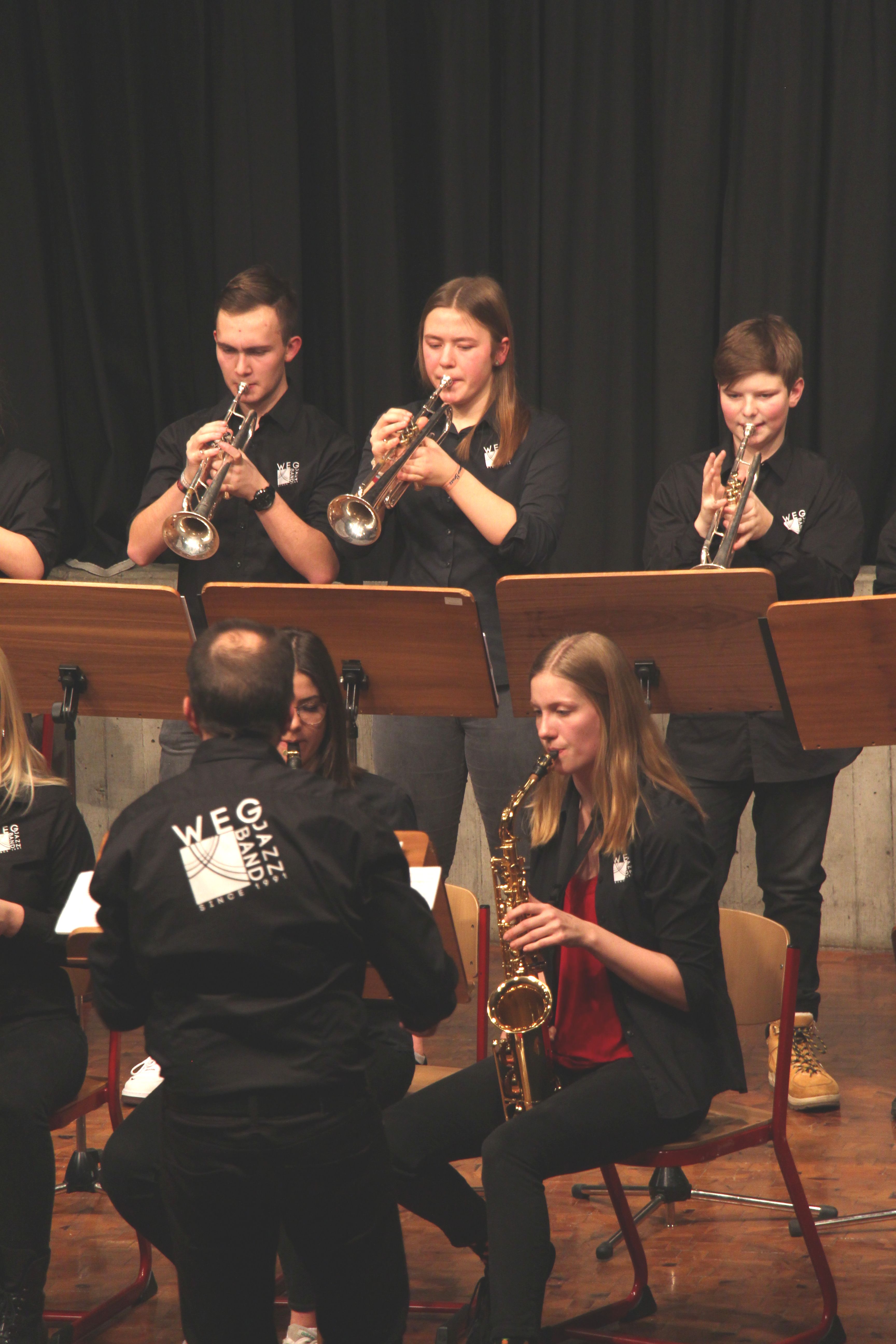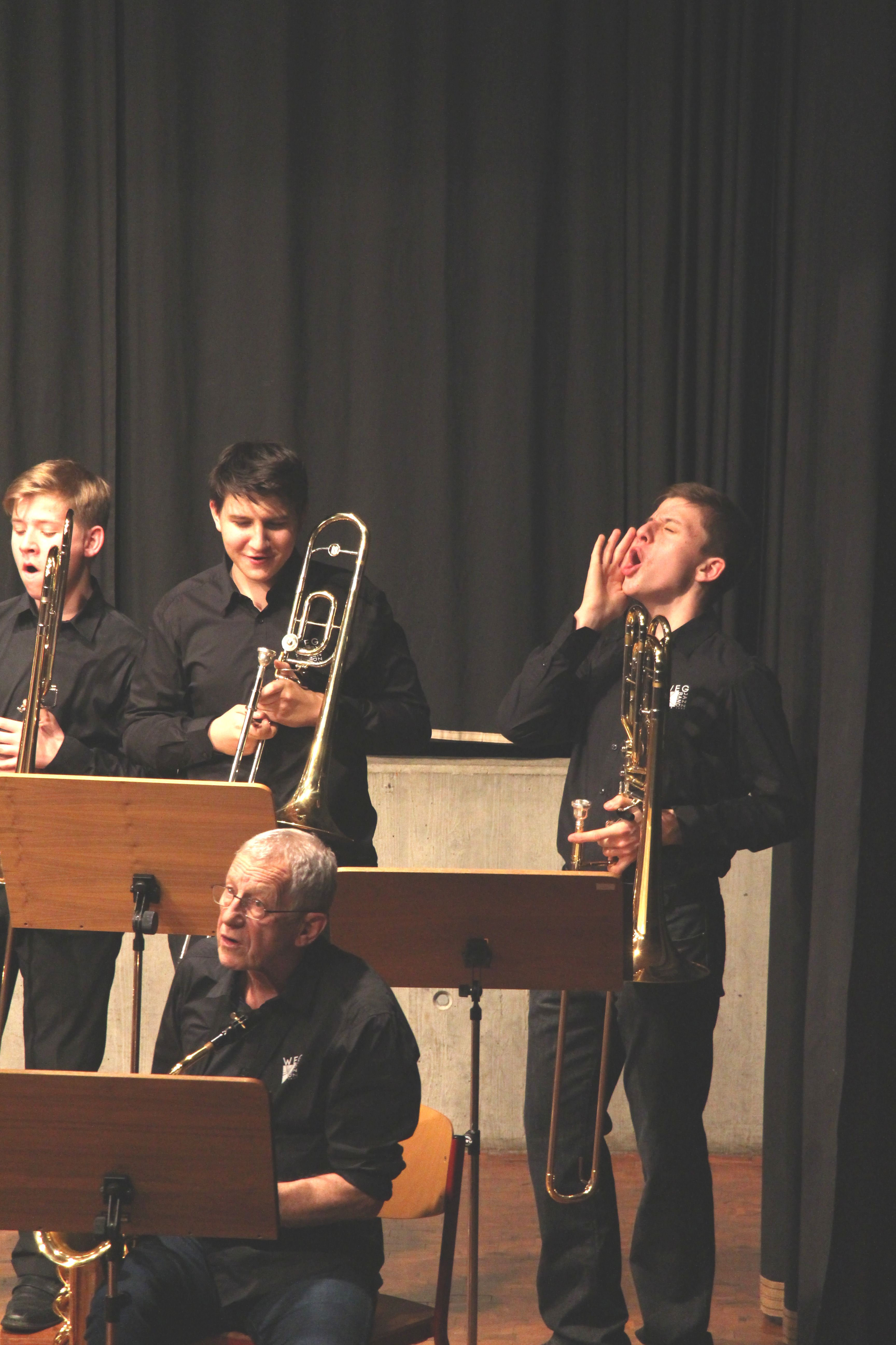 Die Stabübergabe an die „WeG-Jazzband“ erfolgte im Anschluss mit "Pick Up the Pieces", zu dem Harry Berger für sein Saxophonensemble ein Vorspiel komponiert hat, welches von der „WeG-Jazzband“ aufgegriffen und weitergeführt wurde. Dabei zeigte Nina Grether in ihrem Improvisationsteil, zu welchen tollen Leistungen sie mit ihrem Altsaxophon fähig ist. Auch in den folgenden Stücken konnten die Jugendlichen der „WeG-Jazzband“ zeigen, wozu sie solistisch fähig sind: Jonathan Schied improvisierte in der bekannten Ballade „Autumn leaves“ mit seiner Posaune, in Spencer Williams „Basin street blues“ zeigte sich Charlotte Riedel als Stimmführerin des Trompetenregisters in bester Form, während in „Crazy little thing called love“, einem Song der Rockgruppe Queen, wiederum Nina Grether als Solistin hervortrat. Cyndi Laupers lyrisches „Time after time“ wurde ebenfalls sehr einfühlsam, von Emely Brehm begleitet.